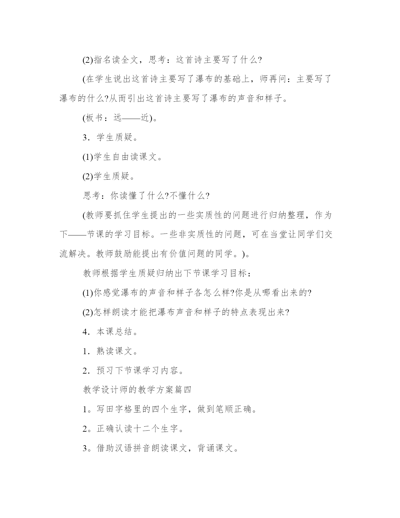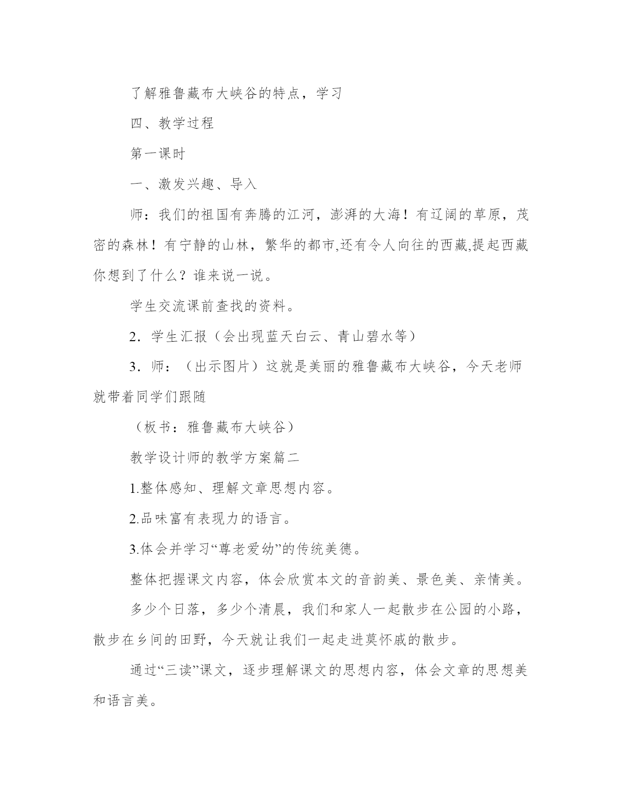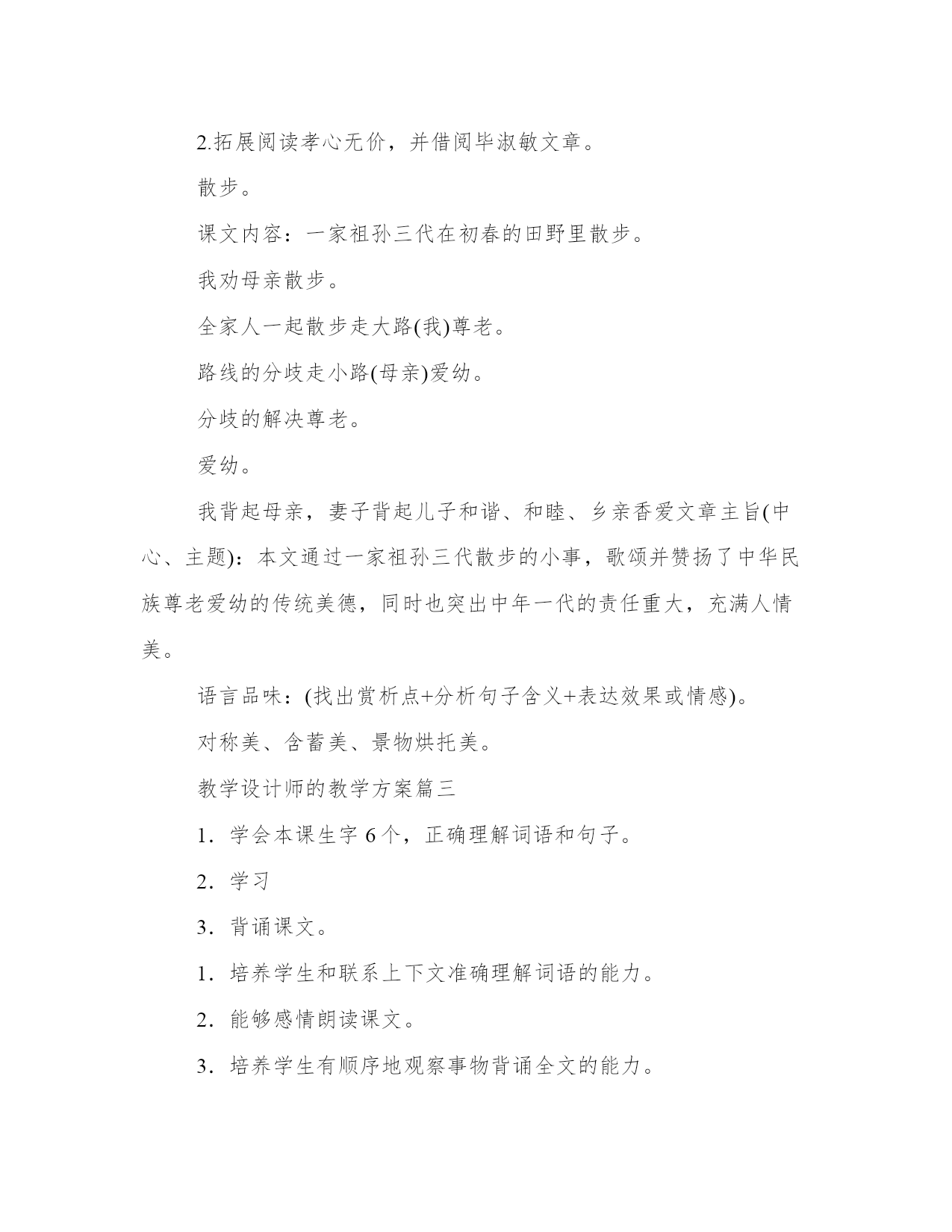 教学设计师的教学方案(汇总19篇)方案的成功与否,取决于执行力和团队合作的效果。一个成功的方案需要明确的目标和可量化的指标。每个方案都应该有一个明确的目标和评估标准。教学设计师的教学方案篇一语文课程标准指出:“学生是学习和发展的主体,语文课程必须根据学生身心发展和语文学习的特点,关注学生的个体差异和不同的学生需求,爱护学生的好奇心,求知欲,充分激发学生的主动意识和进取精神,倡导自主、合作、探究的学习方式。”因此,在教学中,采用以小组合作的形式,合作学习,进行交流反馈。这既体现了教师“导”的作用,也体现了学生的主体地位,并且使学生学会合作,学会探究。二、教学目标1.了解雅鲁藏布大峡谷的特点,感受雅鲁藏布大峡谷的壮丽神奇。2.通过学生自学交流,培养学生自主和合作学习的能力。3.激发学生热爱祖国大好河山的思想感情。4.学习收集资料。(课前查找有关西藏、雅鲁藏布大峡谷的资料)三、教学重难点了解雅鲁藏布大峡谷的特点,学习四、教学过程第一课时一、激发兴趣、导入师:我们的祖国有奔腾的江河,澎湃的大海!有辽阔的草原,茂密的森林!有宁静的山林,繁华的都市,还有令人向往的西藏,提起西藏你想到了什么?谁来说一说。学生交流课前查找的资料。2.学生汇报(会出现蓝天白云、青山碧水等)3.师:(出示图片)这就是美丽的雅鲁藏布大峡谷,今天老师就带着同学们跟随(板书:雅鲁藏布大峡谷)教学设计师的教学方案篇二1.整体感知、理解文章思想内容。2.品味富有表现力的语言。3.体会并学习“尊老爱幼”的传统美德。整体把握课文内容,体会欣赏本文的音韵美、景色美、亲情美。多少个日落,多少个清晨,我们和家人一起散步在公园的小路,散步在乡间的田野,今天就让我们一起走进莫怀戚的散步。通过“三读”课文,逐步理解课文的思想内容,体会文章的思想美和语言美。1.“一读”课文,整体感知内容。(1)教师范读课文,学生听读,要求:用一句话这篇课文写了一件什么事。教师提示:(出示幻灯片)(什么人?在什么时间?什么地点?干什么?)学生回答,明确:一家祖孙三代在初春的田野上散步。(2)学生自由朗读课文,思考:课文围绕“散步”这一中心事件写了哪些具体的事?学生自由回答,边答边板书。(请简要复述文章的主要内容,100字左右。)。师明确:“我”劝母亲散步——全家一起散步——选择大路小路的分歧——“我”决定委屈儿子——母亲却依从了孙子——在不好走的地方,“我”和妻子分别背起母亲和儿子。老体弱,余年不多,伴随她的机会已很少;儿子年纪尚幼,来日方长,伴随他的机会还很多。于是“我”决定委屈儿子,顺从母亲,作出了“走大路”(板书)的决定。这个决定是明智的,体现了中华民族“尊老”(板书)的美德。同时母亲的选择是——走小路。这又体现了我国另一种传统美德,是——爱幼。)。(尊老与爱幼最好由学生总结出。)。2.二读课文,把握文章主旨,体会亲情美。(1)引导学生思考:讨论并回答在整个散步过程中,谁做得最好?并简单说说理由。鼓励学生自由发言,大胆发表见解,这里不需要标准答案,言之有理即可。老师总结:其实这一家四口都做得很好,才有了文章中那一幅最动人的场景(明确:最后一段)。(2)请学生有感情地朗读这一段。(3)继续引导提问:营造一个如此和谐的家庭,本文通过一家祖孙三代散步的小事,歌颂并赞扬了中华民族尊老爱幼的传统美德,同时也突出中年一代的责任重大,充满人情美。(4)拓展——投影出名人名言,学生一起朗读,并记录积累。“老人和儿童属于社会中的弱势群体,他(她)们的生活状态,最能真实地反映一个社会国家的文明程度。”“哺育子女是动物也有的本能,赡养父母才是人类的文明之举。”(培根)“老吾老以及人之老,幼吾幼以及人之幼”。(孟子)。老师总结:培根的话让我们想到了中国已传承几千年的美德:孝。教师进行适当的拓展,说说“孝”的写法。3.三读课文,赏析重点句,品味语言美:我们喜欢这篇文章不仅因为喜欢这家人,也喜欢这篇散文清新隽永的语言,请同学们根据以下提示找出你喜欢的语句,朗读出来,并做适当的点评。这里,老师应对初中语言赏析的基本步骤做个方法指导。(找出赏析点+分析句子含义+表达效果或情感)。(1)含蓄美:(找出你认为含义丰富的句子)。(2)对称美:(找出前后对称,形式整齐匀称的语句)。(3)景物的烘托美:(找出文中描写景物的语句进行赏析)。老师做一个示范,我选择一句具有“对称美”特点的句子进行赏析:例如:“她现在很听我的话,就像小时候很听她的话一样。”赏析:这是个内容上相对称的句子。意为我小时候很听母亲的话;母亲现在对成年的我也很尊重。母子之间互相尊重,充满骨肉之情。接下来由学生自主阅读课文,找出可以赏析的句子,尝试赏析,可重点分析以下句子: