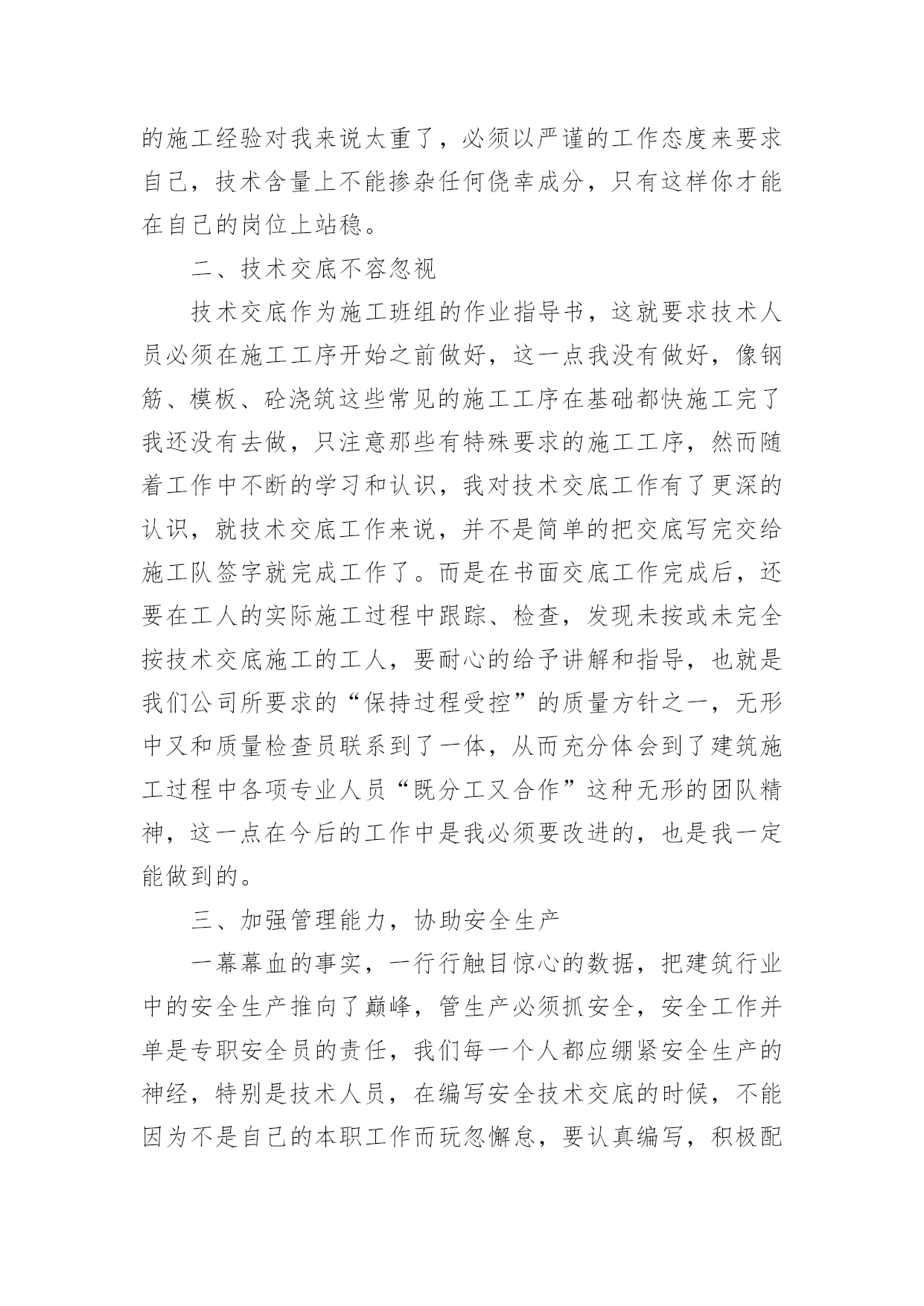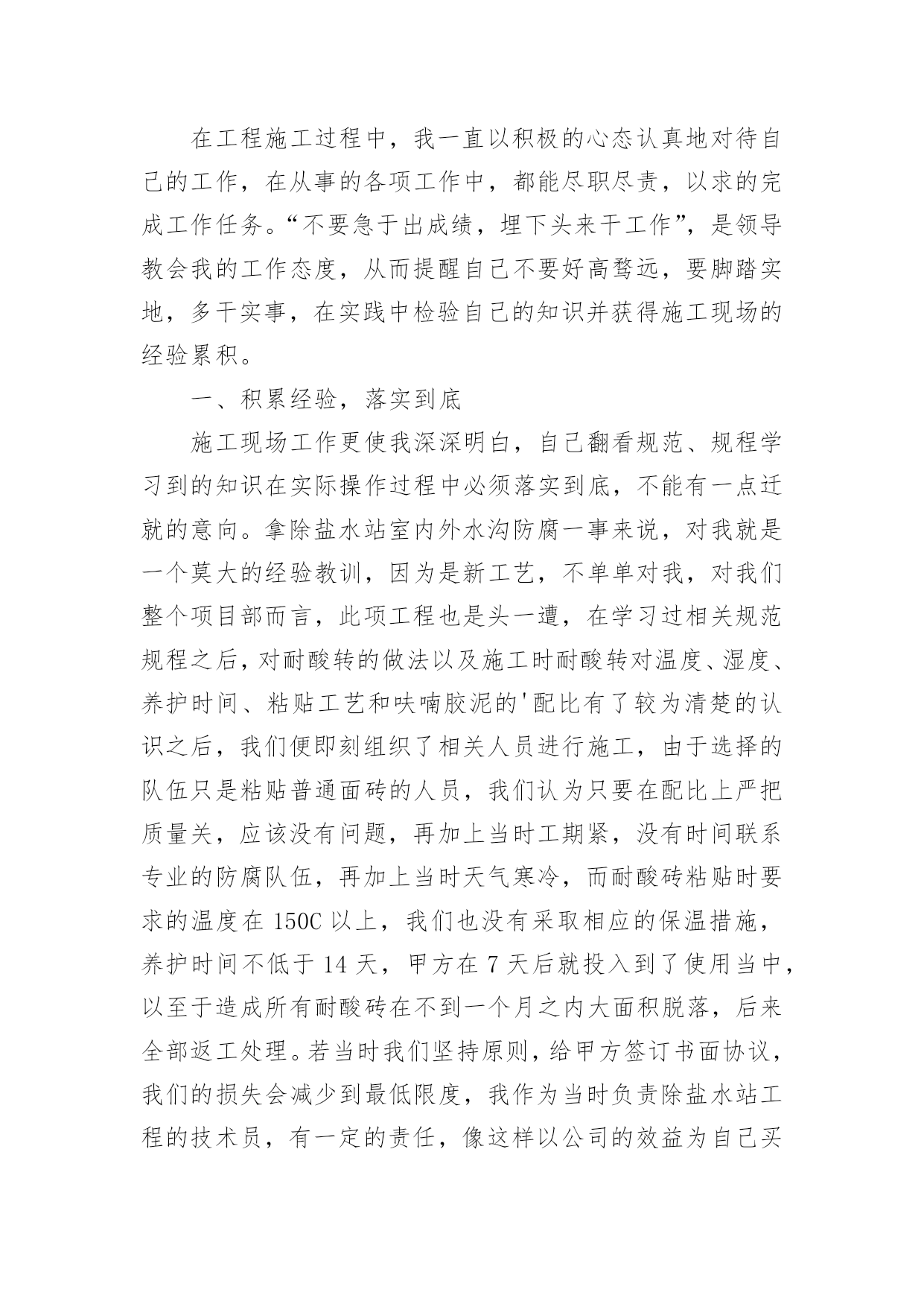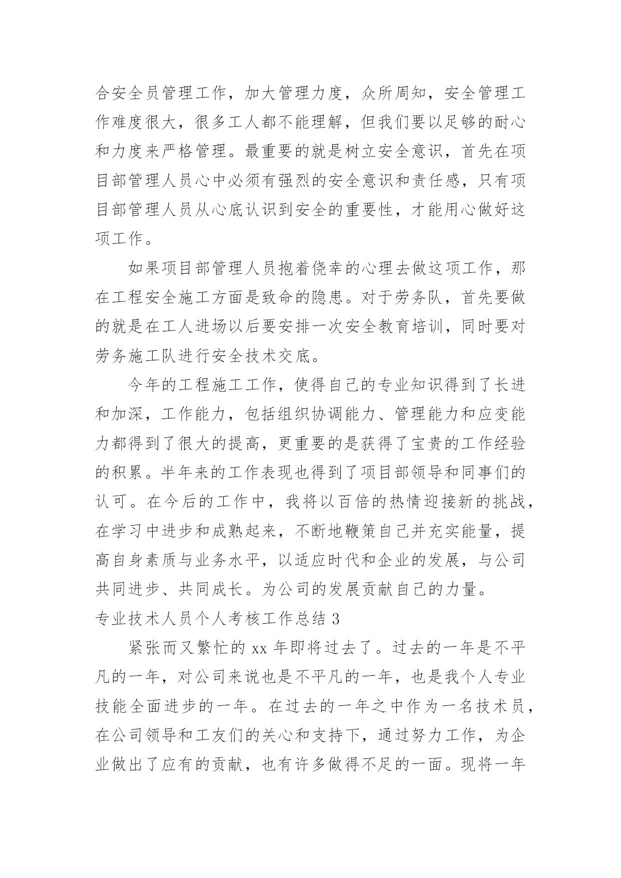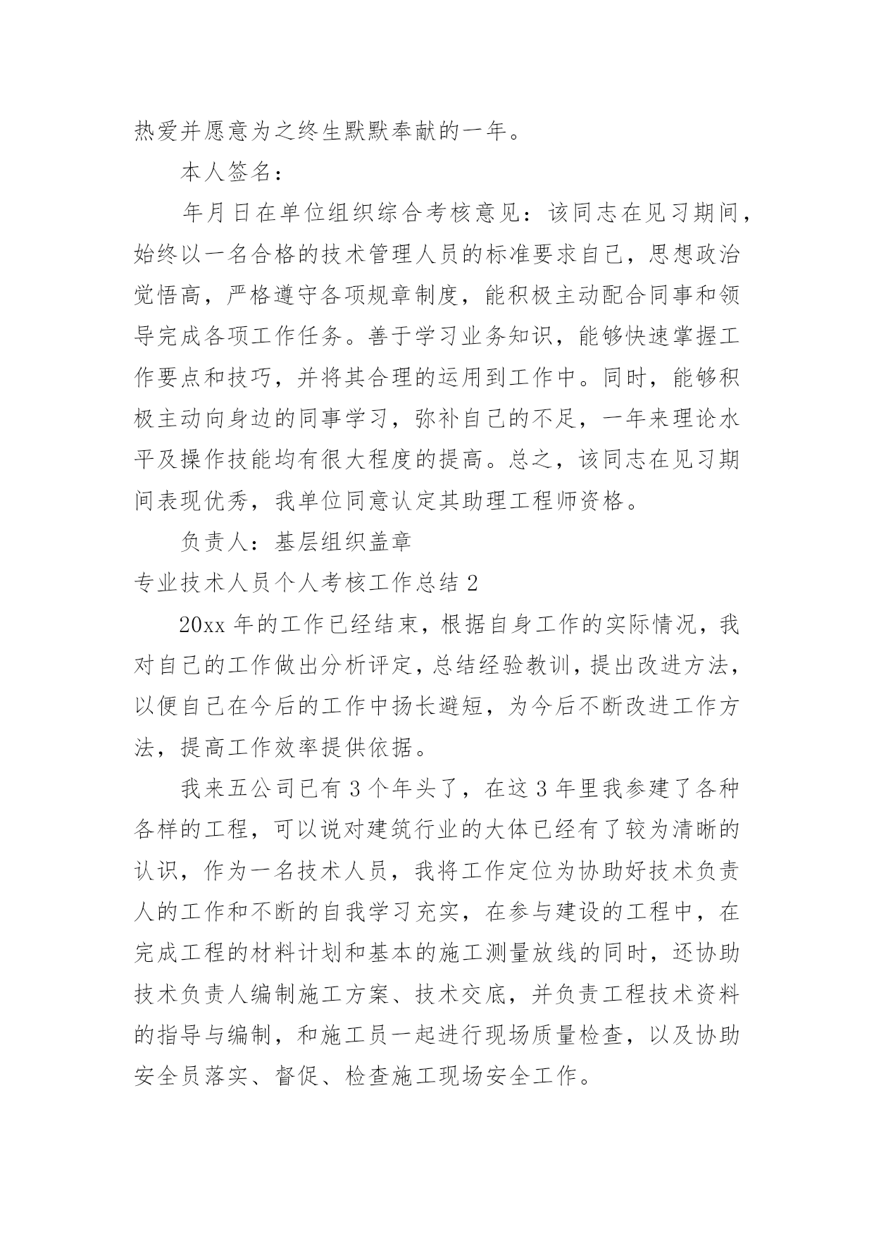 专业技术人员个人考核工作总结专业技术人员个人考核工作总结总结就是把一个时间段取得的成绩、存在的问题及得到的经验和教训进行一次全面系统的总结的书面材料,它可以促使我们思考,让我们一起来学习写总结吧。那么总结要注意有什么内容呢?以下是小编为大家整理的专业技术人员个人考核工作总结,欢迎大家借鉴与参考,希望对大家有所帮助。专业技术人员个人考核工作总结1在完成各项工作的同时,我还存在着以下几点的不足:一是工作中有时自信心不足,反而出现低级错误;二是在处理一些事情时有时显得较为急躁;三是对一些业务技能特别是应用工程软件还不够熟悉。在今后的工作中,我将发扬成绩,克服不足,朝着以下几个方向努力:1、学无止镜,时代的发展瞬息万变,各种学科知识日新月异。我将坚持不懈地努力学习各种理论知识,并用于指导实践,以更好的.适应行业发展的需要。2、熟练的掌握各种业务技能才能更好的投入工作,我将通过多看、多学、多练来不断的提高自己的各项业务技能。总之,短短的一年见习期,是我人生角色转换的一年,是我不断成长的一年,也是我对公路事业由陌生进而熟悉、热爱并愿意为之终生默默奉献的一年。本人签名:年月日在单位组织综合考核意见:该同志在见习期间,始终以一名合格的技术管理人员的标准要求自己,思想政治觉悟高,严格遵守各项规章制度,能积极主动配合同事和领导完成各项工作任务。善于学习业务知识,能够快速掌握工作要点和技巧,并将其合理的运用到工作中。同时,能够积极主动向身边的同事学习,弥补自己的不足,一年来理论水平及操作技能均有很大程度的提高。总之,该同志在见习期间表现优秀,我单位同意认定其助理工程师资格。负责人:基层组织盖章专业技术人员个人考核工作总结220xx年的工作已经结束,根据自身工作的实际情况,我对自己的工作做出分析评定,总结经验教训,提出改进方法,以便自己在今后的工作中扬长避短,为今后不断改进工作方法,提高工作效率提供依据。我来五公司已有3个年头了,在这3年里我参建了各种各样的工程,可以说对建筑行业的大体已经有了较为清晰的认识,作为一名技术人员,我将工作定位为协助好技术负责人的工作和不断的自我学习充实,在参与建设的工程中,在完成工程的材料计划和基本的施工测量放线的同时,还协助技术负责人编制施工方案、技术交底,并负责工程技术资料的指导与编制,和施工员一起进行现场质量检查,以及协助安全员落实、督促、检查施工现场安全工作。在工程施工过程中,我一直以积极的心态认真地对待自己的工作,在从事的各项工作中,都能尽职尽责,以求的完成工作任务。“不要急于出成绩,埋下头来干工作”,是领导教会我的工作态度,从而提醒自己不要好高骛远,要脚踏实地,多干实事,在实践中检验自己的知识并获得施工现场的经验累积。一、积累经验,落实到底施工现场工作更使我深深明白,自己翻看规范、规程学习到的知识在实际操作过程中必须落实到底,不能有一点迁就的意向。拿除盐水站室内外水沟防腐一事来说,对我就是一个莫大的经验教训,因为是新工艺,不单单对我,对我们整个项目部而言,此项工程也是头一遭,在学习过相关规范规程之后,对耐酸转的做法以及施工时耐酸转对温度、湿度、养护时间、粘贴工艺和呋喃胶泥的'配比有了较为清楚的认识之后,我们便即刻组织了相关人员进行施工,由于选择的队伍只是粘贴普通面砖的人员,我们认为只要在配比上严把质量关,应该没有问题,再加上当时工期紧,没有时间联系专业的防腐队伍,再加上当时天气寒冷,而耐酸砖粘贴时要求的温度在150C以上,我们也没有采取相应的保温措施,养护时间不低于14天,甲方在7天后就投入到了使用当中,以至于造成所有耐酸砖在不到一个月之内大面积脱落,后来全部返工处理。若当时我们坚持原则,给甲方签订书面协议,我们的损失会减少到最低限度,我作为当时负责除盐水站工程的技术员,有一定的责任,像这样以公司的效益为自己买的施工经验对我来说太重了,必须以严谨的工作态度来要求自己,技术含量上不能掺杂任何侥幸成分,只有这样你才能在自己的岗位上站稳。二、技术交底不容忽视技术交底作为施工班组的作业指导书,这就要求技术人员必须在施工工序开始之前做好,这一点我没有做好,像钢筋、模板、砼浇筑这些常见的施工工序在基础都快施工完了我还没有去做,只注意那些有特殊要求的施工工序,然而随着工作中不断的学习和认识,我对技术交底工作有了更深的认识,就技术交底工作来说,并不是简单的把交底写完交给施工队签字就完成工作了。而是在书面交底工作完成后,还要在工人的实际施工过程中跟踪、检查,发现未按或未完全按技术交底施工的工人,要耐心的给予讲解和指导,也就是我们公司所要求的“保持过程受控”的质量方针之一,无形中又和质量检查员联系到了一体,从而充分体会到了建筑施工过程中各项专业人员“既分工又合作”这种无形的团队精神,这一点在今后的工作中是我必须要改进的,也是