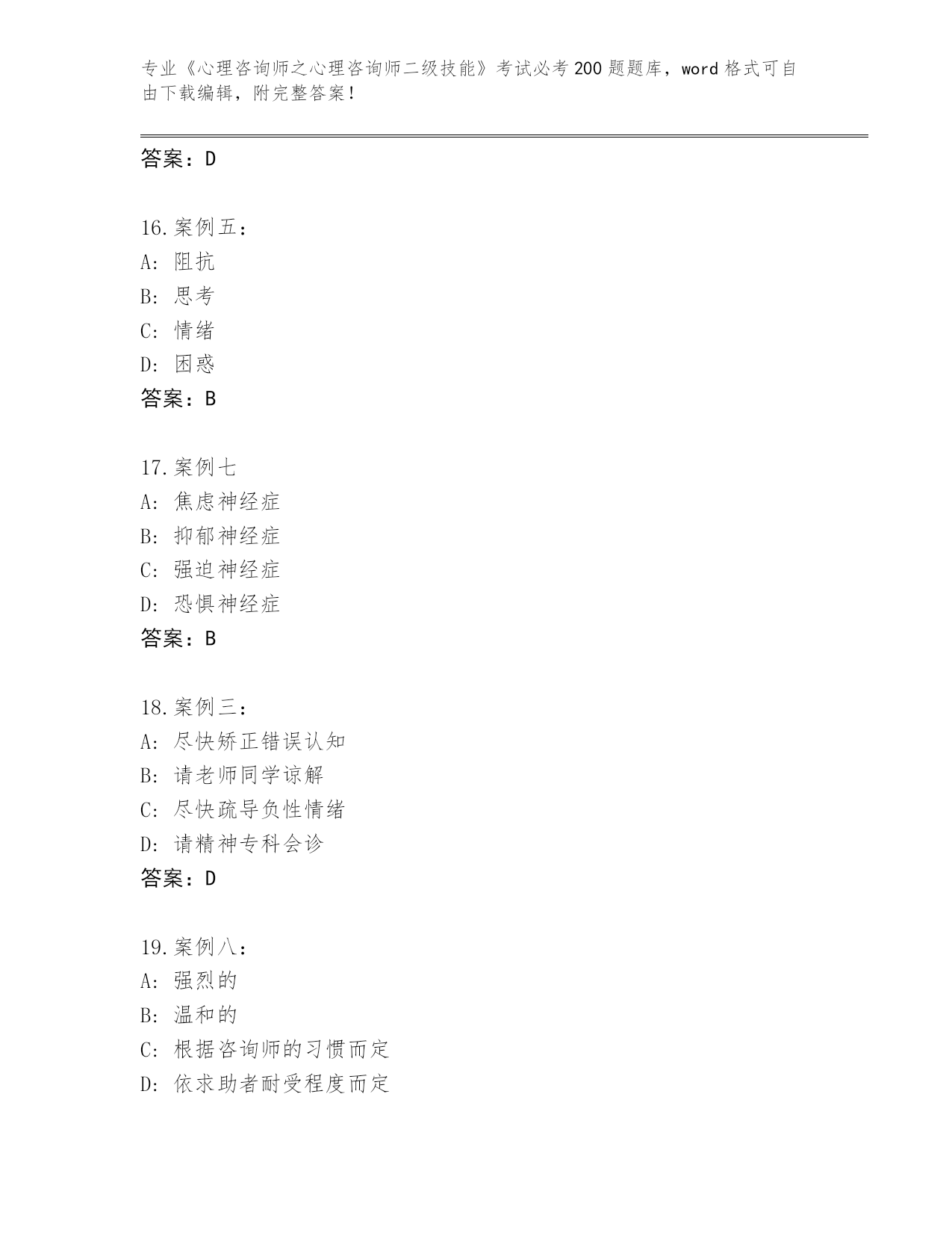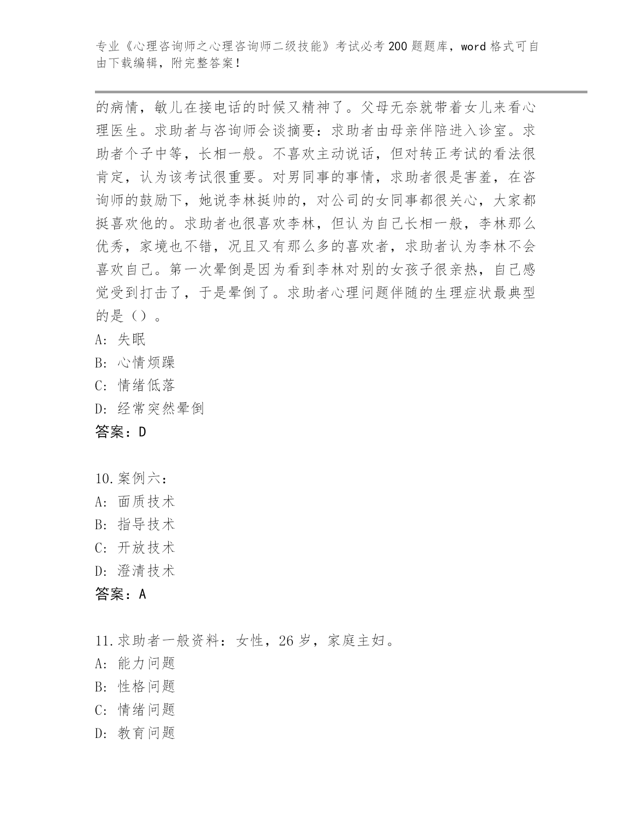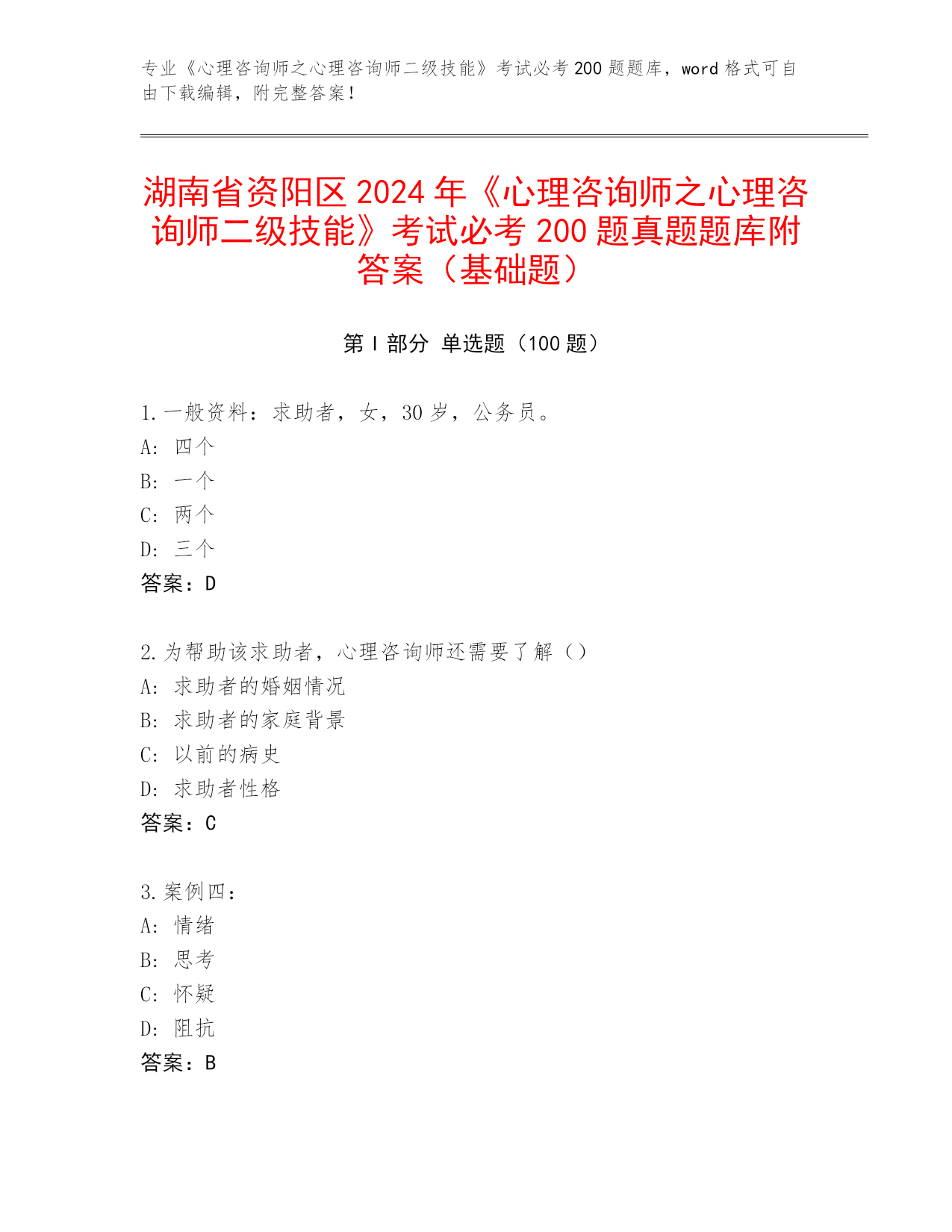 湖南省资阳区2024年《心理咨询师之心理咨询师二级技能》考试必考200题真题题库附答案(基础题)