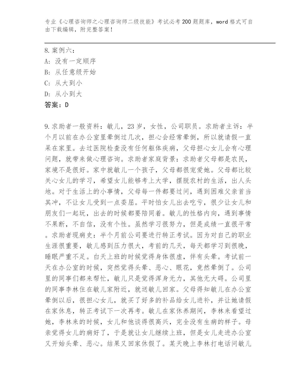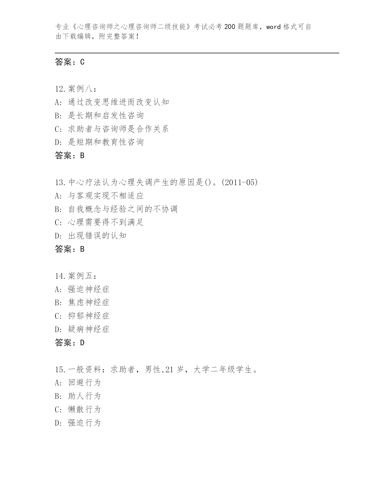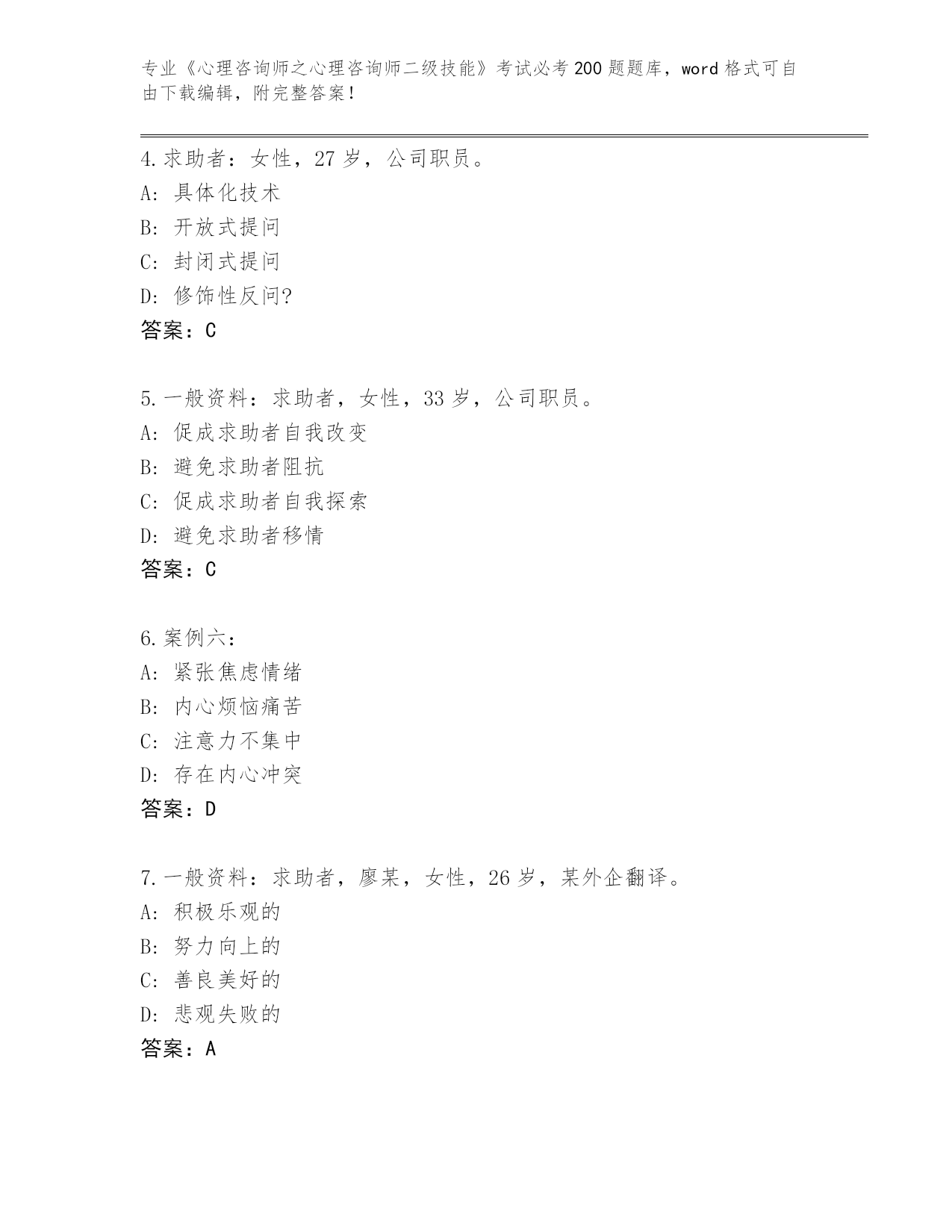 湖南省资阳区2024年《心理咨询师之心理咨询师二级技能》考试必考200题真题题库附答案(基础题)