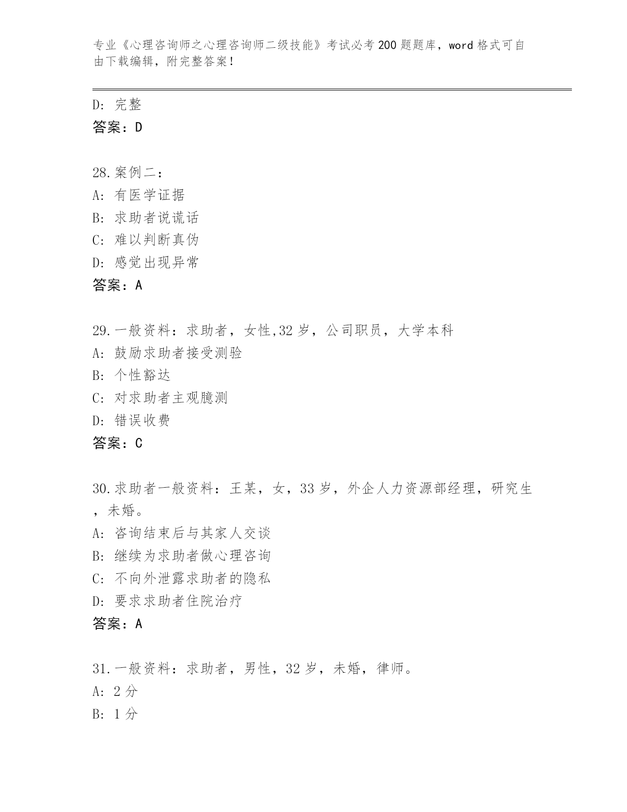 湖南省资阳区《心理咨询师之心理咨询师二级技能》考试必考200题完整题库(真题汇编)