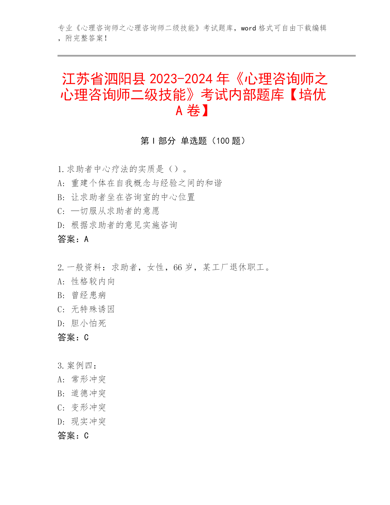 江苏省泗阳县2023-2024年《心理咨询师之心理咨询师二级技能》考试内部题库【培优A卷】