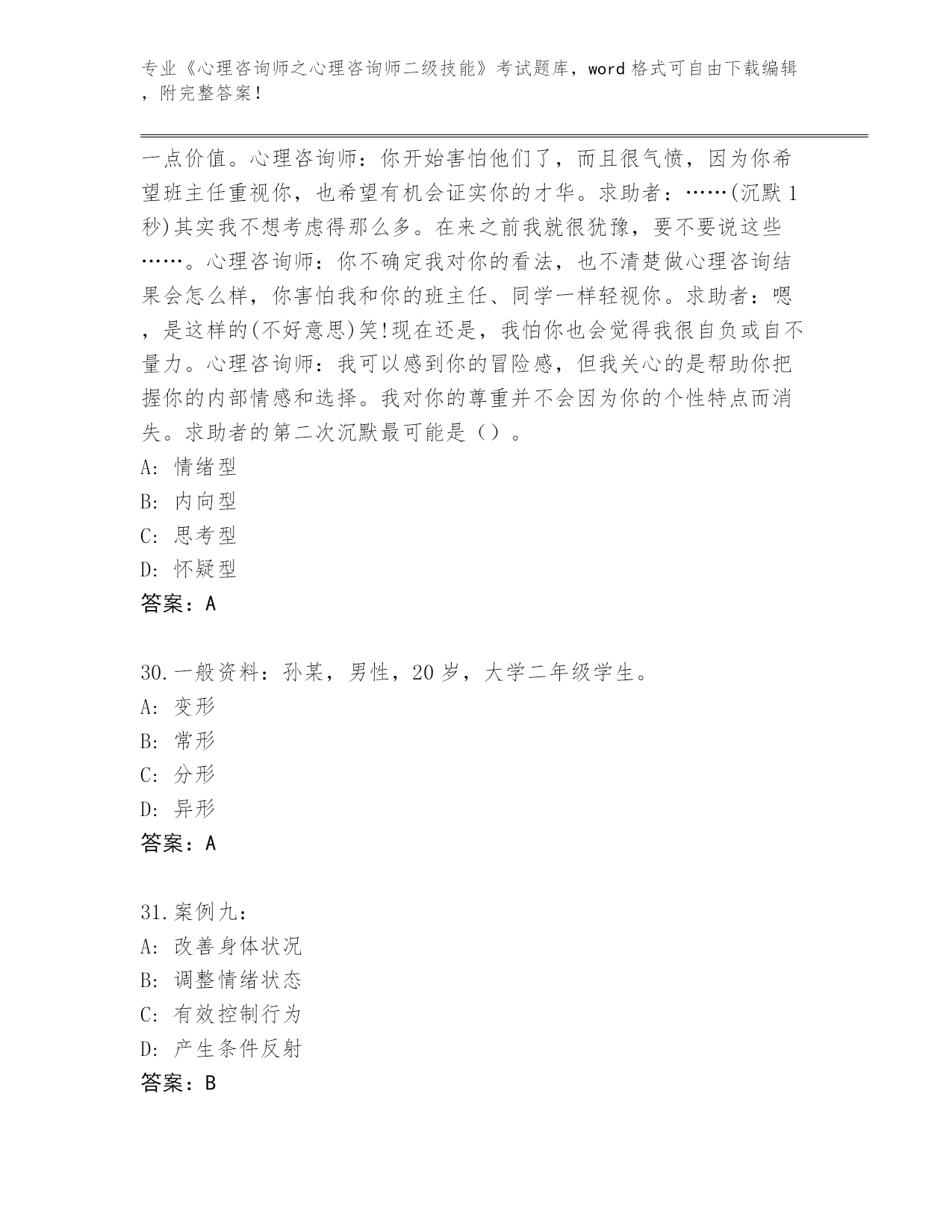 江苏省2024年《心理咨询师之心理咨询师二级技能》考试内部题库(实用)