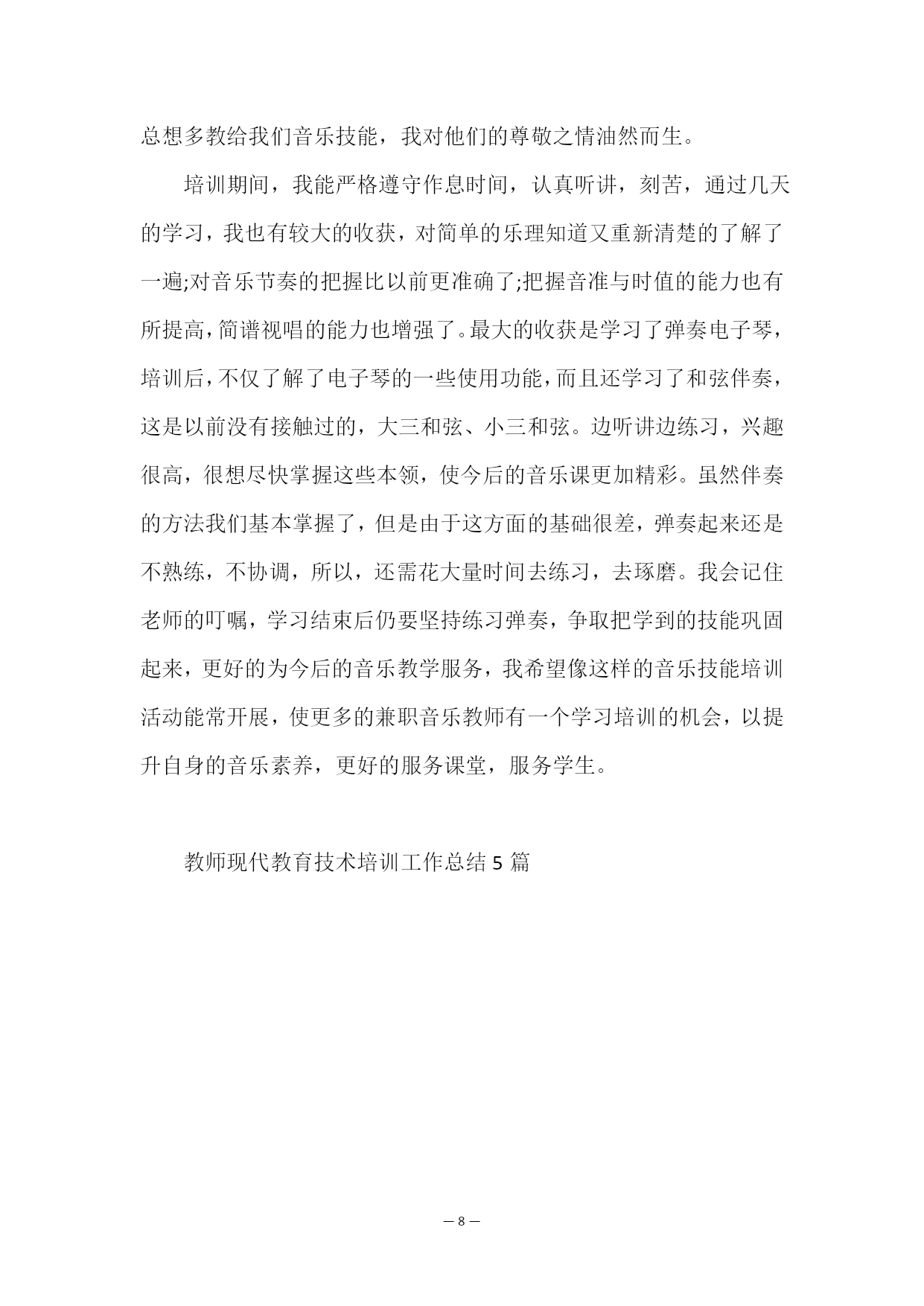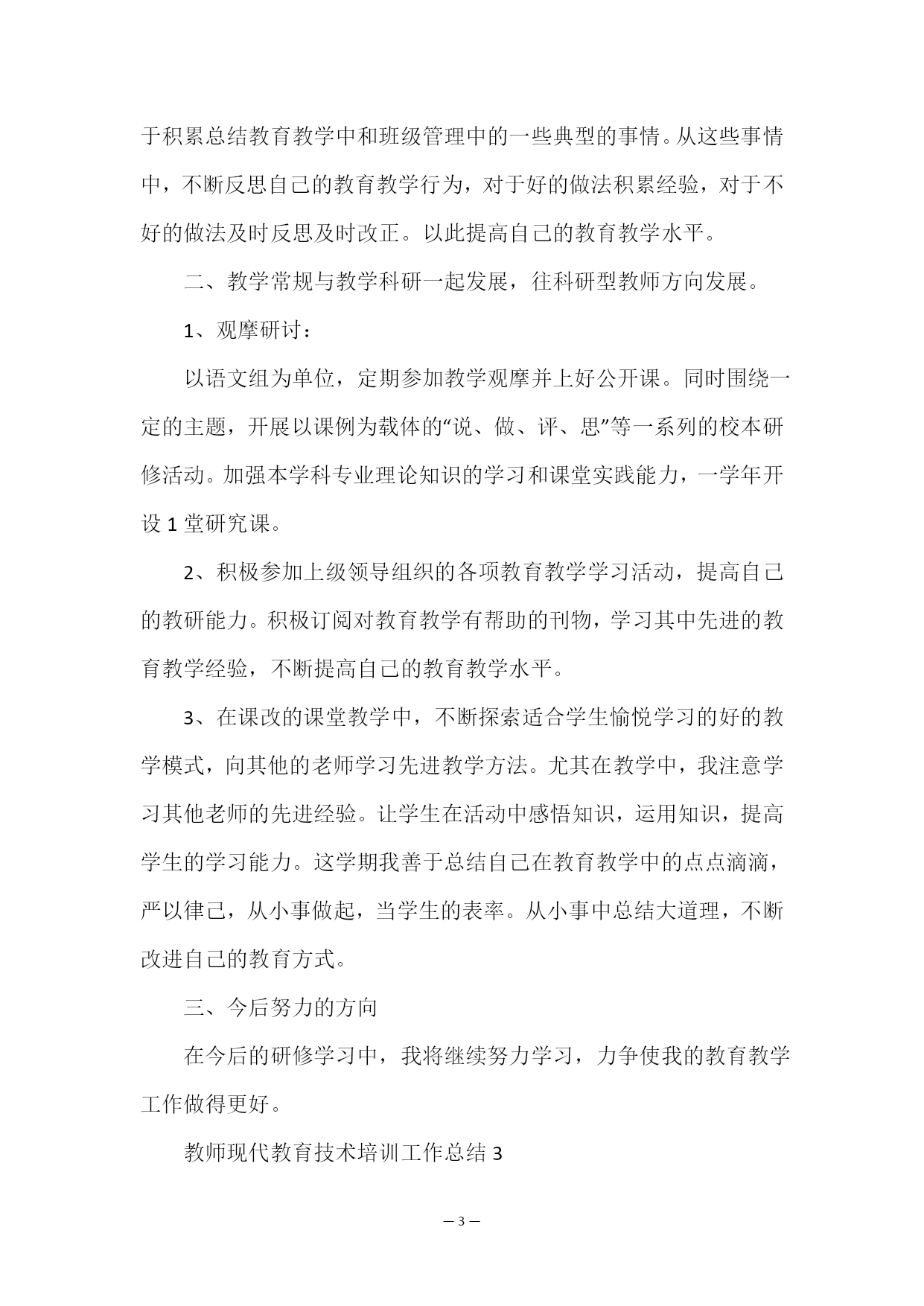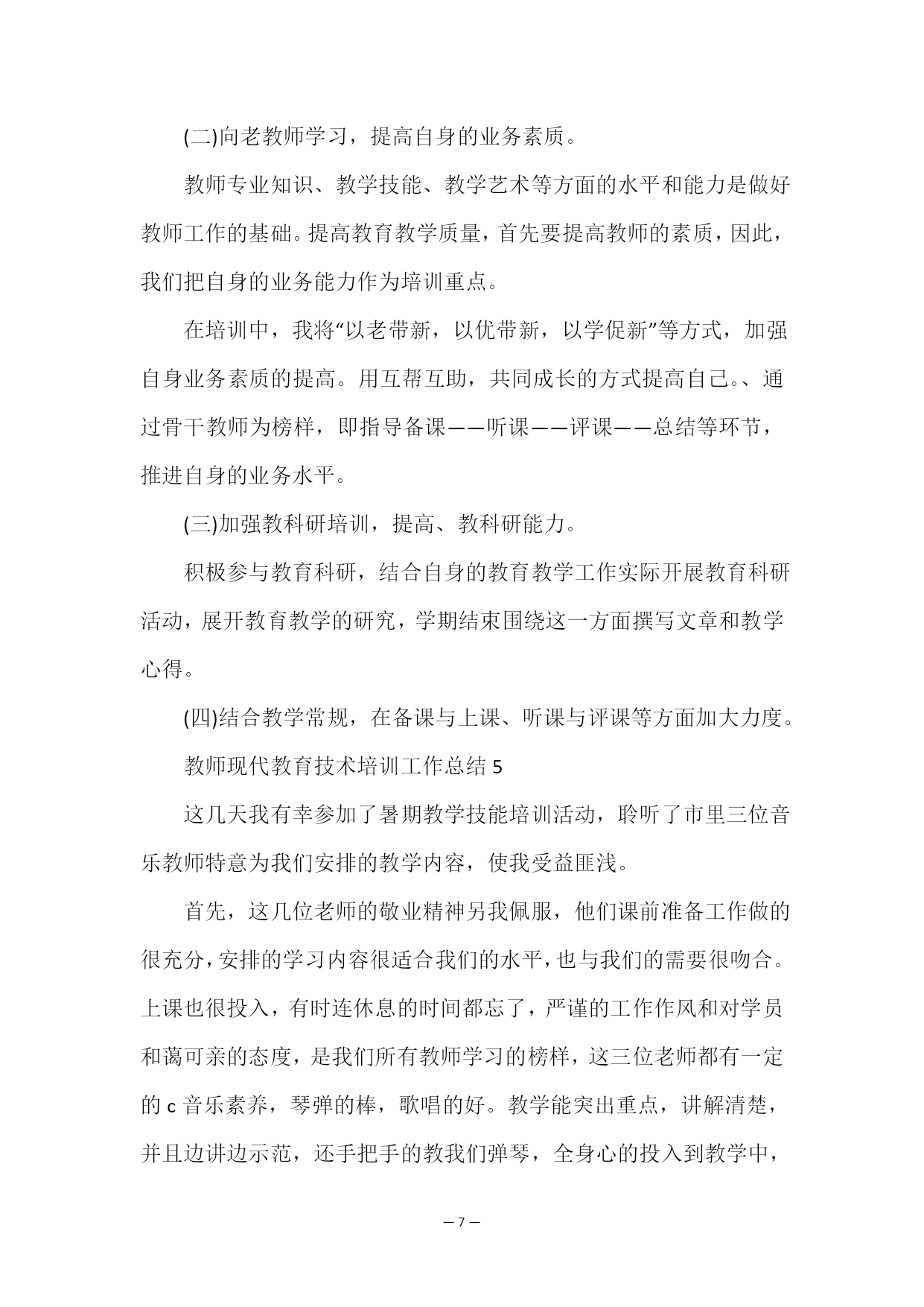 —PAGE\*MERGEFORMAT8—教师现代教育技术培训工作总结5篇教师在平时的教学工作当中,起到了传授知识,达到了授业解惑的目的。下面给大家带来一些关于教师现代教育技术培训工作总结,欢迎阅读与借鉴,希望对你们有帮助!教师现代教育技术培训工作总结1参加校本培训,我从不落下一节课,也未曾迟到早退。讲座中,我全神贯注听讲记笔记,边听边记边思考。通过培训,使我在教师的职业道德修养、教育教学水平和教育科研能力都得到了进一步的提高。使我更加坚定了教书育人的信心和决心。1、通过校本培训,使我对教育教学理念、现代教学理论和现代课程理论和当今国外先进教育思想都有了进一步了解。2、通过培训,我充分认识到为了适应素质教育的需要,更好的胜任新世纪的教育教学工作,必须不断的全面提高自身素质。3、通过培训,使我对教育科研和新课程有了更深的理解,不断提高了自己的教科研水平和驾驭新课程的能力。4、通过培训,从理论和实际的结合上学习和领会了教师职业修养所涵盖的内容,提高自己的事业认识,职业认同水平,增强了自己从事教育事业的使命感和责任感。5、通过校本培训,我深切感觉到,做为一名教师,需有先进完备的教学策略与方法。使我在教学工作中能“因材施教”,对学生能给予学习上的指导,生活中的关心,认识的点拨,思想的疏导。过去,只知道埋头于书本知识,信息闭塞,不善于交流,使得一些好的经验未能融于自己的教学,而自己的一些体会又未能及时整理,因此使自己的发展缓慢前进。学习时在领导和老师的精心指导下,我有了长足的进步,使我感到自己的教师修为有了深一层次的提高,使我更加如饥似渴的追求新知的摄入。今后我会加倍努力不断进步全身心地投入教育事业,为祖国培养更多的栋梁之才。教师现代教育技术培训工作总结2这年度,我在研修中不断提高教育教学水平,提高自己的业务能力和综合素质,从各个方面不断完善自己。现总结如下:一、不断加强学习,夯实业务能力只有学习,才能不断进步和成长,让学习成为提高自己的渠道,让学习成为我一生的精神财富,做一名学习型教师。1、自主学习:为了让自己更好地服务于课堂,我进行了学习。并根据自己的专业发展阶段和自身面临的专业发展问题,自主选择和确定学习书目和学习内容,认真阅读,记好读书笔记。2、勤思考,多动笔每天坚持写教学心得:可以是备课心得,也可以是教学体会,可以写课堂教学方法实施体会,也可以反思上节课存在的问题,然后找出好的方法解决它。善于积累总结教育教学中和班级管理中的一些典型的事情。从这些事情中,不断反思自己的教育教学行为,对于好的做法积累经验,对于不好的做法及时反思及时改正。以此提高自己的教育教学水平。二、教学常规与教学科研一起发展,往科研型教师方向发展。1、观摩研讨:以语文组为单位,定期参加教学观摩并上好公开课。同时围绕一定的主题,开展以课例为载体的“说、做、评、思”等一系列的校本研修活动。加强本学科专业理论知识的学习和课堂实践能力,一学年开设1堂研究课。2、积极参加上级领导组织的各项教育教学学习活动,提高自己的教研能力。积极订阅对教育教学有帮助的刊物,学习其中先进的教育教学经验,不断提高自己的教育教学水平。3、在课改的课堂教学中,不断探索适合学生愉悦学习的好的教学模式,向其他的老师学习先进教学方法。尤其在教学中,我注意学习其他老师的先进经验。让学生在活动中感悟知识,运用知识,提高学生的学习能力。这学期我善于总结自己在教育教学中的点点滴滴,严以律己,从小事做起,当学生的表率。从小事中总结大道理,不断改进自己的教育方式。三、今后努力的方向在今后的研修学习中,我将继续努力学习,力争使我的教育教学工作做得更好。教师现代教育技术培训工作总结3学期以来,没有轰动的大事,也没有令人忽然亮眼的轨迹。平凡的生活给予我的是更多的思考!在这一学期的时间里,我认真进行着研修,从自己的教育教学中寻找突破口,为了以促使自己的工作在今后再上一个新台阶,现将其总结如下学习方面:1、学习时最好的导师。书籍是最好的营养品。作为一名教师更是离不开学习。只有学习,才能不断进步和成长,让学习成为提高自己的渠道,让学习成为我一生的精神财富,做一名学习型教师。在这学期里,我有计划的阅读了《优秀是教出来的》,苏霍姆林斯基的《给教师的建议》。让我无论是思想上还是班级管理方面受益匪浅,让我不断学习的同时,也认识到了自己的不足。每个孩子都是独特且不同的,不能用统一的标准来衡量,这是不科学,也是不可取的。苏霍姆林斯基说在小学各年级,我们十分注意培养学生学习。如果阅读、书写、推论、观察和表达思想的这些能力在少年时期没有得到发展和提高,那么学生的学习就要感到困难了。这一段话,给我以很大启示:放眼所教过的孩子,成绩差的都有一个共同点:那就是阅读能力的欠