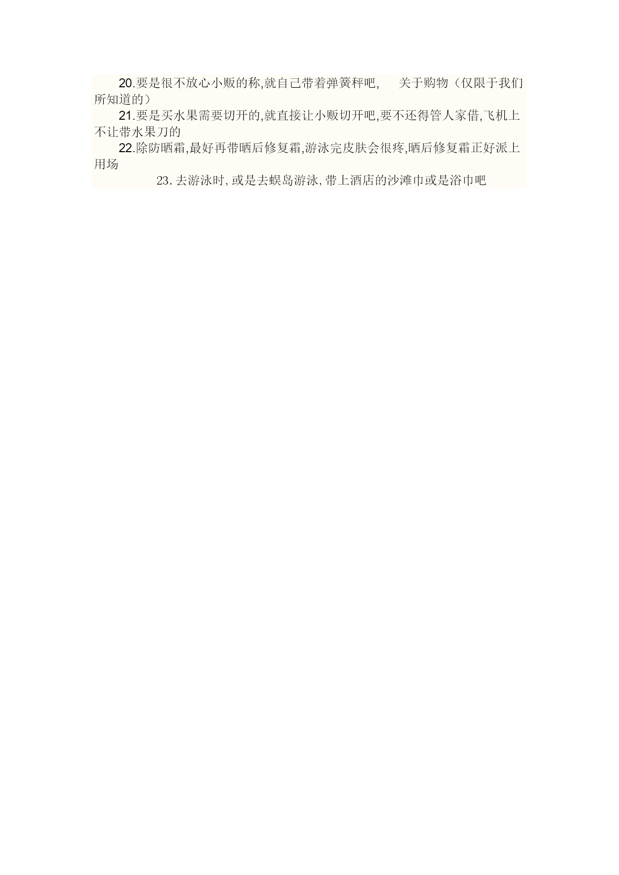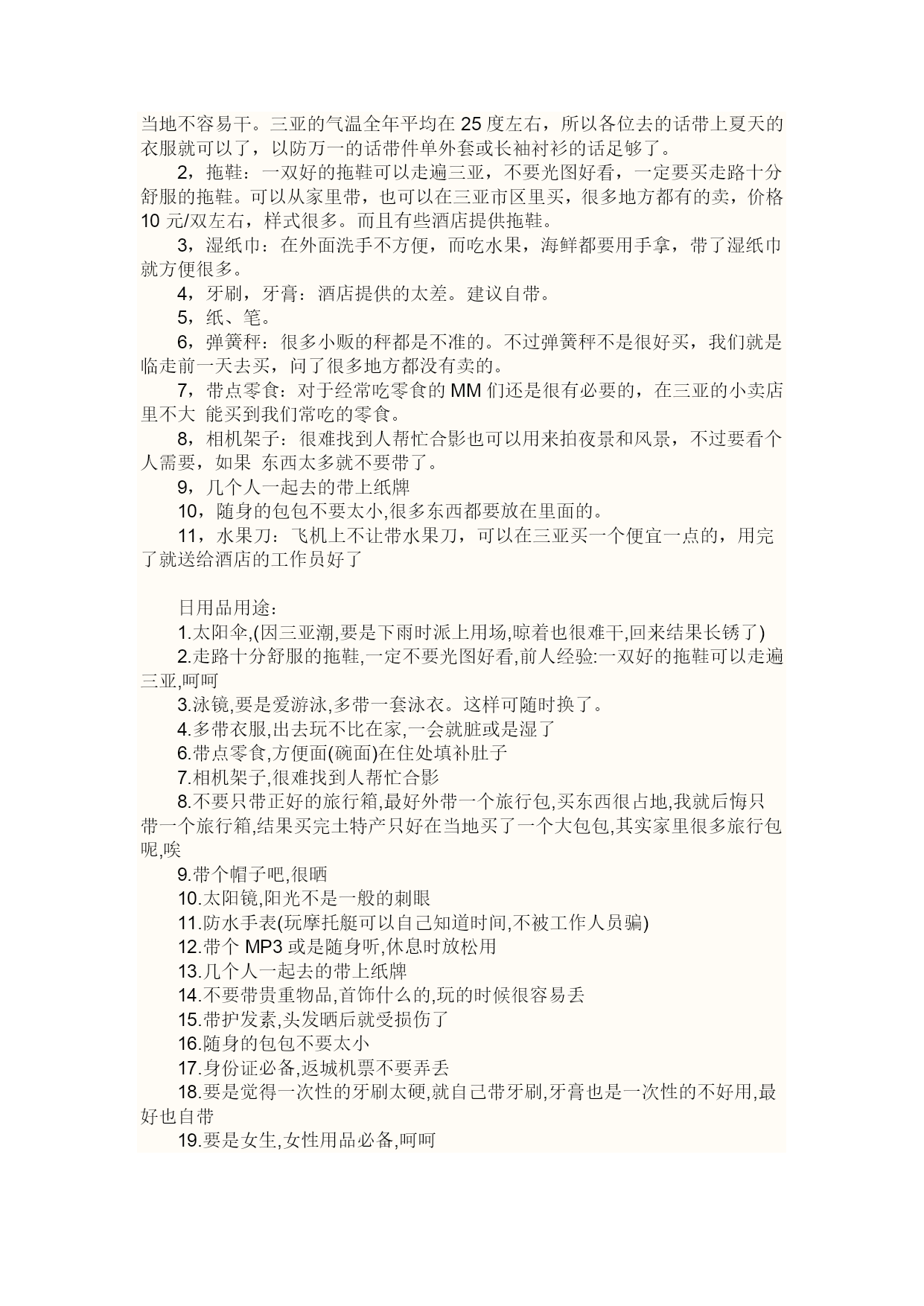 外出旅游必备物品出发前的准备:1,身份证。2,现金、信用卡。3,照相机:如果是数码相机的话,要考虑照片储存的问题,带一个或几个大一点的存储卡或者是数码相机伴侣。充电器。4,手机、充电器:在三亚公共电话很少,房间的电话只能打内线,拨长途必须在总台交押金,有手机很方便(临行前不要忘了缴费)。5,带个MP3或是随身听,休息时放松用。6,手提电脑:这个东西我们是犹豫再三才决定拿的.防晒用品:1,防晒霜:特别要带防晒指数高、防水性好的防晒霜2,晒后修复霜:游泳完皮肤会很疼,晒后修复霜正好派上用场。3,护发素:头发晒后就受损伤了,这时护发素可以修复头发。4,太阳镜:阳光不是一般的刺眼。建议买一个好一点的,将来也可以用的。5,太阳伞:既可挡雨又遮阳。6,带个帽子吧,很晒。游泳用品:1,泳衣:在三亚很多外国人穿比基尼,自己也可尝试一下。在海边白色、黄色、玫瑰红最好,蓝色的到海边就不够好看了。要是爱游泳,多带一套泳衣(泳衣湿了的话,晾着也很难干)。不是很爱游泳的可以不用带那么多,我就带了两件,但是觉得一件就够了。大家自己拿主意吧。2,泳镜。3,防水手表:玩摩托艇可以自己知道时间,不被工作人员骗。4,长头发的一定要带系头发的东西。不然头发飘飘的没法游泳。5,浴巾:酒店里面有(但是不喜欢用酒店的,就需要自己带了)。提醒:游泳设备必须在出行前备齐,否则即使在三亚最大的百货店或超市都买不到游泳眼镜或鼻夹、耳塞之类的游泳设备。药品:眼药水;抗过敏药;止泻药;防中暑人丹;晕车药;感冒药;止痛药;邦迪;消毒棉球;鼻舒;蚊不叮等防蚊虫叮咬的药水。日用品:1,衣物:替换衣裤、内衣多备几套,衣物要带吸汗的、透气、快干的衣服,当地不容易干。三亚的气温全年平均在25度左右,所以各位去的话带上夏天的衣服就可以了,以防万一的话带件单外套或长袖衬衫的话足够了。2,拖鞋:一双好的拖鞋可以走遍三亚,不要光图好看,一定要买走路十分舒服的拖鞋。可以从家里带,也可以在三亚市区里买,很多地方都有的卖,价格10元/双左右,样式很多。而且有些酒店提供拖鞋。3,湿纸巾:在外面洗手不方便,而吃水果,海鲜都要用手拿,带了湿纸巾就方便很多。4,牙刷,牙膏:酒店提供的太差。建议自带。5,纸、笔。6,弹簧秤:很多小贩的秤都是不准的。不过弹簧秤不是很好买,我们就是临走前一天去买,问了很多地方都没有卖的。7,带点零食:对于经常吃零食的MM们还是很有必要的,在三亚的小卖店里不大能买到我们常吃的零食。8,相机架子:很难找到人帮忙合影也可以用来拍夜景和风景,不过要看个人需要,如果东西太多就不要带了。9,几个人一起去的带上纸牌10,随身的包包不要太小,很多东西都要放在里面的。11,水果刀:飞机上不让带水果刀,可以在三亚买一个便宜一点的,用完了就送给酒店的工作员好了日用品用途:1.太阳伞,(因三亚潮,要是下雨时派上用场,晾着也很难干,回来结果长锈了)2.走路十分舒服的拖鞋,一定不要光图好看,前人经验:一双好的拖鞋可以走遍三亚,呵呵3.泳镜,要是爱游泳,多带一套泳衣。这样可随时换了。4.多带衣服,出去玩不比在家,一会就脏或是湿了6.带点零食,方便面(碗面)在住处填补肚子7.相机架子,很难找到人帮忙合影8.不要只带正好的旅行箱,最好外带一个旅行包,买东西很占地,我就后悔只带一个旅行箱,结果买完土特产只好在当地买了一个大包包,其实家里很多旅行包呢,唉9.带个帽子吧,很晒10.太阳镜,阳光不是一般的刺眼11.防水手表(玩摩托艇可以自己知道时间,不被工作人员骗)12.带个MP3或是随身听,休息时放松用13.几个人一起去的带上纸牌14.不要带贵重物品,首饰什么的,玩的时候很容易丢15.带护发素,头发晒后就受损伤了16.随身的包包不要太小17.身份证必备,返城机票不要弄丢18.要是觉得一次性的牙刷太硬,就自己带牙刷,牙膏也是一次性的不好用,最好也自带19.要是女生,女性用品必备,呵呵20.要是很不放心小贩的称,就自己带着弹簧秤吧,关于购物(仅限于我们所知道的)21.要是买水果需要切开的,就直接让小贩切开吧,要不还得管人家借,飞机上不让带水果刀的22.除防晒霜,最好再带晒后修复霜,游泳完皮肤会很疼,晒后修复霜正好派上用场23.去游泳时,或是去蜈岛游泳,带上酒店的沙滩巾或是浴巾吧