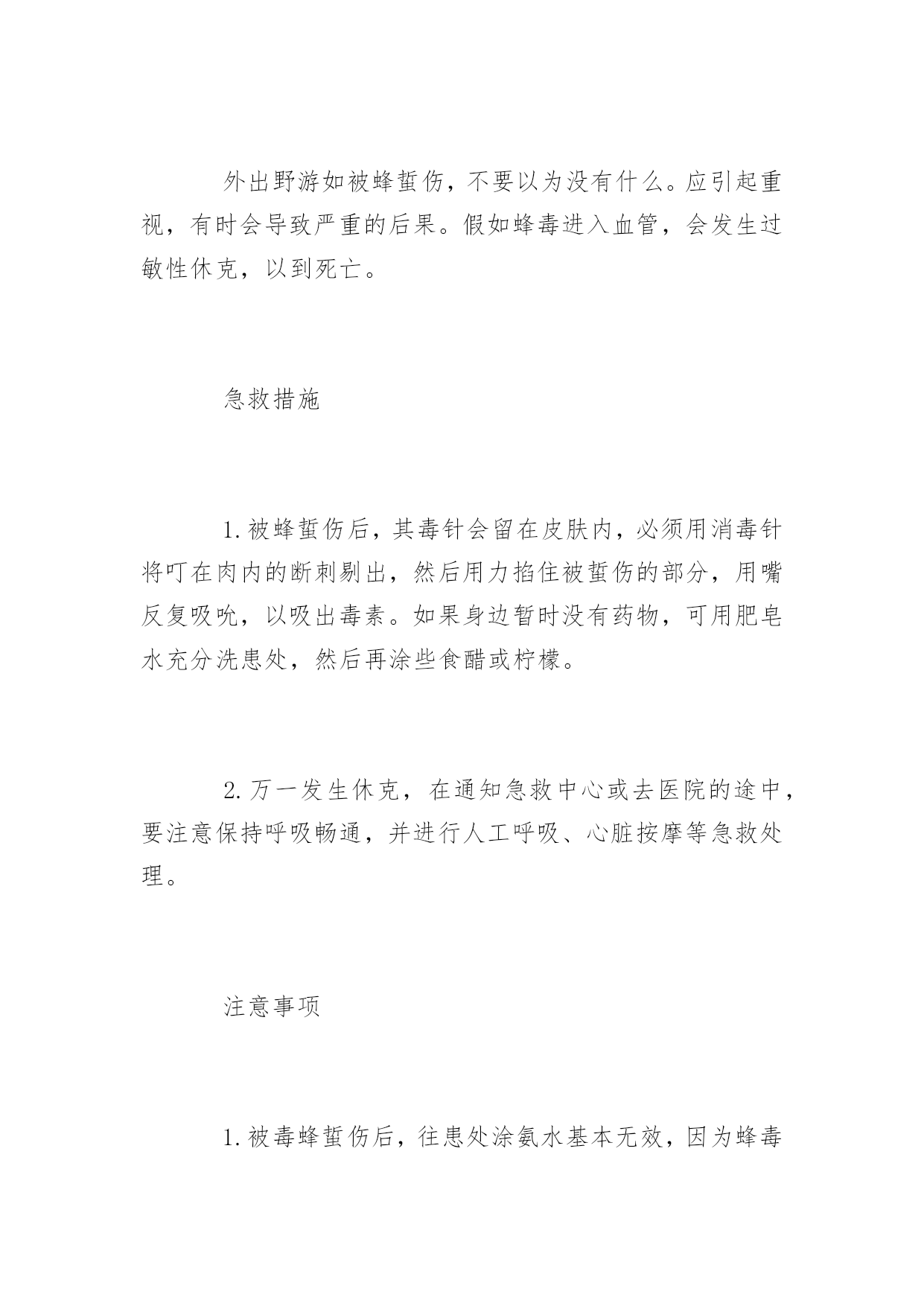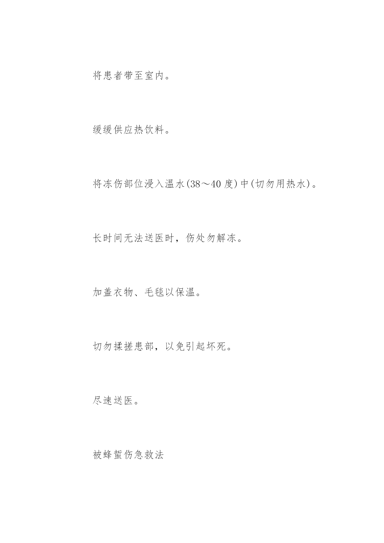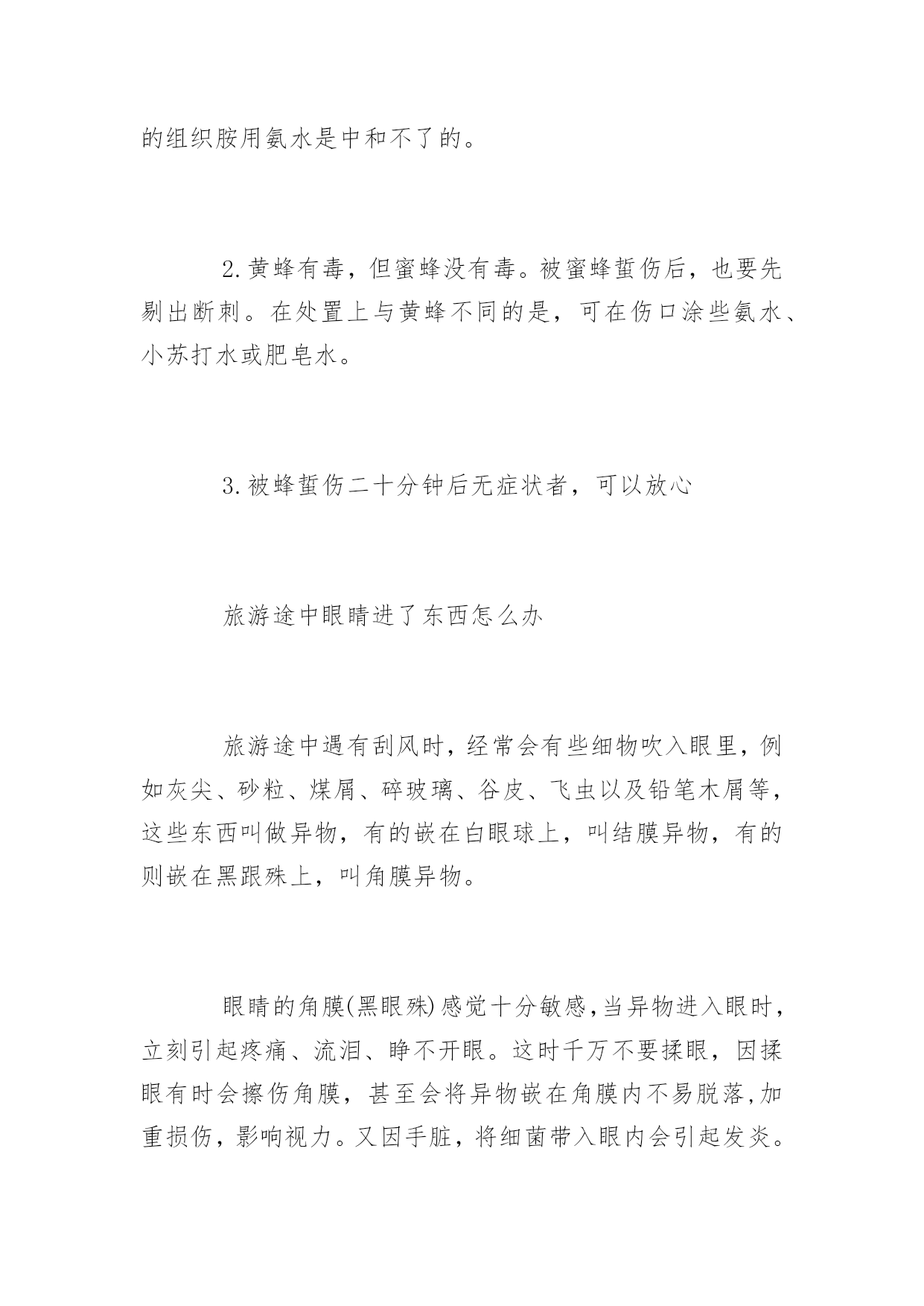 旅游基础小常识旅游基础小常识旅行途中谁也不知道会发生什么事情。以下是小编收藏的一些基本小常识,希望对你们有所帮助。冻伤及其处理方法什么是冻伤冻伤是由于长时间暴露于低温的环境中,引起肢体血液循环不良,皮肤表层或身层受到低温损伤的现象,通常鼻子、脸颊、耳朵、手指和脚趾是最容易冻伤的部位,冻伤的部位会僵硬,感觉麻木,严重者会坏死。冻伤急救方法将患者带至室内。缓缓供应热饮料。将冻伤部位浸入温水(38~40度)中(切勿用热水)。长时间无法送医时,伤处勿解冻。加盖衣物、毛毯以保温。切勿揉搓患部,以免引起坏死。尽速送医。被蜂蜇伤急救法外出野游如被蜂蜇伤,不要以为没有什么。应引起重视,有时会导致严重的后果。假如蜂毒进入血管,会发生过敏性休克,以到死亡。急救措施1.被蜂蜇伤后,其毒针会留在皮肤内,必须用消毒针将叮在肉内的断刺剔出,然后用力掐住被蜇伤的部分,用嘴反复吸吮,以吸出毒素。如果身边暂时没有药物,可用肥皂水充分洗患处,然后再涂些食醋或柠檬。2.万一发生休克,在通知急救中心或去医院的途中,要注意保持呼吸畅通,并进行人工呼吸、心脏按摩等急救处理。注意事项1.被毒蜂蜇伤后,往患处涂氨水基本无效,因为蜂毒的组织胺用氨水是中和不了的。2.黄蜂有毒,但蜜蜂没有毒。被蜜蜂蜇伤后,也要先剔出断刺。在处置上与黄蜂不同的是,可在伤口涂些氨水、小苏打水或肥皂水。3.被蜂蜇伤二十分钟后无症状者,可以放心旅游途中眼睛进了东西怎么办旅游途中遇有刮风时,经常会有些细物吹入眼里,例如灰尖、砂粒、煤屑、碎玻璃、谷皮、飞虫以及铅笔木屑等,这些东西叫做异物,有的嵌在白眼球上,叫结膜异物,有的则嵌在黑跟殊上,叫角膜异物。眼睛的角膜(黑眼殊)感觉十分敏感,当异物进入眼时,立刻引起疼痛、流泪、睁不开眼。这时千万不要揉眼,因揉眼有时会擦伤角膜,甚至会将异物嵌在角膜内不易脱落,加重损伤,影响视力。又因手脏,将细菌带入眼内会引起发炎。当异物进入眼时,应轻轻闭眼一会,或用手轻提上眼皮,一般附在表面的异物可随眼泪自行排出。若异物不能自行排出,仍有磨痛,异物可能在上眼皮里面的睑结膜上,可把眼皮翻过来找到异物,用湿棉棒或干净手绢轻轻擦掉,也可以用清洁的水冲洗,磨痛立刻消失。若翻过眼皮仍未找到异物,那异物可能是在角膜上,千万不要自已取,必须到医院去治疗。有时异物排出或取出后,眼睛仍感磨痛不适,好象还有异物,这是因为角膜上有伤,只要检查确实无异物,点些抗生素眼药水及眼药膏,很快就可恢复正常。