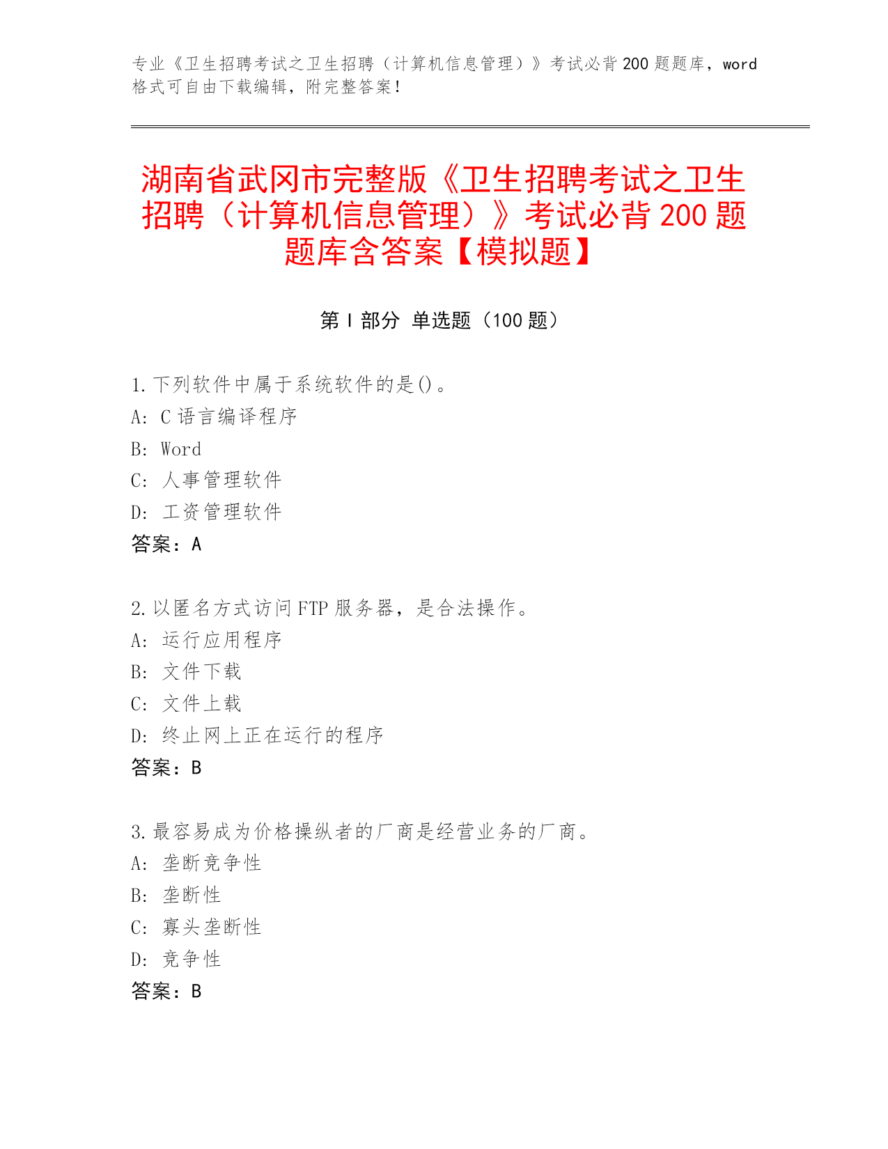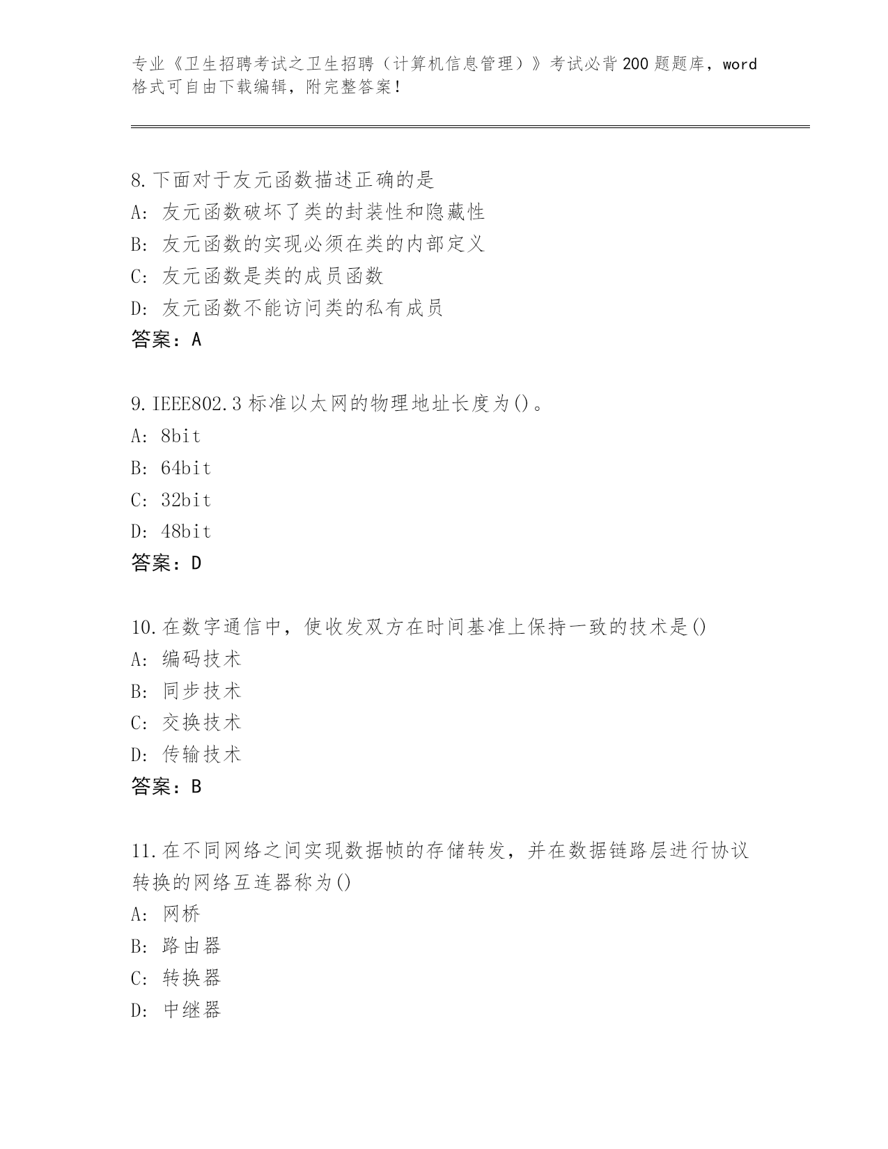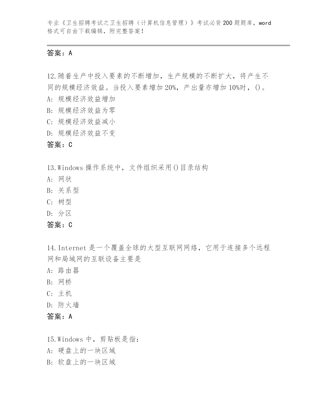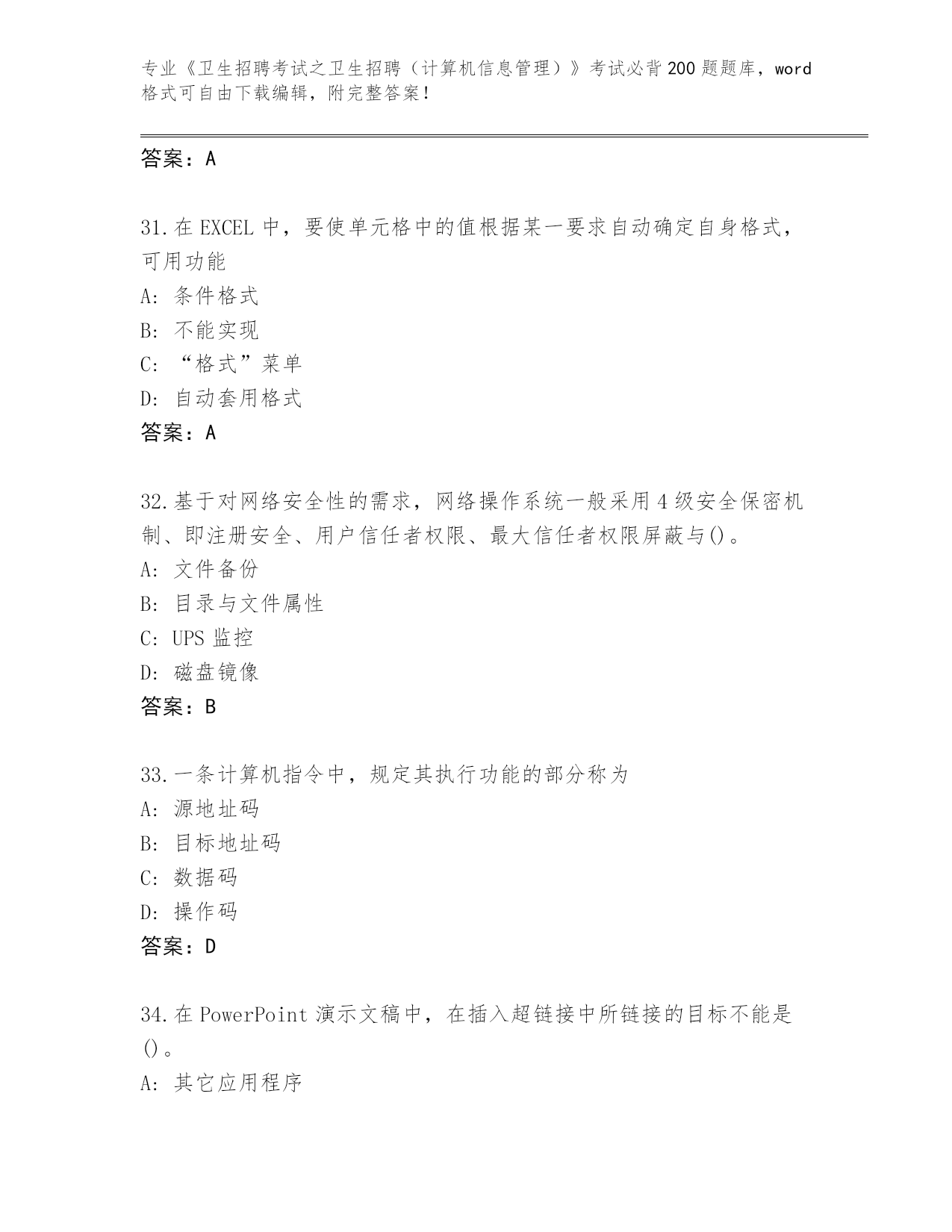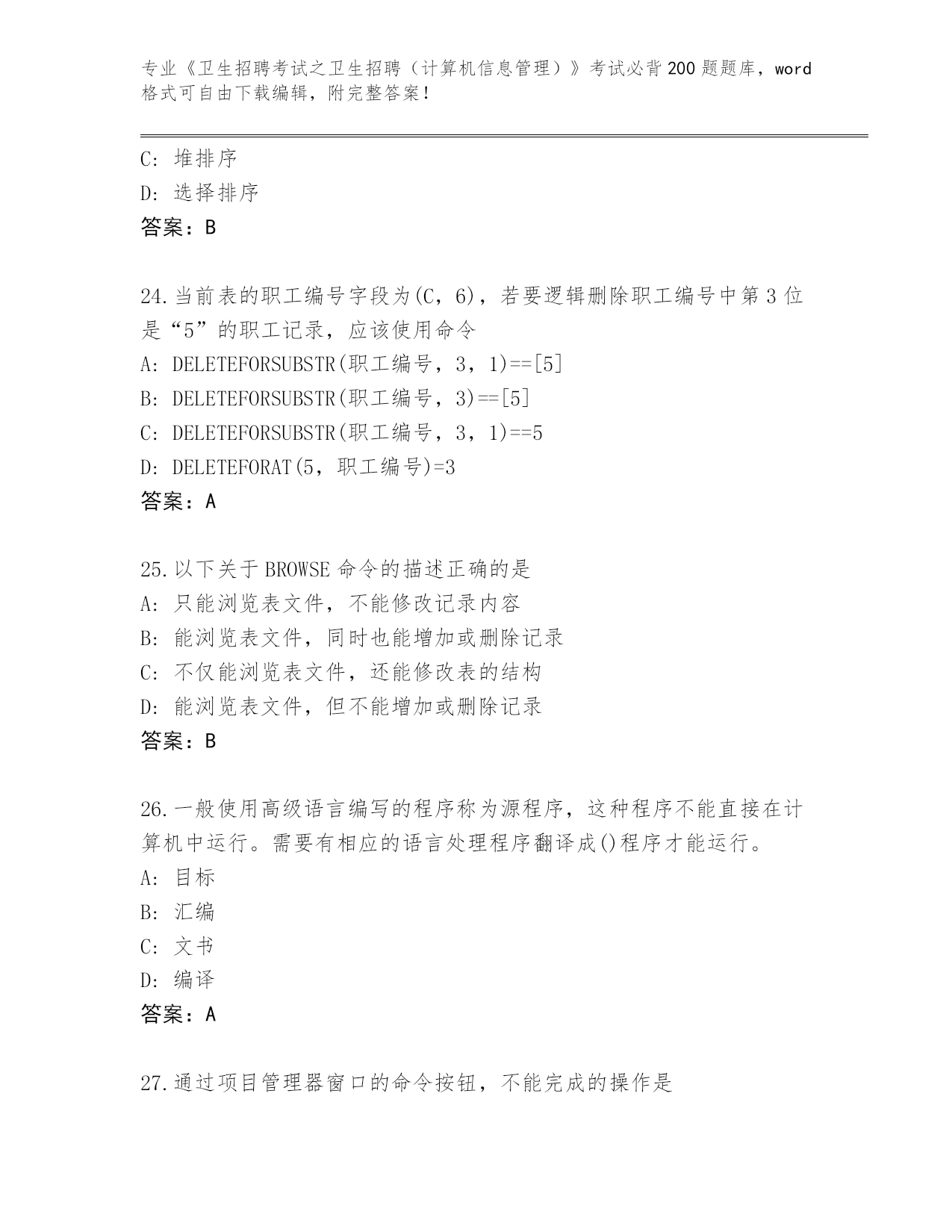 整理湖南省《卫生招聘考试之卫生招聘(计算机信息管理)》考试必背200题题库(名师系列)