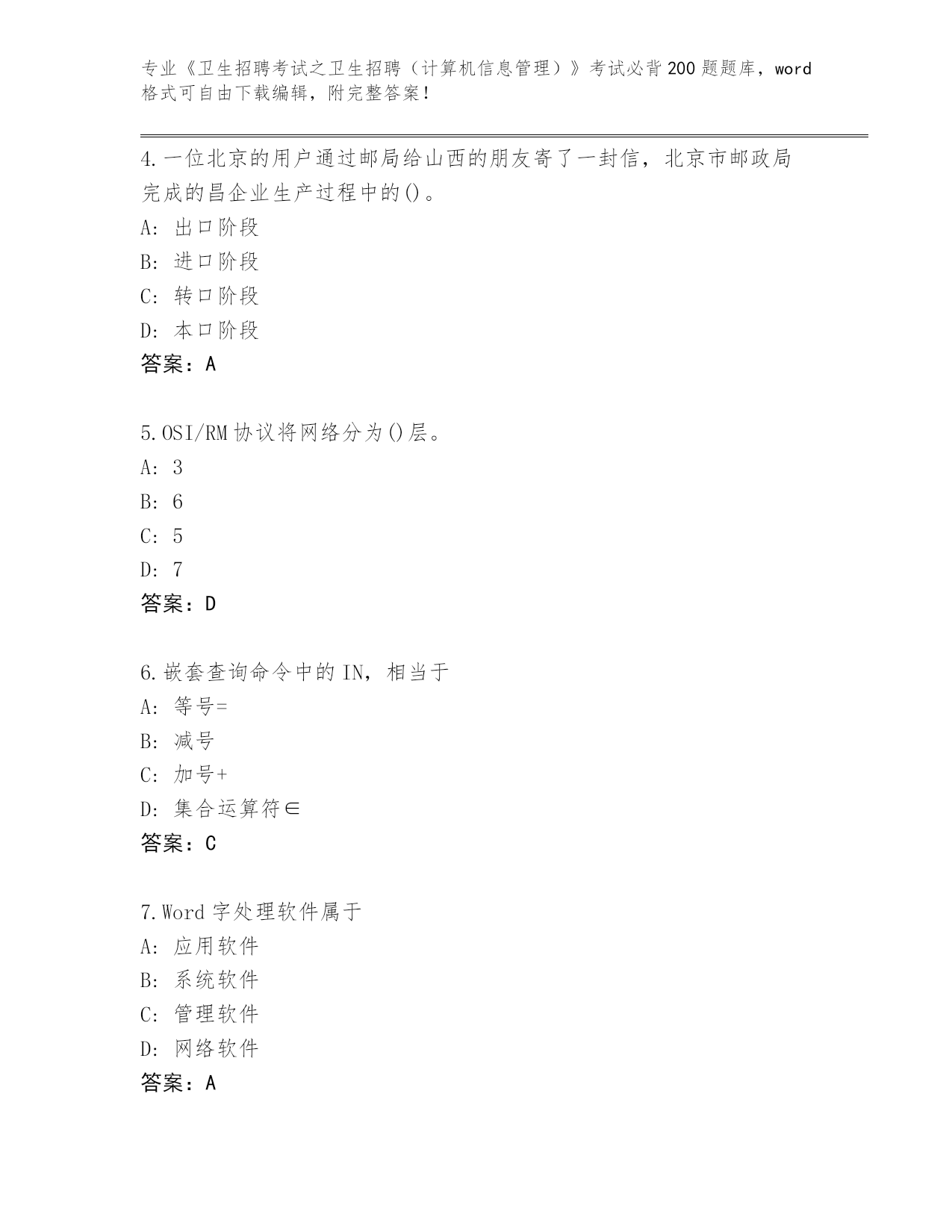 湖南省2024年《卫生招聘考试之卫生招聘(计算机信息管理)》考试必背200题完整版(模拟题)
