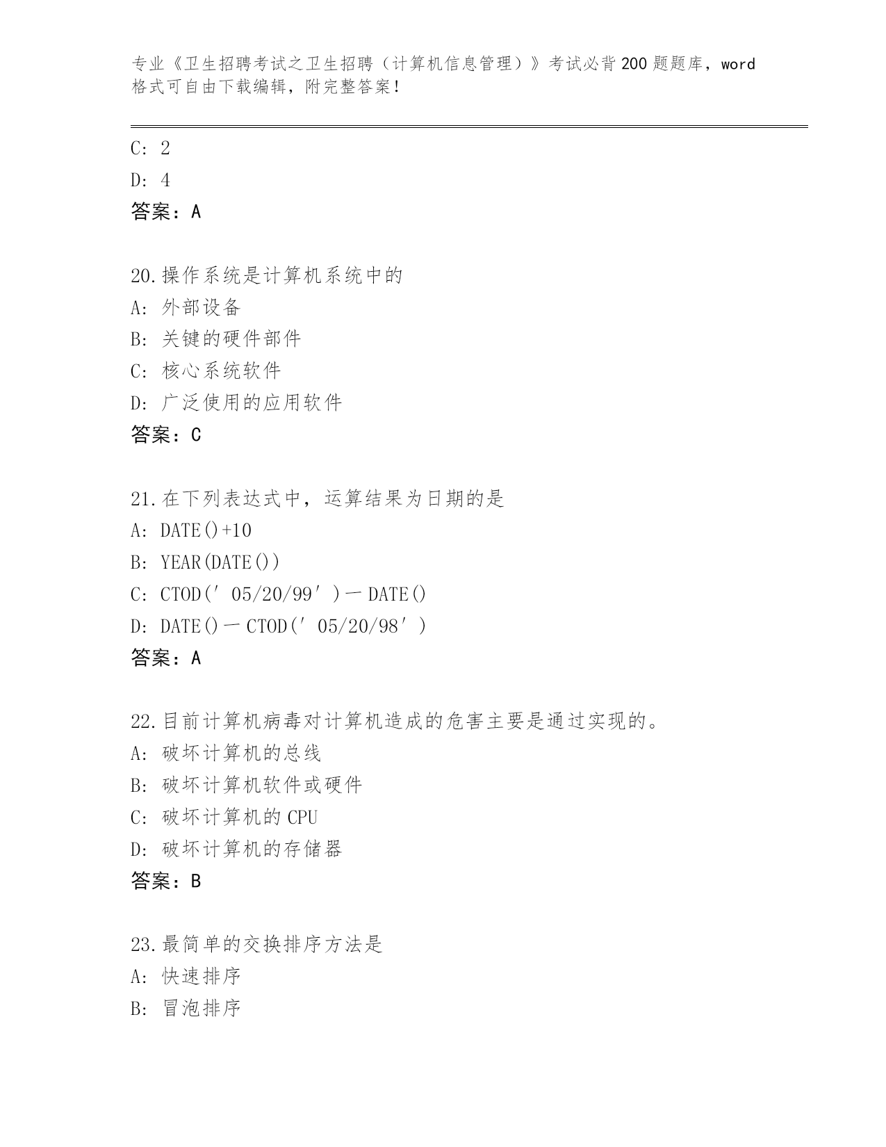 2024年湖南省武冈市《卫生招聘考试之卫生招聘(计算机信息管理)》资格考试必背200题题库大全(能力提升)
