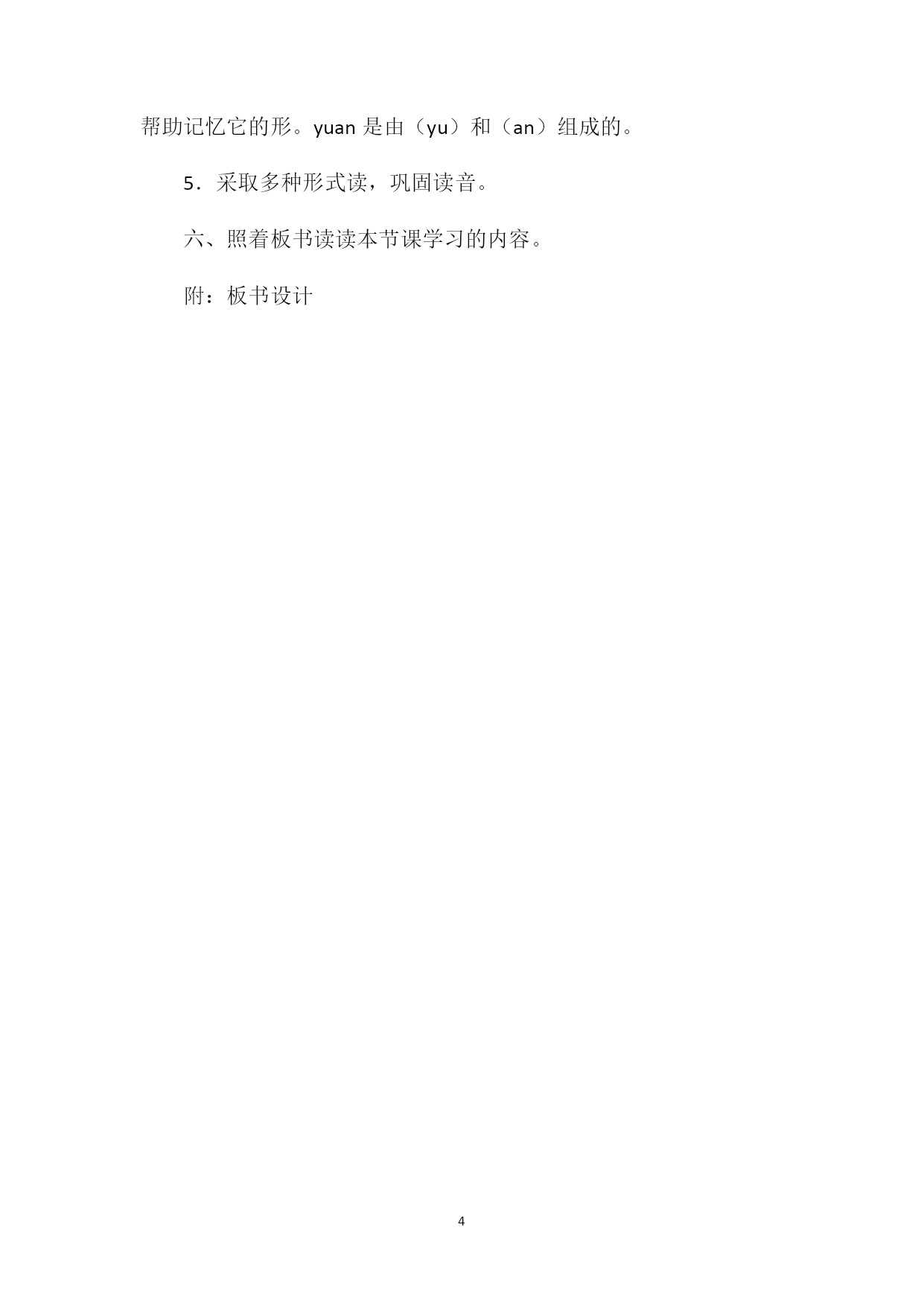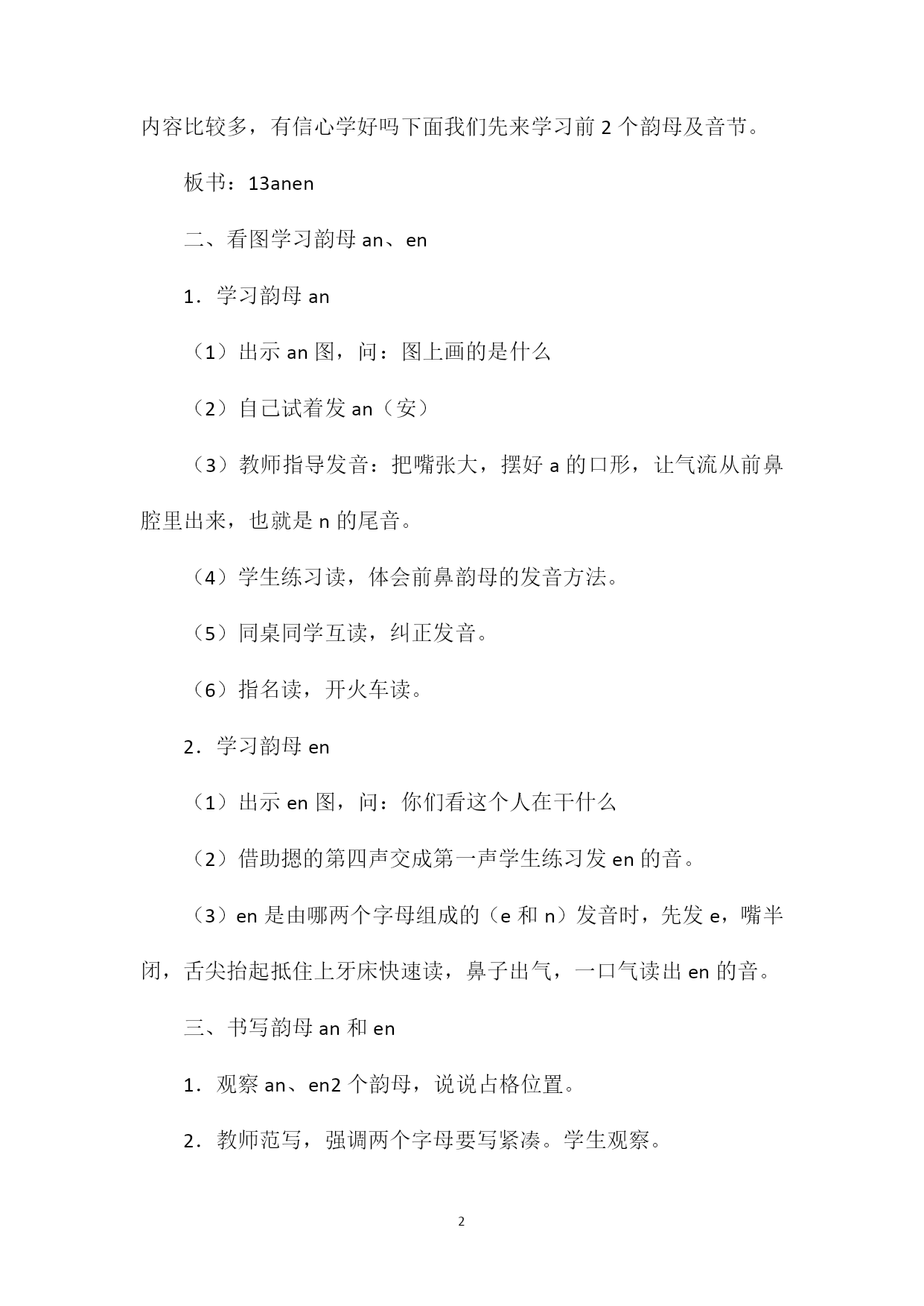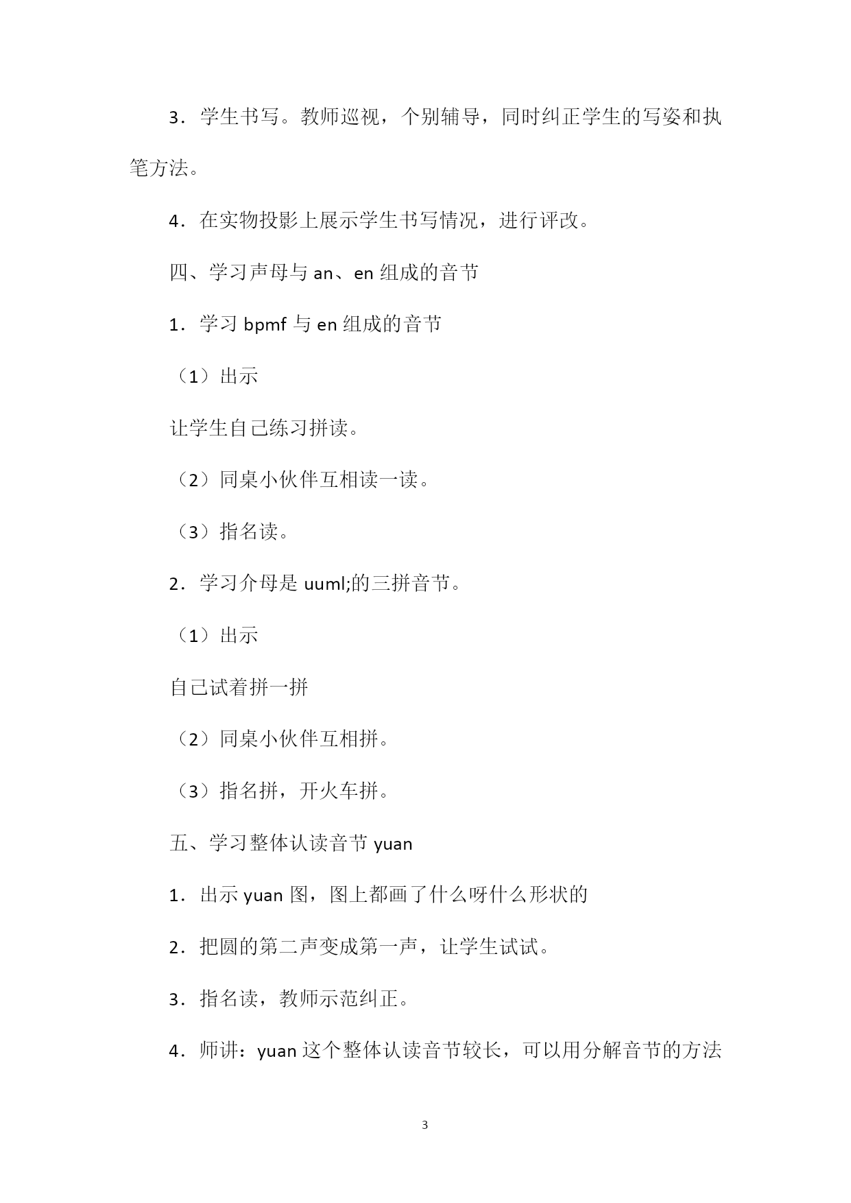 PAGEPAGE4教学设计示例1第一课时教学目的:1.学会前鼻韵母an、en2个复韵母,读准字音,认清形,能在四线三格中正确书写。2.学习声母与an、en组成的音节,准确拼读音节,读准三拼音节,复习uuml;上两点省写规则。3.学习整体认读音节yuan。教学重点:1.学会韵母an、en2个复韵母,读准音,认清形,能正确书写。2.学会声母与an、en组成的音节和整体认读音节。教学难点:学会介母是uuml;的三拼音节,读准音节juan、quan、xuan。教学过程:一、谈话导入我们到目前为止学习了哪些复韵母能按顺序说说吗(ai、ei、ui、ao、ou、iu、ie、uuml;e、er)。今天我们一起来学习第13课,再认识几个韵母朋友,请同学们打开书看看。这课书的内容比较多,有信心学好吗下面我们先来学习前2个韵母及音节。板书:13anen二、看图学习韵母an、en1.学习韵母an(1)出示an图,问:图上画的是什么(2)自己试着发an(安)(3)教师指导发音:把嘴张大,摆好a的口形,让气流从前鼻腔里出来,也就是n的尾音。(4)学生练习读,体会前鼻韵母的发音方法。(5)同桌同学互读,纠正发音。(6)指名读,开火车读。2.学习韵母en(1)出示en图,问:你们看这个人在干什么(2)借助摁的第四声交成第一声学生练习发en的音。(3)en是由哪两个字母组成的(e和n)发音时,先发e,嘴半闭,舌尖抬起抵住上牙床快速读,鼻子出气,一口气读出en的音。三、书写韵母an和en1.观察an、en2个韵母,说说占格位置。2.教师范写,强调两个字母要写紧凑。学生观察。3.学生书写。教师巡视,个别辅导,同时纠正学生的写姿和执笔方法。4.在实物投影上展示学生书写情况,进行评改。四、学习声母与an、en组成的音节1.学习bpmf与en组成的音节(1)出示让学生自己练习拼读。(2)同桌小伙伴互相读一读。(3)指名读。2.学习介母是uuml;的三拼音节。(1)出示自己试着拼一拼(2)同桌小伙伴互相拼。(3)指名拼,开火车拼。五、学习整体认读音节yuan1.出示yuan图,图上都画了什么呀什么形状的2.把圆的第二声变成第一声,让学生试试。3.指名读,教师示范纠正。4.师讲:yuan这个整体认读音节较长,可以用分解音节的方法帮助记忆它的形。yuan是由(yu)和(an)组成的。5.采取多种形式读,巩固读音。六、照着板书读读本节课学习的内容。附:板书设计