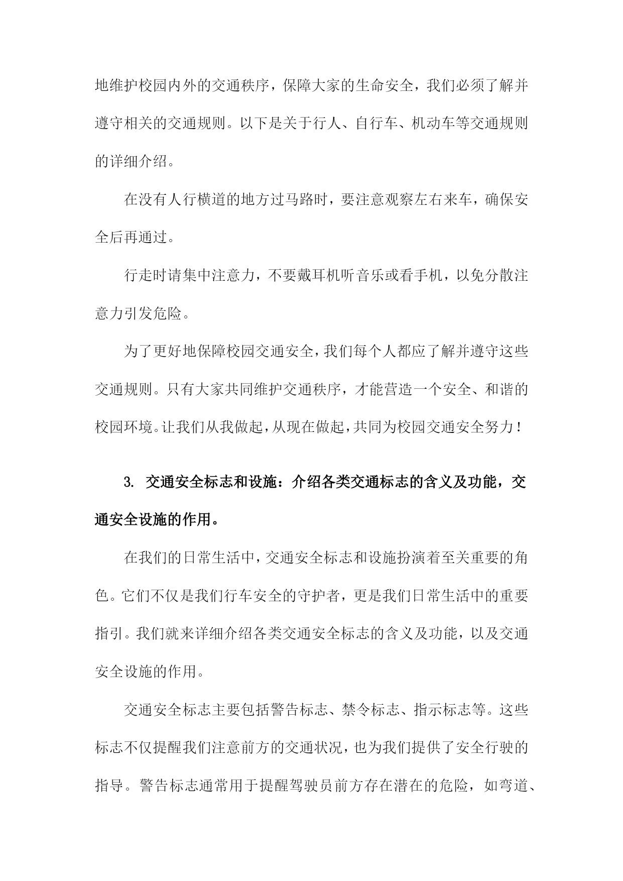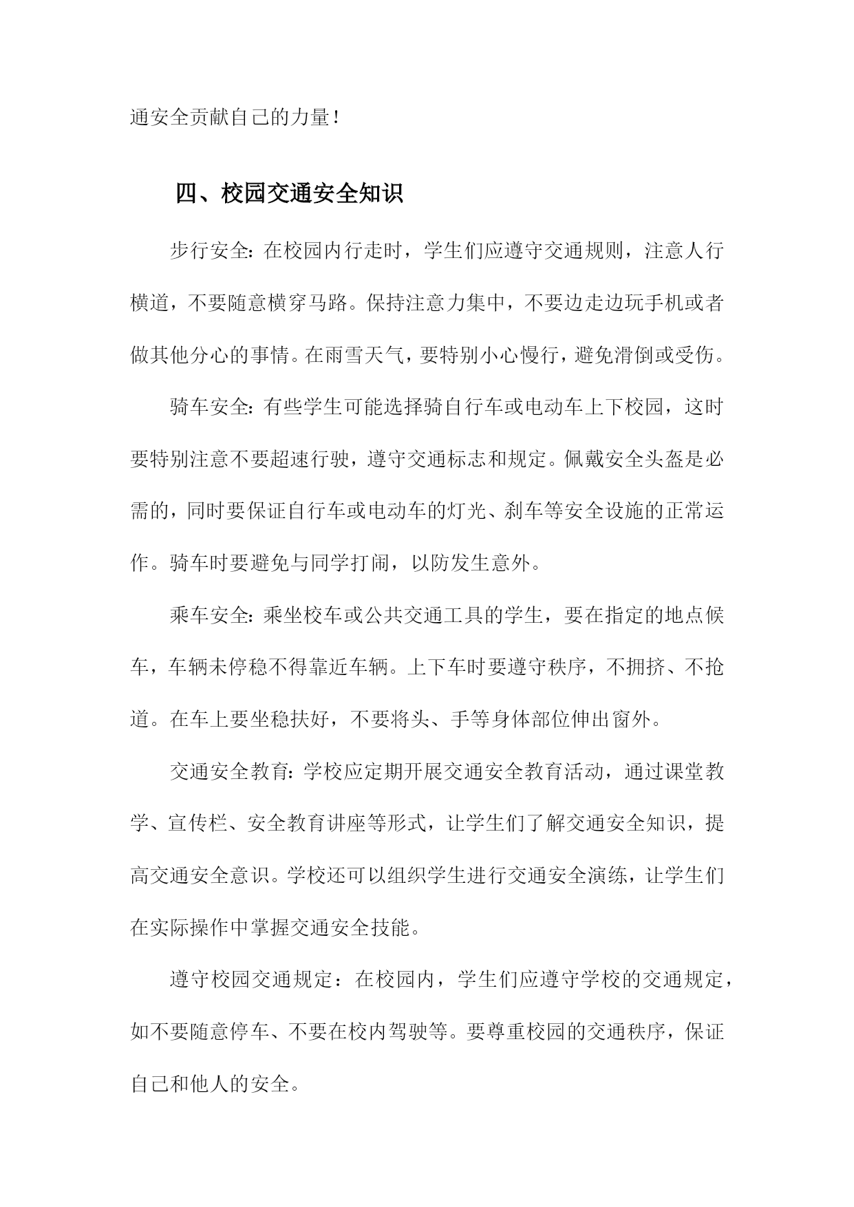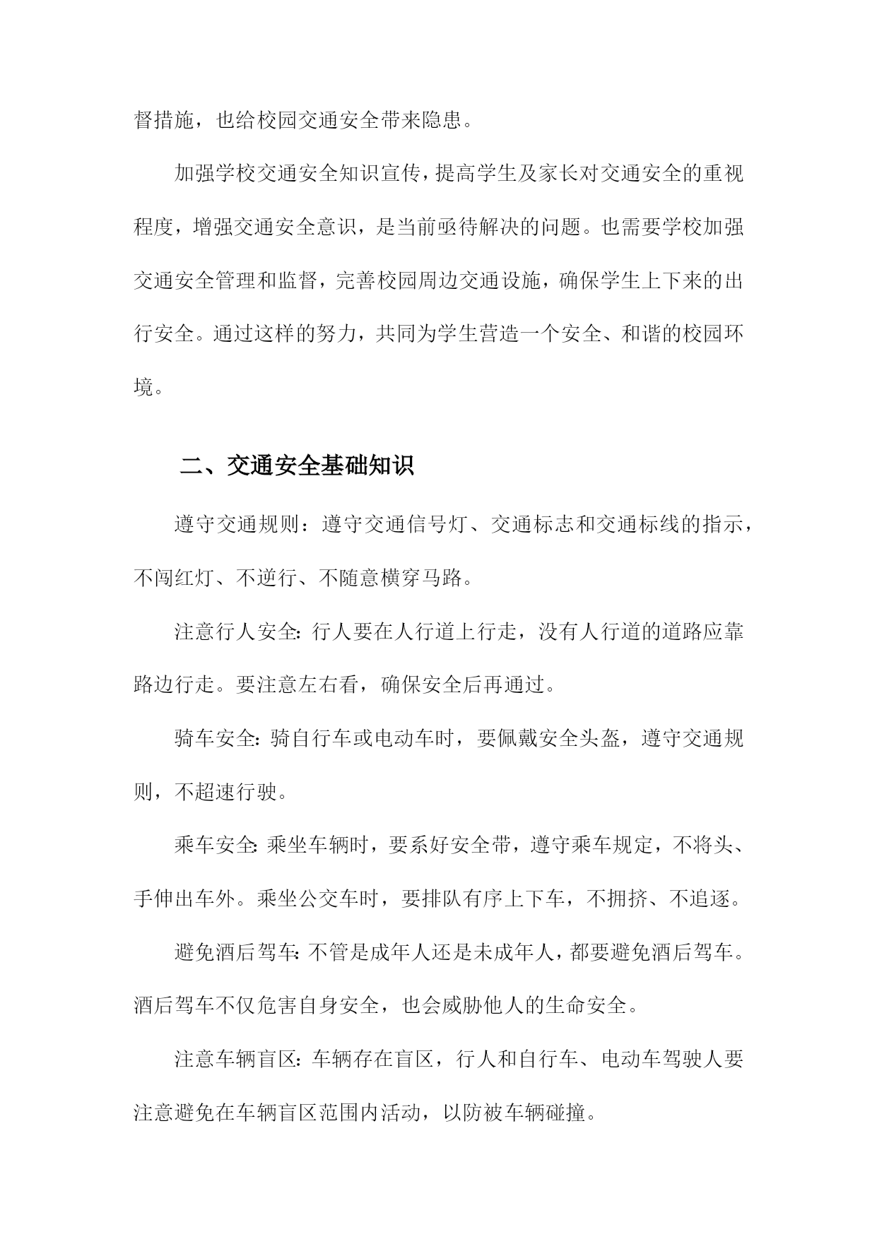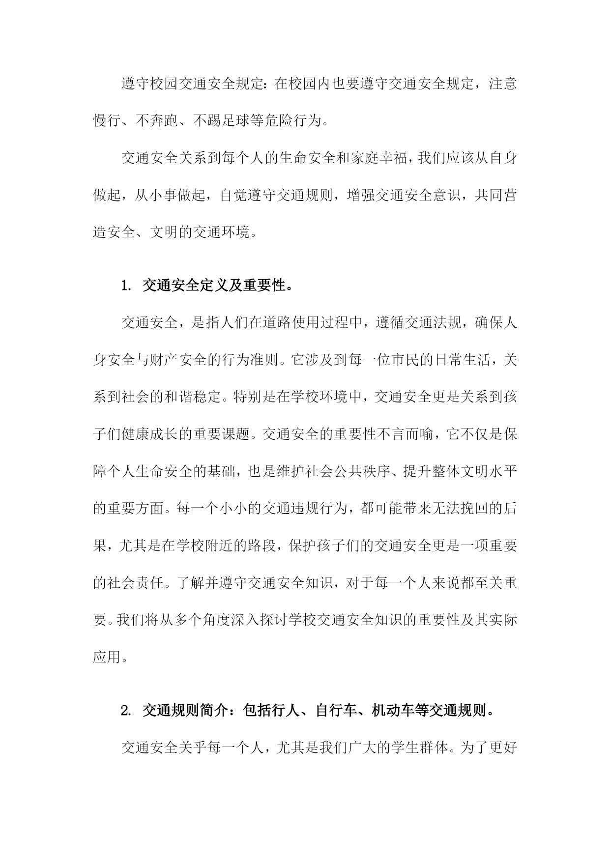 学校交通安全知识宣传一、内容简述交通安全概念及重要性:强调交通安全对于每个人生命财产安全的重要性,引导师生树立正确的交通安全观念。校园交通安全现状分析:通过对校园内交通状况的观察与研究,指出存在的安全隐患和常见问题,以便有针对性地提出解决方案。交通安全法规普及:介绍与校园生活息息相关的交通安全法律法规,提醒师生遵守交通规则,增强法制意识。安全出行常识教育:普及行人、骑车人、乘车人安全出行的基本常识,包括过马路、乘车、骑车等方面的注意事项。交通事故应对与自救:教授师生在遭遇交通事故时如何正确应对,如何自救与互救,降低事故损失。宣传倡导活动:鼓励师生参与交通安全宣传倡导活动,共同营造安全、文明的校园交通环境。1.宣传目的:普及交通安全知识,提高学生交通安全意识,预防和减少交通事故的发生。我们进行这次学校交通安全知识宣传的首要目的在于普及交通安全知识。了解交通规则、认识交通安全的重要性是预防交通事故的第一道防线。尤其对于学生群体而言,他们日常出行频繁,交通安全知识的普及尤为关键。我们致力于通过普及交通安全知识和提高安全意识,达到预防和减少交通事故发生的目标。事故往往发生在疏忽之间,而宣传教育的目的正是为了提醒学生们时刻保持警惕,增强他们的风险意识,从而减少不必要的交通事故,保障学生们的生命安全,为创建一个安全、和谐、稳定的校园环境打下坚实的基础。2.背景分析:学校是学生成长的重要场所,交通安全对学生生命安全和身体健康至关重要。介绍当前学校交通安全形势及存在的问题。学校是学生成长的关键阶段,承载着无数家庭的期望与梦想。在这一重要场所,学生的生命安全和身体健康无疑是最为重要的。随着城市化进程的加快和交通拥堵问题的日益严重,学校交通安全问题逐渐凸显,形势严峻。学校交通安全面临着多方面的挑战和存在的问题。随着机动车数量的急剧增长,校园周边道路交通状况日益复杂,交通安全隐患增多。部分学生及家长对交通安全的重要性认识不足,缺乏交通安全意识和自我保护能力,如不遵守交通规则、随意横穿马路等行为时有发生。部分学校交通安全教育缺失或不到位,缺乏有效的交通安全管理和监督措施,也给校园交通安全带来隐患。加强学校交通安全知识宣传,提高学生及家长对交通安全的重视程度,增强交通安全意识,是当前亟待解决的问题。也需要学校加强交通安全管理和监督,完善校园周边交通设施,确保学生上下来的出行安全。通过这样的努力,共同为学生营造一个安全、和谐的校园环境。二、交通安全基础知识遵守交通规则:遵守交通信号灯、交通标志和交通标线的指示,不闯红灯、不逆行、不随意横穿马路。注意行人安全:行人要在人行道上行走,没有人行道的道路应靠路边行走。要注意左右看,确保安全后再通过。骑车安全:骑自行车或电动车时,要佩戴安全头盔,遵守交通规则,不超速行驶。乘车安全:乘坐车辆时,要系好安全带,遵守乘车规定,不将头、手伸出车外。乘坐公交车时,要排队有序上下车,不拥挤、不追逐。避免酒后驾车:不管是成年人还是未成年人,都要避免酒后驾车。酒后驾车不仅危害自身安全,也会威胁他人的生命安全。注意车辆盲区:车辆存在盲区,行人和自行车、电动车驾驶人要注意避免在车辆盲区范围内活动,以防被车辆碰撞。遵守校园交通安全规定:在校园内也要遵守交通安全规定,注意慢行、不奔跑、不踢足球等危险行为。交通安全关系到每个人的生命安全和家庭幸福,我们应该从自身做起,从小事做起,自觉遵守交通规则,增强交通安全意识,共同营造安全、文明的交通环境。1.交通安全定义及重要性。交通安全,是指人们在道路使用过程中,遵循交通法规,确保人身安全与财产安全的行为准则。它涉及到每一位市民的日常生活,关系到社会的和谐稳定。特别是在学校环境中,交通安全更是关系到孩子们健康成长的重要课题。交通安全的重要性不言而喻,它不仅是保障个人生命安全的基础,也是维护社会公共秩序、提升整体文明水平的重要方面。每一个小小的交通违规行为,都可能带来无法挽回的后果,尤其是在学校附近的路段,保护孩子们的交通安全更是一项重要的社会责任。了解并遵守交通安全知识,对于每一个人来说都至关重要。我们将从多个角度深入探讨学校交通安全知识的重要性及其实际应用。2.交通规则简介:包括行人、自行车、机动车等交通规则。交通安全关乎每一个人,尤其是我们广大的学生群体。为了更好地维护校园内外的交通秩序,保障大家的生命安全,我们必须了解并遵守相关的交通规则。以下是关于行人、自行车、机动车等交通规则的详细介绍。在没有人行横道的地方过马路时,要注意观察左右来车,确保安全后再通过。行走时请集中注意力,不要戴耳机听音乐或看手机,以免分散注意力引发危险。为了更好地保障校园交通安全,我们每个人都应了解并遵守这些交通规则。只有大家共同维护交通秩序,才能营造一个安全、