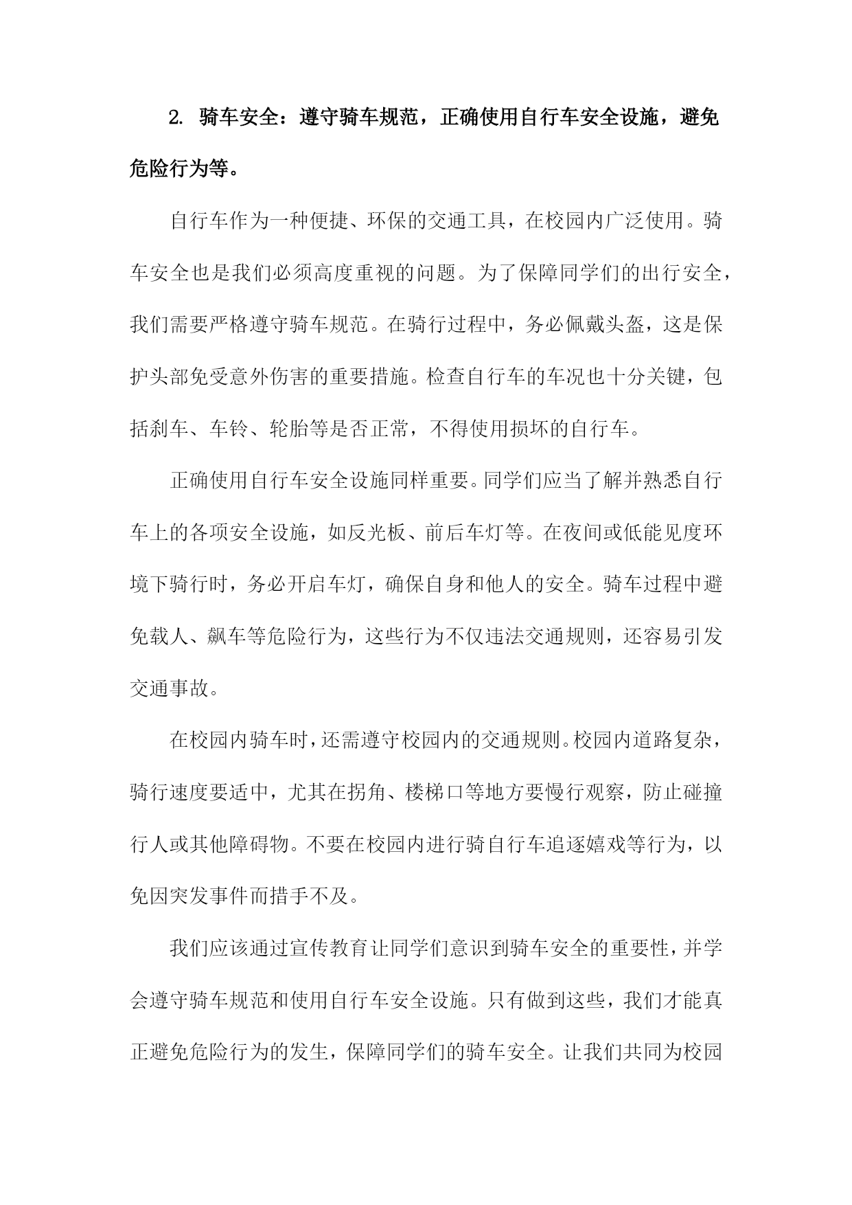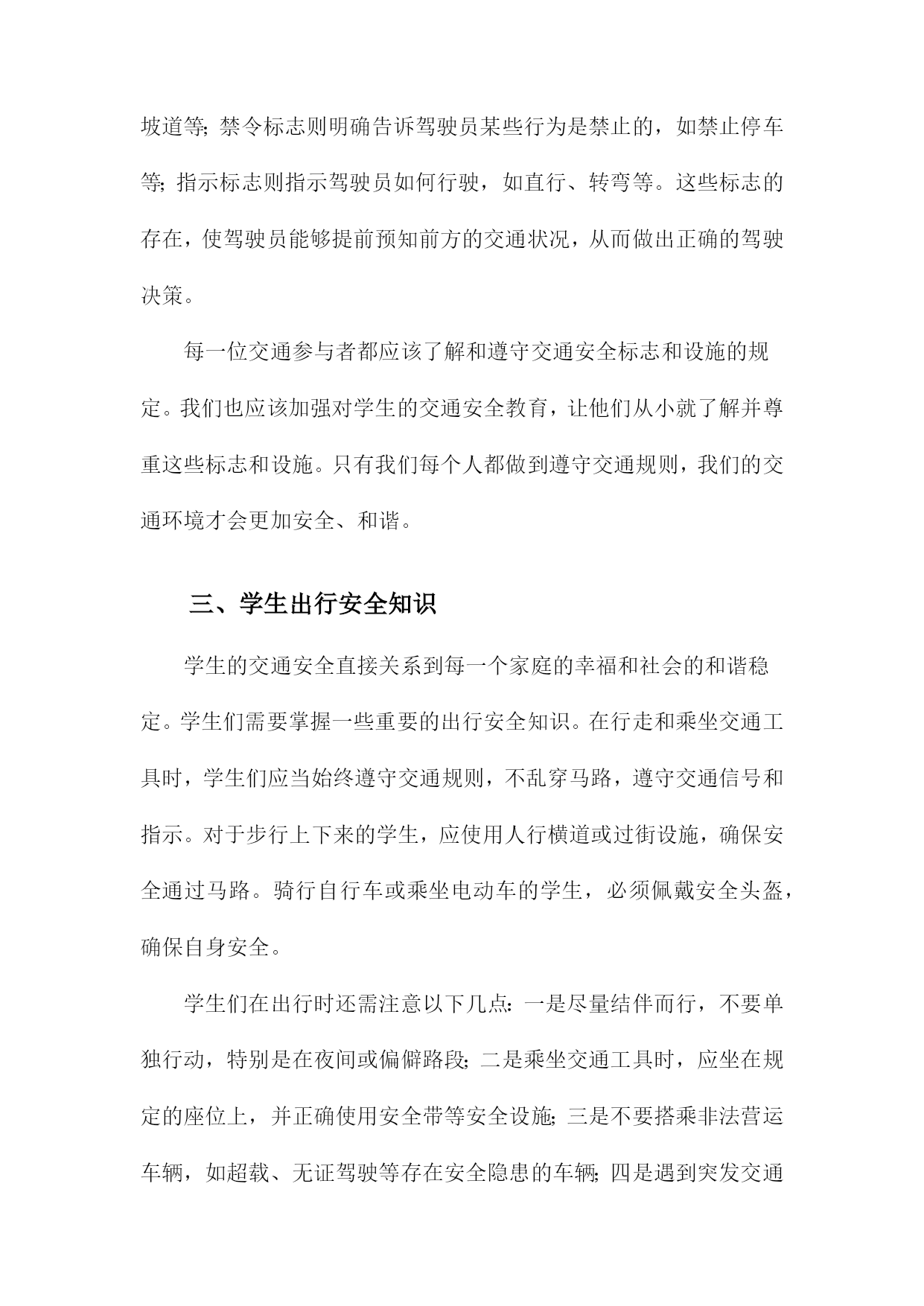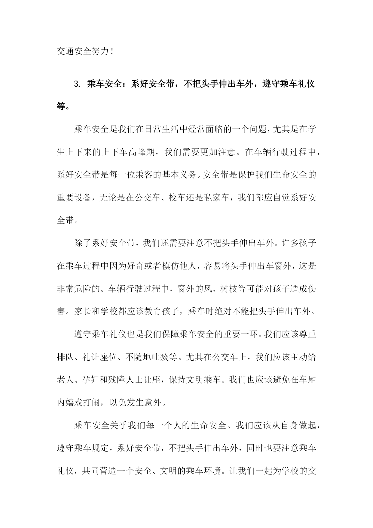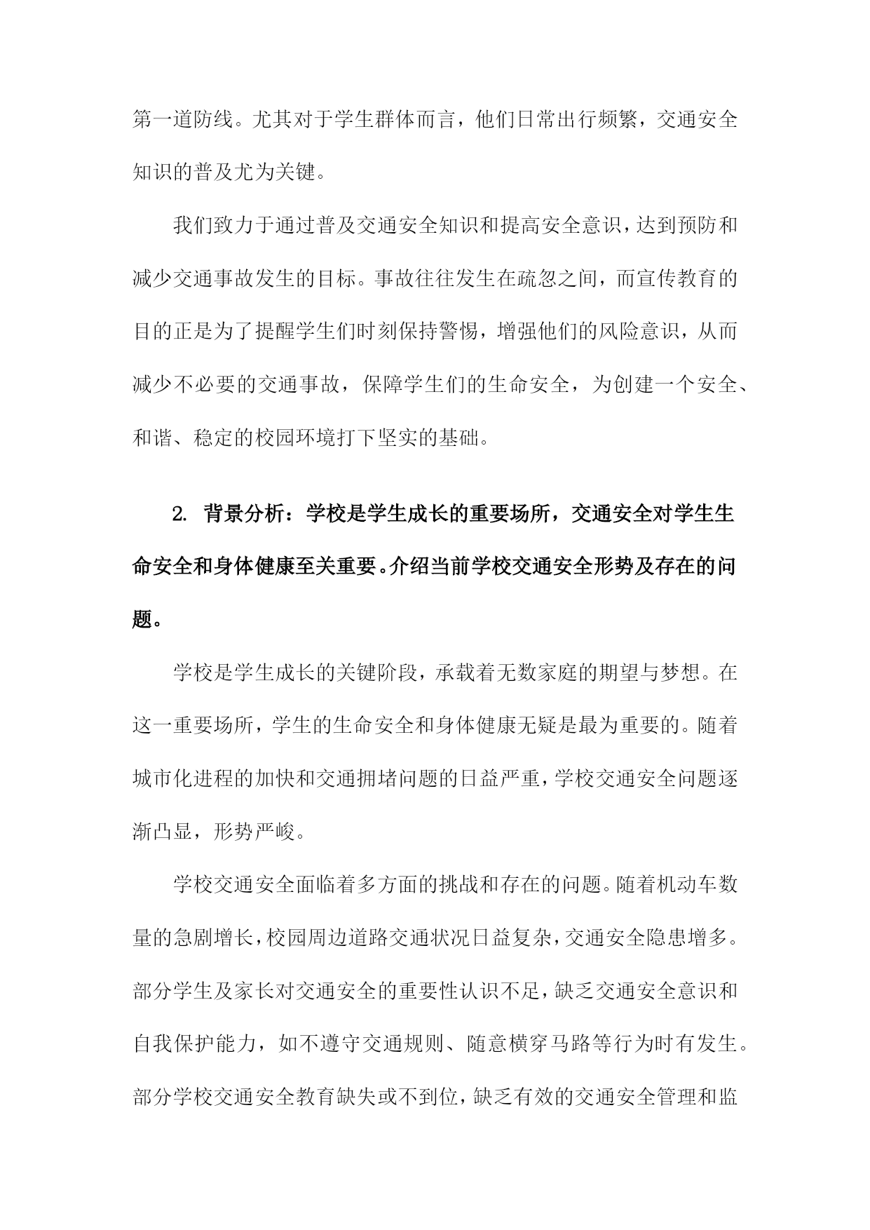 学校交通安全知识宣传一、内容简述交通安全概念及重要性:强调交通安全对于每个人生命财产安全的重要性,引导师生树立正确的交通安全观念。校园交通安全现状分析:通过对校园内交通状况的观察与研究,指出存在的安全隐患和常见问题,以便有针对性地提出解决方案。交通安全法规普及:介绍与校园生活息息相关的交通安全法律法规,提醒师生遵守交通规则,增强法制意识。安全出行常识教育:普及行人、骑车人、乘车人安全出行的基本常识,包括过马路、乘车、骑车等方面的注意事项。交通事故应对与自救:教授师生在遭遇交通事故时如何正确应对,如何自救与互救,降低事故损失。宣传倡导活动:鼓励师生参与交通安全宣传倡导活动,共同营造安全、文明的校园交通环境。1.宣传目的:普及交通安全知识,提高学生交通安全意识,预防和减少交通事故的发生。我们进行这次学校交通安全知识宣传的首要目的在于普及交通安全知识。了解交通规则、认识交通安全的重要性是预防交通事故的第一道防线。尤其对于学生群体而言,他们日常出行频繁,交通安全知识的普及尤为关键。我们致力于通过普及交通安全知识和提高安全意识,达到预防和减少交通事故发生的目标。事故往往发生在疏忽之间,而宣传教育的目的正是为了提醒学生们时刻保持警惕,增强他们的风险意识,从而减少不必要的交通事故,保障学生们的生命安全,为创建一个安全、和谐、稳定的校园环境打下坚实的基础。2.背景分析:学校是学生成长的重要场所,交通安全对学生生命安全和身体健康至关重要。介绍当前学校交通安全形势及存在的问题。学校是学生成长的关键阶段,承载着无数家庭的期望与梦想。在这一重要场所,学生的生命安全和身体健康无疑是最为重要的。随着城市化进程的加快和交通拥堵问题的日益严重,学校交通安全问题逐渐凸显,形势严峻。学校交通安全面临着多方面的挑战和存在的问题。随着机动车数量的急剧增长,校园周边道路交通状况日益复杂,交通安全隐患增多。部分学生及家长对交通安全的重要性认识不足,缺乏交通安全意识和自我保护能力,如不遵守交通规则、随意横穿马路等行为时有发生。部分学校交通安全教育缺失或不到位,缺乏有效的交通安全管理和监督措施,也给校园交通安全带来隐患。加强学校交通安全知识宣传,提高学生及家长对交通安全的重视程度,增强交通安全意识,是当前亟待解决的问题。也需要学校加强交通安全管理和监督,完善校园周边交通设施,确保学生上下来的出行安全。通过这样的努力,共同为学生营造一个安全、和谐的校园环境。二、交通安全基础知识遵守交通规则:遵守交通信号灯、交通标志和交通标线的指示,不闯红灯、不逆行、不随意横穿马路。注意行人安全:行人要在人行道上行走,没有人行道的道路应靠路边行走。要注意左右看,确保安全后再通过。骑车安全:骑自行车或电动车时,要佩戴安全头盔,遵守交通规则,不超速行驶。乘车安全:乘坐车辆时,要系好安全带,遵守乘车规定,不将头、手伸出车外。乘坐公交车时,要排队有序上下车,不拥挤、不追逐。避免酒后驾车:不管是成年人还是未成年人,都要避免酒后驾车。酒后驾车不仅危害自身安全,也会威胁他人的生命安全。注意车辆盲区:车辆存在盲区,行人和自行车、电动车驾驶人要注意避免在车辆盲区范围内活动,以防被车辆碰撞。遵守校园交通安全规定:在校园内也要遵守交通安全规定,注意慢行、不奔跑、不踢足球等危险行为。交通安全关系到每个人的生命安全和家庭幸福,我们应该从自身做起,从小事做起,自觉遵守交通规则,增强交通安全意识,共同营造安全、文明的交通环境。1.交通安全定义及重要性。交通安全,是指人们在道路使用过程中,遵循交通法规,确保人身安全与财产安全的行为准则。它涉及到每一位市民的日常生活,关系到社会的和谐稳定。特别是在学校环境中,交通安全更是关系到孩子们健康成长的重要课题。交通安全的重要性不言而喻,它不仅是保障个人生命安全的基础,也是维护社会公共秩序、提升整体文明水平的重要方面。每一个小小的交通违规行为,都可能带来无法挽回的后果,尤其是在学校附近的路段,保护孩子们的交通安全更是一项重要的社会责任。了解并遵守交通安全知识,对于每一个人来说都至关重要。我们将从多个角度深入探讨学校交通安全知识的重要性及其实际应用。2.交通规则简介:包括行人、自行车、机动车等交通规则。交通安全关乎每一个人,尤其是我们广大的学生群体。为了更好地维护校园内外的交通秩序,保障大家的生命安全,我们必须了解并遵守相关的交通规则。以下是关于行人、自行车、机动车等交通规则的详细介绍。在没有人行横道的地方过马路时,要注意观察左右来车,确保安全后再通过。行走时请集中注意力,不要戴耳机听音乐或看手机,以免分散注意力引发危险。为了更好地保障校园交通安全,我们每个人都应了解并遵守这些交通规则。只有大家共同维护交通秩序,才能营造一个安全、