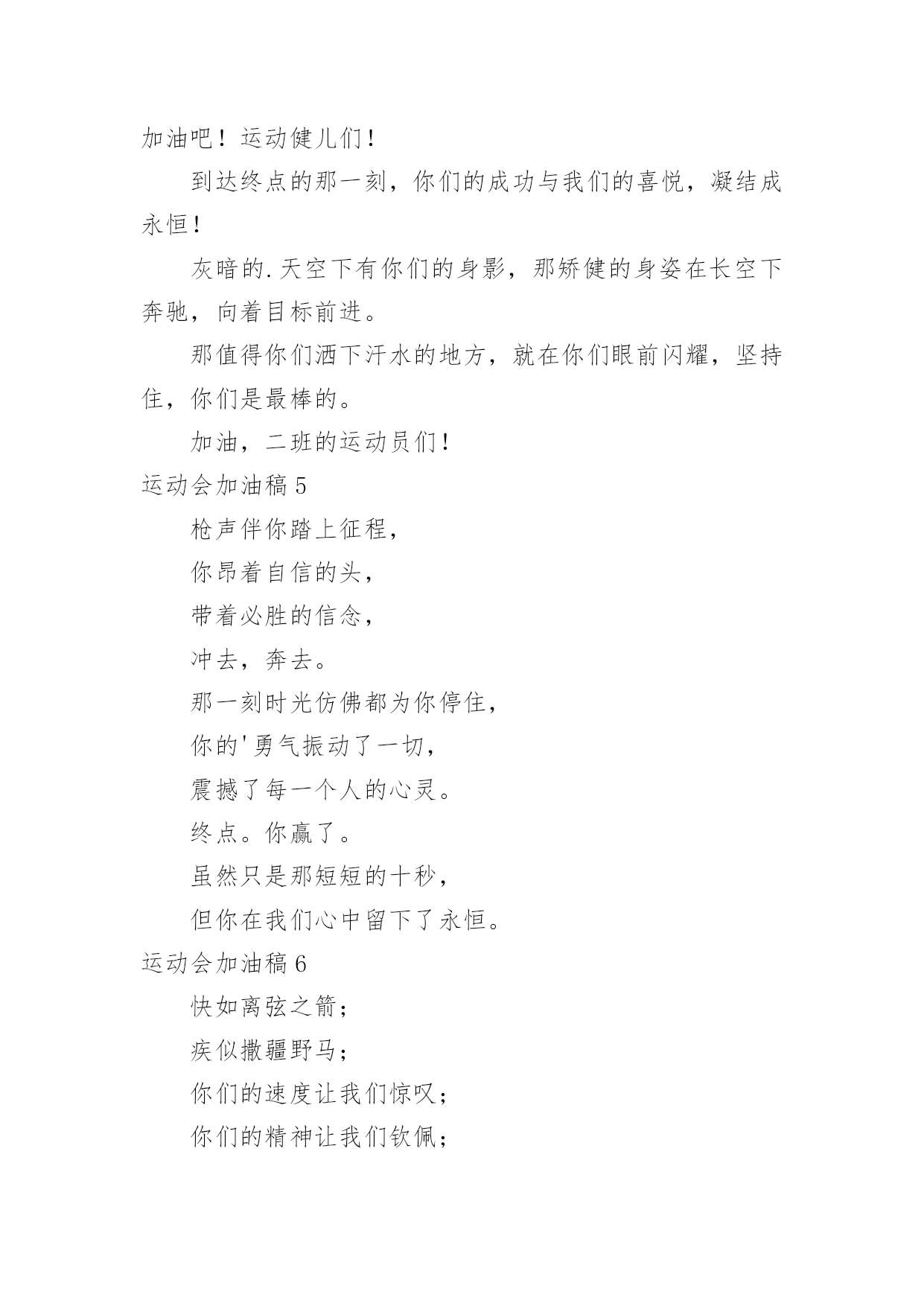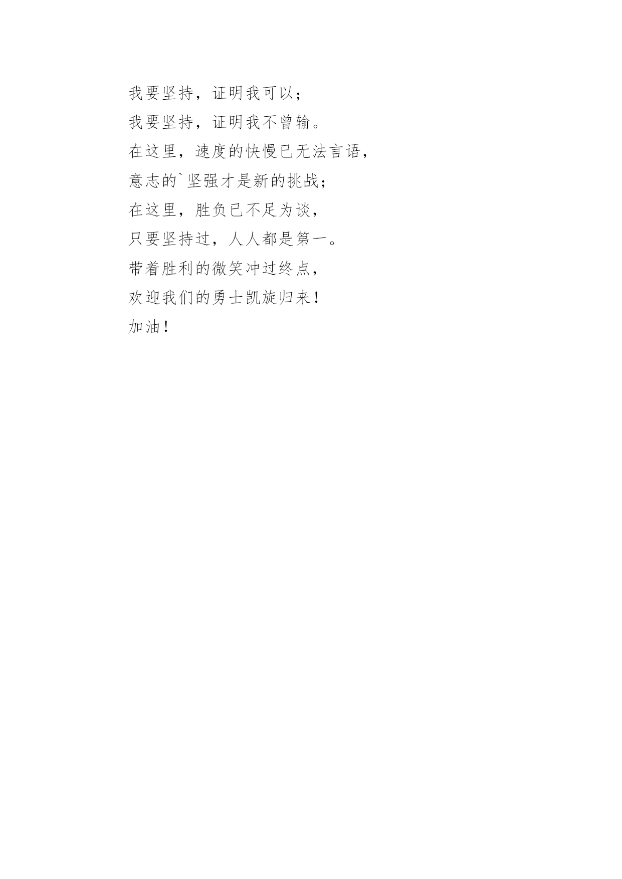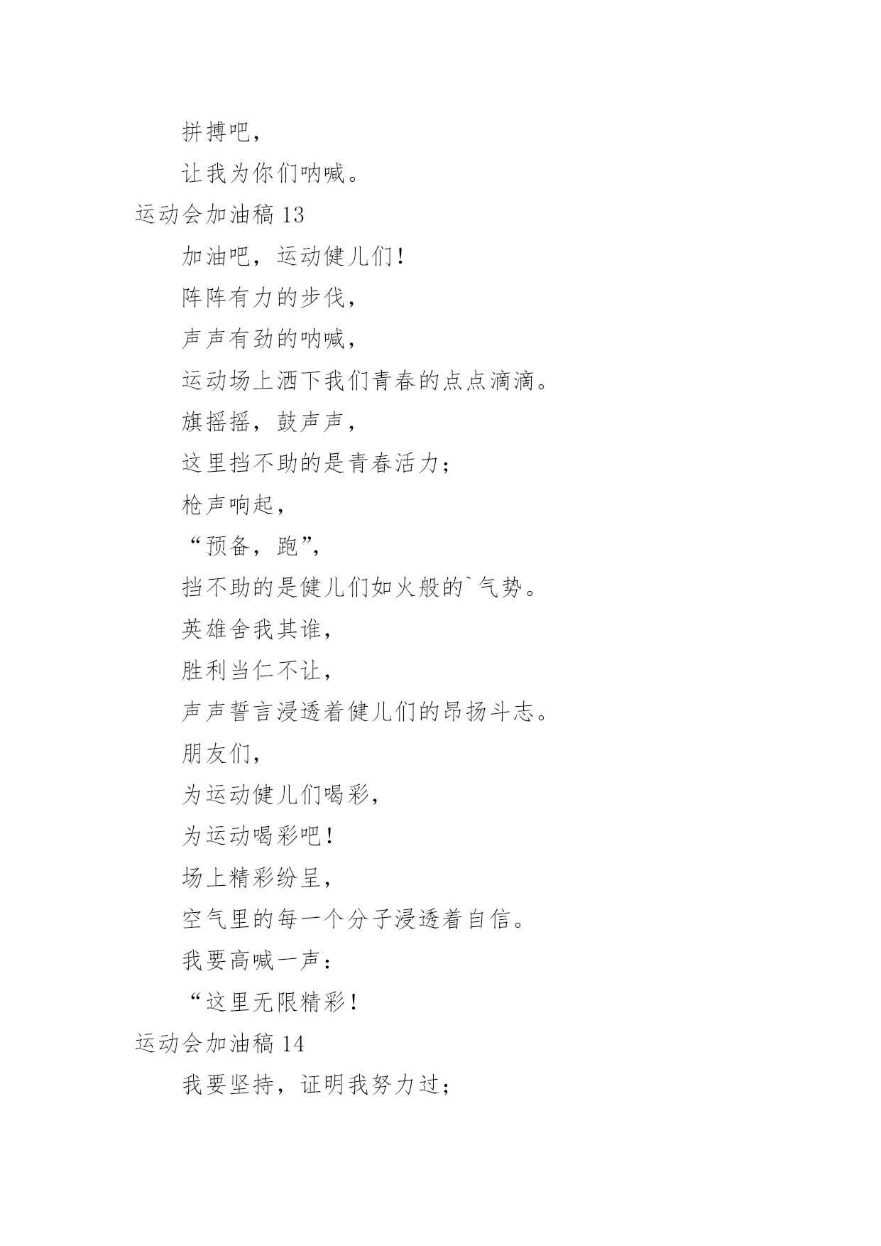 运动会加油稿运动会加油稿14篇[热]在社会一步步向前发展的今天,接触并使用加油稿的人越来越多,加油稿可以强化人们的自我认知,给予人正向的激励作用。那么你有了解过加油稿吗?以下是小编精心整理的运动会加油稿,仅供参考,欢迎大家阅读。运动会加油稿1走过荒山野岭高峡低谷,我们在沿途燃起篝火,一站一站的路被抛在身后,我们感到疲惫感到困惑。还有那么长的路伸向远方,远方那片星光藏在哪儿,远方那颗童话树躲在何处,努力吧,奋斗吧!远方有我们的'理想,有我们的希望!运动会加油稿2你迷惘,你无奈。你曾经为自己的`选择而后悔,但你依然没有辜负我们对你的期盼,瞧,你现在不正奔驰在跑道上吗?一圈两圈三圈……你不仅是向对手发起挑战,也是在顽强地战胜自我,对此你毫无怨言。我们佩服你,甚至为你捏了一把冷汗,但在你迈下最后一步地时候,带给我们的震撼真得不只一点点。运动会加油稿3我们可以欺瞒别人却无法欺骗自己当我们走向枝繁叶茂的五月青春就不再是一个谜向上的路总是坎坷又崎岖要永远保持最初的`浪漫真是不容易有人悲哀有人欣喜当我们跨越一座高山也就跨越了一个真实的自己运动会加油稿4呐喊阵阵,我们为你喝彩。欢呼阵阵,我们为你祝福。加油吧!运动健儿们!到达终点的那一刻,你们的成功与我们的喜悦,凝结成永恒!灰暗的.天空下有你们的身影,那矫健的身姿在长空下奔驰,向着目标前进。那值得你们洒下汗水的地方,就在你们眼前闪耀,坚持住,你们是最棒的。加油,二班的运动员们!运动会加油稿5枪声伴你踏上征程,你昂着自信的头,带着必胜的信念,冲去,奔去。那一刻时光仿佛都为你停住,你的'勇气振动了一切,震撼了每一个人的心灵。终点。你赢了。虽然只是那短短的十秒,但你在我们心中留下了永恒。运动会加油稿6快如离弦之箭;疾似撒疆野马;你们的速度让我们惊叹;你们的精神让我们钦佩;流汗千日,只为今日一搏;疾踏百步,只为终点一触;胜利在向你微笑;成功在向你招手;加油啊!健儿们!运动会加油稿7望着绿茵场上你愈渐沉重的步伐,赛前鼓励你的豪言壮语已变得苍白无力,此刻的我只有沉默,只能在心底为你默默地祈祷和祝福。明知赛场上的'3000是你的极限,你为什么还要义无返顾地去挑战?我想因为终点是一座辉煌的里程碑,上面篆刻着蓬勃青春的注释——爱拼才会赢。运动会加油稿8曾经你很失意;曾经你很彷徨,失意的你没有信心;彷徨的你没有目标,你好担心;我们好心疼,但踏上运动场的那一刻,你变了,你找到了自己的.使命与重任,你拥有了自信和自强,你说:既然来了,就努力奋斗,载誉而归,我有实力;好样的,你是对的,我们永远支持你,心儿为你跳动;青春为你骄傲。运动会加油稿9某一天醒在梦的旁边;手指间,光线有些特别;我能看得见,看见光在变,变成七彩的寓言,飞向梦的起点。某一天,飞奔在跑道间;两腮间,汗水不断流出;我能感觉到,感觉你在变,变成生活的`强者,奔向成功的边缘!运动会加油稿10也许你心里忐忑不安,我们的心里早已热血沸腾。昔日,长长的跑道上,留下了你深深的.足迹。抹不去你渗出的汗水,拉不动你沉重的双脚。你为了班级,不在乎自己疲惫,不在乎泪水和汗水,因为你心里有一种坚定的信念。为了班级,我能行。运动会加油稿11你是否感到,烈日的照射,那是烈日对你的祝福。你是否感到,彩旗的摇摆,那是彩旗对你的'呐喊。你是否感到,人们的注视,那是人们对你的希望。祝福在你身边,呐喊在你耳边,希望在你心中。在那一瞬间,你们像离了弦的箭,似流星,如闪电。运动场上你们最坚韧,不懈地追求,无悔地跑,运动场上你们最风采,你追我赶到终点,随着一阵热烈的掌声,比赛胜负已分出。运动会加油稿12运动场上有你飒爽的.英姿,运动场上有你拼搏的身影。面对着漫漫征途,你没有畏惧和退缩。任汗水大湿脊背,任疲惫爬满全身,你依然奋力追赶,只有一个目标,只有一个信念。为了班级的荣誉,拼搏吧,让我为你们呐喊。运动会加油稿13加油吧,运动健儿们!阵阵有力的步伐,声声有劲的呐喊,运动场上洒下我们青春的点点滴滴。旗摇摇,鼓声声,这里挡不助的是青春活力;枪声响起,“预备,跑”,挡不助的是健儿们如火般的`气势。英雄舍我其谁,胜利当仁不让,声声誓言浸透着健儿们的昂扬斗志。朋友们,为运动健儿们喝彩,为运动喝彩吧!场上精彩纷呈,空气里的每一个分子浸透着自信。我要高喊一声:“这里无限精彩!运动会加油稿14我要坚持,证明我努力过;我要坚持,证明我可以;我要坚持,证明我不曾输。在这里,速度的快慢已无法言语,意志的`坚强才是新的挑战;在这里,胜负已不足为谈,只要坚持过,人人都是第一。带着胜利的微笑冲过终点,欢迎我们的勇士凯旋归来!加油!