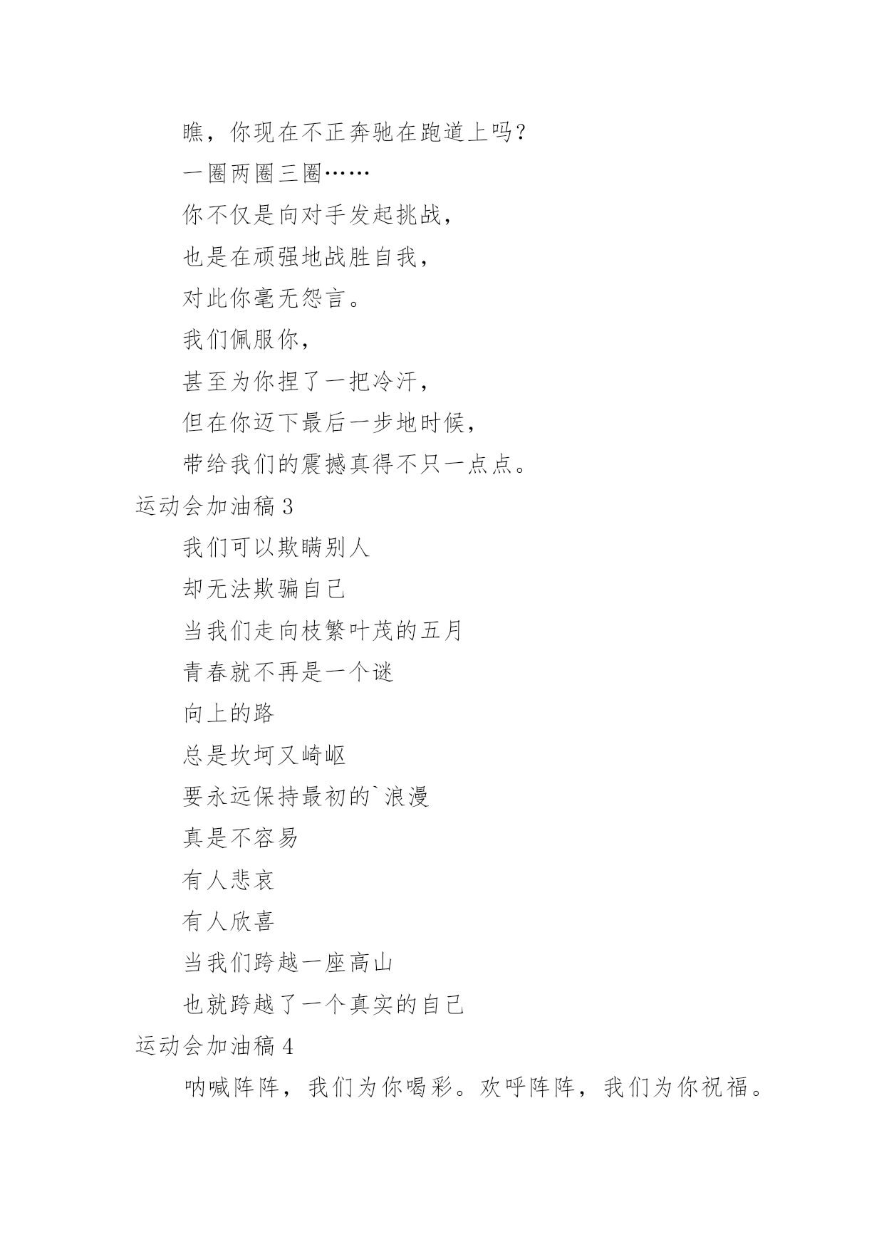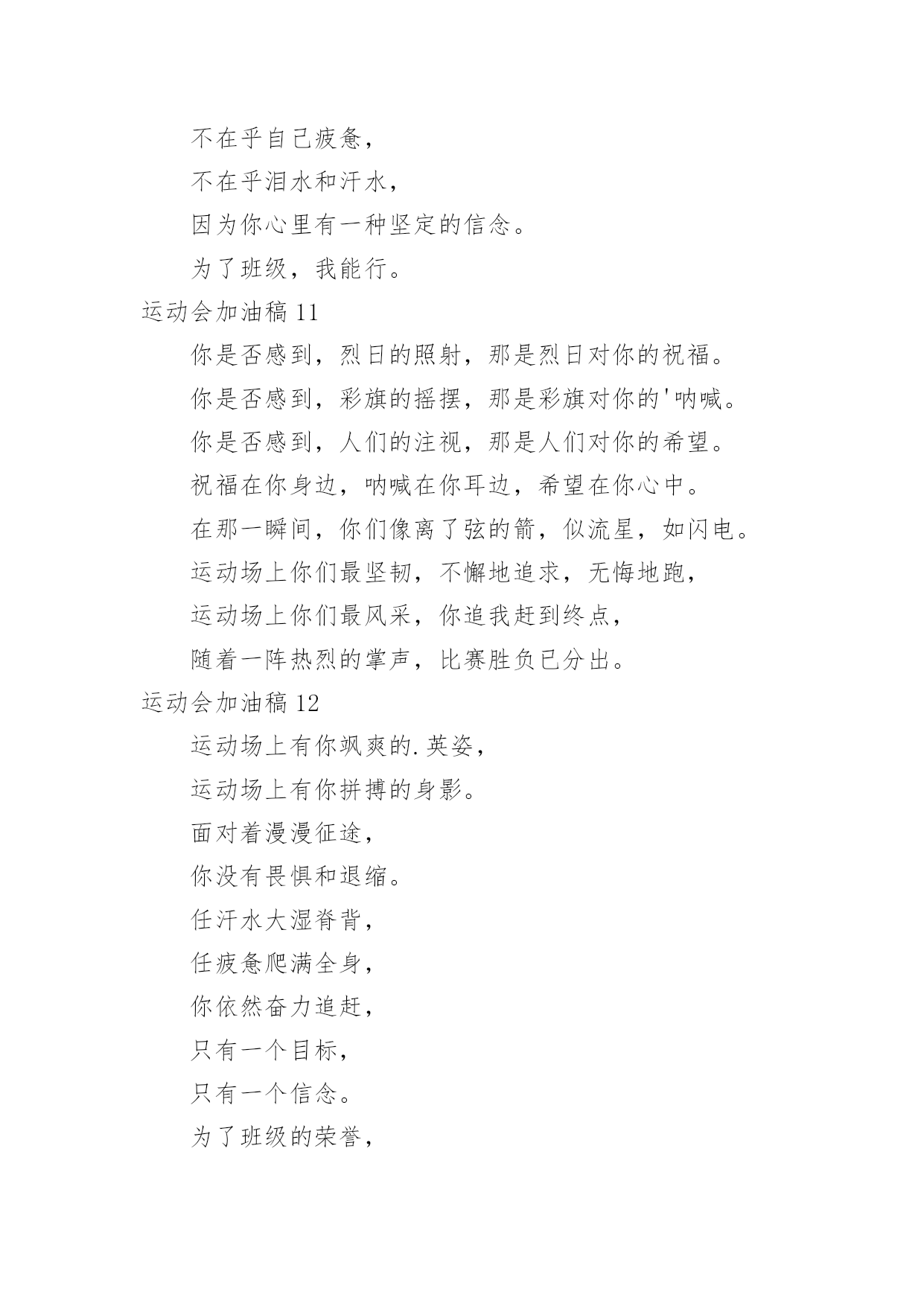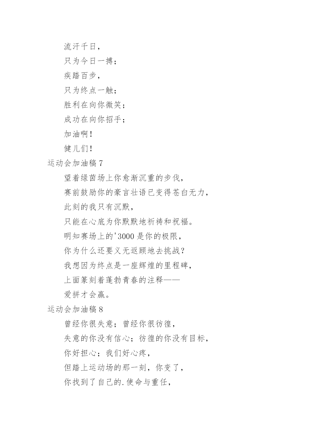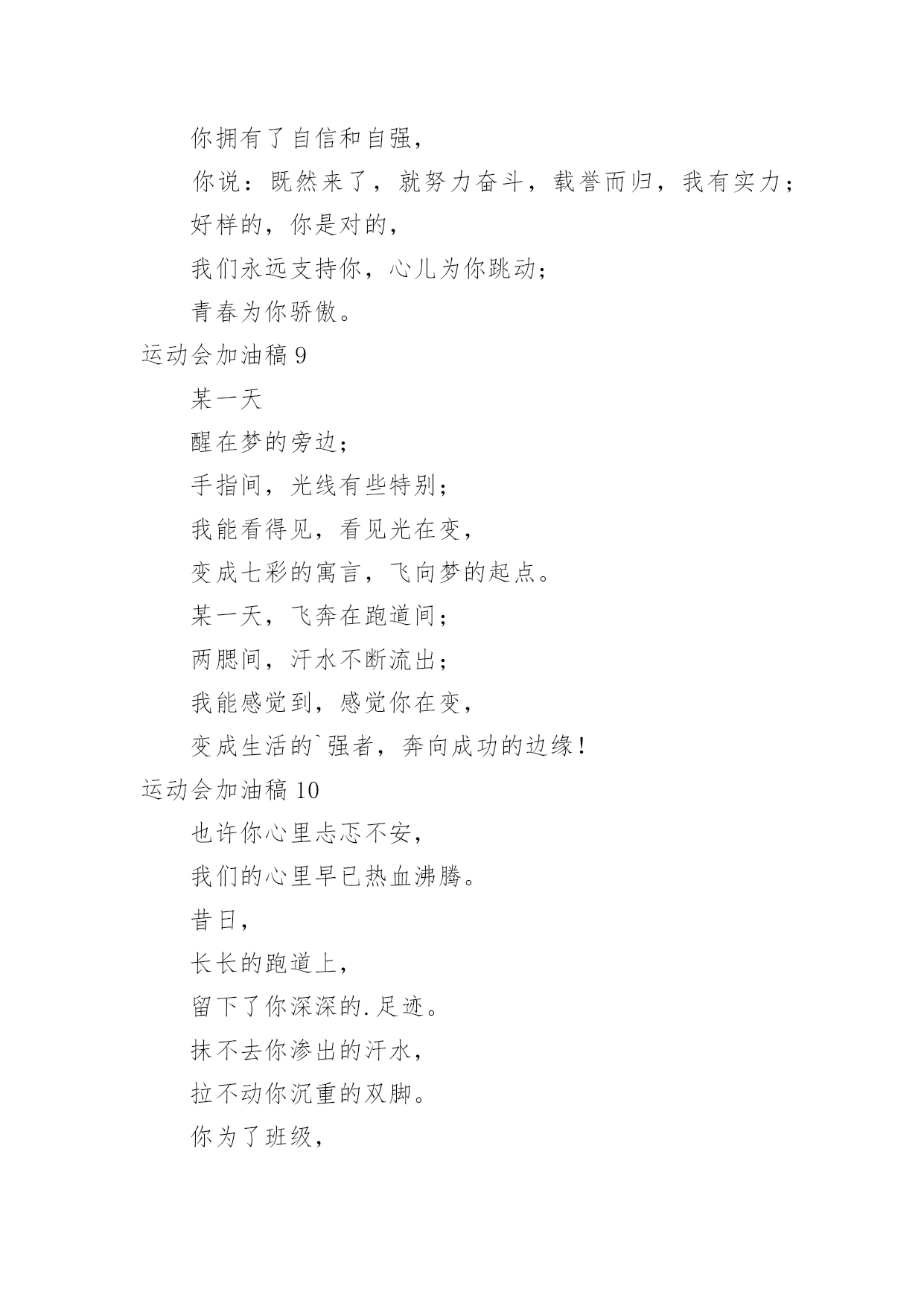运动会加油稿运动会加油稿14篇[热]在社会一步步向前发展的今天,接触并使用加油稿的人越来越多,加油稿可以强化人们的自我认知,给予人正向的激励作用。那么你有了解过加油稿吗?以下是小编精心整理的运动会加油稿,仅供参考,欢迎大家阅读。运动会加油稿1走过荒山野岭高峡低谷,我们在沿途燃起篝火,一站一站的路被抛在身后,我们感到疲惫感到困惑。还有那么长的路伸向远方,远方那片星光藏在哪儿,远方那颗童话树躲在何处,努力吧,奋斗吧!远方有我们的'理想,有我们的希望!运动会加油稿2你迷惘,你无奈。你曾经为自己的`选择而后悔,但你依然没有辜负我们对你的期盼,瞧,你现在不正奔驰在跑道上吗?一圈两圈三圈……你不仅是向对手发起挑战,也是在顽强地战胜自我,对此你毫无怨言。我们佩服你,甚至为你捏了一把冷汗,但在你迈下最后一步地时候,带给我们的震撼真得不只一点点。运动会加油稿3我们可以欺瞒别人却无法欺骗自己当我们走向枝繁叶茂的五月青春就不再是一个谜向上的路总是坎坷又崎岖要永远保持最初的`浪漫真是不容易有人悲哀有人欣喜当我们跨越一座高山也就跨越了一个真实的自己运动会加油稿4呐喊阵阵,我们为你喝彩。欢呼阵阵,我们为你祝福。加油吧!运动健儿们!到达终点的那一刻,你们的成功与我们的喜悦,凝结成永恒!灰暗的.天空下有你们的身影,那矫健的身姿在长空下奔驰,向着目标前进。那值得你们洒下汗水的地方,就在你们眼前闪耀,坚持住,你们是最棒的。加油,二班的运动员们!运动会加油稿5枪声伴你踏上征程,你昂着自信的头,带着必胜的信念,冲去,奔去。那一刻时光仿佛都为你停住,你的'勇气振动了一切,震撼了每一个人的心灵。终点。你赢了。虽然只是那短短的十秒,但你在我们心中留下了永恒。运动会加油稿6快如离弦之箭;疾似撒疆野马;你们的速度让我们惊叹;你们的精神让我们钦佩;流汗千日,只为今日一搏;疾踏百步,只为终点一触;胜利在向你微笑;成功在向你招手;加油啊!健儿们!运动会加油稿7望着绿茵场上你愈渐沉重的步伐,赛前鼓励你的豪言壮语已变得苍白无力,此刻的我只有沉默,只能在心底为你默默地祈祷和祝福。明知赛场上的'3000是你的极限,你为什么还要义无返顾地去挑战?我想因为终点是一座辉煌的里程碑,上面篆刻着蓬勃青春的注释——爱拼才会赢。运动会加油稿8曾经你很失意;曾经你很彷徨,失意的你没有信心;彷徨的你没有目标,你好担心;我们好心疼,但踏上运动场的那一刻,你变了,你找到了自己的.使命与重任,你拥有了自信和自强,你说:既然来了,就努力奋斗,载誉而归,我有实力;好样的,你是对的,我们永远支持你,心儿为你跳动;青春为你骄傲。运动会加油稿9某一天醒在梦的旁边;手指间,光线有些特别;我能看得见,看见光在变,变成七彩的寓言,飞向梦的起点。某一天,飞奔在跑道间;两腮间,汗水不断流出;我能感觉到,感觉你在变,变成生活的`强者,奔向成功的边缘!运动会加油稿10也许你心里忐忑不安,我们的心里早已热血沸腾。昔日,长长的跑道上,留下了你深深的.足迹。抹不去你渗出的汗水,拉不动你沉重的双脚。你为了班级,不在乎自己疲惫,不在乎泪水和汗水,因为你心里有一种坚定的信念。为了班级,我能行。运动会加油稿11你是否感到,烈日的照射,那是烈日对你的祝福。你是否感到,彩旗的摇摆,那是彩旗对你的'呐喊。你是否感到,人们的注视,那是人们对你的希望。祝福在你身边,呐喊在你耳边,希望在你心中。在那一瞬间,你们像离了弦的箭,似流星,如闪电。运动场上你们最坚韧,不懈地追求,无悔地跑,运动场上你们最风采,你追我赶到终点,随着一阵热烈的掌声,比赛胜负已分出。运动会加油稿12运动场上有你飒爽的.英姿,运动场上有你拼搏的身影。面对着漫漫征途,你没有畏惧和退缩。任汗水大湿脊背,任疲惫爬满全身,你依然奋力追赶,只有一个目标,只有一个信念。为了班级的荣誉,拼搏吧,让我为你们呐喊。运动会加油稿13加油吧,运动健儿们!阵阵有力的步伐,声声有劲的呐喊,运动场上洒下我们青春的点点滴滴。旗摇摇,鼓声声,这里挡不助的是青春活力;枪声响起,“预备,跑”,挡不助的是健儿们如火般的`气势。英雄舍我其谁,胜利当仁不让,声声誓言浸透着健儿们的昂扬斗志。朋友们,为运动健儿们喝彩,为运动喝彩吧!场上精彩纷呈,空气里的每一个分子浸透着自信。我要高喊一声:“这里无限精彩!运动会加油稿14我要坚持,证明我努力过;我要坚持,证明我可以;我要坚持,证明我不曾输。在这里,速度的快慢已无法言语,意志的`坚强才是新的挑战;在这里,胜负已不足为谈,只要坚持过,人人都是第一。带着胜利的微笑冲过终点,欢迎我们的勇士凯旋归来!加油!
