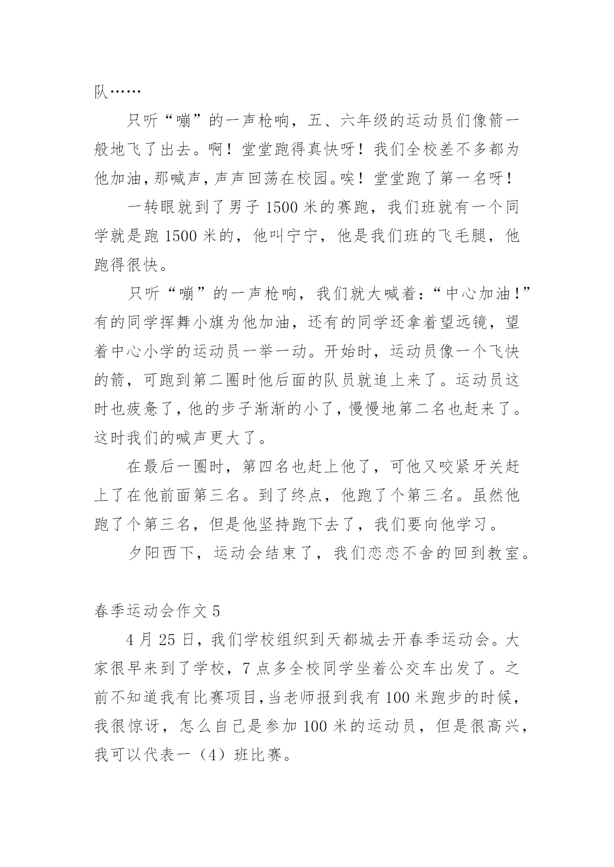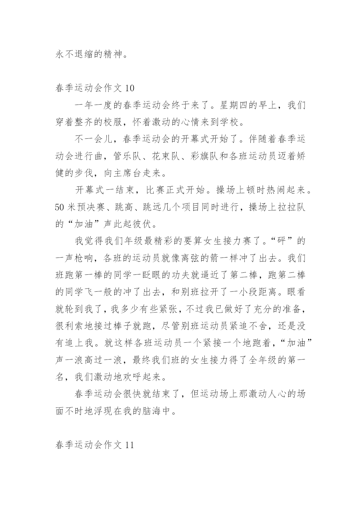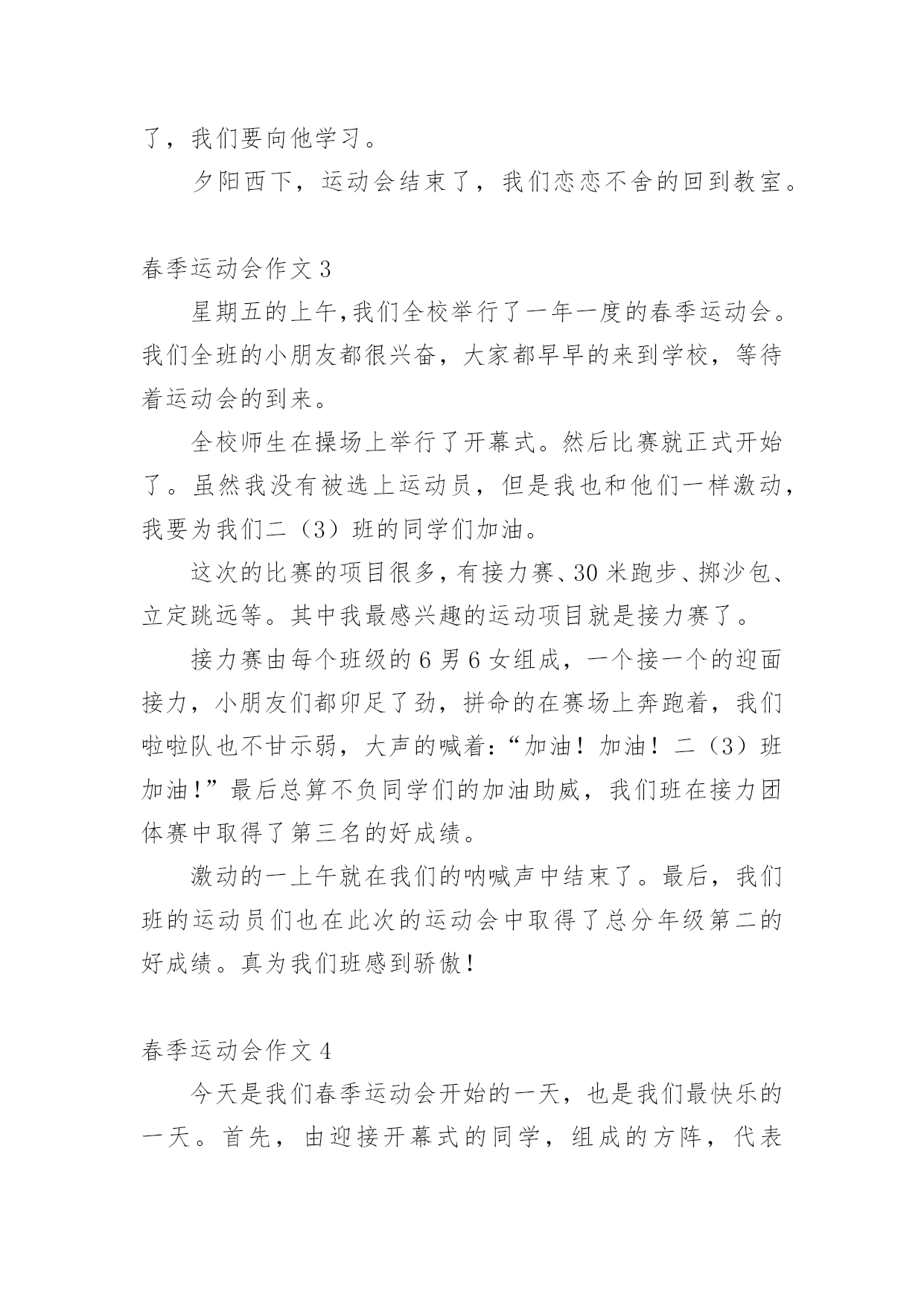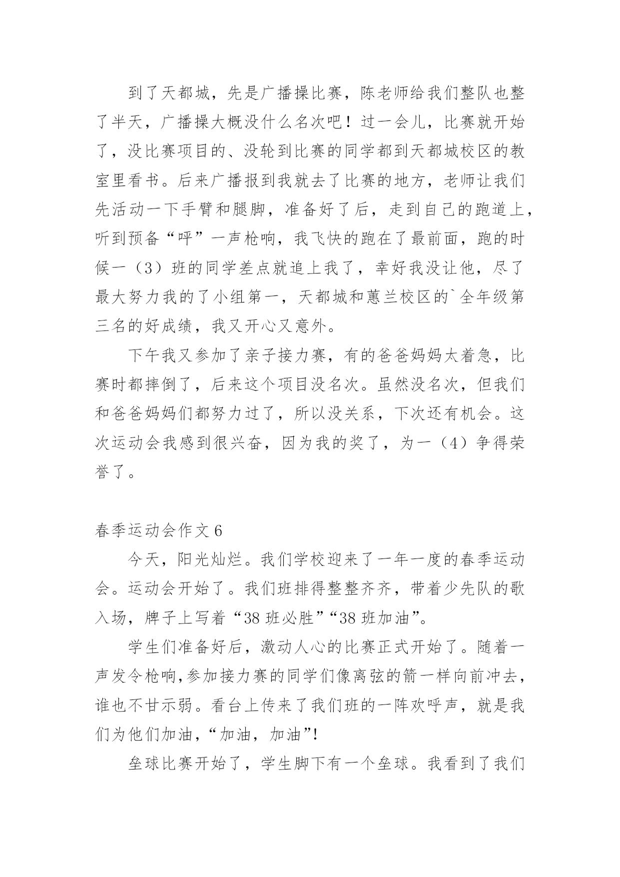 春季运动会作文【热门】春季运动会作文在日常学习、工作或生活中,大家都不可避免地会接触到作文吧,作文根据写作时限的不同可以分为限时作文和非限时作文。相信写作文是一个让许多人都头痛的问题,下面是小编为大家收集的春季运动会作文,希望对大家有所帮助。春季运动会作文1本周,我们学校举行了一年一度的春季运动会。在赛场上,运动员们竭尽全力为班级争光。运动会上有一幕,心里有一幕,最精彩。第一天,天气晴朗。先是男女百米,然后是男女400米。我们班的金香玉出来了,只听到砰的一声,运动员们像野马一样跑了出来。一开始,金香玉跑到最后,我想:“他肯定是想保持实力,等别人没实力了。”"果然,跑了一圈后,跑在金香玉前面的那个人开始失去力量,金香玉冲到了他的前面。"金香玉干杯!“我们班的学生尽可能大声喊叫。一圈半后,金香玉再次冲到第三名,“加油!”我们站起来,冲着金香玉喊道。在第二圈的后半段,金香玉把排名第二的选手甩在后面,与第一位选手越来越接近。最后,跑了三圈后,金香玉超过了他。第一个跑者看到自己快被超越了,他跑得很快,但是体力几乎耗尽。金香玉一开始跑得还是很顺利。当他冲过终点线时,全班做了一个——的手势!喊了同一个字——!可见他的比赛有多精彩。运动会后短短的两天过去了,但美好的画面仍留在我的脑海中。也许运动会只是一个课余竞技的机会,但运动会的体育精神是“更高、更快、更强”,值得我们学习、思考、赞美。春季运动会作文2今天是我们朱仓乡春季运动会开始的一天,也是我们最快乐的一天。首先,由迎接开幕式的同学,组成的方阵,代表队……只听“嘣”的一声枪响,五、六年级的运动员们象箭一般地飞了出去。啊!圆圆跑得真快呀!我们全校差不多都为他加油,那喊声,声声回荡在校园。唉!圆圆跑了第一名呀!一转眼就到了男子1500米的赛跑,我们班就有一个同学就是跑1500米的,他叫齐宁,他是我们班的飞毛腿,他跑得很快。作文只听“嘣”的一声枪响,我们就大喊着:“中心加油!”有一些同学挥舞小旗为他加油,还有一些同学还拿着望远镜,望着中心小学的运动员一举一动。开始时,运动员像一个飞快的箭,可跑到第二圈时他后面的队员就追上来了。运动员这时也疲惫了,他的步子渐渐的小了,慢慢地第二名也赶来了。这时我们的喊声更大了。在最后一圈时,第四名也赶上他了,可他又咬紧牙关赶上了在他前面第三名。到了终点,他跑了个第三名。虽然他跑了个第三名,但是他坚持跑下去了,我们要向他学习。夕阳西下,运动会结束了,我们恋恋不舍的回到教室。春季运动会作文3星期五的上午,我们全校举行了一年一度的春季运动会。我们全班的小朋友都很兴奋,大家都早早的来到学校,等待着运动会的到来。全校师生在操场上举行了开幕式。然后比赛就正式开始了。虽然我没有被选上运动员,但是我也和他们一样激动,我要为我们二(3)班的同学们加油。这次的比赛的项目很多,有接力赛、30米跑步、掷沙包、立定跳远等。其中我最感兴趣的运动项目就是接力赛了。接力赛由每个班级的6男6女组成,一个接一个的迎面接力,小朋友们都卯足了劲,拼命的在赛场上奔跑着,我们啦啦队也不甘示弱,大声的喊着:“加油!加油!二(3)班加油!”最后总算不负同学们的加油助威,我们班在接力团体赛中取得了第三名的好成绩。激动的一上午就在我们的呐喊声中结束了。最后,我们班的运动员们也在此次的运动会中取得了总分年级第二的好成绩。真为我们班感到骄傲!春季运动会作文4今天是我们春季运动会开始的一天,也是我们最快乐的一天。首先,由迎接开幕式的同学,组成的方阵,代表队……只听“嘣”的一声枪响,五、六年级的运动员们像箭一般地飞了出去。啊!堂堂跑得真快呀!我们全校差不多都为他加油,那喊声,声声回荡在校园。唉!堂堂跑了第一名呀!一转眼就到了男子1500米的赛跑,我们班就有一个同学就是跑1500米的,他叫宁宁,他是我们班的飞毛腿,他跑得很快。只听“嘣”的一声枪响,我们就大喊着:“中心加油!”有的同学挥舞小旗为他加油,还有的同学还拿着望远镜,望着中心小学的运动员一举一动。开始时,运动员像一个飞快的箭,可跑到第二圈时他后面的队员就追上来了。运动员这时也疲惫了,他的步子渐渐的小了,慢慢地第二名也赶来了。这时我们的喊声更大了。在最后一圈时,第四名也赶上他了,可他又咬紧牙关赶上了在他前面第三名。到了终点,他跑了个第三名。虽然他跑了个第三名,但是他坚持跑下去了,我们要向他学习。夕阳西下,运动会结束了,我们恋恋不舍的回到教室。春季运动会作文54月25日,我们学校组织到天都城去开春季运动会。大家很早来到了学校,7点多全校同学坐着公交车出发了。之前不知道我有比赛项目,当老师报到我有100米跑步的时候,我很惊讶,怎么自己是参加100米的运动员,但是很高兴,我可以代表一(4)班比赛。到了天都城,先是广播操比赛,陈老师给我们整队也整了半天,广播操大概没什么名次