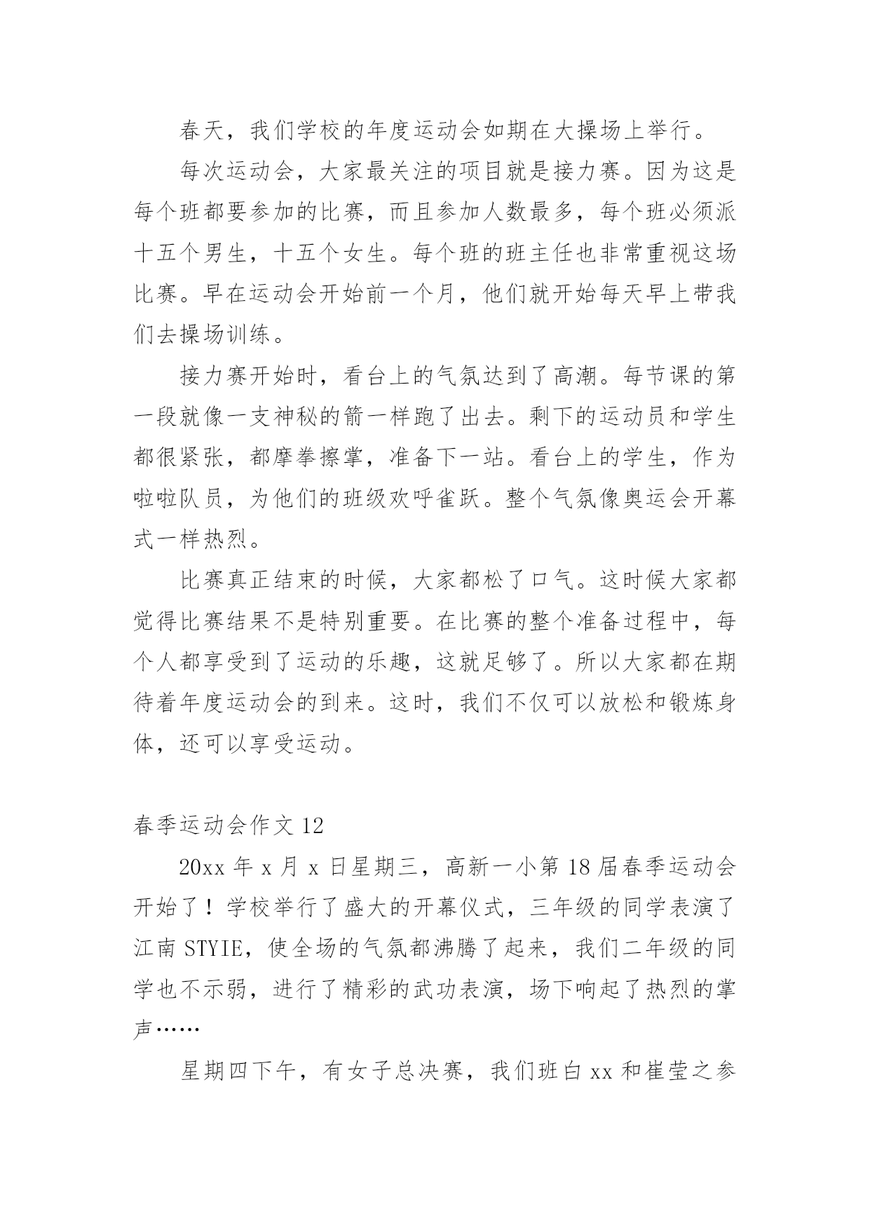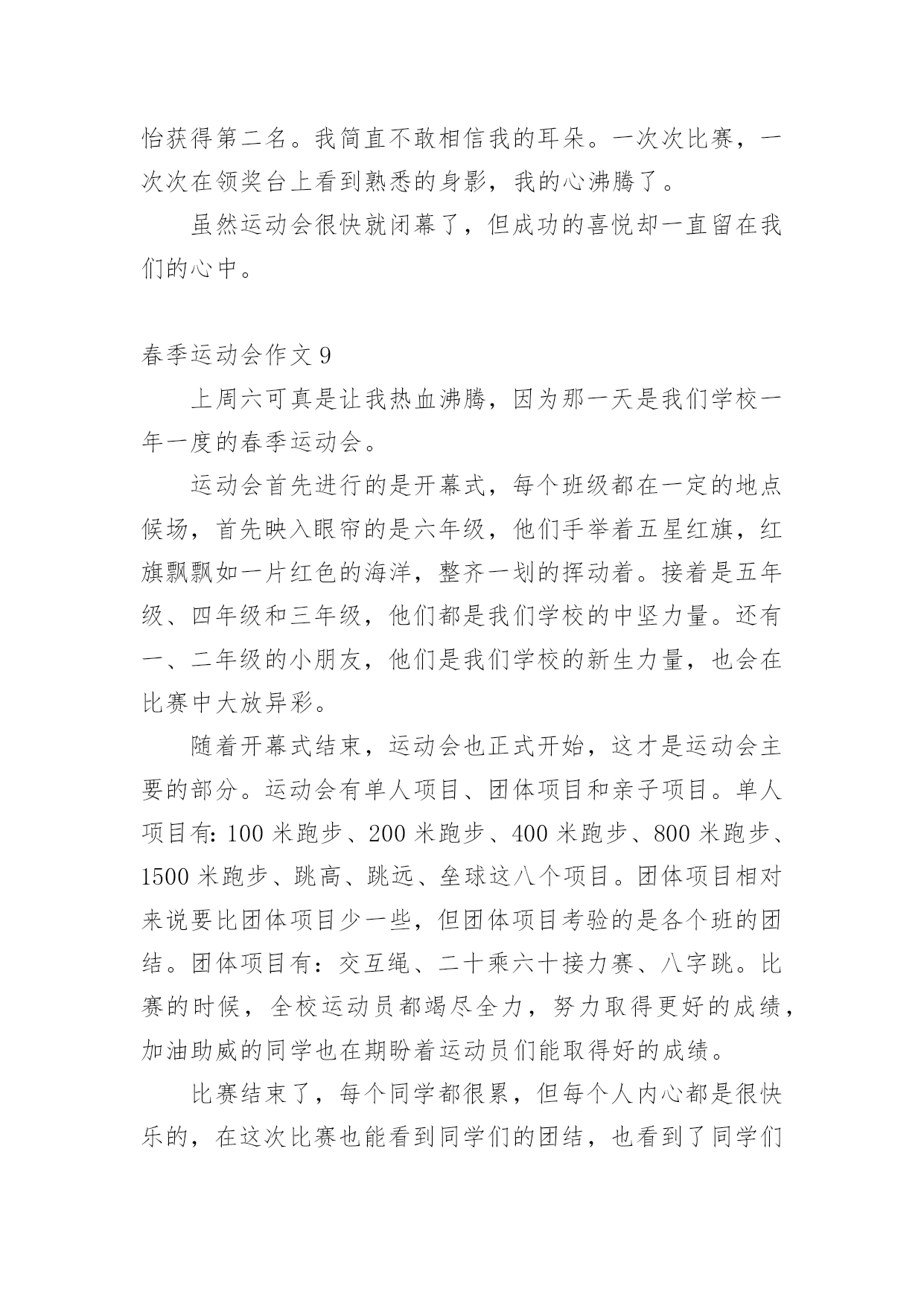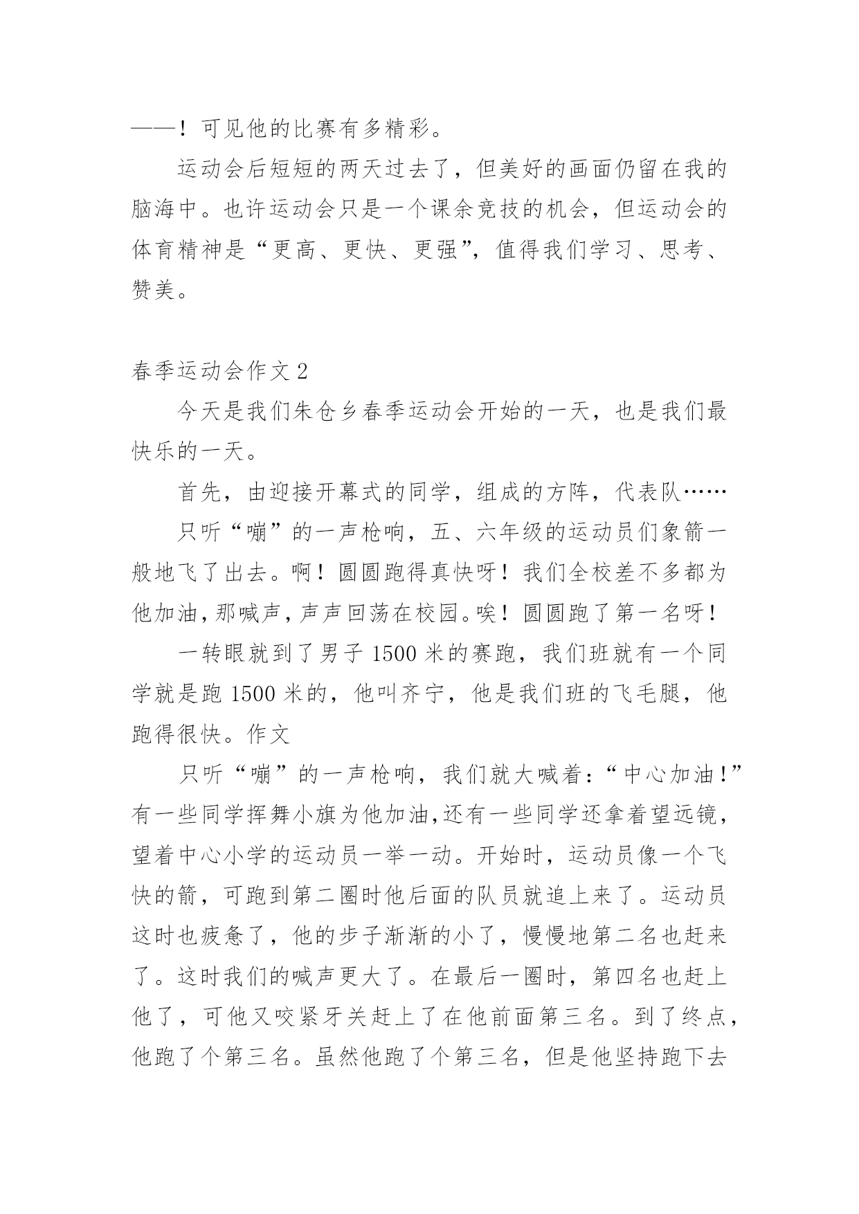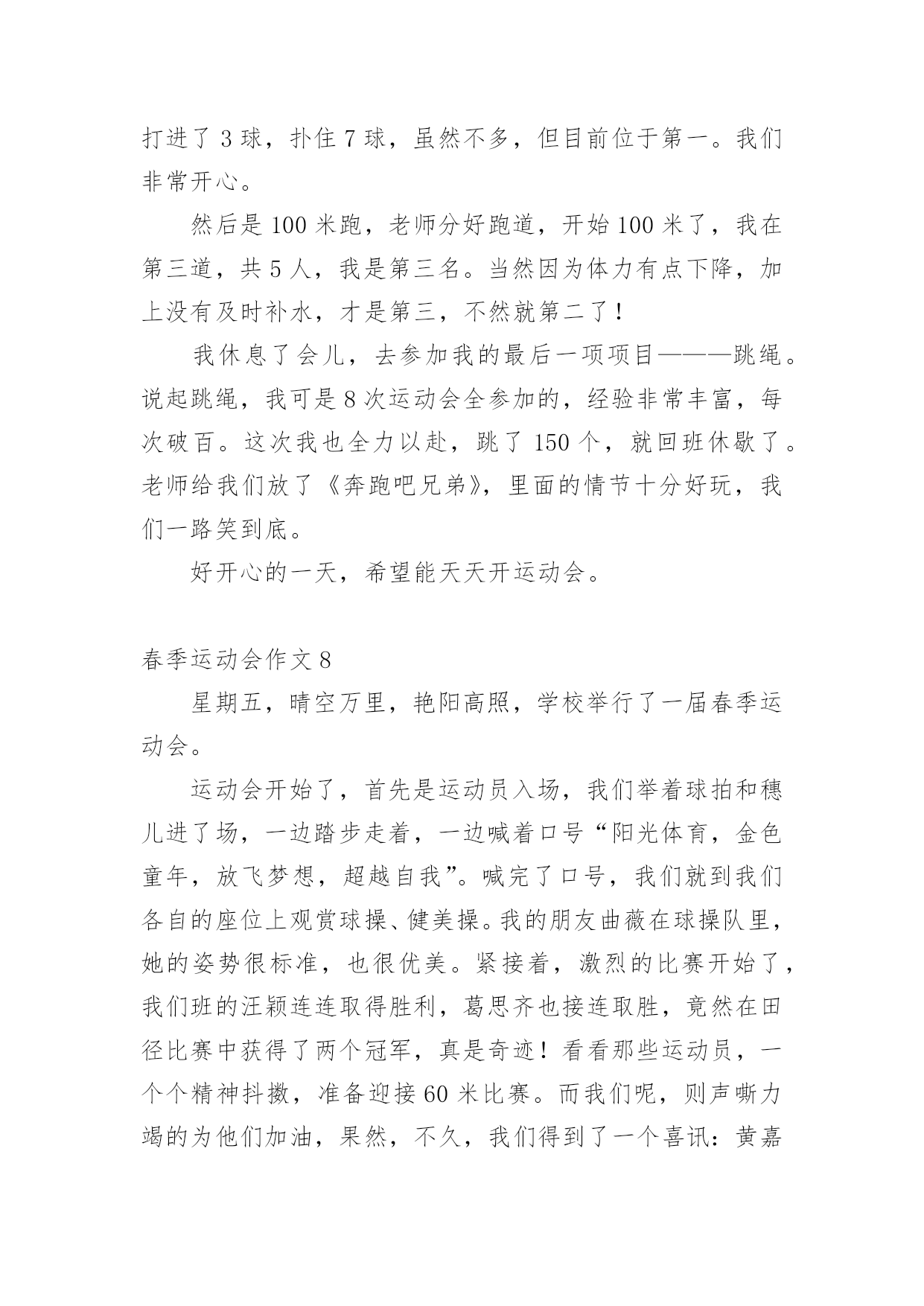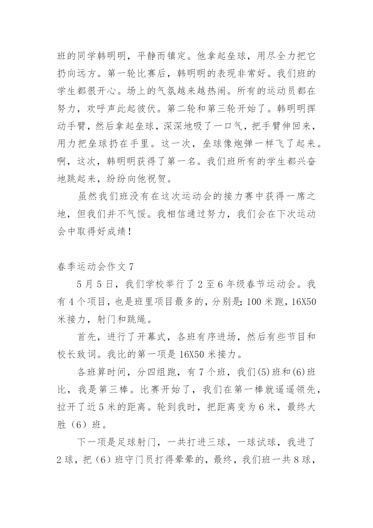 春季运动会作文【热门】春季运动会作文在日常学习、工作或生活中,大家都不可避免地会接触到作文吧,作文根据写作时限的不同可以分为限时作文和非限时作文。相信写作文是一个让许多人都头痛的问题,下面是小编为大家收集的春季运动会作文,希望对大家有所帮助。春季运动会作文1本周,我们学校举行了一年一度的春季运动会。在赛场上,运动员们竭尽全力为班级争光。运动会上有一幕,心里有一幕,最精彩。第一天,天气晴朗。先是男女百米,然后是男女400米。我们班的金香玉出来了,只听到砰的一声,运动员们像野马一样跑了出来。一开始,金香玉跑到最后,我想:“他肯定是想保持实力,等别人没实力了。”"果然,跑了一圈后,跑在金香玉前面的那个人开始失去力量,金香玉冲到了他的前面。"金香玉干杯!“我们班的学生尽可能大声喊叫。一圈半后,金香玉再次冲到第三名,“加油!”我们站起来,冲着金香玉喊道。在第二圈的后半段,金香玉把排名第二的选手甩在后面,与第一位选手越来越接近。最后,跑了三圈后,金香玉超过了他。第一个跑者看到自己快被超越了,他跑得很快,但是体力几乎耗尽。金香玉一开始跑得还是很顺利。当他冲过终点线时,全班做了一个——的手势!喊了同一个字——!可见他的比赛有多精彩。运动会后短短的两天过去了,但美好的画面仍留在我的脑海中。也许运动会只是一个课余竞技的机会,但运动会的体育精神是“更高、更快、更强”,值得我们学习、思考、赞美。春季运动会作文2今天是我们朱仓乡春季运动会开始的一天,也是我们最快乐的一天。首先,由迎接开幕式的同学,组成的方阵,代表队……只听“嘣”的一声枪响,五、六年级的运动员们象箭一般地飞了出去。啊!圆圆跑得真快呀!我们全校差不多都为他加油,那喊声,声声回荡在校园。唉!圆圆跑了第一名呀!一转眼就到了男子1500米的赛跑,我们班就有一个同学就是跑1500米的,他叫齐宁,他是我们班的飞毛腿,他跑得很快。作文只听“嘣”的一声枪响,我们就大喊着:“中心加油!”有一些同学挥舞小旗为他加油,还有一些同学还拿着望远镜,望着中心小学的运动员一举一动。开始时,运动员像一个飞快的箭,可跑到第二圈时他后面的队员就追上来了。运动员这时也疲惫了,他的步子渐渐的小了,慢慢地第二名也赶来了。这时我们的喊声更大了。在最后一圈时,第四名也赶上他了,可他又咬紧牙关赶上了在他前面第三名。到了终点,他跑了个第三名。虽然他跑了个第三名,但是他坚持跑下去了,我们要向他学习。夕阳西下,运动会结束了,我们恋恋不舍的回到教室。春季运动会作文3星期五的上午,我们全校举行了一年一度的春季运动会。我们全班的小朋友都很兴奋,大家都早早的来到学校,等待着运动会的到来。全校师生在操场上举行了开幕式。然后比赛就正式开始了。虽然我没有被选上运动员,但是我也和他们一样激动,我要为我们二(3)班的同学们加油。这次的比赛的项目很多,有接力赛、30米跑步、掷沙包、立定跳远等。其中我最感兴趣的运动项目就是接力赛了。接力赛由每个班级的6男6女组成,一个接一个的迎面接力,小朋友们都卯足了劲,拼命的在赛场上奔跑着,我们啦啦队也不甘示弱,大声的喊着:“加油!加油!二(3)班加油!”最后总算不负同学们的加油助威,我们班在接力团体赛中取得了第三名的好成绩。激动的一上午就在我们的呐喊声中结束了。最后,我们班的运动员们也在此次的运动会中取得了总分年级第二的好成绩。真为我们班感到骄傲!春季运动会作文4今天是我们春季运动会开始的一天,也是我们最快乐的一天。首先,由迎接开幕式的同学,组成的方阵,代表队……只听“嘣”的一声枪响,五、六年级的运动员们像箭一般地飞了出去。啊!堂堂跑得真快呀!我们全校差不多都为他加油,那喊声,声声回荡在校园。唉!堂堂跑了第一名呀!一转眼就到了男子1500米的赛跑,我们班就有一个同学就是跑1500米的,他叫宁宁,他是我们班的飞毛腿,他跑得很快。只听“嘣”的一声枪响,我们就大喊着:“中心加油!”有的同学挥舞小旗为他加油,还有的同学还拿着望远镜,望着中心小学的运动员一举一动。开始时,运动员像一个飞快的箭,可跑到第二圈时他后面的队员就追上来了。运动员这时也疲惫了,他的步子渐渐的小了,慢慢地第二名也赶来了。这时我们的喊声更大了。在最后一圈时,第四名也赶上他了,可他又咬紧牙关赶上了在他前面第三名。到了终点,他跑了个第三名。虽然他跑了个第三名,但是他坚持跑下去了,我们要向他学习。夕阳西下,运动会结束了,我们恋恋不舍的回到教室。春季运动会作文54月25日,我们学校组织到天都城去开春季运动会。大家很早来到了学校,7点多全校同学坐着公交车出发了。之前不知道我有比赛项目,当老师报到我有100米跑步的时候,我很惊讶,怎么自己是参加100米的运动员,但是很高兴,我可以代表一(4)班比赛。到了天都城,先是广播操比赛,陈老师给我们整队也整了半天,广播操大概没什么名次