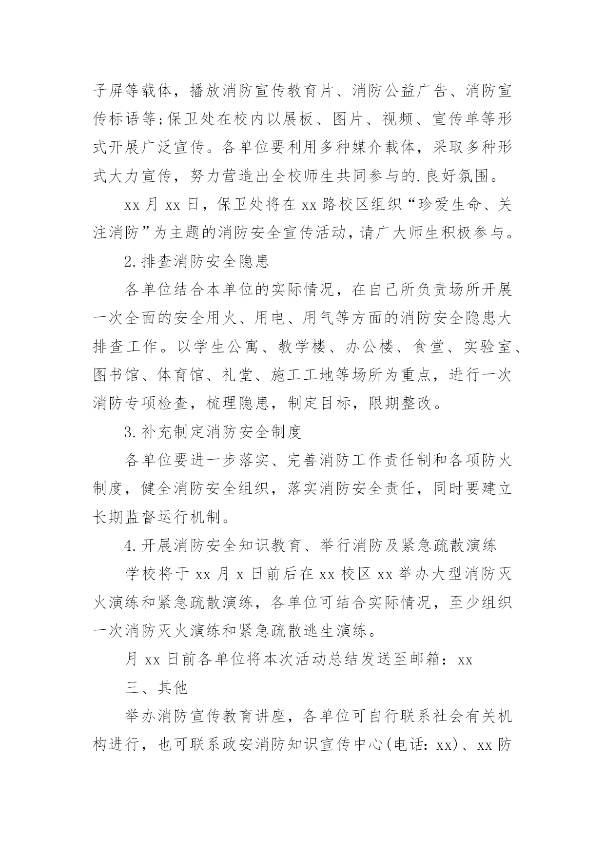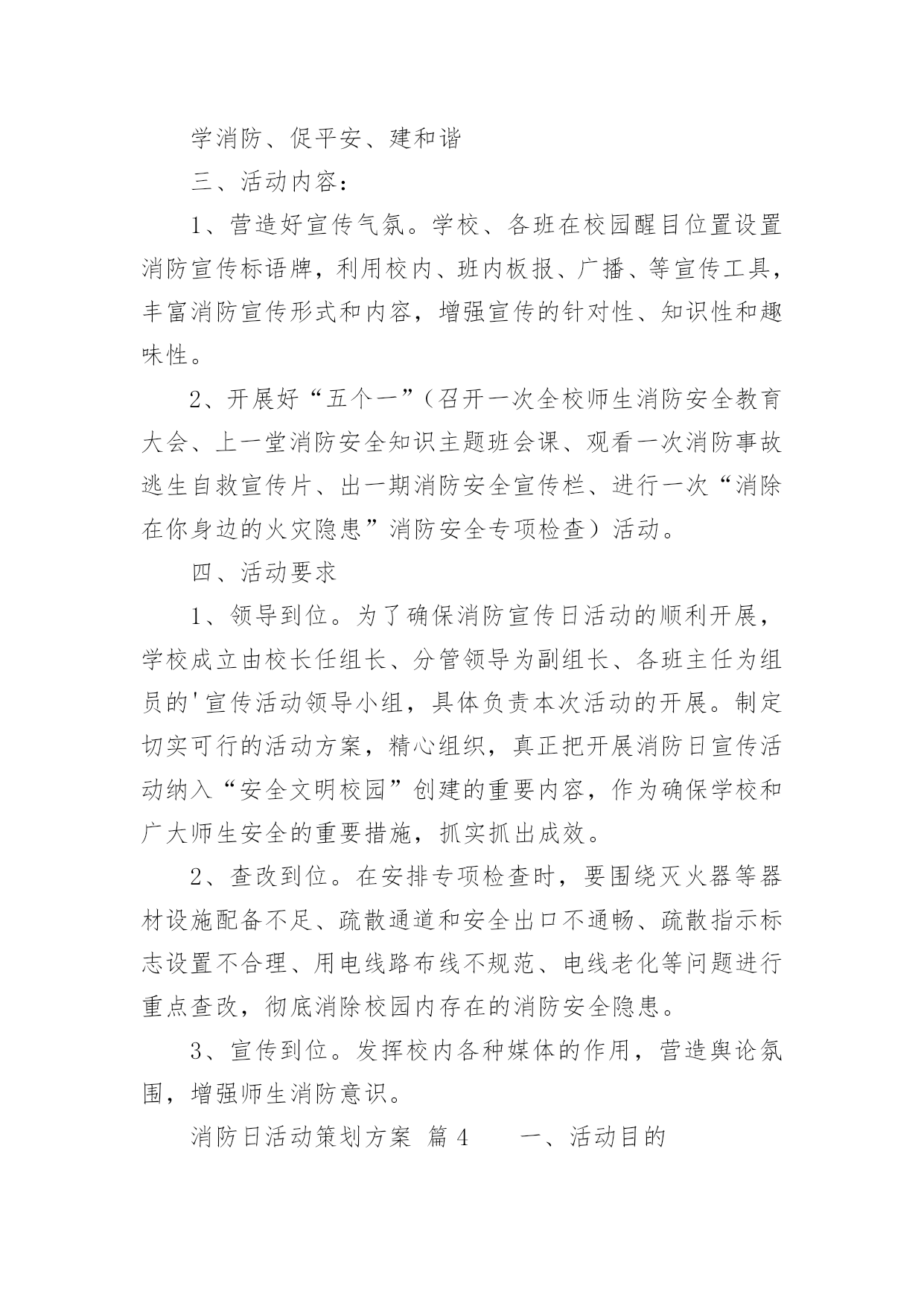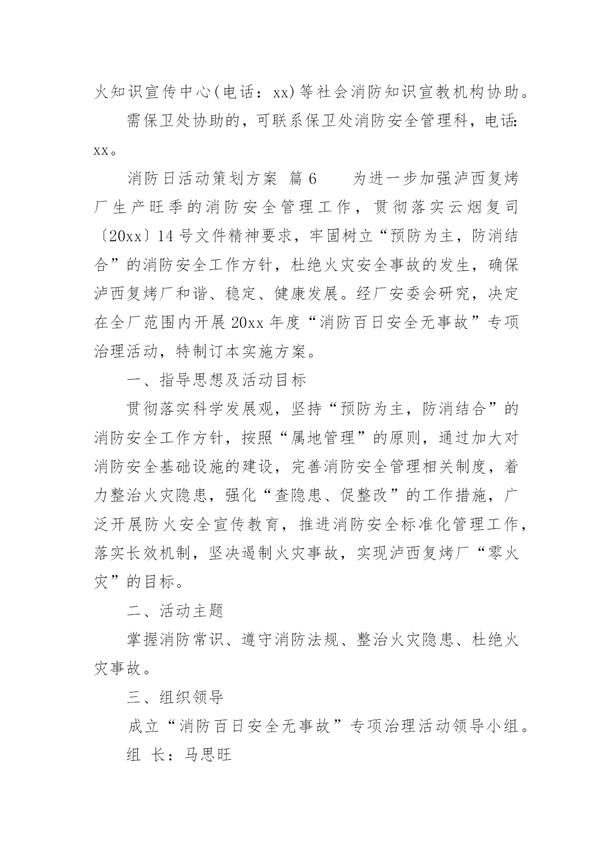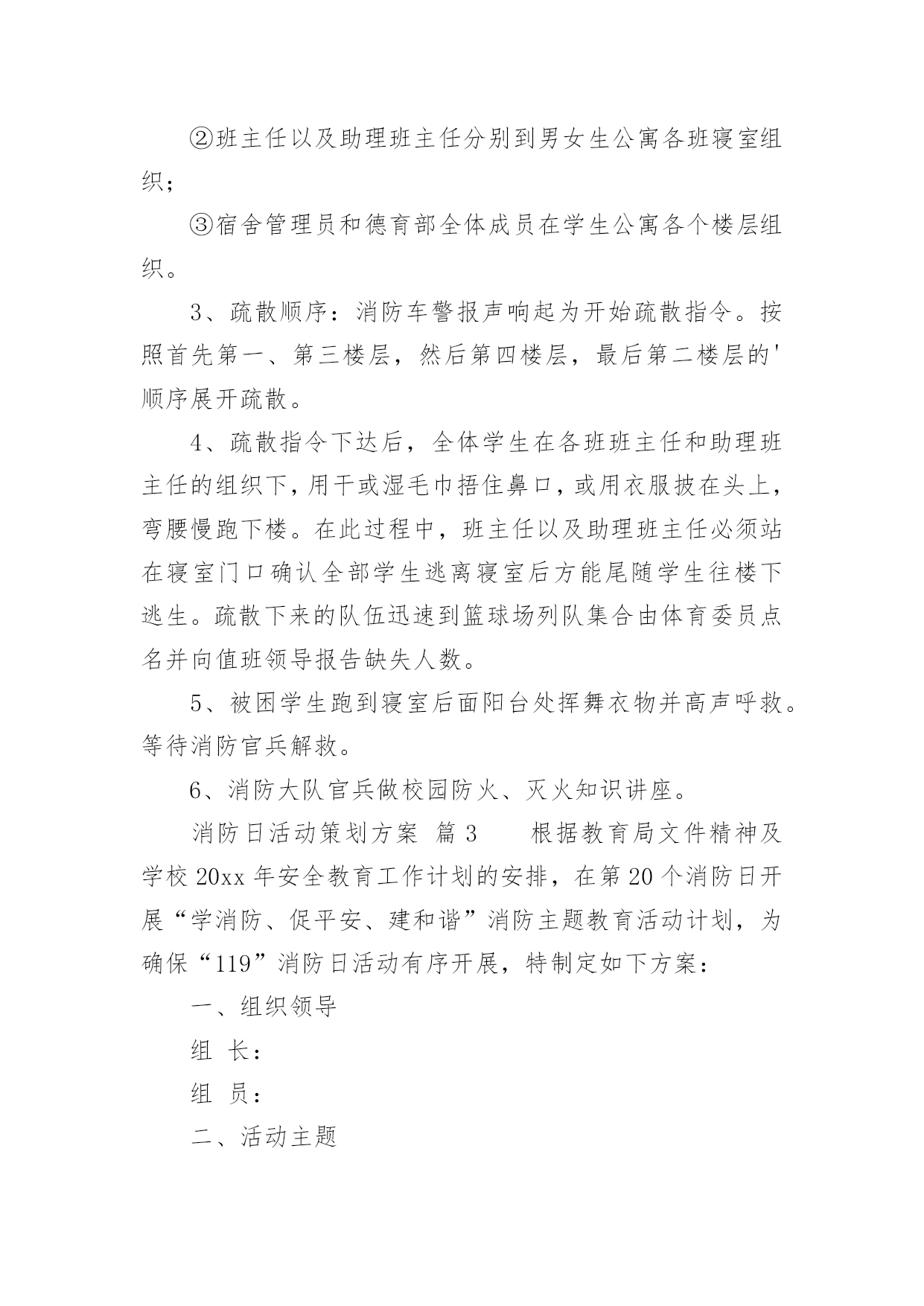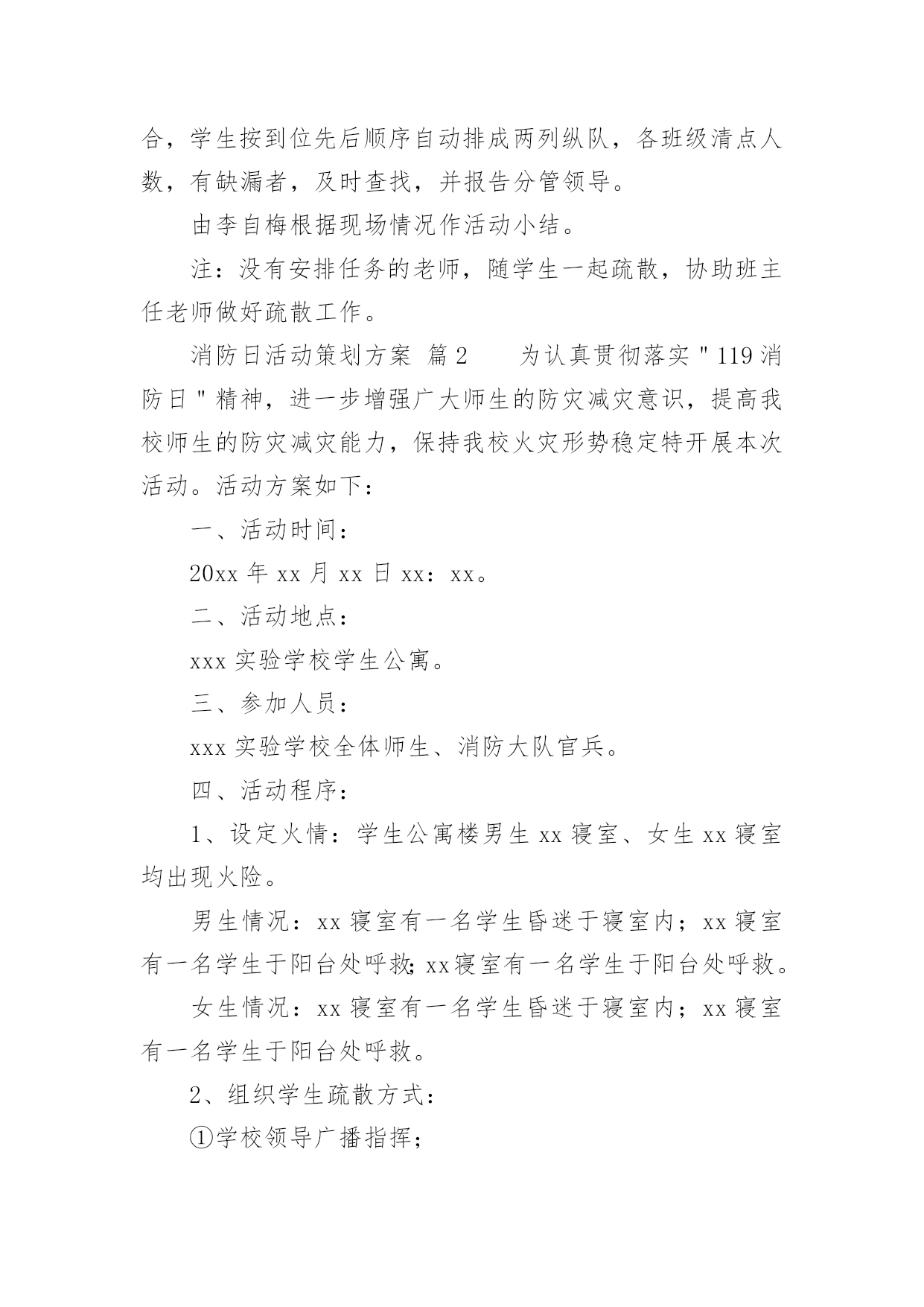 消防日活动策划方案消防日活动策划方案为了确保事情或工作有序有效开展,我们需要事先制定方案,方案是解决一个问题或者一项工程,一个课题的详细过程。你知道什么样的方案才能切实地帮助到我们吗?下面是小编帮大家整理的消防日活动策划方案,欢迎阅读与收藏。消防日活动策划方案篇1一、指导思想为了落实上级有关指示精神,加强全校师生消防安全意识,确保全校师生在应急情况时能高效、有序地逃生,在119消防日到来之时,特组织本次消防演习。二、组织领导为切实做好此次演练工作,成立征长小学应急疏散演练领导小组,具体负责演练工作的组织和协调工作。组长:xx副组长:xx成员:xx三、演练时间20xx年11月9日课间操四、演练地点征长小学校园内五、演练前准备1、演练前阐述消防演练的重要意义,同时强调演练是预防性、模拟性练习,注意演练过程中的安全。2、讲明消防演练的程序、内容、时间和纪律要求,以及各班疏散的.路线和到达的区域。3、讲解消防器材的使用和消防逃生基本常识。六、演练程序1、以警报声响为信号,班主任老师立即组织本班学生“捂鼻弯腰”迅速撤离教室。2、全校老师要及时到位,各负其责。3、到达应急避难疏散场地,学生排队站好。各班主任马上清点人数,并由班主任报告疏散集结负责人。七、演练组织1、疏散演练总指挥:xx2、教学楼1号楼(西教学楼)疏散总指挥xx,副指挥xx负责统一疏散;一年级级部组长xx、四年级级部组长xx、五年级级部组长xx负责本级部有序疏散;3、教学楼2号楼(东教学楼)疏散总指挥xx,副指挥xx负责统一疏散;二年级级部组长xx、三年级级部组长xx、四年级老师负责本级部有序疏散;4、办公楼4号楼:疏散总指挥xx,副指挥xx,负责统一疏散。二、三层靠近办公楼的班级学生和教师从办公楼楼梯疏散。5、教学楼3号楼(幼儿园)疏散总指挥xx,副指挥xx负责统一疏散;各班主任负责本班学生排队疏散,防止慌乱。疏散到操场上各班学生的站位:按照上午课间操位置集合,学生按到位先后顺序自动排成两列纵队,各班级清点人数,有缺漏者,及时查找,并报告分管领导。由李自梅根据现场情况作活动小结。注:没有安排任务的老师,随学生一起疏散,协助班主任老师做好疏散工作。消防日活动策划方案篇2为认真贯彻落实"119消防日"精神,进一步增强广大师生的防灾减灾意识,提高我校师生的防灾减灾能力,保持我校火灾形势稳定特开展本次活动。活动方案如下:一、活动时间:20xx年xx月xx日xx:xx。二、活动地点:xxx实验学校学生公寓。三、参加人员:xxx实验学校全体师生、消防大队官兵。四、活动程序:1、设定火情:学生公寓楼男生xx寝室、女生xx寝室均出现火险。男生情况:xx寝室有一名学生昏迷于寝室内;xx寝室有一名学生于阳台处呼救;xx寝室有一名学生于阳台处呼救。女生情况:xx寝室有一名学生昏迷于寝室内;xx寝室有一名学生于阳台处呼救。2、组织学生疏散方式:①学校领导广播指挥;②班主任以及助理班主任分别到男女生公寓各班寝室组织;③宿舍管理员和德育部全体成员在学生公寓各个楼层组织。3、疏散顺序:消防车警报声响起为开始疏散指令。按照首先第一、第三楼层,然后第四楼层,最后第二楼层的'顺序展开疏散。4、疏散指令下达后,全体学生在各班班主任和助理班主任的组织下,用干或湿毛巾捂住鼻口,或用衣服披在头上,弯腰慢跑下楼。在此过程中,班主任以及助理班主任必须站在寝室门口确认全部学生逃离寝室后方能尾随学生往楼下逃生。疏散下来的队伍迅速到篮球场列队集合由体育委员点名并向值班领导报告缺失人数。5、被困学生跑到寝室后面阳台处挥舞衣物并高声呼救。等待消防官兵解救。6、消防大队官兵做校园防火、灭火知识讲座。消防日活动策划方案篇3根据教育局文件精神及学校20xx年安全教育工作计划的安排,在第20个消防日开展“学消防、促平安、建和谐”消防主题教育活动计划,为确保“119”消防日活动有序开展,特制定如下方案:一、组织领导组长:组员:二、活动主题学消防、促平安、建和谐三、活动内容:1、营造好宣传气氛。学校、各班在校园醒目位置设置消防宣传标语牌,利用校内、班内板报、广播、等宣传工具,丰富消防宣传形式和内容,增强宣传的针对性、知识性和趣味性。2、开展好“五个一”(召开一次全校师生消防安全教育大会、上一堂消防安全知识主题班会课、观看一次消防事故逃生自救宣传片、出一期消防安全宣传栏、进行一次“消除在你身边的火灾隐患”消防安全专项检查)活动。四、活动要求1、领导到位。为了确保消防宣传日活动的顺利开展,学校成立由校长任组长、分管领导为副组长、各班主任为组员的'宣传活动领导小组,具体负责本次活动的开展。制定切实可行的活动方案,精心组织,真正把开展消防日宣传活动纳入“安全文明校园”创建的重要内容,作为确保学校和广大师生安全的重要措施,抓实抓出成效。2、查改到