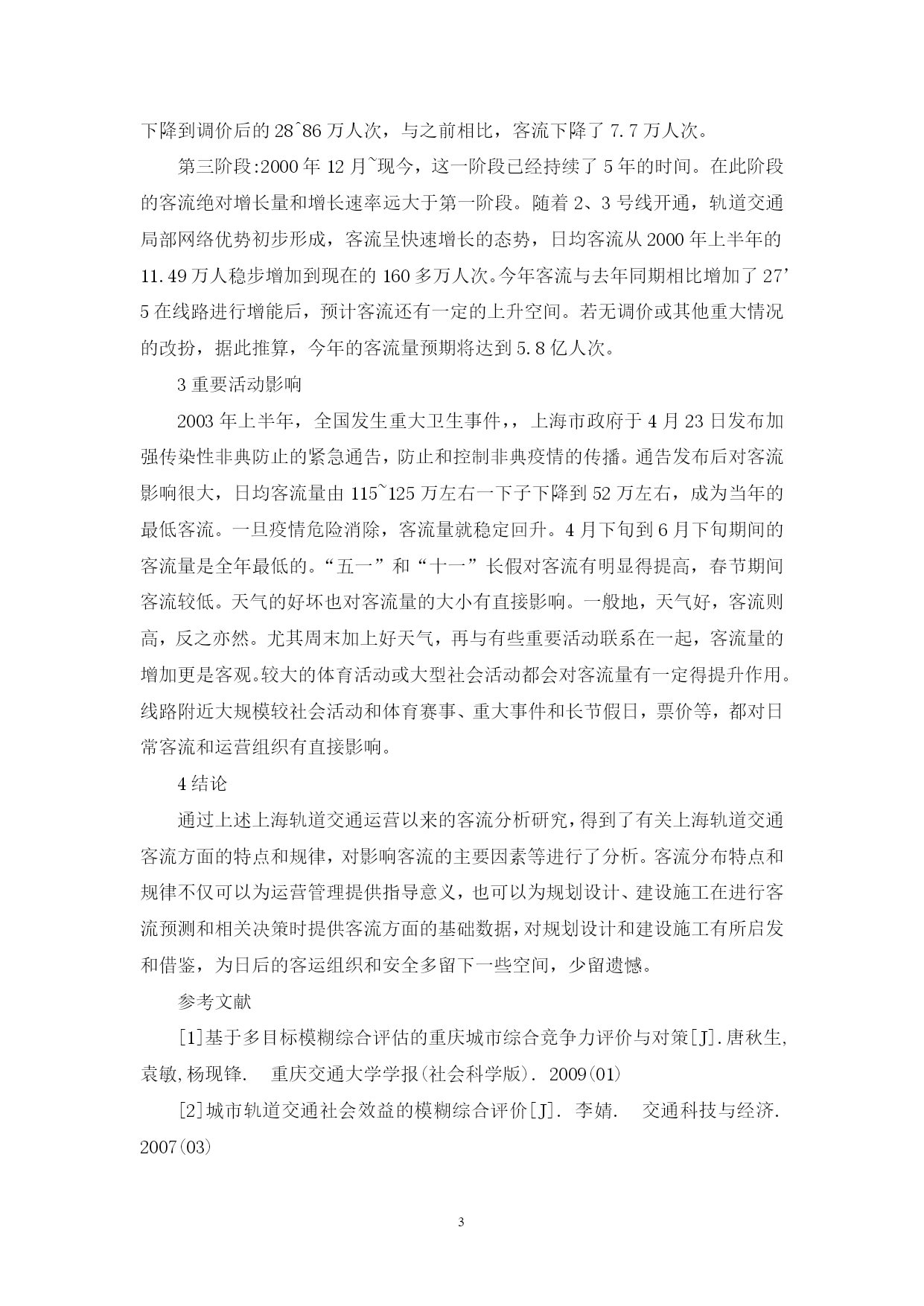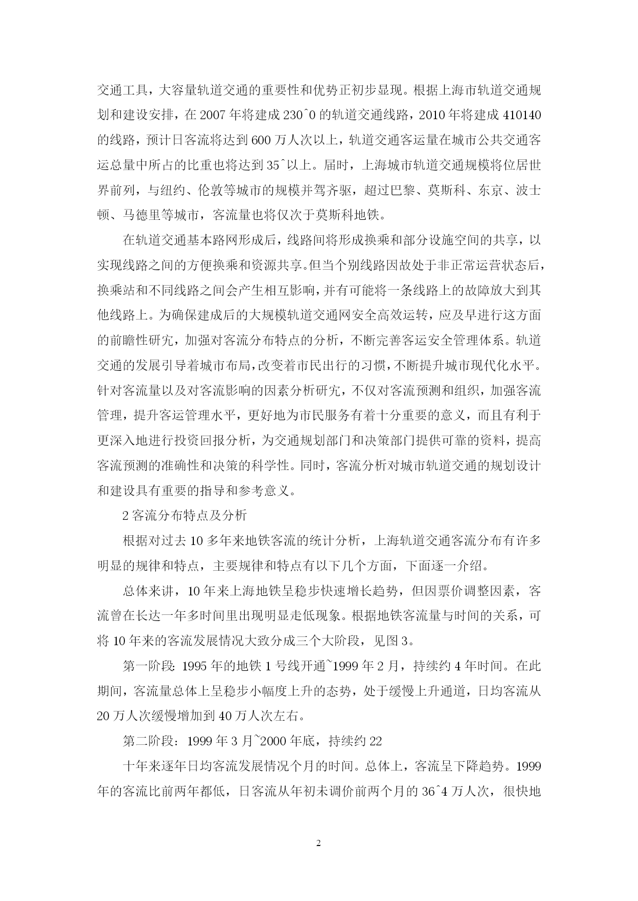 PAGEPAGE4上海轨道交通运营客流简析摘要上海地铁1号线投入运营已超过10年,2号线、3号线投入使用近5年。10多年来,上海轨道交通逐步建立起一套安全高效的运营管理体系,积累了丰富的运营管理经验。根据历年客流数据结合实际运营生产情况,对客流变化规律进行了深入研究,并就影响客流量的主要因素进行了分析。对客流研究的结果既可以为运营管理提供参考和指导,又可为轨道交通的规划管理部门及决策部门提供可靠的资料。关键词轨道交通;客流量分析;预测1上海轨道交通运营概况上海地铁1号线一期工程于1995年4月10日开通,运营时间已经超过10年。10年间,上海轨道交通整体上已发生了巨大变化,运营线路从开通之初的1条发展到目前4条,累计输送乘客23亿人次,到2005年年底运营线路将达到5条线,运营里程也将从开通之初的16.365达到112日均客流量也从开通之初的24万人次,提高到现在的160多万人次。除5号线〔5号线有11座车站约17日均客流2万多人次)外,目前3条运营线路长达77.41(0计57座车站,线路布置示意图见图11号线北延伸于2004年年12月28日开通,在车辆严重匮乏、发车间隔120匕的情况下,北延伸日均客流仍保持15万人次以上。“五一”期间,3条线〔、2、3号)的最大日客流超过203.3万人次。自进入2005年以来,3条线路的客流量继续稳定增长,与2004年相比,日净增客流30多万人次。客流稳定高速增长使3条线的运营设备长期处于高负荷运转状态,早晚高峰时间段列车超载严重,据现场测算,每节车辆乘客超过450人,列车满载率超过1301号线北延伸部分区间的满载率甚至达到161^以上,车厢内已经变得十分拥挤,一列六节编组的列车在1号线早高峰时间段的载客可达2500人以上。这种拥挤状况近期尚难以得到根本改善。只有在列车数量充足,实施大编组、小间隔的客运组织后,高峰时间段的拥挤状况有望得到较大改善和缓解。由于轨道交通与其他交通相比,具有运量大、速度快、安全、准时、环保等特点,随着人们对地铁这一新型交通工具认识的不断加深、运营设施的完善及管理水平的不断提高,越来越多的出行者会选择地铁这一安全畅达交通工具,它现已成为市民出行不可或缺的交通工具,大容量轨道交通的重要性和优势正初步显现。根据上海市轨道交通规划和建设安排,在2007年将建成230^0的轨道交通线路,2010年将建成410140的线路,预计日客流将达到600万人次以上,轨道交通客运量在城市公共交通客运总量中所占的比重也将达到35^以上。届时,上海城市轨道交通规模将位居世界前列,与纽约、伦敦等城市的规模并驾齐驱,超过巴黎、莫斯科、东京、波士顿、马德里等城市,客流量也将仅次于莫斯科地铁。在轨道交通基本路网形成后,线路间将形成换乘和部分设施空间的共享,以实现线路之间的方便换乘和资源共享。但当个别线路因故处于非正常运营状态后,换乘站和不同线路之间会产生相互影响,并有可能将一条线路上的故障放大到其他线路上。为确保建成后的大规模轨道交通网安全高效运转,应及早进行这方面的前瞻性研宄,加强对客流分布特点的分析,不断完善客运安全管理体系。轨道交通的发展引导着城市布局,改变着市民出行的习惯,不断提升城市现代化水平。针对客流量以及对客流影响的因素分析研宄,不仅对客流预测和组织,加强客流管理,提升客运管理水平,更好地为市民服务有着十分重要的意义,而且有利于更深入地进行投资回报分析,为交通规划部门和决策部门提供可靠的资料,提高客流预测的准确性和决策的科学性。同时,客流分析对城市轨道交通的规划设计和建设具有重要的指导和参考意义。2客流分布特点及分析根据对过去10多年来地铁客流的统计分析,上海轨道交通客流分布有许多明显的规律和特点,主要规律和特点有以下几个方面,下面逐一介绍。总体来讲,10年来上海地铁呈稳步快速增长趋势,但因票价调整因素,客流曾在长达一年多时间里出现明显走低现象。根据地铁客流量与时间的关系,可将10年来的客流发展情况大致分成三个大阶段,见图3。第一阶段:1995年的地铁1号线开通~1999年2月,持续约4年时间。在此期间,客流量总体上呈稳步小幅度上升的态势,处于缓慢上升通道,日均客流从20万人次缓慢增加到40万人次左右。第二阶段:1999年3月~2000年底,持续约22十年来逐年日均客流发展情况个月的时间。总体上,客流呈下降趋势。1999年的客流比前两年都低,日客流从年初未调价前两个月的36^4万人次,很快地下降到调价后的28^86万人次,与之前相比,客流下降了7.7万人次。第三阶段:2000年12月~现今,这一阶段已经持续了5年的时间。在此阶段的客流绝对增长量和增长速率远大于第一阶段。随着2、3号线开通,轨道交通局部网络优势初步形成,客流呈快速增长的态