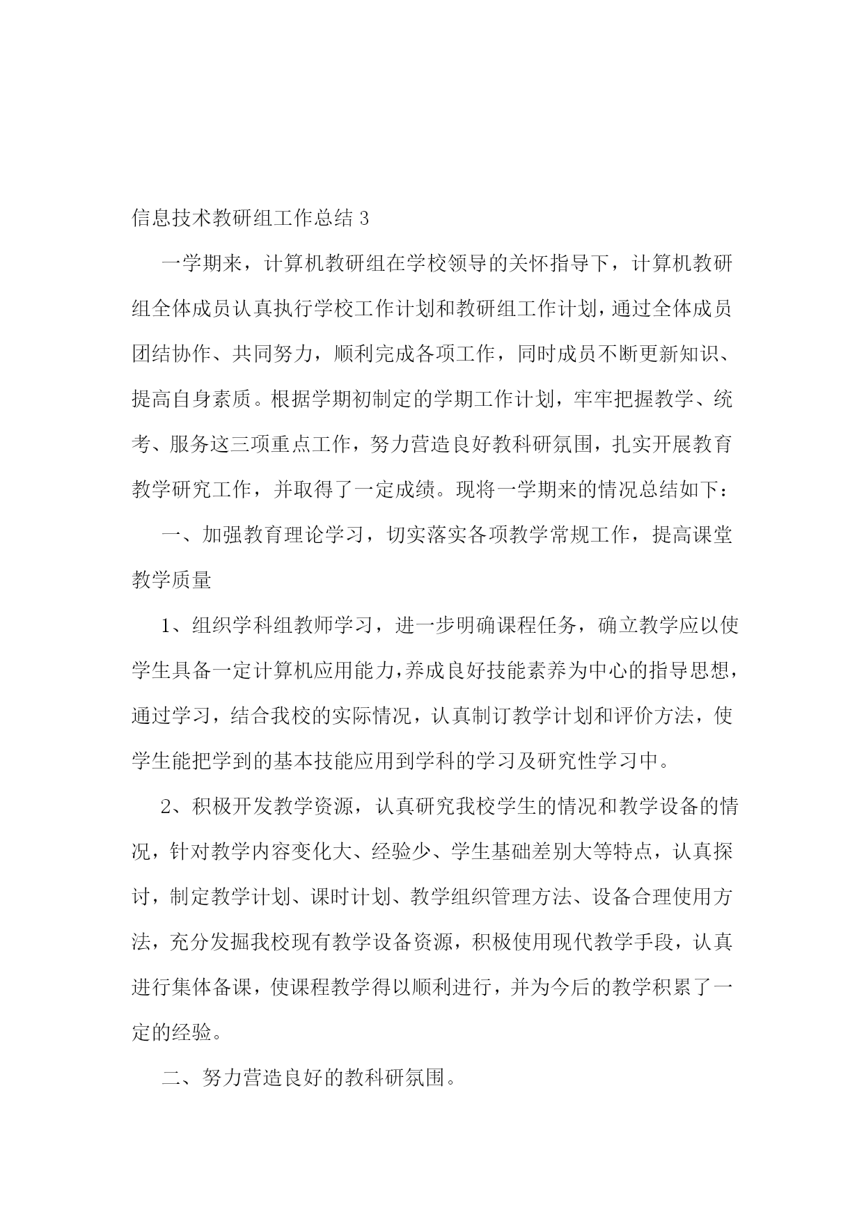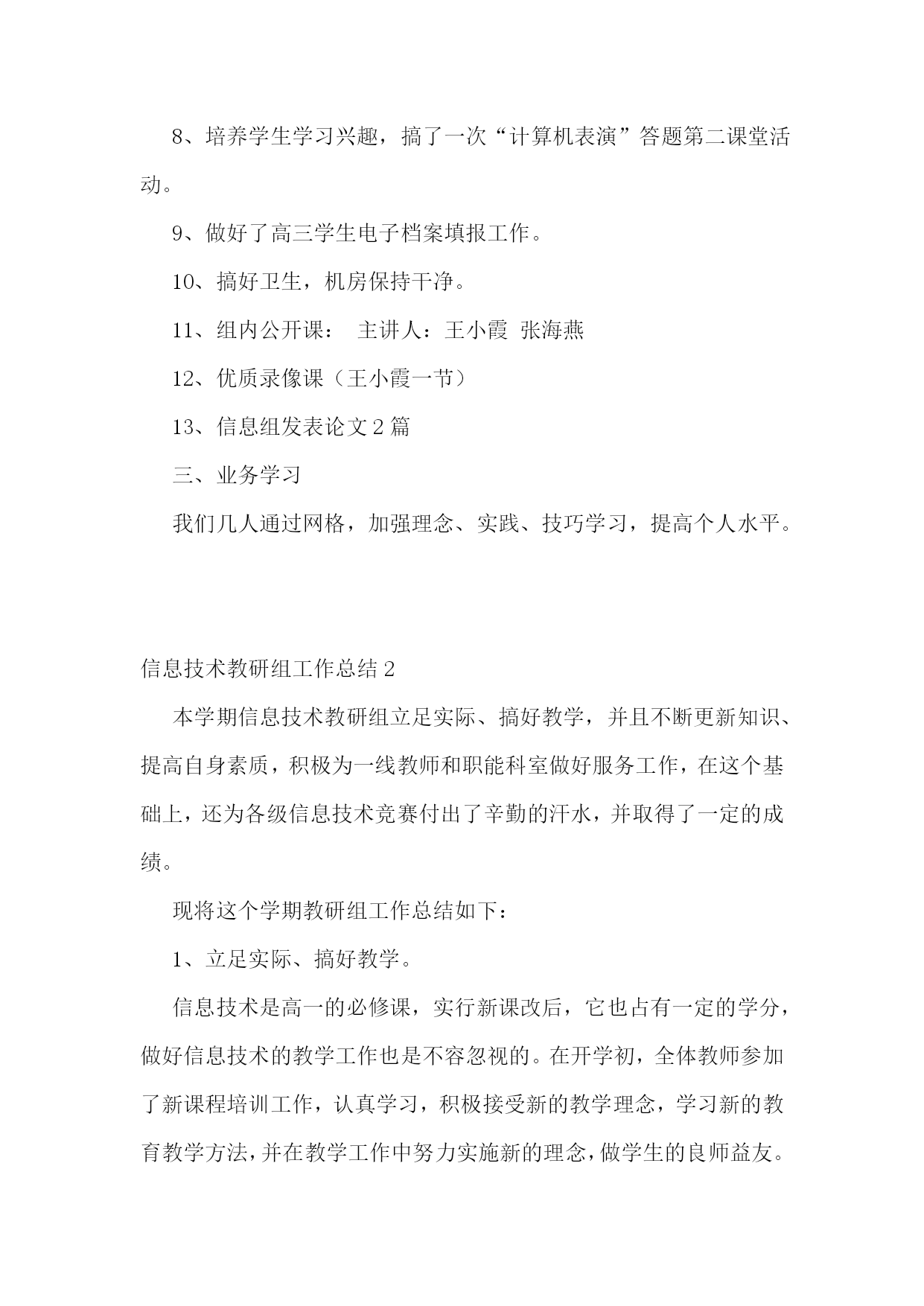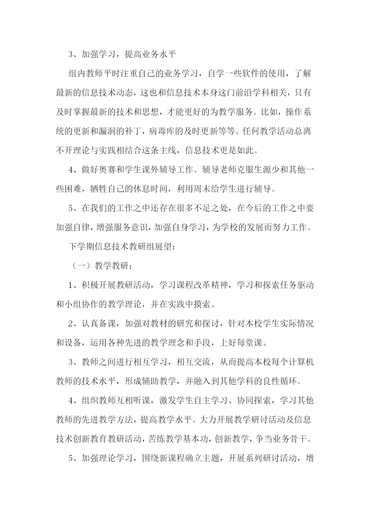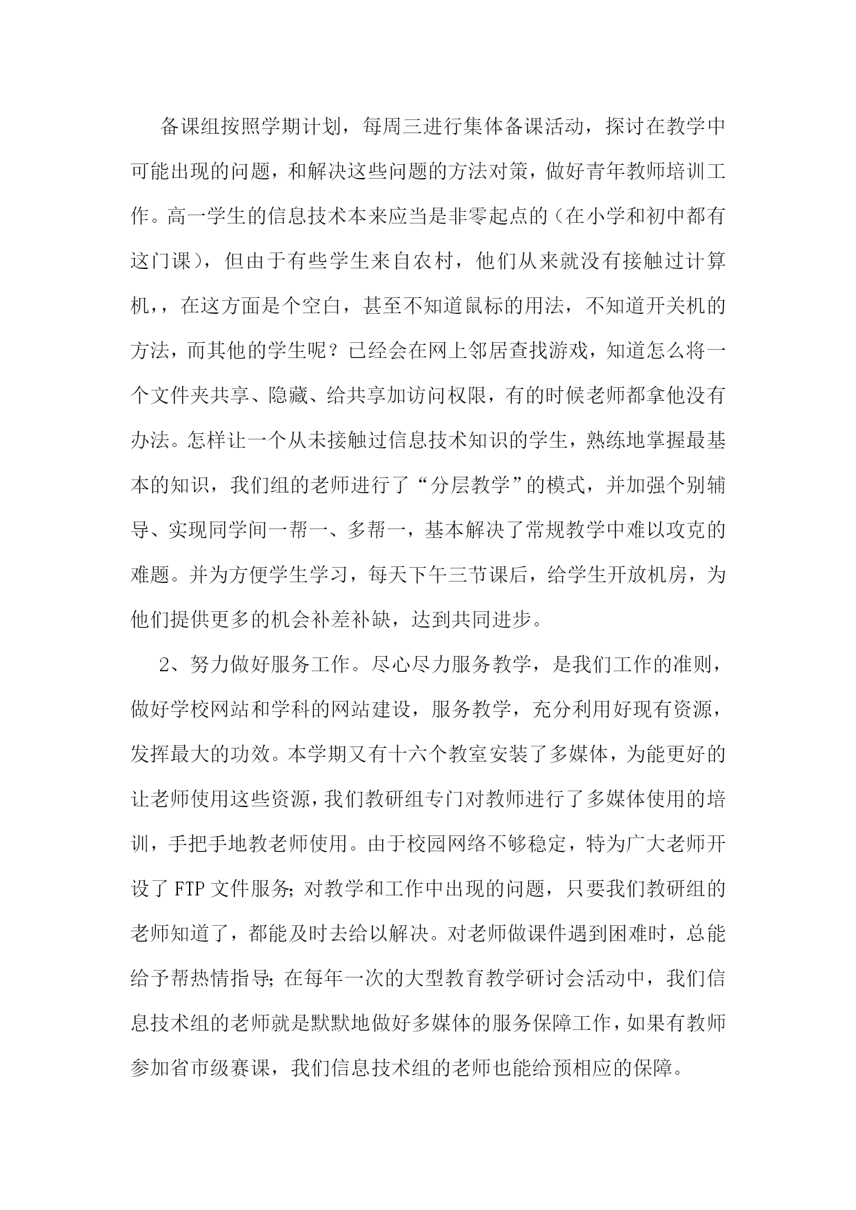 信息技术教研组工作总结(集锦15篇)信息技术教研组工作总结1在学校领导的关心支持下,我们信息技术组的老师也在这个学期立足实际、搞好教学,并且不断更新知识、提高自身素质,在这个基础上,还为各级信息技术竞赛付出了辛勤的汗水。现将这个学期教研组工作总结如下:一、指导思想以信息技术课程教学为重点,培养学生的信息素养,使学生具备获取信息、传输信息、处理信息和应用信息的基本能力,把信息技术作为支持终身学习和合作学习的手段,为适应信息化社会的学习、工作打下必要的基础。二、完成主要的工作1、组织本组教师进一步加强理论学习更新教育教学观念,继续抓好教学常规的落实。以生为本,以学为本,一切为学生的学习着想。2、加强学生信息技术基础知识的学习和基本技能的训练上好每一堂信息技术课,完成了高一级学生信息能力测试指标,并取得了一定的好成绩。3、积极参与各级各类的评比活动,努力提升教学实践水平和教学理论水平。4、配合老师们积极搜集、整理各种教学资源。5、维护好白板系统,使之能正常教学。6、维护好网络,方便老师们网上下载资源。8、培养学生学习兴趣,搞了一次“计算机表演”答题第二课堂活动。9、做好了高三学生电子档案填报工作。10、搞好卫生,机房保持干净。11、组内公开课:主讲人:王小霞张海燕12、优质录像课(王小霞一节)13、信息组发表论文2篇三、业务学习我们几人通过网格,加强理念、实践、技巧学习,提高个人水平。信息技术教研组工作总结2本学期信息技术教研组立足实际、搞好教学,并且不断更新知识、提高自身素质,积极为一线教师和职能科室做好服务工作,在这个基础上,还为各级信息技术竞赛付出了辛勤的汗水,并取得了一定的成绩。现将这个学期教研组工作总结如下:1、立足实际、搞好教学。信息技术是高一的必修课,实行新课改后,它也占有一定的学分,做好信息技术的教学工作也是不容忽视的。在开学初,全体教师参加了新课程培训工作,认真学习,积极接受新的教学理念,学习新的教育教学方法,并在教学工作中努力实施新的理念,做学生的良师益友。备课组按照学期计划,每周三进行集体备课活动,探讨在教学中可能出现的问题,和解决这些问题的方法对策,做好青年教师培训工作。高一学生的信息技术本来应当是非零起点的(在小学和初中都有这门课),但由于有些学生来自农村,他们从来就没有接触过计算机,,在这方面是个空白,甚至不知道鼠标的用法,不知道开关机的方法,而其他的学生呢?已经会在网上邻居查找游戏,知道怎么将一个文件夹共享、隐藏、给共享加访问权限,有的时候老师都拿他没有办法。怎样让一个从未接触过信息技术知识的学生,熟练地掌握最基本的知识,我们组的老师进行了“分层教学”的模式,并加强个别辅导、实现同学间一帮一、多帮一,基本解决了常规教学中难以攻克的难题。并为方便学生学习,每天下午三节课后,给学生开放机房,为他们提供更多的机会补差补缺,达到共同进步。2、努力做好服务工作。尽心尽力服务教学,是我们工作的准则,做好学校网站和学科的网站建设,服务教学,充分利用好现有资源,发挥最大的功效。本学期又有十六个教室安装了多媒体,为能更好的让老师使用这些资源,我们教研组专门对教师进行了多媒体使用的培训,手把手地教老师使用。由于校园网络不够稳定,特为广大老师开设了FTP文件服务;对教学和工作中出现的问题,只要我们教研组的老师知道了,都能及时去给以解决。对老师做课件遇到困难时,总能给予帮热情指导;在每年一次的大型教育教学研讨会活动中,我们信息技术组的老师就是默默地做好多媒体的服务保障工作,如果有教师参加省市级赛课,我们信息技术组的老师也能给预相应的保障。3、加强学习,提高业务水平组内教师平时注重自己的业务学习,自学一些软件的使用,了解最新的信息技术动态,这也和信息技术本身这门前沿学科相关,只有及时掌握最新的技术和思想,才能更好的为教学服务。比如,操作系统的更新和漏洞的补丁,病毒库的及时更新等等。任何教学活动总离不开理论与实践相结合这条主线,信息技术更是如此。4、做好奥赛和学生课外辅导工作。辅导老师克服生源少和其他一些困难,牺牲自己的休息时间,利用周末给学生进行辅导。5、在我们的工作之中还存在很多不足之处,在今后的工作之中要加强自律,增强服务意识,加强自身学习,为学校的发展而努力工作。下学期信息技术教研组展望:(一)教学教研:1、积极开展教研活动,学习课程改革精神,学习和探索任务驱动和小组协作的教学理论,并在实践中摸索。2、认真备课,加强对教材的研究和探讨,针对本校学生实际情况和设备,运用各种先进的教学理念和手段,上好每堂课。3、教师之间进行相互学习,相互交流,从而提高本校每个计算机教师的技术水平,形成辅助教学,并融入到其他学科的良性循环。4、组织教师互相听课,激发学生