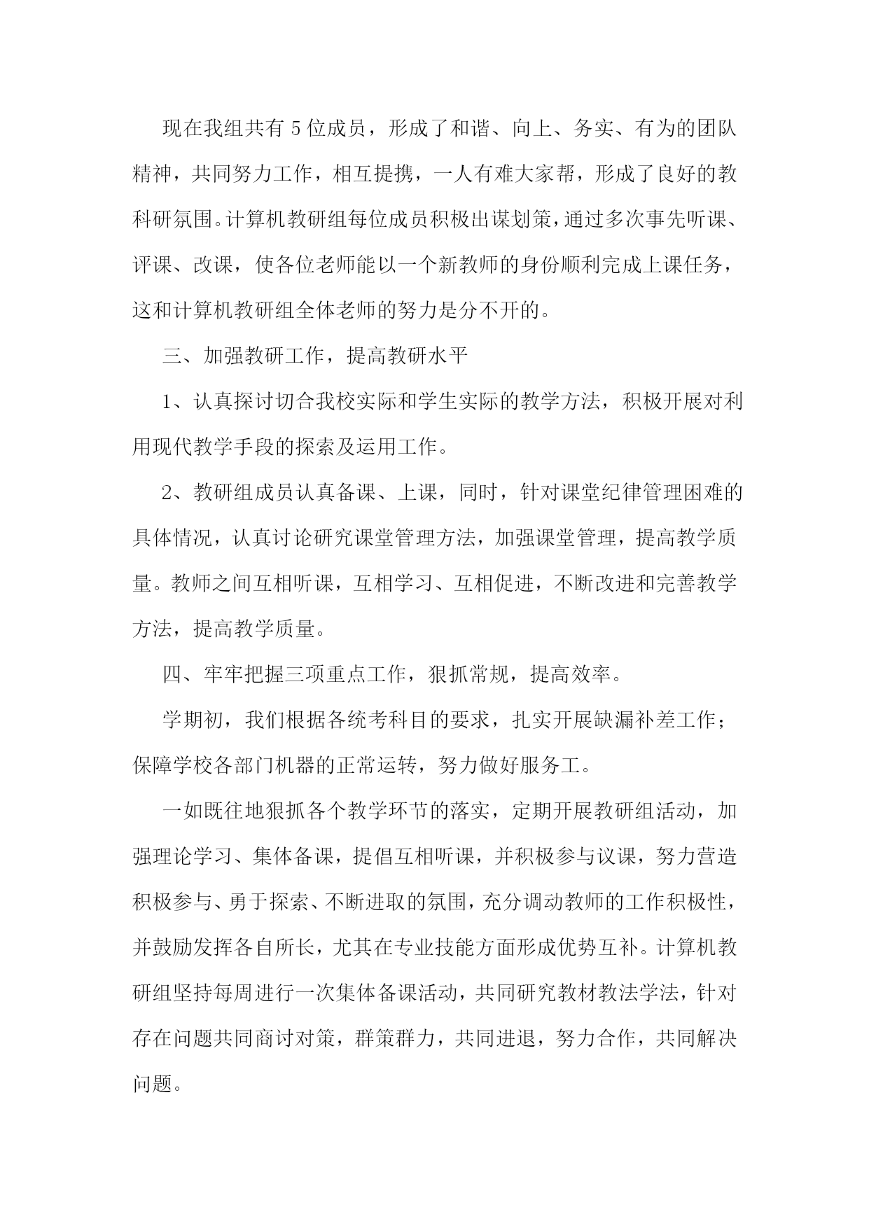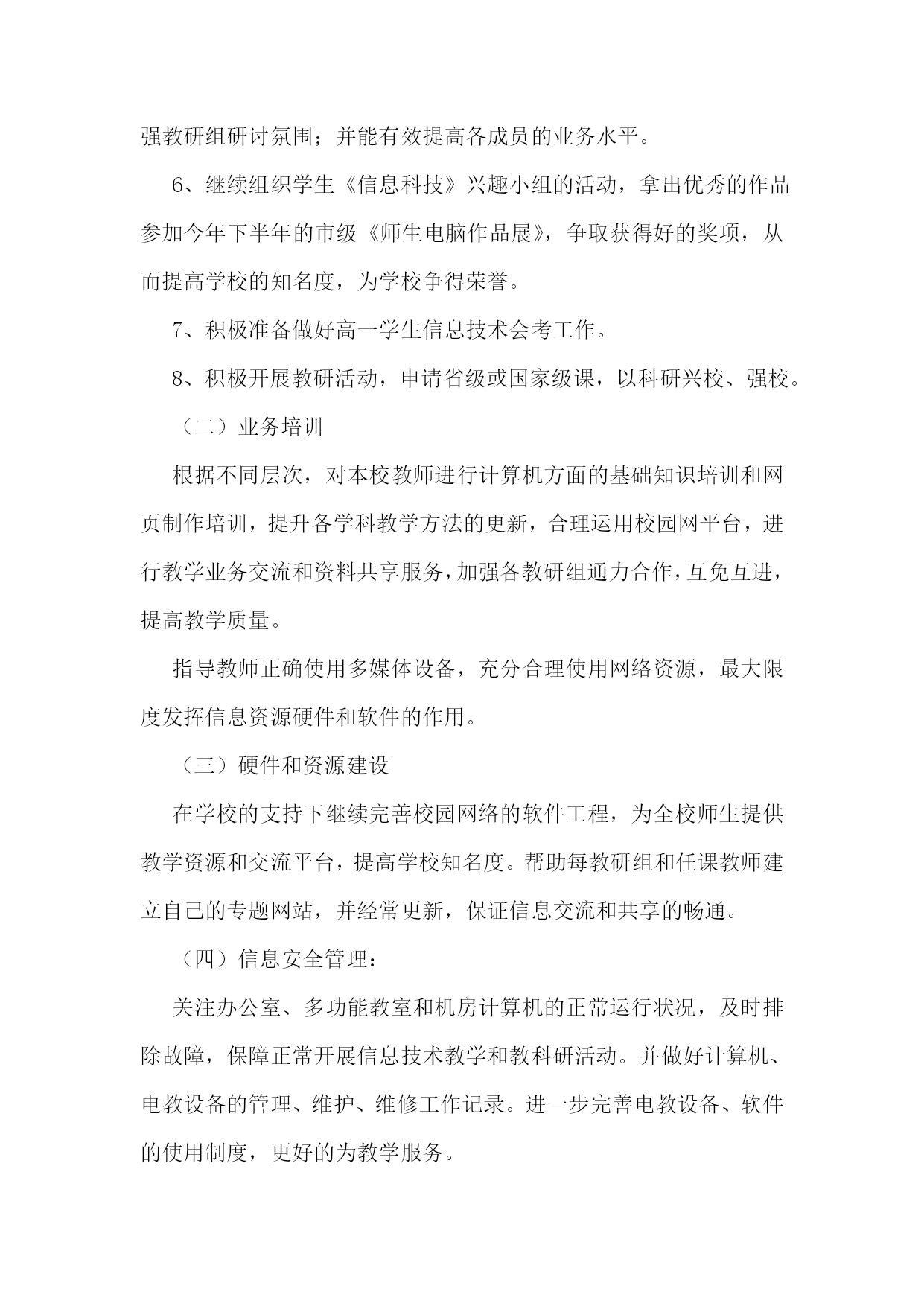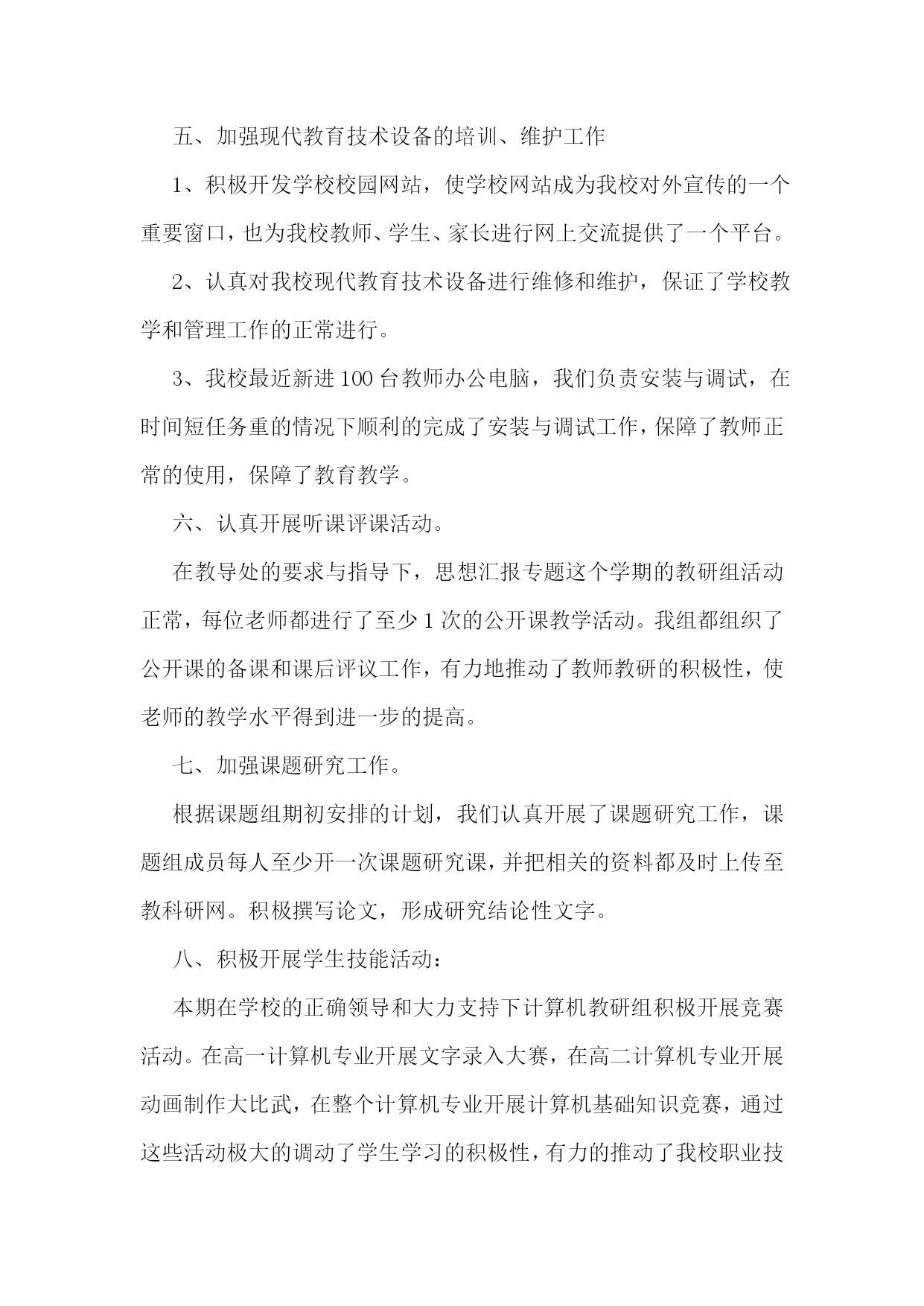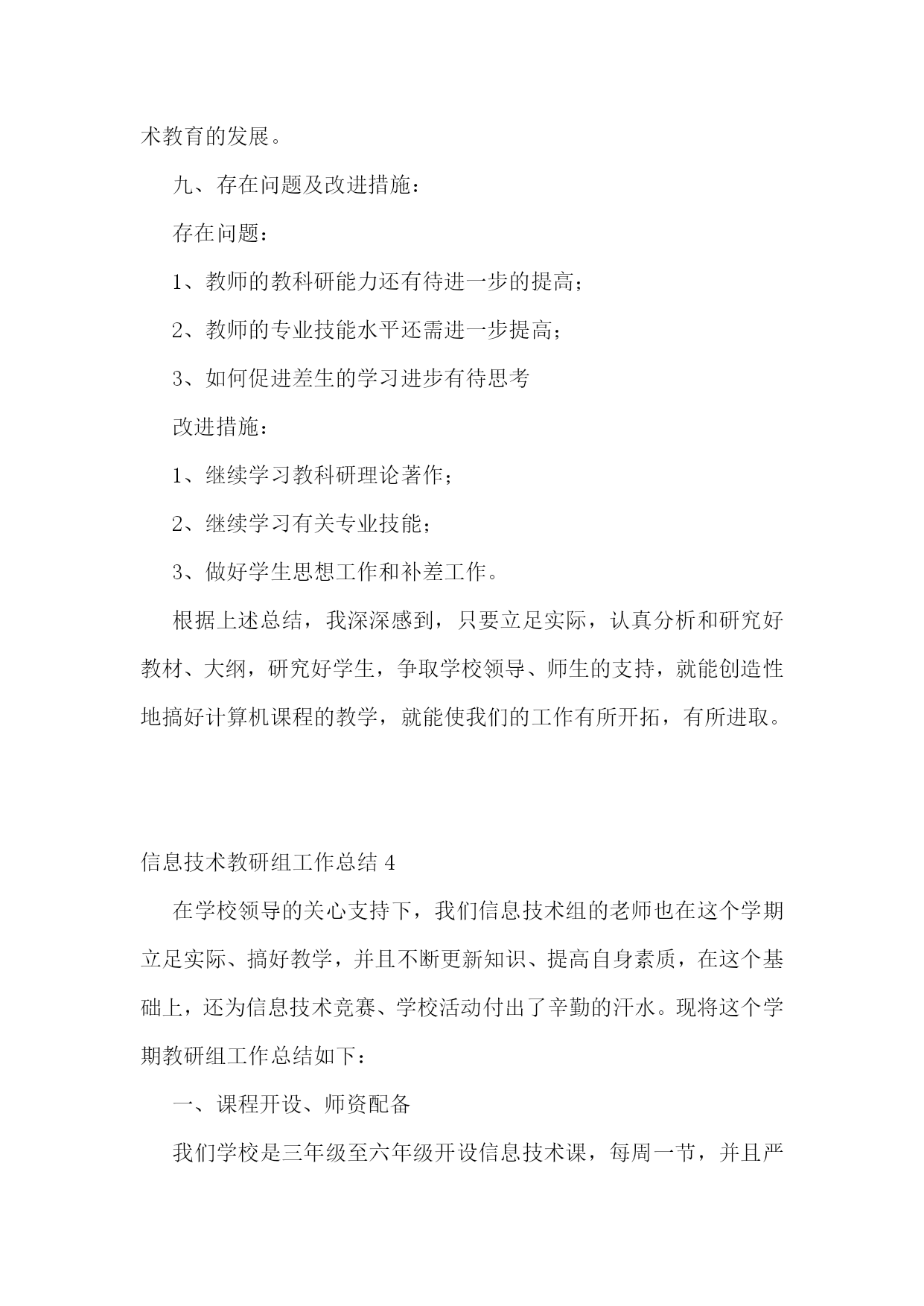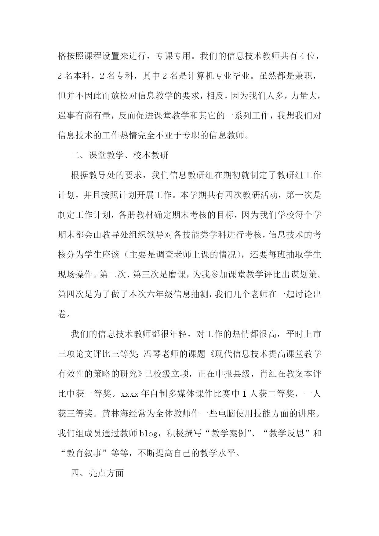 信息技术教研组工作总结(集锦15篇)信息技术教研组工作总结1在学校领导的关心支持下,我们信息技术组的老师也在这个学期立足实际、搞好教学,并且不断更新知识、提高自身素质,在这个基础上,还为各级信息技术竞赛付出了辛勤的汗水。现将这个学期教研组工作总结如下:一、指导思想以信息技术课程教学为重点,培养学生的信息素养,使学生具备获取信息、传输信息、处理信息和应用信息的基本能力,把信息技术作为支持终身学习和合作学习的手段,为适应信息化社会的学习、工作打下必要的基础。二、完成主要的工作1、组织本组教师进一步加强理论学习更新教育教学观念,继续抓好教学常规的落实。以生为本,以学为本,一切为学生的学习着想。2、加强学生信息技术基础知识的学习和基本技能的训练上好每一堂信息技术课,完成了高一级学生信息能力测试指标,并取得了一定的好成绩。3、积极参与各级各类的评比活动,努力提升教学实践水平和教学理论水平。4、配合老师们积极搜集、整理各种教学资源。5、维护好白板系统,使之能正常教学。6、维护好网络,方便老师们网上下载资源。8、培养学生学习兴趣,搞了一次“计算机表演”答题第二课堂活动。9、做好了高三学生电子档案填报工作。10、搞好卫生,机房保持干净。11、组内公开课:主讲人:王小霞张海燕12、优质录像课(王小霞一节)13、信息组发表论文2篇三、业务学习我们几人通过网格,加强理念、实践、技巧学习,提高个人水平。信息技术教研组工作总结2本学期信息技术教研组立足实际、搞好教学,并且不断更新知识、提高自身素质,积极为一线教师和职能科室做好服务工作,在这个基础上,还为各级信息技术竞赛付出了辛勤的汗水,并取得了一定的成绩。现将这个学期教研组工作总结如下:1、立足实际、搞好教学。信息技术是高一的必修课,实行新课改后,它也占有一定的学分,做好信息技术的教学工作也是不容忽视的。在开学初,全体教师参加了新课程培训工作,认真学习,积极接受新的教学理念,学习新的教育教学方法,并在教学工作中努力实施新的理念,做学生的良师益友。备课组按照学期计划,每周三进行集体备课活动,探讨在教学中可能出现的问题,和解决这些问题的方法对策,做好青年教师培训工作。高一学生的信息技术本来应当是非零起点的(在小学和初中都有这门课),但由于有些学生来自农村,他们从来就没有接触过计算机,,在这方面是个空白,甚至不知道鼠标的用法,不知道开关机的方法,而其他的学生呢?已经会在网上邻居查找游戏,知道怎么将一个文件夹共享、隐藏、给共享加访问权限,有的时候老师都拿他没有办法。怎样让一个从未接触过信息技术知识的学生,熟练地掌握最基本的知识,我们组的老师进行了“分层教学”的模式,并加强个别辅导、实现同学间一帮一、多帮一,基本解决了常规教学中难以攻克的难题。并为方便学生学习,每天下午三节课后,给学生开放机房,为他们提供更多的机会补差补缺,达到共同进步。2、努力做好服务工作。尽心尽力服务教学,是我们工作的准则,做好学校网站和学科的网站建设,服务教学,充分利用好现有资源,发挥最大的功效。本学期又有十六个教室安装了多媒体,为能更好的让老师使用这些资源,我们教研组专门对教师进行了多媒体使用的培训,手把手地教老师使用。由于校园网络不够稳定,特为广大老师开设了FTP文件服务;对教学和工作中出现的问题,只要我们教研组的老师知道了,都能及时去给以解决。对老师做课件遇到困难时,总能给予帮热情指导;在每年一次的大型教育教学研讨会活动中,我们信息技术组的老师就是默默地做好多媒体的服务保障工作,如果有教师参加省市级赛课,我们信息技术组的老师也能给预相应的保障。3、加强学习,提高业务水平组内教师平时注重自己的业务学习,自学一些软件的使用,了解最新的信息技术动态,这也和信息技术本身这门前沿学科相关,只有及时掌握最新的技术和思想,才能更好的为教学服务。比如,操作系统的更新和漏洞的补丁,病毒库的及时更新等等。任何教学活动总离不开理论与实践相结合这条主线,信息技术更是如此。4、做好奥赛和学生课外辅导工作。辅导老师克服生源少和其他一些困难,牺牲自己的休息时间,利用周末给学生进行辅导。5、在我们的工作之中还存在很多不足之处,在今后的工作之中要加强自律,增强服务意识,加强自身学习,为学校的发展而努力工作。下学期信息技术教研组展望:(一)教学教研:1、积极开展教研活动,学习课程改革精神,学习和探索任务驱动和小组协作的教学理论,并在实践中摸索。2、认真备课,加强对教材的研究和探讨,针对本校学生实际情况和设备,运用各种先进的教学理念和手段,上好每堂课。3、教师之间进行相互学习,相互交流,从而提高本校每个计算机教师的技术水平,形成辅助教学,并融入到其他学科的良性循环。4、组织教师互相听课,激发学生