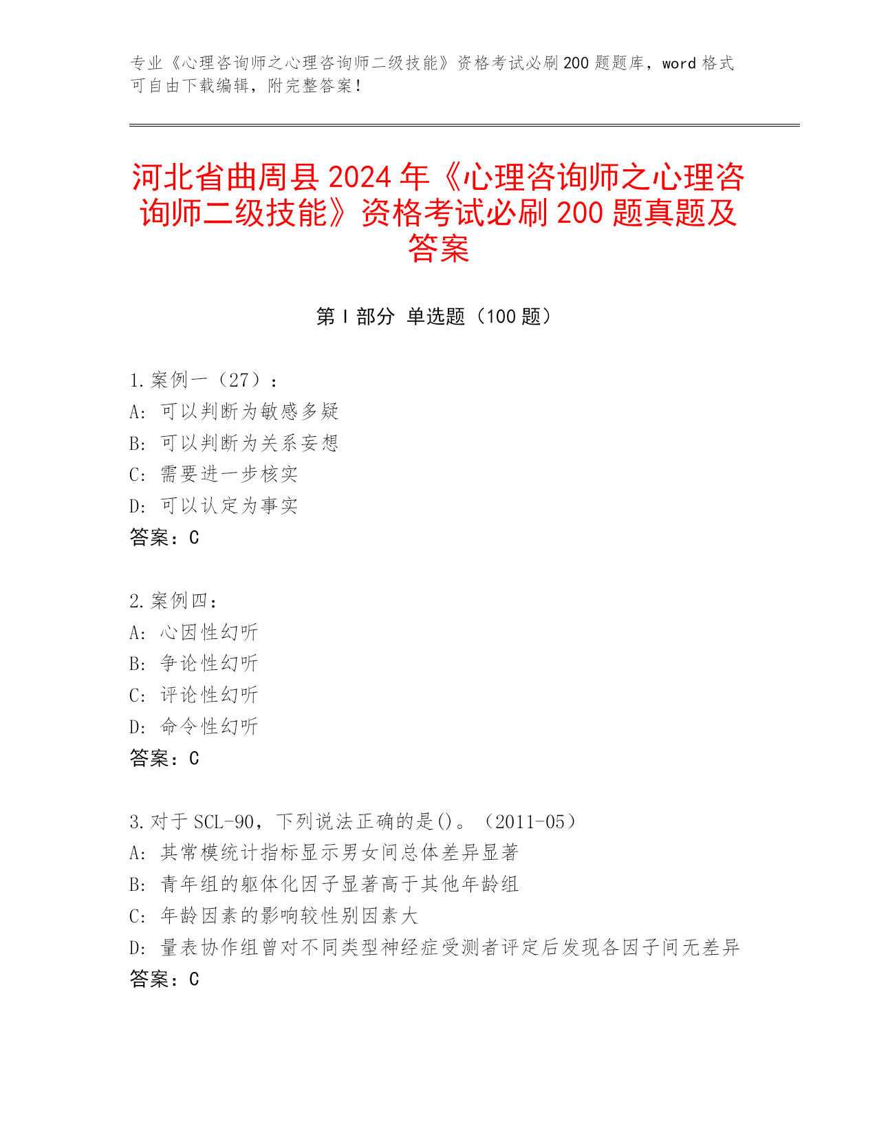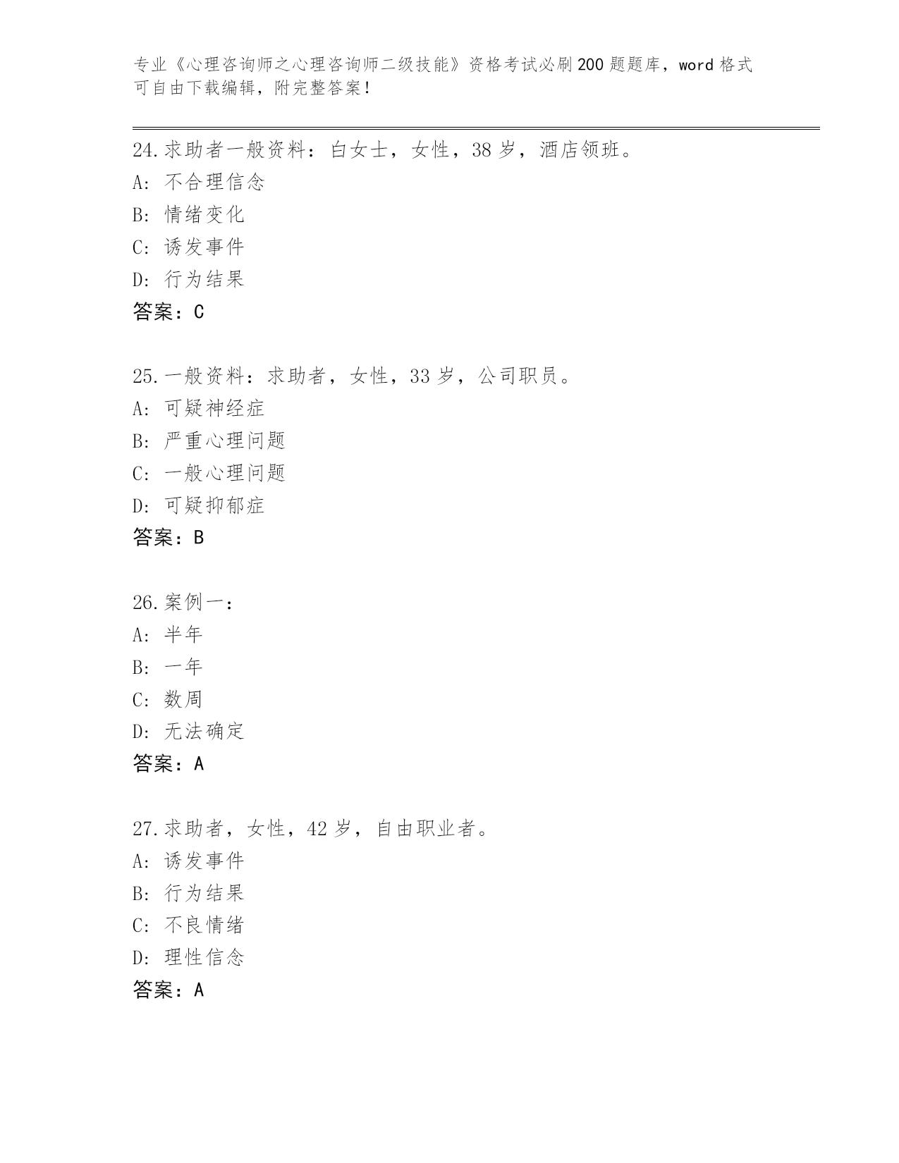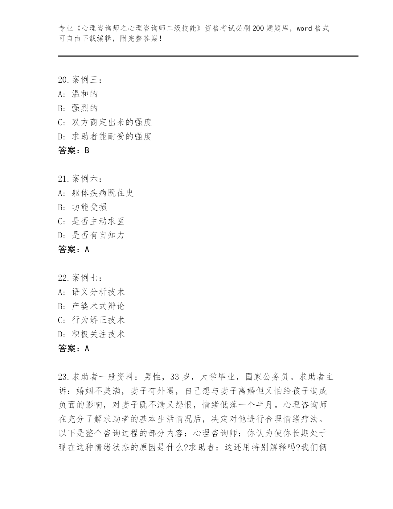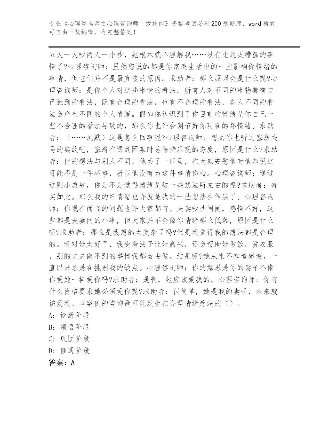 河北省曲周县2024《心理咨询师之心理咨询师二级技能》资格考试必背200题真题及答案【全国使用】