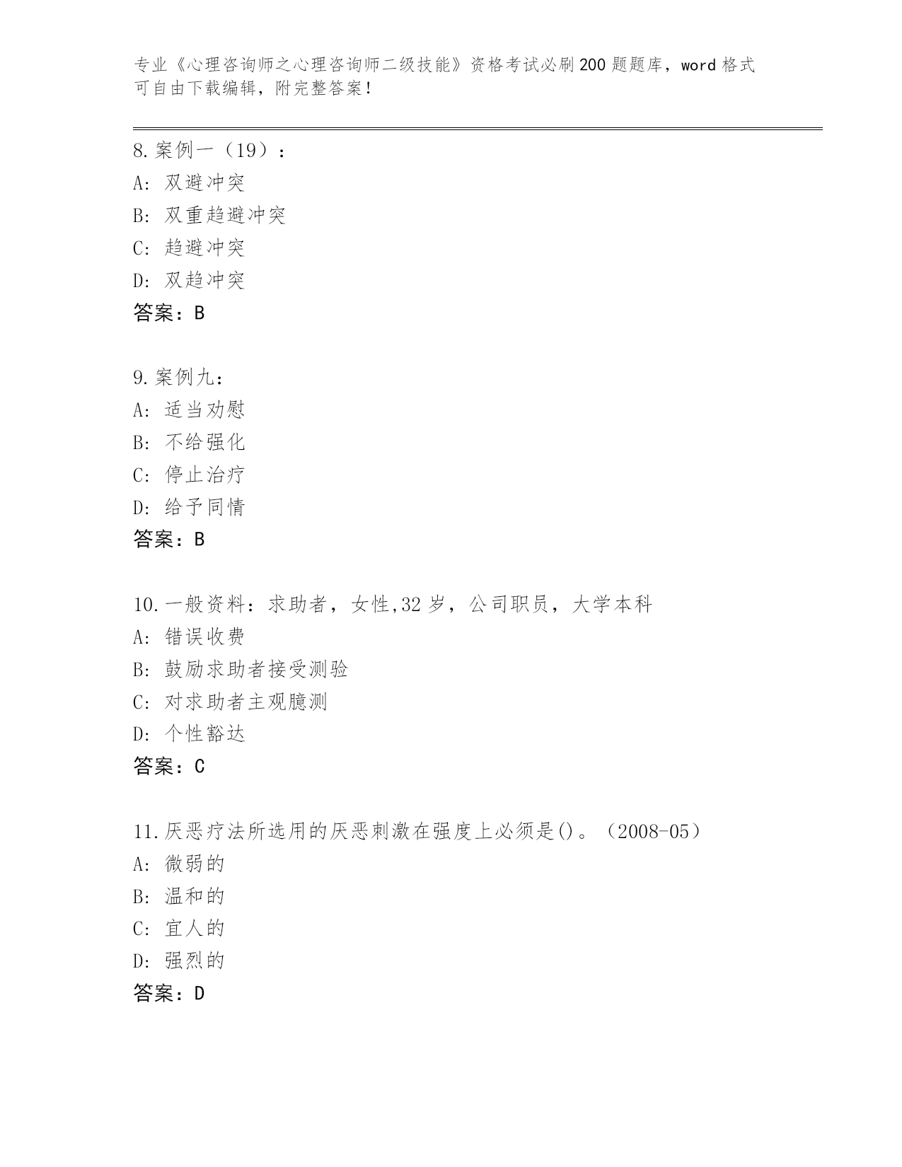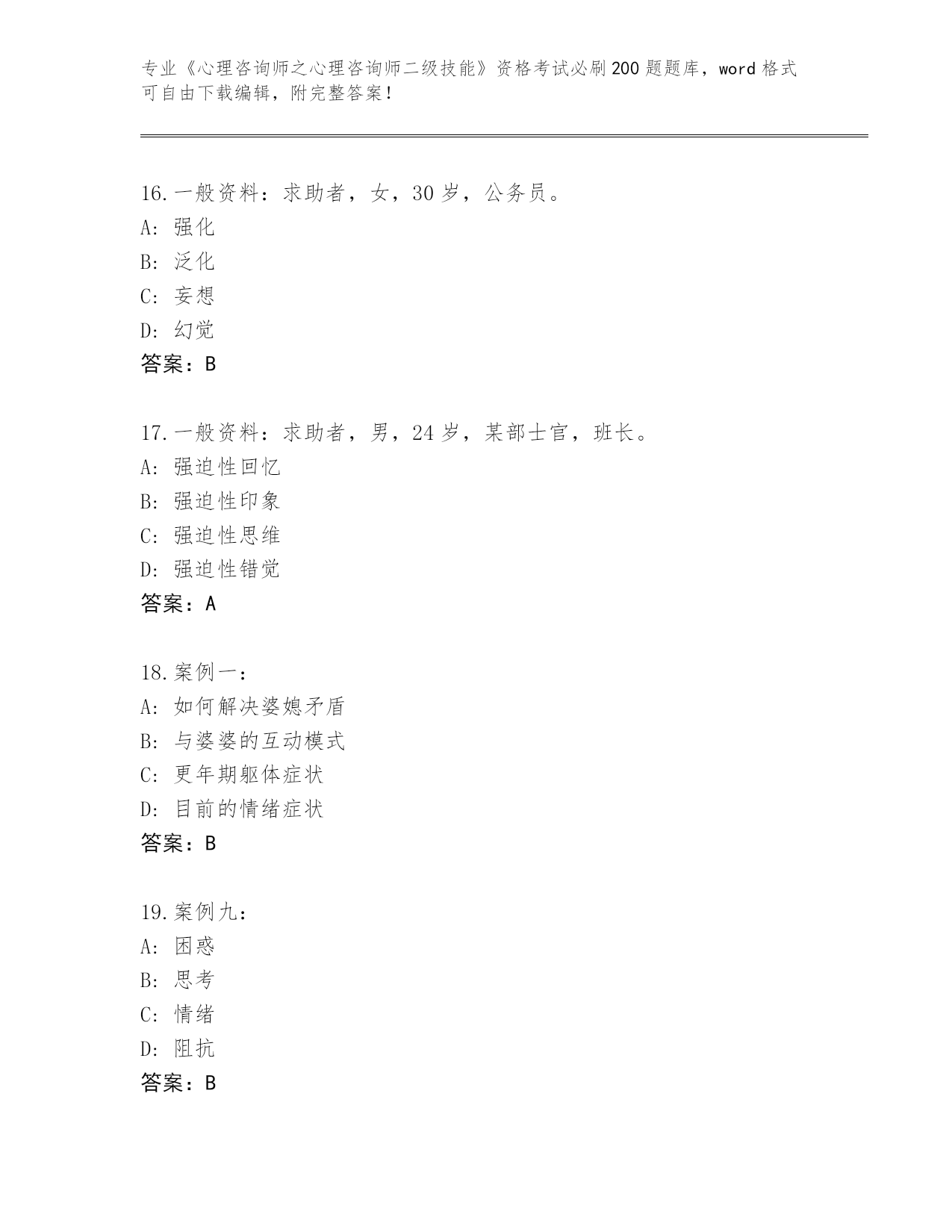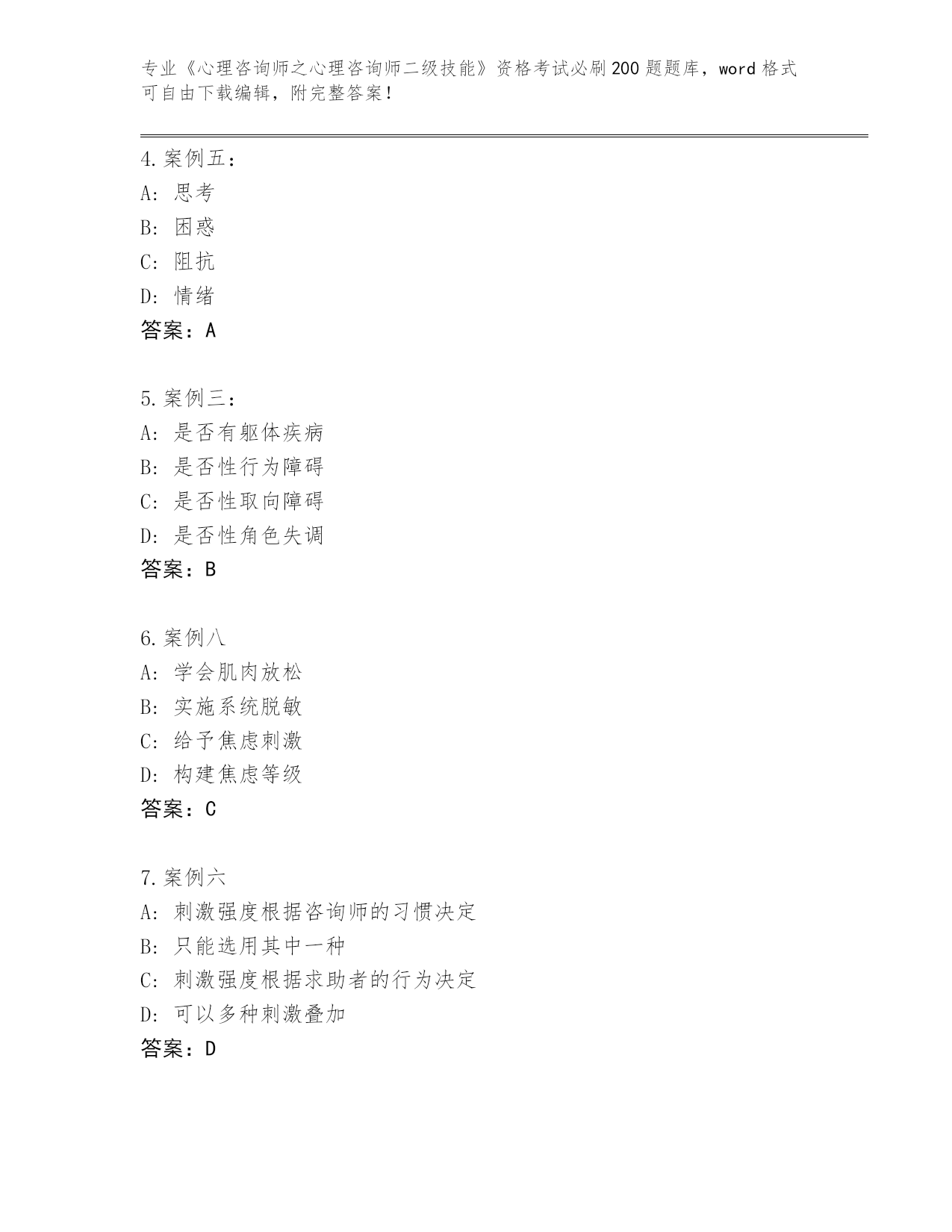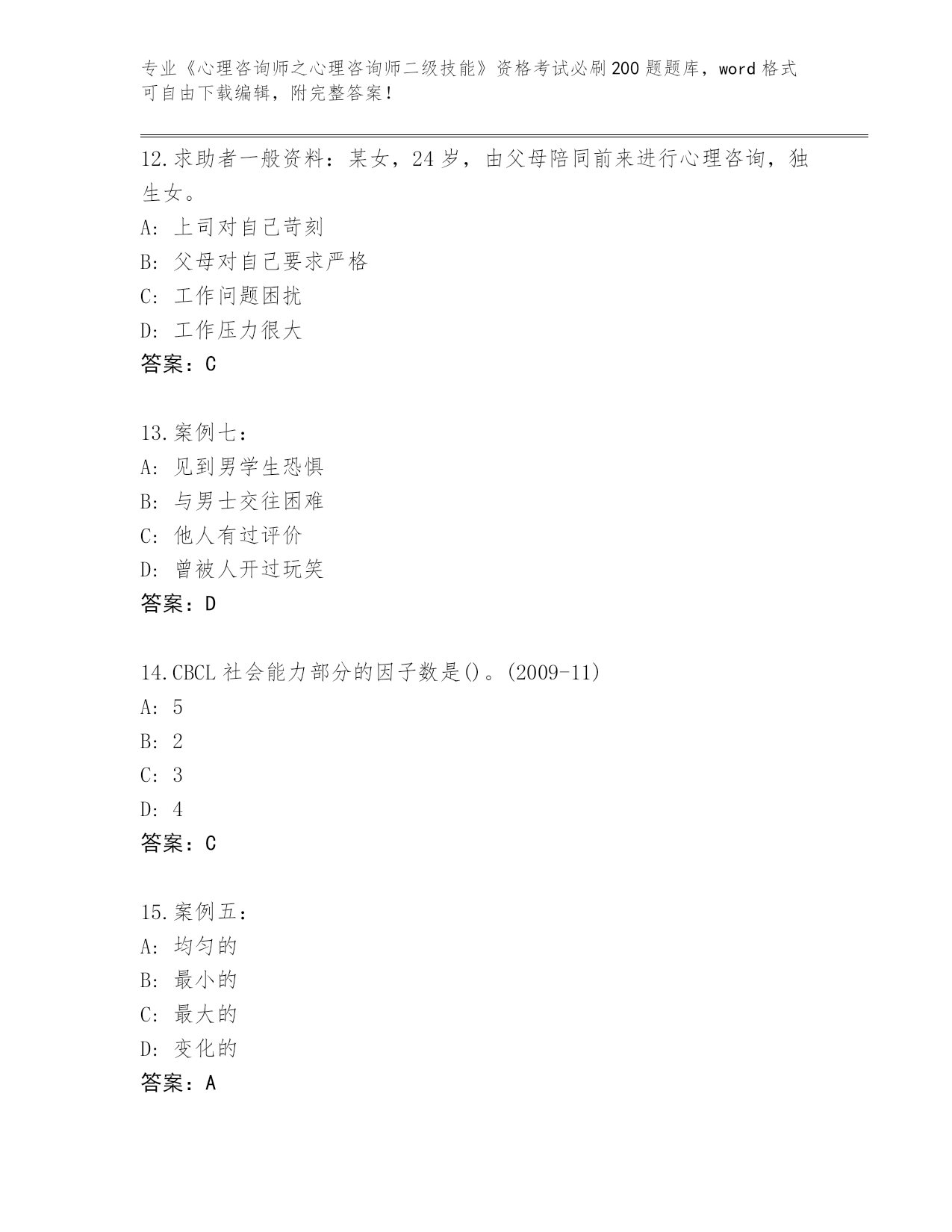 河北省曲周县2024《心理咨询师之心理咨询师二级技能》资格考试必背200题真题及答案【全国使用】