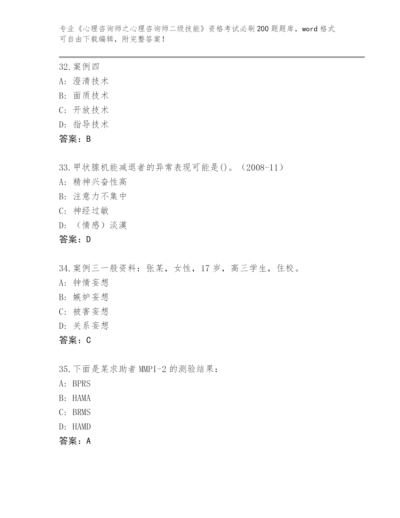 河北省献县历年《心理咨询师之心理咨询师二级技能》考试必刷200题真题含答案