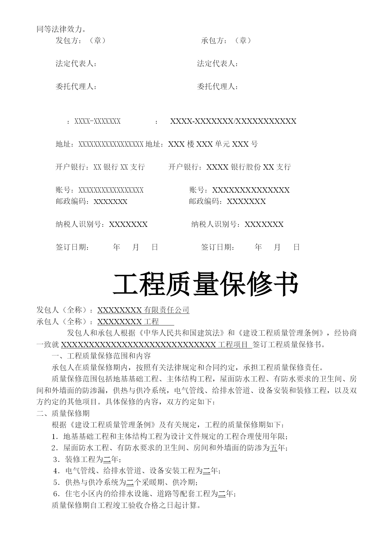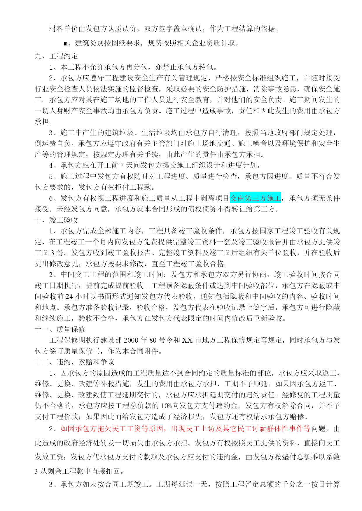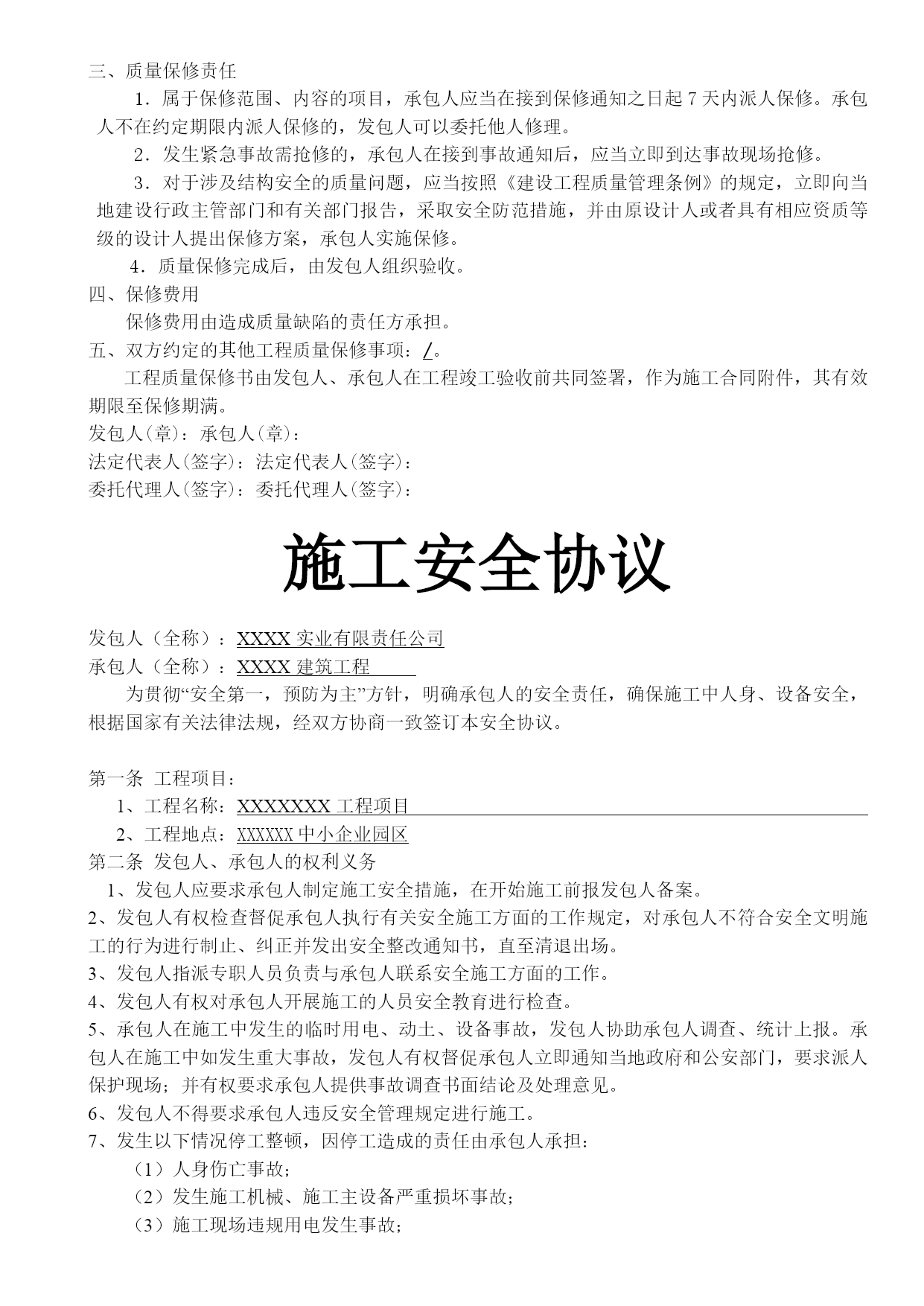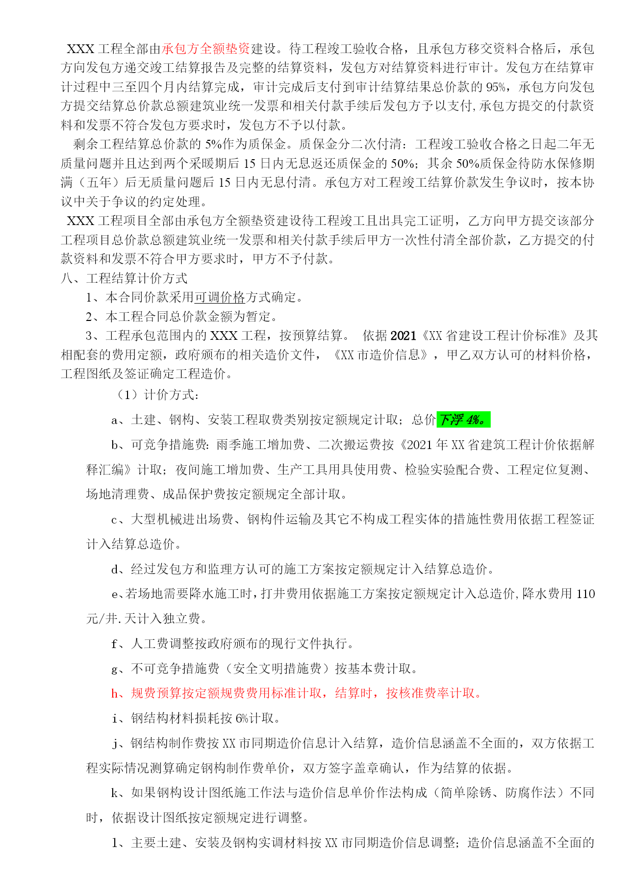 施工合同安全协议质量保证书最新文档(可以直接使用,可编辑最新文档,欢迎下载)合同编号:XXX-XXX建设工程合同工程名称:发包方(全称):承包方(全称):签订地点:发包方(全称):承包方(全称):依照《中华人民共和国合同法》、《中华人民共和国建筑法》及其他有关法律、行政法规,遵循平等、自愿、公平和诚实信用的原则,双方就“XXX有限责任公司XXXX项目”施工事宜,经协商一致,订立本合同。一、工程概况工程名称:。工程地点:。工程内容:。工程资金来源:XXXXXXXXXXXXXXXXXXXXXXXXXXXXXXXXXX承包方全额垫资。二、工程承包范围承包范围:施工图纸内容:。由发包方向承包方提供原施工图纸,承包方对施工图保密。承包方未经发包方同意,不得将本工程图纸泄露或转给第三人。工程质量保修期满后,除承包方存档需要的图纸外,应将全部图纸退还发包方。三、合同工期开工日期:签订合同后x日内进场(承包方未按时进场的,开工日期自合同签订后x日起算)竣工日期:进场后XX日历天内完成工期总日历天数:XX天。工期总日历天数与根据前述计划开竣工日期计算的工期天数不一致的,以本合同约定的工期总日历天数为准。下列情况工期予以顺延:1、由于发包方原因,发包方书面同意给予顺延的工程工期2、不可抗力。四、承包方式建筑工程总承包,包工包料。五、工程质量执行现行国家及地方施工验收规范标准,确保工程质量合格。承包方应认真按照标准、规范和设计图纸要求施工,确保工程质量达到合格标准,质量标准的评定以国家或行业的质量检验评定标准为依据。合同价款合同含税暂定总价款:(大写)人XXXXXX;(小写)¥XXXX元。(1)X工程暂定含税价款:(大写)XXXXX整;(小写)¥XXXX元。(2)X工程项目暂定含税价款:(大写)XXXXXX元整;(小写)¥XXXX元工程款的结算及支付1、付款方式:电汇或承兑2、工程款的支付:XXX工程全部由承包方全额垫资建设。待工程竣工验收合格,且承包方移交资料合格后,承包方向发包方递交竣工结算报告及完整的结算资料,发包方对结算资料进行审计。发包方在结算审计过程中三至四个月内结算完成,审计完成后支付到审计结算结果总价款的95%,承包方向发包方提交结算总价款总额建筑业统一发票和相关付款手续后发包方予以支付,承包方提交的付款资料和发票不符合发包方要求时,发包方不予以付款。剩余工程结算总价款的5%作为质保金。质保金分二次付清:工程竣工验收合格之日起二年无质量问题并且达到两个采暖期后15日内无息返还质保金的50%;其余50%质保金待防水保修期满(五年)后无质量问题后15日内无息付清。承包方对工程竣工结算价款发生争议时,按本协议中关于争议的约定处理。XXX工程项目全部由承包方全额垫资建设待工程竣工且出具完工证明,乙方向甲方提交该部分工程项目总价款总额建筑业统一发票和相关付款手续后甲方一次性付清全部价款,乙方提交的付款资料和发票不符合甲方要求时,甲方不予付款。八、工程结算计价方式1、本合同价款采用可调价格方式确定。2、本工程合同总价款金额为暂定。3、工程承包范围内的XXX工程,按预算结算。依据2021《XX省建设工程计价标准》及其相配套的费用定额,政府颁布的相关造价文件,《XX市造价信息》,甲乙双方认可的材料价格,工程图纸及签证确定工程造价。(1)计价方式:a、土建、钢构、安装工程取费类别按定额规定计取;总价下浮4%。b、可竞争措施费:雨季施工增加费、二次搬运费按《2021年XX省建筑工程计价依据解释汇编》计取;夜间施工增加费、生产工具用具使用费、检验实验配合费、工程定位复测、场地清理费、成品保护费按定额规定全部计取。c、大型机械进出场费、钢构件运输及其它不构成工程实体的措施性费用依据工程签证计入结算总造价。d、经过发包方和监理方认可的施工方案按定额规定计入结算总造价。e、若场地需要降水施工时,打井费用依据施工方案按定额规定计入总造价,降水费用110元/井.天计入独立费。f、人工费调整按政府颁布的现行文件执行。g、不可竞争措施费(安全文明措施费)按基本费计取。h、规费预算按定额规费费用标准计取,结算时,按核准费率计取。i、钢结构材料损耗按6%计取。j、钢结构制作费按XX市同期造价信息计入结算,造价信息涵盖不全面的,双方依据工程实际情况测算确定钢构制作费单价,双方签字盖章确认,作为结算的依据。k、如果钢构设计图纸施工作法与造价信息单价作法构成(简单除锈、防腐作法)不同时,依据设计图纸按定额规定进行调整。l、主要土建、安装及钢构实调材料按XX市同期造价信息调整;造价信息涵盖不全面的材料单价由发包方认
