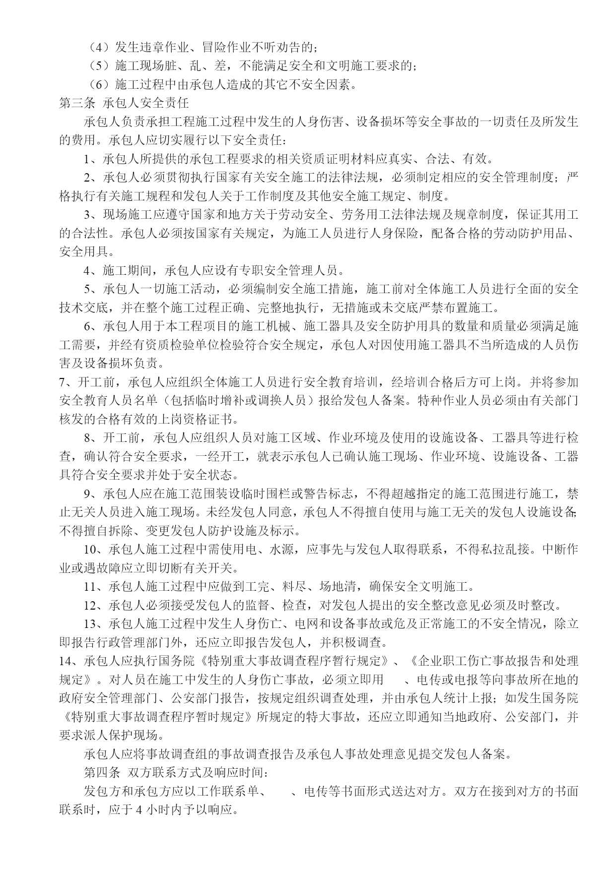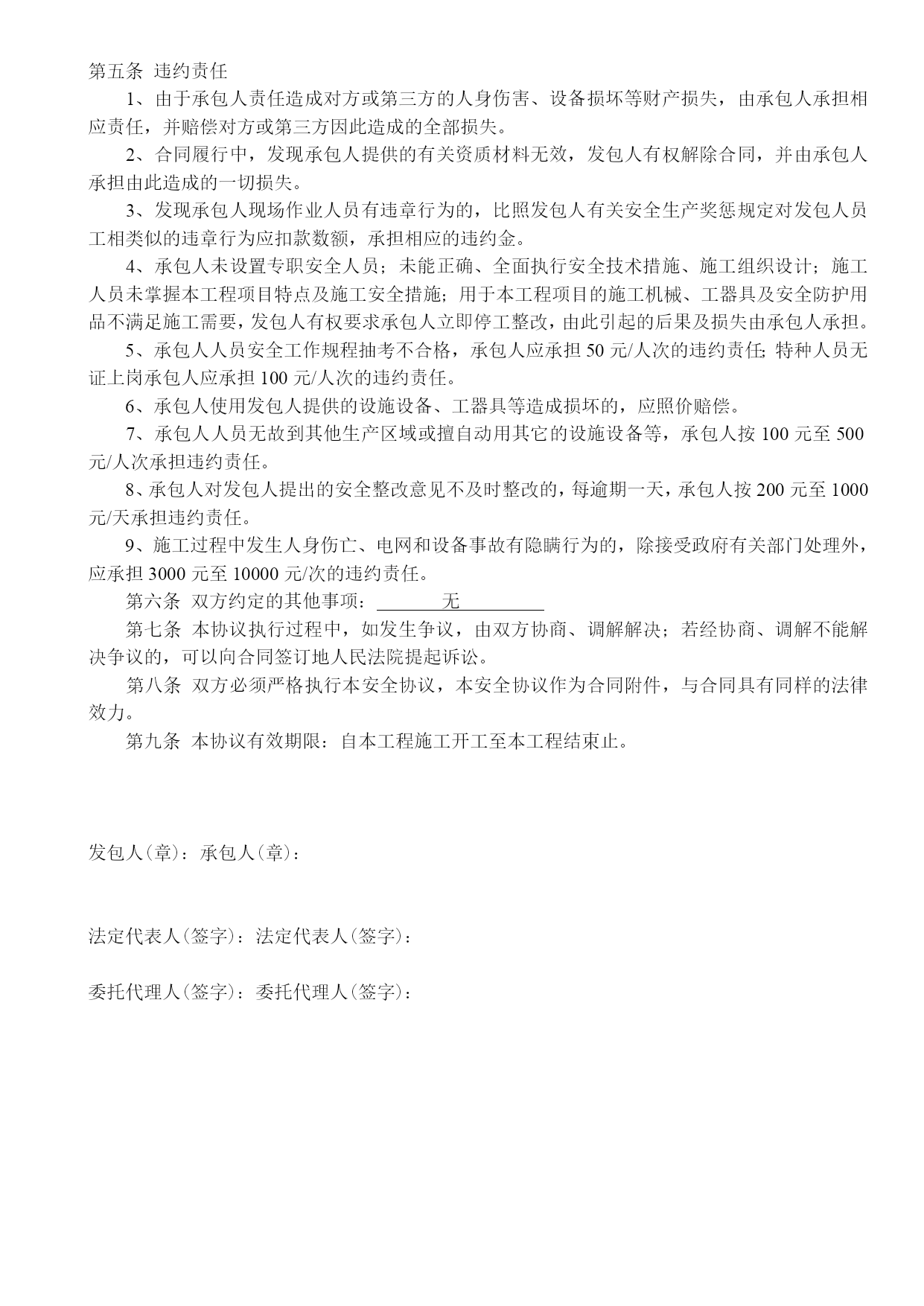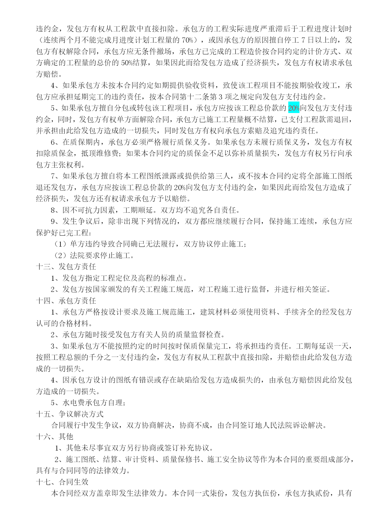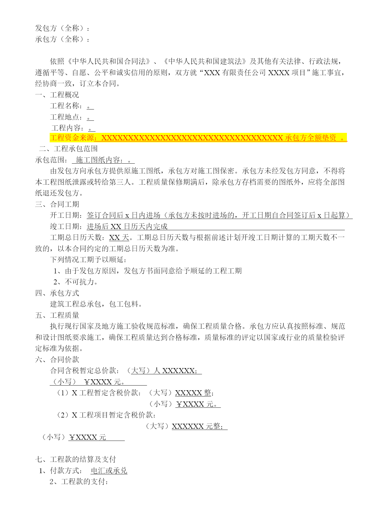 施工合同安全协议质量保证书最新文档(可以直接使用,可编辑最新文档,欢迎下载)合同编号:XXX-XXX建设工程合同工程名称:发包方(全称):承包方(全称):签订地点:发包方(全称):承包方(全称):依照《中华人民共和国合同法》、《中华人民共和国建筑法》及其他有关法律、行政法规,遵循平等、自愿、公平和诚实信用的原则,双方就“XXX有限责任公司XXXX项目”施工事宜,经协商一致,订立本合同。一、工程概况工程名称:。工程地点:。工程内容:。工程资金来源:XXXXXXXXXXXXXXXXXXXXXXXXXXXXXXXXXX承包方全额垫资。二、工程承包范围承包范围:施工图纸内容:。由发包方向承包方提供原施工图纸,承包方对施工图保密。承包方未经发包方同意,不得将本工程图纸泄露或转给第三人。工程质量保修期满后,除承包方存档需要的图纸外,应将全部图纸退还发包方。三、合同工期开工日期:签订合同后x日内进场(承包方未按时进场的,开工日期自合同签订后x日起算)竣工日期:进场后XX日历天内完成工期总日历天数:XX天。工期总日历天数与根据前述计划开竣工日期计算的工期天数不一致的,以本合同约定的工期总日历天数为准。下列情况工期予以顺延:1、由于发包方原因,发包方书面同意给予顺延的工程工期2、不可抗力。四、承包方式建筑工程总承包,包工包料。五、工程质量执行现行国家及地方施工验收规范标准,确保工程质量合格。承包方应认真按照标准、规范和设计图纸要求施工,确保工程质量达到合格标准,质量标准的评定以国家或行业的质量检验评定标准为依据。合同价款合同含税暂定总价款:(大写)人XXXXXX;(小写)¥XXXX元。(1)X工程暂定含税价款:(大写)XXXXX整;(小写)¥XXXX元。(2)X工程项目暂定含税价款:(大写)XXXXXX元整;(小写)¥XXXX元工程款的结算及支付1、付款方式:电汇或承兑2、工程款的支付:XXX工程全部由承包方全额垫资建设。待工程竣工验收合格,且承包方移交资料合格后,承包方向发包方递交竣工结算报告及完整的结算资料,发包方对结算资料进行审计。发包方在结算审计过程中三至四个月内结算完成,审计完成后支付到审计结算结果总价款的95%,承包方向发包方提交结算总价款总额建筑业统一发票和相关付款手续后发包方予以支付,承包方提交的付款资料和发票不符合发包方要求时,发包方不予以付款。剩余工程结算总价款的5%作为质保金。质保金分二次付清:工程竣工验收合格之日起二年无质量问题并且达到两个采暖期后15日内无息返还质保金的50%;其余50%质保金待防水保修期满(五年)后无质量问题后15日内无息付清。承包方对工程竣工结算价款发生争议时,按本协议中关于争议的约定处理。XXX工程项目全部由承包方全额垫资建设待工程竣工且出具完工证明,乙方向甲方提交该部分工程项目总价款总额建筑业统一发票和相关付款手续后甲方一次性付清全部价款,乙方提交的付款资料和发票不符合甲方要求时,甲方不予付款。八、工程结算计价方式1、本合同价款采用可调价格方式确定。2、本工程合同总价款金额为暂定。3、工程承包范围内的XXX工程,按预算结算。依据2021《XX省建设工程计价标准》及其相配套的费用定额,政府颁布的相关造价文件,《XX市造价信息》,甲乙双方认可的材料价格,工程图纸及签证确定工程造价。(1)计价方式:a、土建、钢构、安装工程取费类别按定额规定计取;总价下浮4%。b、可竞争措施费:雨季施工增加费、二次搬运费按《2021年XX省建筑工程计价依据解释汇编》计取;夜间施工增加费、生产工具用具使用费、检验实验配合费、工程定位复测、场地清理费、成品保护费按定额规定全部计取。c、大型机械进出场费、钢构件运输及其它不构成工程实体的措施性费用依据工程签证计入结算总造价。d、经过发包方和监理方认可的施工方案按定额规定计入结算总造价。e、若场地需要降水施工时,打井费用依据施工方案按定额规定计入总造价,降水费用110元/井.天计入独立费。f、人工费调整按政府颁布的现行文件执行。g、不可竞争措施费(安全文明措施费)按基本费计取。h、规费预算按定额规费费用标准计取,结算时,按核准费率计取。i、钢结构材料损耗按6%计取。j、钢结构制作费按XX市同期造价信息计入结算,造价信息涵盖不全面的,双方依据工程实际情况测算确定钢构制作费单价,双方签字盖章确认,作为结算的依据。k、如果钢构设计图纸施工作法与造价信息单价作法构成(简单除锈、防腐作法)不同时,依据设计图纸按定额规定进行调整。l、主要土建、安装及钢构实调材料按XX市同期造价信息调整;造价信息涵盖不全面的材料单价由发包方认
