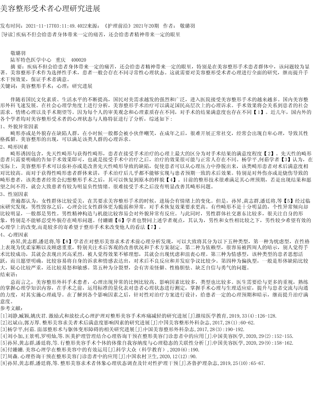 美容整形受术者心理研究进展发布时间:2021-11-17T03:11:49.402Z来源:《护理前沿》2021年20期作者:敬璐羽[导读]疾病不但会给患者身体带来一定的痛苦,还会给患者精神带来一定的眼里敬璐羽陆军特色医学中心重庆400020摘要:疾病不但会给患者身体带来一定的痛苦,还会给患者精神带来一定的眼里,特别是在美容整形手术患者群体中,该问题较为显著。美容整形手术作为选择性手术,患者一般会存在不同寻常性心理状态。这就需要对美容整形受术者心理进行全面的研究,继而提升手术干预效果,保证手术者满意。关键词:美容整形手术;心理;研究进展伴随着国民文化素质、生活水平的不断提高,国民对美需求越发的强烈和广泛,进入医院接受美容整形手术的越来越多。国内美容整形外科飞速发展。在社会心理学角度上进行分析,美容整形手术治疗可以满足国民高层次上的心理诉求。手术效果将会关系到患者的社会需求、情绪心理以及手术期望等。因为每个人的审美观念和心理素质存在不同,对手术的结果满意度也存在不同【1】。近几年,国内外的各个学者均对美容整形受术者的心理状态与人格特征进行了分析,综述如下:1、外貌异常因素畸形亦或是外貌存在缺陷人群,在小时候一般都会被小伙伴嘲笑,在成年之后,很难开展正常社交,经常会出现自卑心理,导致其性格孤僻。美容整形的出现,可以满足该类人群的心理诉求。2、畸形因素畸形诱因包含,先天性畸形与获得性畸形,患者在接受手术治疗的心理上最大的区分为对手术结果的满意度程度【2】。先天性的畸形患者只需要明确的告知手术效果即可,也就是接受手术中治疗之后,治疗的效果很可能与正常人存在不同。杨学平,何茹学者【3】认为,在实际上,美容整形手术可以弥补亦或是改善先天性畸形导致的缺陷,促使患者可以从心理压力中挣脱出来,该类畸形患者对术后满意度相对比较高。而对于获得性畸形患者群体来讲,手术治疗后几乎都不能够实现与患者预期一致的术后效果。特别是对外伤亦或是烧伤导致的畸形患者,该类患者经常会幻想整形手术之后,其可以恢复到原本的样貌【4】。目前的整形技术很难满足其心理预期,若是出现结果和愿望之间不符,就会大致患者有较为明显负性情绪。很难接受手术之后没有明显改善其畸形问题。3、性别因素普遍都认为,女性群体比较爱美,在其要求美容整形手术的时候,进场会有情绪上的变化。但是,孙昇,黄志群,潘廷将,等【5】经过临床研究发现,男性毁容之后,心理会比女性群体更为脆弱和异常,对手术恢复效果要求更高。有些畸形不是十分明显的,个性异常倾向却比较明显,一般都是男性。男性精神构造与机能比较容易会对外貌异常有反应。与此同时,男性群体社交惠东比较多,很关注自身的形象,特别是不能够忍受外貌存在畸形问题。付姗姗【6】学者也赞同上述学者观点,其认为,男性和女性相比较之下,男性较少希望有效的心理学上的改变,而是较多的寄希望于整形手术来改变他人的看法【7】。4、心理因素孙昇,黄志群,潘廷将,等【8】学者在对整形美容求术者术前心理分析发现,可以大致将其分为以下五种类型,第一种为忧虑型,在性格上表现为优柔家断以及顾虑重重,特别关注术后客观的改善状况和手术方案制定。第二种为依赖型,很容易被四周人的暗示,别人觉得手术比较成功,其就会表现出兴高采烈,被人觉得效果不够理想,其就会出现忧虑和沮丧心理。第三种为情感型,该种类型的患者思想活跃,而且愿望明确,比较容易将自身的诉求和情感表达出,对术后不良反应和并发症争议比较少。第四种为偏执型,一般是形体缺陷比较大,疑心比较严重,还比较易怒和敏感。第五种为分裂型,会有害羞怪僻、性格胆怯、缺乏自信与勇气的问题。结束语:总而言之,美容整形外科手术患者,心理出现异常的比例比较高、影响因素比较多,类型也比较多。医生需要给与更多的重视,熟练的掌握心理学知识内容,在手术之前,运用标准的量化表对患者心理状态进行测定,掌握手术心理与生理适应症,提升与患者交流与沟通的力度,对其实施心理疏导。在了解到各个影响因素之后,针对性对治疗方案进行设计,给患者一定的心理预期和暗示,继而提升治疗满意度。参考文献:[1]刘静,臧颖,姚庆君.激励式和放松式心理护理对整形美容手术疼痛减轻的研究进展[J].继续医学教育,2019,33(4):126-128.[2]迟斌山,郭万厚.整形美容求美者术后满意度影响因素的研究进展[J].中国美容整形外科杂志,2017,28(1):60-62.[3]杨学平,何茹.面部整形术与躯体变形障碍的相关研究进展[J].中国美容整形外科杂志,2017,28(3):190-192.[4]刘小加,王景明,罗明灿,等.医美护理管理结合心理咨询干预在整形美容门诊患者中的应用[J].中国美容医学,2020,29(2):