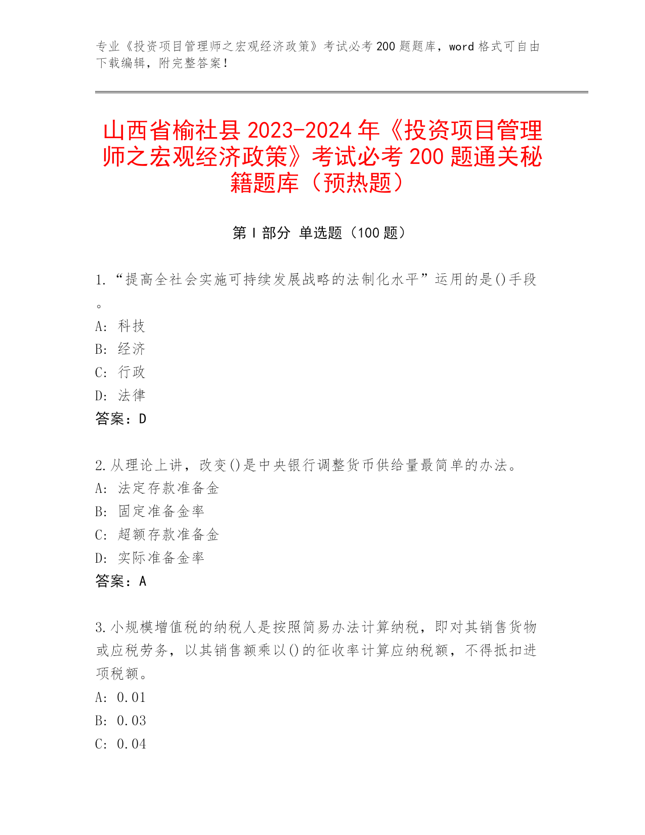 山西省榆社县2023-2024年《投资项目管理师之宏观经济政策》考试必考200题通关秘籍题库(预热题)