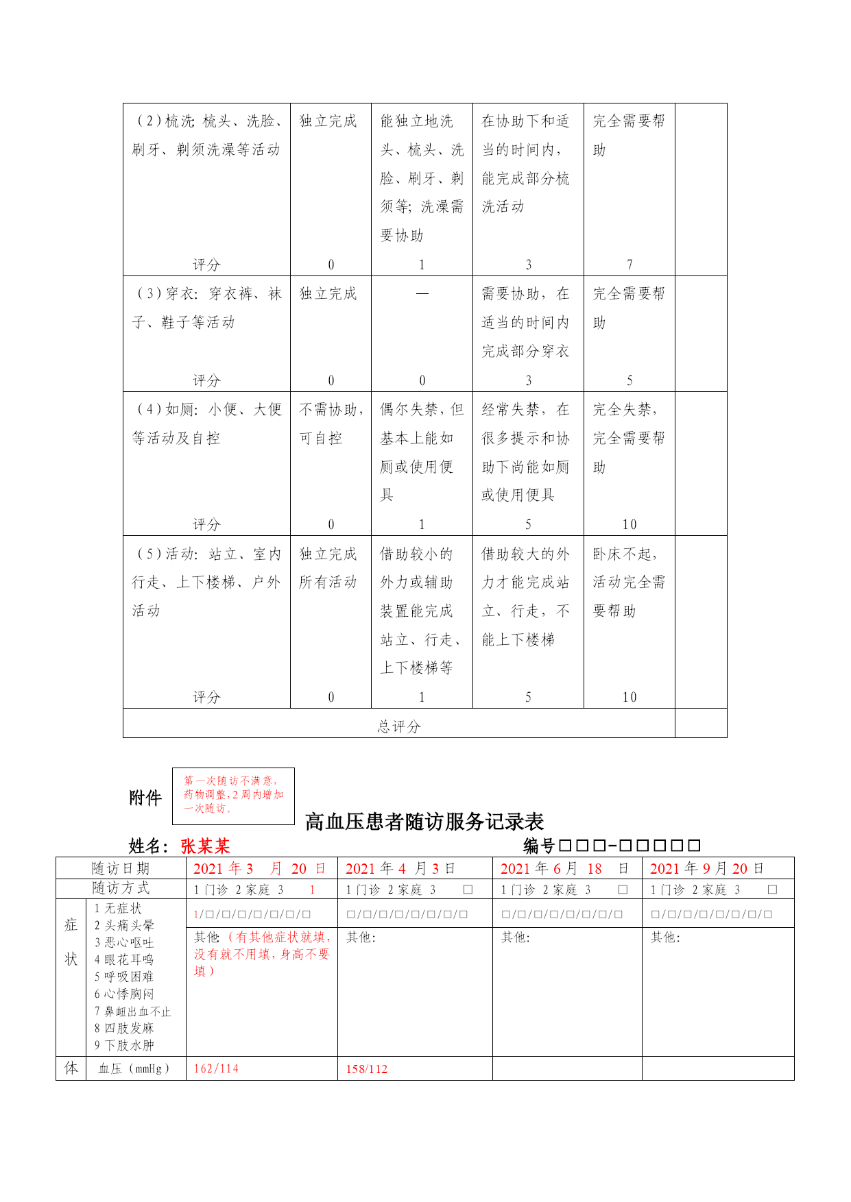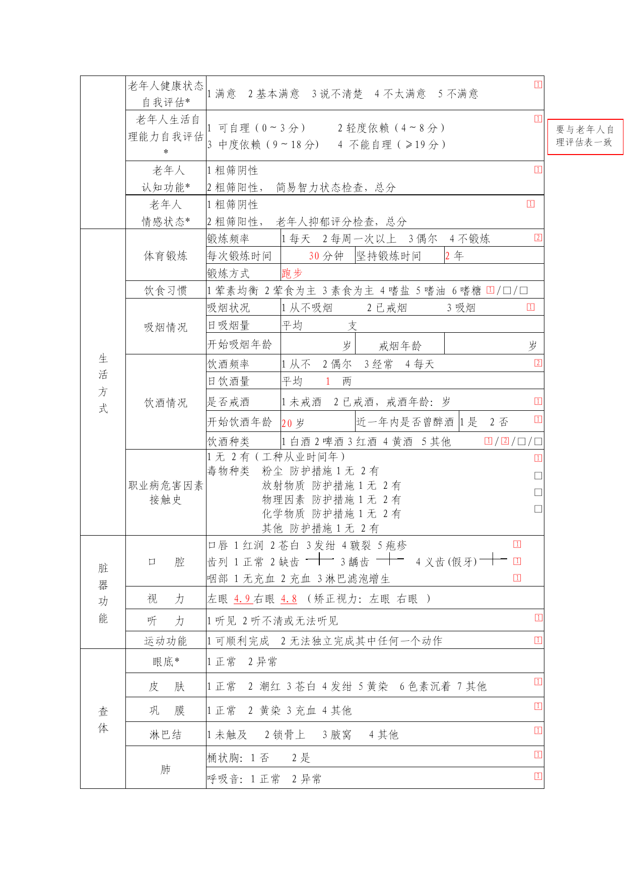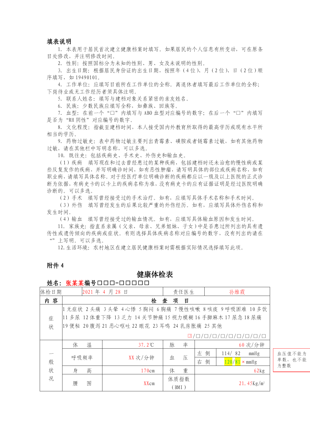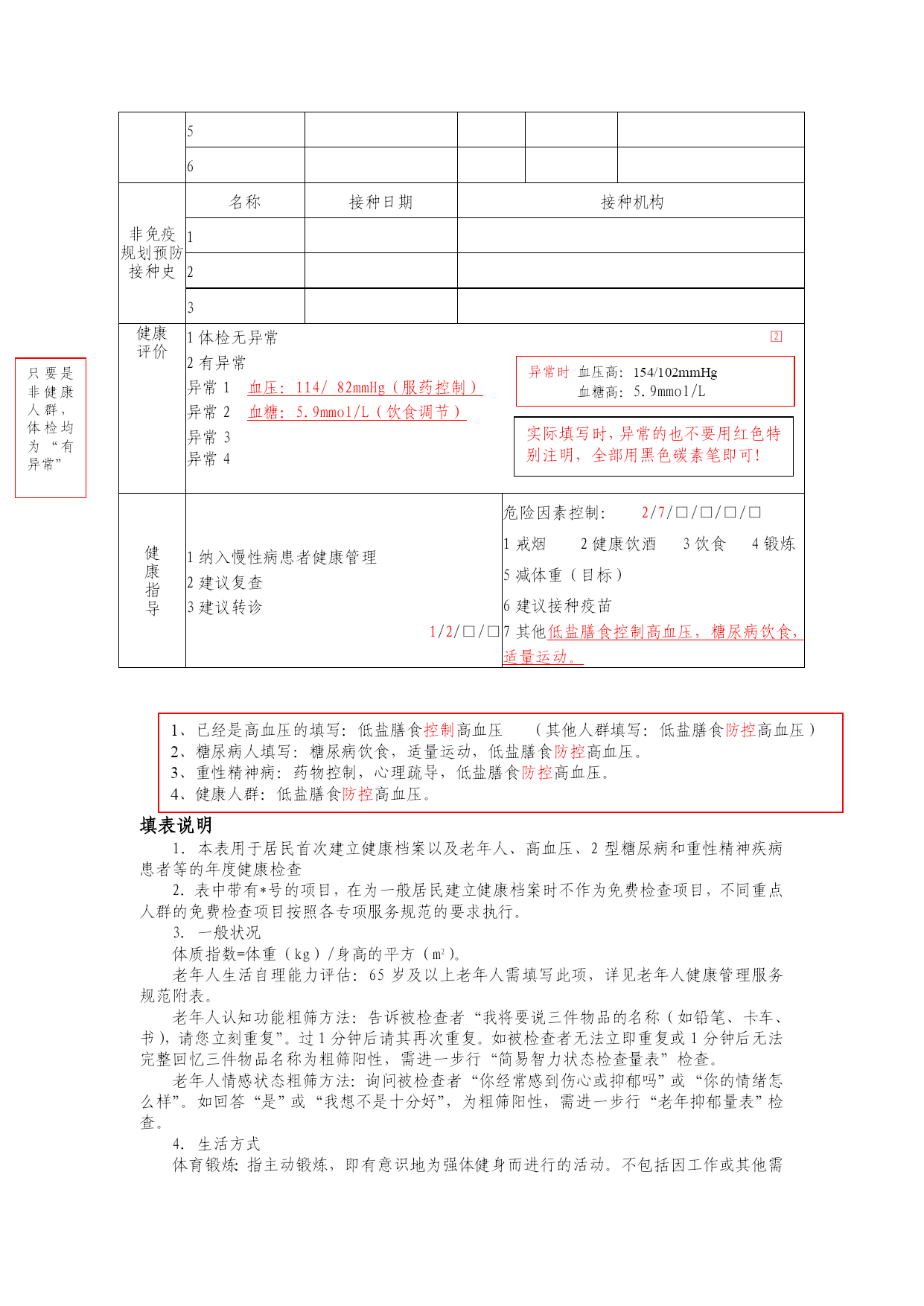 基本公共卫生服务部分表格填写式样优质资料(可以直接使用,可编辑优质资料,欢迎下载)附件3个人基本信息表姓名:张某某编号□□□-□□□□□性别0未知的性别1男2女9未说明的性别EQ\o\ac(□,1)出生日期EQ\o\ac(□,1)EQ\o\ac(□,9)EQ\o\ac(□,5)EQ\o\ac(□,2)EQ\o\ac(□,0)EQ\o\ac(□,9)EQ\o\ac(□,1)EQ\o\ac(□,2)身份证号工作单位无本人132XXXXXXXX联系人姓名李某某联系人158XXXXXXXX常住类型1户籍2非户籍EQ\o\ac(□,1)民族1汉族2少数民族EQ\o\ac(□,1)血型1A型2B型3O型4AB型5不详/RH阴性:1否2是3不详EQ\o\ac(□,2)/EQ\o\ac(□,1)文化程度1文盲及半文盲2小学3初中4高中/技校/中专5大学专科及以上6不详EQ\o\ac(□,2)职业1国家机关、党群组织、企业、事业单位负责人2专业技术人员3办事人员和有关人员4商业、服务业人员5农、林、牧、渔、水利业生产人员6生产、运输设备操作人员及有关人员7军人8不便分类的其他从业人员EQ\o\ac(□,5)婚姻状况1未婚2已婚3丧偶4离婚5未说明的婚姻状况EQ\o\ac(□,2)医疗费用支付方式1城镇职工基本医疗保险2城镇居民基本医疗保险3新型农村合作医疗4贫困救助5商业医疗保险6全公费7全自费8其他2/□/□药物过敏史1无有:2青霉素3磺胺4链霉素5其他EQ\o\ac(□,1)/□/□/□暴露史1无有:2化学品3毒物4射线EQ\o\ac(□,1)/□/□既往史疾病1无2高血压3糖尿病4冠心病5慢性阻塞性肺疾病6恶性肿瘤7脑卒中8重性精神疾病9结核病10肝炎11其他法定传染病12职业病13其他EQ\o\ac(□,2)确诊时间2021年3月/EQ\o\ac(□,3)确诊时间2021年6月/□确诊时间年月□确诊时间年月/□确诊时间年月/□确诊时间年月手术1无2有:名称1时间/名称2时间EQ\o\ac(□,1)外伤1无2有:名称1时间/名称2时间EQ\o\ac(□,1)输血1无2有:原因1时间/原因2时间EQ\o\ac(□,1)家族史父亲EQ\o\ac(□,3)/□/□/□/□/□母亲EQ\o\ac(□,1)/□/□/□/□/□兄弟姐妹EQ\o\ac(□,1)/□/□/□/□/□子女EQ\o\ac(□,1)/□/□/□/□/□1无2高血压3糖尿病4冠心病5慢性阻塞性肺疾病6恶性肿瘤7脑卒中8重性精神疾病9结核病10肝炎11先天畸形12其他遗传病史1无2有:疾病名称EQ\o\ac(□,1)残疾情况1无残疾2视力残疾3听力残疾4言语残疾5肢体残疾6智力残疾7精神残疾8其他残疾EQ\o\ac(□,1)/□/□/□/□/□生活环境*厨房排风设施1无2油烟机3换气扇4烟囱生活环境一项,农村的必须填写!EQ\o\ac(□,1)燃料类型1液化气2煤3天然气4沼气5柴火6其他EQ\o\ac(□,1)饮水1自来水2经净化过滤的水3井水4河湖水5塘水6其他EQ\o\ac(□,3)厕所1卫生厕所2一格或二格粪池式3马桶4露天粪坑5简易棚厕EQ\o\ac(□,5)禽畜栏1单设2室内3室外EQ\o\ac(□,1)填表说明1.本表用于居民首次建立健康档案时填写。如果居民的个人信息有所变动,可在原条目处修改,并注明修改时间。2.性别:按照国标分为未知的性别、男、女及未说明的性别。3.出生日期:根据居民身份证的出生日期,按照年(4位)、月(2位)、日(2位)顺序填写,如19490101。4.工作单位:应填写目前所在工作单位的全称。离退休者填写最后工作单位的全称;下岗待业或无工作经历者须具体注明。5.联系人姓名:填写与建档对象关系紧密的亲友姓名。6.民族:少数民族应填写全称,如彝族、回族等。7.血型:在前一个“□”内填写与ABO血型对应编号的数字;在后一个“□”内填写是否为“RH阴性”对应编号的数字。8.文化程度:指截至建档时间,本人接受国内外教育所取得的最高学历或现有水平所相当的学历。9.药物过敏史:表中药物过敏主要列出青霉素、磺胺或者链霉素过敏,如有其他药物过敏,请在其他栏中写明名称,可以多选。10.既往史:包括疾病史、手术史、外伤史和输血史。(1)疾病填写现在和过去曾经患过的某种疾病,包括建档时还未治愈的慢性病或某些反复发作的疾病,并写明确诊时间,如有恶性肿瘤,请写明具体的部位或疾病名称,如有职业病,请填写具体名称。对于经医疗单