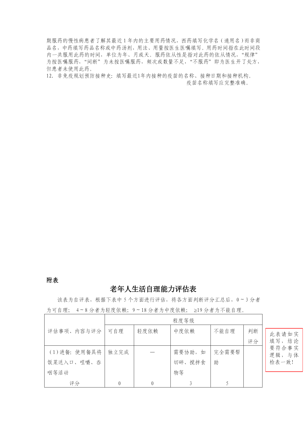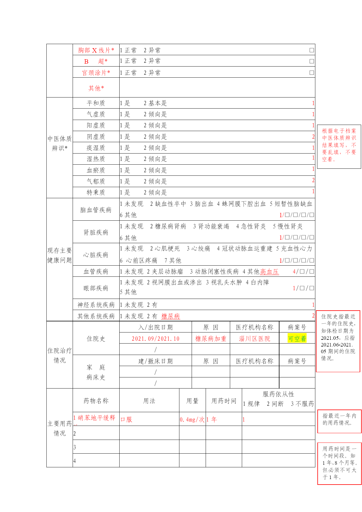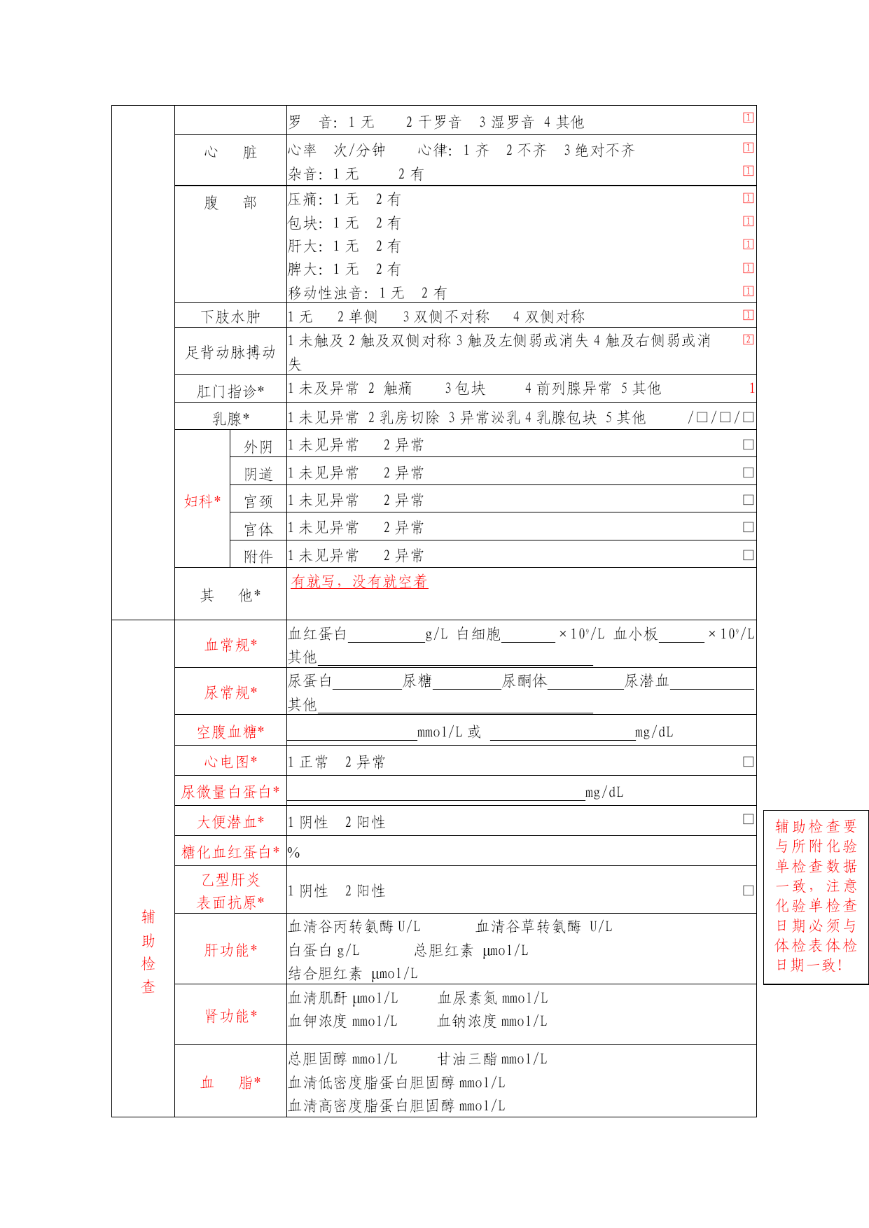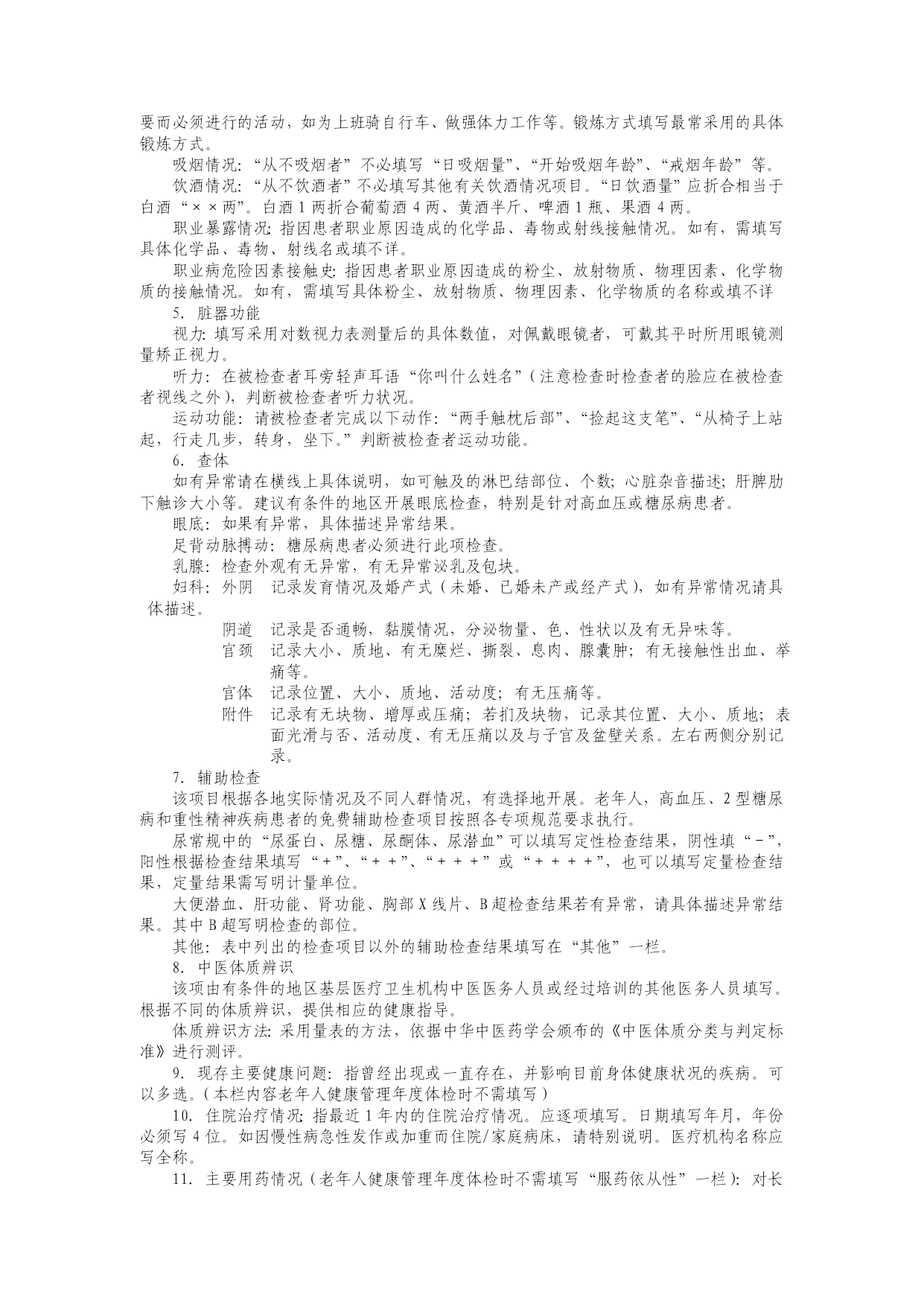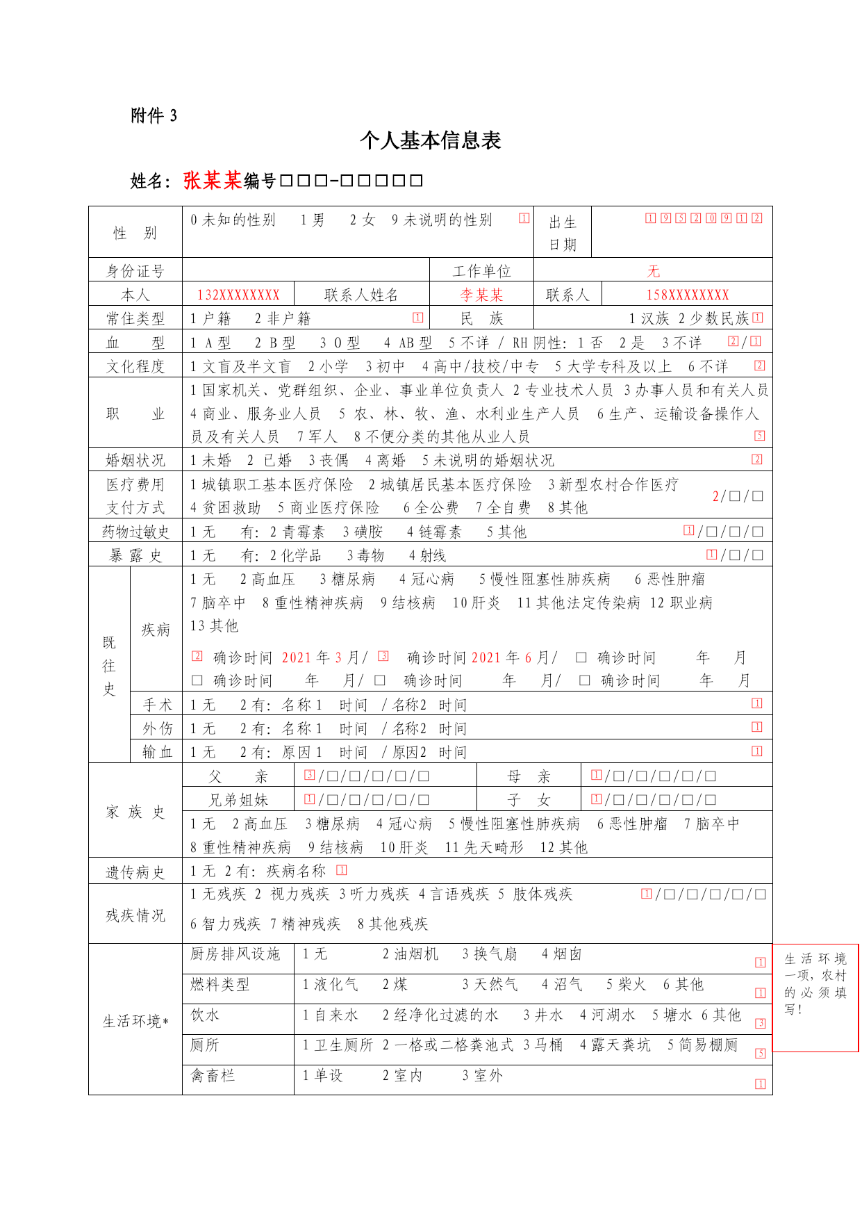 基本公共卫生服务部分表格填写式样优质资料(可以直接使用,可编辑优质资料,欢迎下载)附件3个人基本信息表姓名:张某某编号□□□-□□□□□性别0未知的性别1男2女9未说明的性别EQ\o\ac(□,1)出生日期EQ\o\ac(□,1)EQ\o\ac(□,9)EQ\o\ac(□,5)EQ\o\ac(□,2)EQ\o\ac(□,0)EQ\o\ac(□,9)EQ\o\ac(□,1)EQ\o\ac(□,2)身份证号工作单位无本人132XXXXXXXX联系人姓名李某某联系人158XXXXXXXX常住类型1户籍2非户籍EQ\o\ac(□,1)民族1汉族2少数民族EQ\o\ac(□,1)血型1A型2B型3O型4AB型5不详/RH阴性:1否2是3不详EQ\o\ac(□,2)/EQ\o\ac(□,1)文化程度1文盲及半文盲2小学3初中4高中/技校/中专5大学专科及以上6不详EQ\o\ac(□,2)职业1国家机关、党群组织、企业、事业单位负责人2专业技术人员3办事人员和有关人员4商业、服务业人员5农、林、牧、渔、水利业生产人员6生产、运输设备操作人员及有关人员7军人8不便分类的其他从业人员EQ\o\ac(□,5)婚姻状况1未婚2已婚3丧偶4离婚5未说明的婚姻状况EQ\o\ac(□,2)医疗费用支付方式1城镇职工基本医疗保险2城镇居民基本医疗保险3新型农村合作医疗4贫困救助5商业医疗保险6全公费7全自费8其他2/□/□药物过敏史1无有:2青霉素3磺胺4链霉素5其他EQ\o\ac(□,1)/□/□/□暴露史1无有:2化学品3毒物4射线EQ\o\ac(□,1)/□/□既往史疾病1无2高血压3糖尿病4冠心病5慢性阻塞性肺疾病6恶性肿瘤7脑卒中8重性精神疾病9结核病10肝炎11其他法定传染病12职业病13其他EQ\o\ac(□,2)确诊时间2021年3月/EQ\o\ac(□,3)确诊时间2021年6月/□确诊时间年月□确诊时间年月/□确诊时间年月/□确诊时间年月手术1无2有:名称1时间/名称2时间EQ\o\ac(□,1)外伤1无2有:名称1时间/名称2时间EQ\o\ac(□,1)输血1无2有:原因1时间/原因2时间EQ\o\ac(□,1)家族史父亲EQ\o\ac(□,3)/□/□/□/□/□母亲EQ\o\ac(□,1)/□/□/□/□/□兄弟姐妹EQ\o\ac(□,1)/□/□/□/□/□子女EQ\o\ac(□,1)/□/□/□/□/□1无2高血压3糖尿病4冠心病5慢性阻塞性肺疾病6恶性肿瘤7脑卒中8重性精神疾病9结核病10肝炎11先天畸形12其他遗传病史1无2有:疾病名称EQ\o\ac(□,1)残疾情况1无残疾2视力残疾3听力残疾4言语残疾5肢体残疾6智力残疾7精神残疾8其他残疾EQ\o\ac(□,1)/□/□/□/□/□生活环境*厨房排风设施1无2油烟机3换气扇4烟囱生活环境一项,农村的必须填写!EQ\o\ac(□,1)燃料类型1液化气2煤3天然气4沼气5柴火6其他EQ\o\ac(□,1)饮水1自来水2经净化过滤的水3井水4河湖水5塘水6其他EQ\o\ac(□,3)厕所1卫生厕所2一格或二格粪池式3马桶4露天粪坑5简易棚厕EQ\o\ac(□,5)禽畜栏1单设2室内3室外EQ\o\ac(□,1)填表说明1.本表用于居民首次建立健康档案时填写。如果居民的个人信息有所变动,可在原条目处修改,并注明修改时间。2.性别:按照国标分为未知的性别、男、女及未说明的性别。3.出生日期:根据居民身份证的出生日期,按照年(4位)、月(2位)、日(2位)顺序填写,如19490101。4.工作单位:应填写目前所在工作单位的全称。离退休者填写最后工作单位的全称;下岗待业或无工作经历者须具体注明。5.联系人姓名:填写与建档对象关系紧密的亲友姓名。6.民族:少数民族应填写全称,如彝族、回族等。7.血型:在前一个“□”内填写与ABO血型对应编号的数字;在后一个“□”内填写是否为“RH阴性”对应编号的数字。8.文化程度:指截至建档时间,本人接受国内外教育所取得的最高学历或现有水平所相当的学历。9.药物过敏史:表中药物过敏主要列出青霉素、磺胺或者链霉素过敏,如有其他药物过敏,请在其他栏中写明名称,可以多选。10.既往史:包括疾病史、手术史、外伤史和输血史。(1)疾病填写现在和过去曾经患过的某种疾病,包括建档时还未治愈的慢性病或某些反复发作的疾病,并写明确诊时间,如有恶性肿瘤,请写明具体的部位或疾病名称,如有职业病,请填写具体名称。对于经医疗单