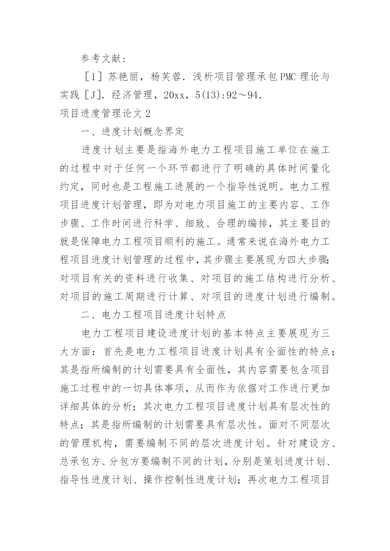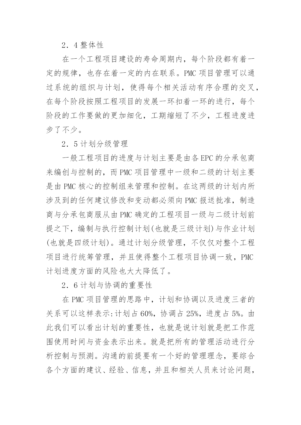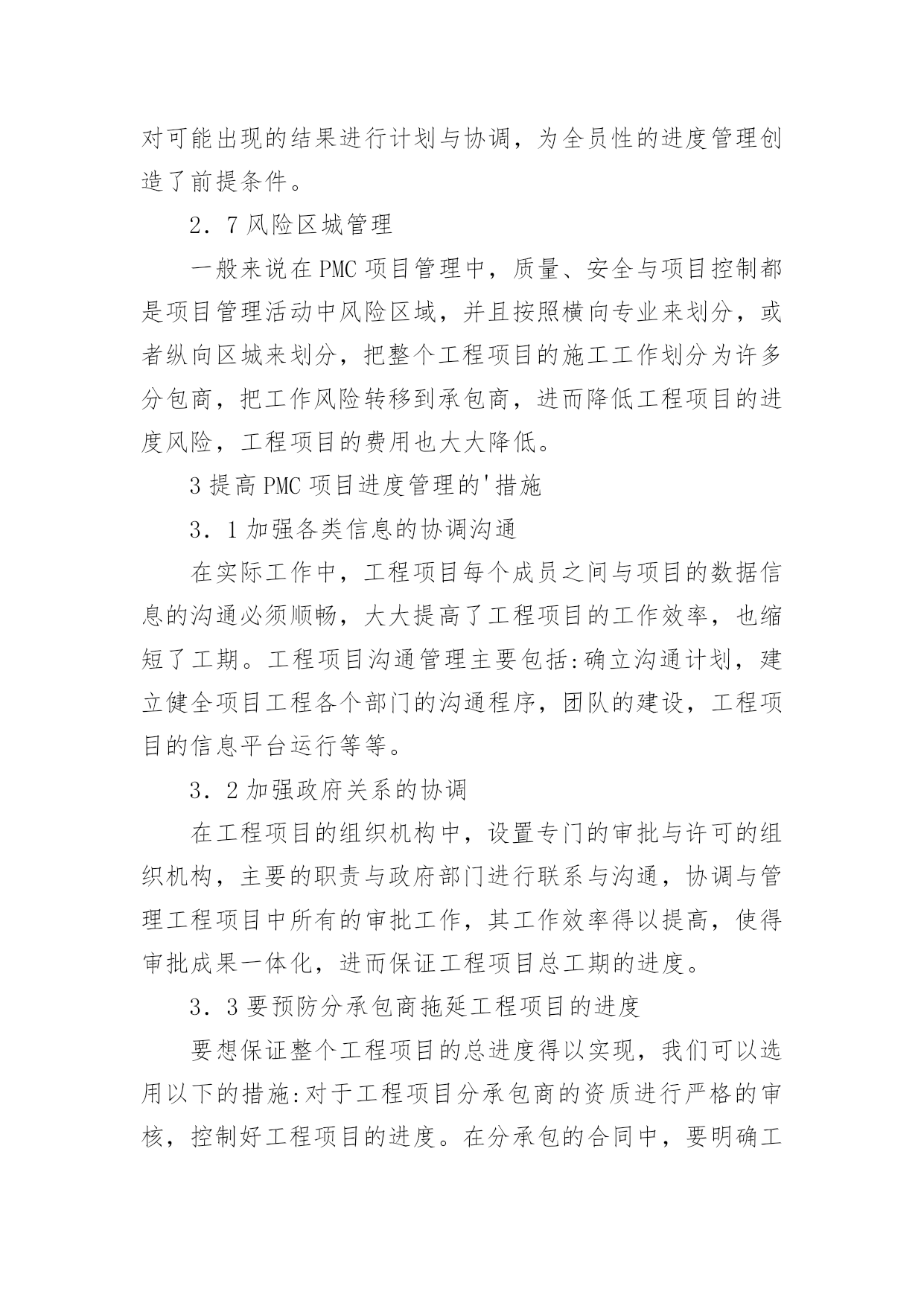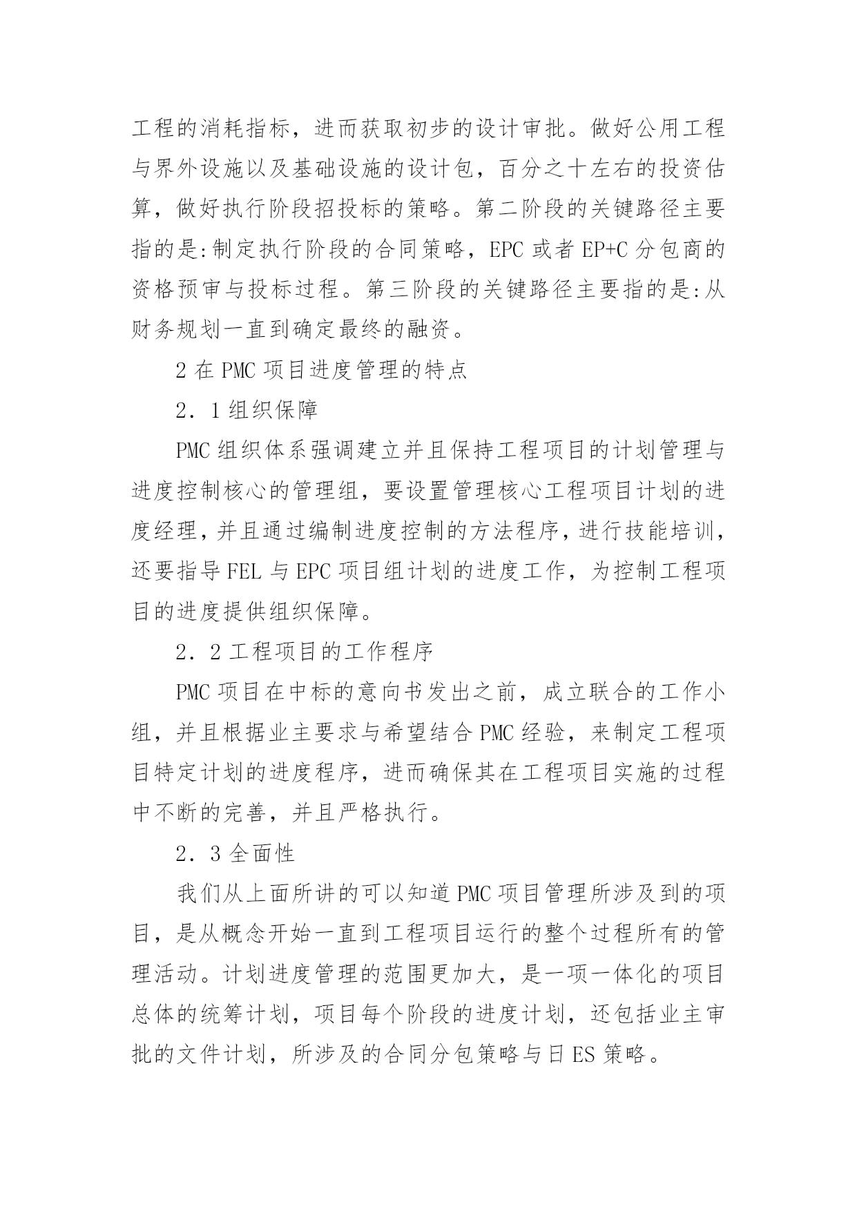项目进度管理论文【通用】项目进度管理论文无论是在学校还是在社会中,大家都有写论文的经历,对论文很是熟悉吧,论文写作的过程是人们获得直接经验的过程。相信写论文是一个让许多人都头痛的问题,以下是小编为大家收集的项目进度管理论文,希望能够帮助到大家。项目进度管理论文11PMC项目管理主要的工作内容与阶段划分1.1PMC项目管理主要的工作内容PMC项目管理主要是从工程项目最开始的概念到最后的建成乃至试运行,一直到业主接收的整个过程所有的管理活动。随着我国中外合资工程项目的不断增加,合作方一般会要求把PMC这种国际通行的管理模式应用到工程项目中,并且向金融机构提出要求,业主聘用专业PMC承包商越来越多,业主可以聘用PMC承包商来管理工程项目,进而确保工程项目的质量、进度与投资,并且保证建成项目的安全可靠。1.2PMC项目管理的阶段划分在每个工程项目管理中,每个阶段都有关键的管理活动,都有管理上的重点,也叫做关键活动。在关键路径上进行活动时控制工程进度的重点,例如:某项目PMC在统筹计划中最主要第一阶段的关键路径就是:授予工程基础的设计合同,接收专利的技术包。为专利商与基础设计的分包商提供公用工程的消耗指标,进而获取初步的设计审批。做好公用工程与界外设施以及基础设施的设计包,百分之十左右的投资估算,做好执行阶段招投标的策略。第二阶段的关键路径主要指的是:制定执行阶段的合同策略,EPC或者EP+C分包商的资格预审与投标过程。第三阶段的关键路径主要指的是:从财务规划一直到确定最终的融资。2在PMC项目进度管理的特点2.1组织保障PMC组织体系强调建立并且保持工程项目的计划管理与进度控制核心的管理组,要设置管理核心工程项目计划的进度经理,并且通过编制进度控制的方法程序,进行技能培训,还要指导FEL与EPC项目组计划的进度工作,为控制工程项目的进度提供组织保障。2.2工程项目的工作程序PMC项目在中标的意向书发出之前,成立联合的工作小组,并且根据业主要求与希望结合PMC经验,来制定工程项目特定计划的进度程序,进而确保其在工程项目实施的过程中不断的完善,并且严格执行。2.3全面性我们从上面所讲的可以知道PMC项目管理所涉及到的项目,是从概念开始一直到工程项目运行的整个过程所有的管理活动。计划进度管理的范围更加大,是一项一体化的项目总体的统筹计划,项目每个阶段的进度计划,还包括业主审批的文件计划,所涉及的合同分包策略与日ES策略。2.4整体性在一个工程项目建设的寿命周期内,每个阶段都有着一定的规律,也存在着一定的内在联系。PMC项目管理可以通过系统的组织与计划,使得每个相关活动有序合理的交叉,在每个阶段按照工程项目的发展一环扣着一环的进行,每个阶段的工作要做的更加细化,工期缩短了不少,工程进度进步了不少。2.5计划分级管理一般工程项目的进度与计划主要是由各EPC的分承包商来编创与控制的,而PMC项目管理中一级和二级的计划主要是由PMC核心的控制组来管理和控制。在这两级的计划内所涉及到的任何建议修改和变动都必须向PMC报送批准,制造商与分承包商服从由PMC确定的工程项目一级与二级计划前提之下,编制与执行控制计划(也就是三级计划)与作业计划(也就是四级计划)。通过计划分级管理,不仅仅对整个工程项目进行统筹管理,并且使得整个工程项目协调一致,PMC计划进度方面的风险也大大降低了。2.6计划与协调的重要性在PMC项目管理的思路中,计划和协调以及进度三者的关系可以这样表示:计划占60%,协调占25%,进度占5%。由此我们可以看出计划的重要性,也就是说计划就是把工作范围使用时间与资金表示出来。就是把所有的管理活动进行分析控制与预测。沟通的前提要有一个好的管理理念,要综合各个方面的建议、经验、信息,并且和相关人员来讨论问题,对可能出现的结果进行计划与协调,为全员性的进度管理创造了前提条件。2.7风险区城管理一般来说在PMC项目管理中,质量、安全与项目控制都是项目管理活动中风险区域,并且按照横向专业来划分,或者纵向区城来划分,把整个工程项目的施工工作划分为许多分包商,把工作风险转移到承包商,进而降低工程项目的进度风险,工程项目的费用也大大降低。3提高PMC项目进度管理的'措施3.1加强各类信息的协调沟通在实际工作中,工程项目每个成员之间与项目的数据信息的沟通必须顺畅,大大提高了工程项目的工作效率,也缩短了工期。工程项目沟通管理主要包括:确立沟通计划,建立健全项目工程各个部门的沟通程序,团队的建设,工程项目的信息平台运行等等。3.2加强政府关系的协调在工程项目的组织机构中,设置专门的审批与许可的组织机构,主要的职责与政府部门进行联系与沟通,协调与管理工程项目中所有的审批工作,其工作效率得以提高,使得审批成果一体化,进而保证工程项目总工期的进度。3.3要预防分承包商