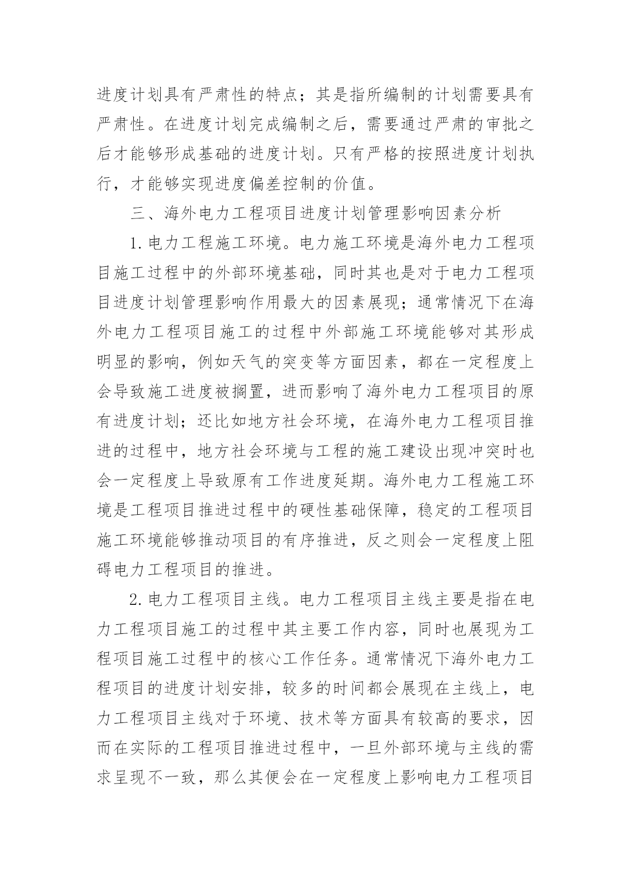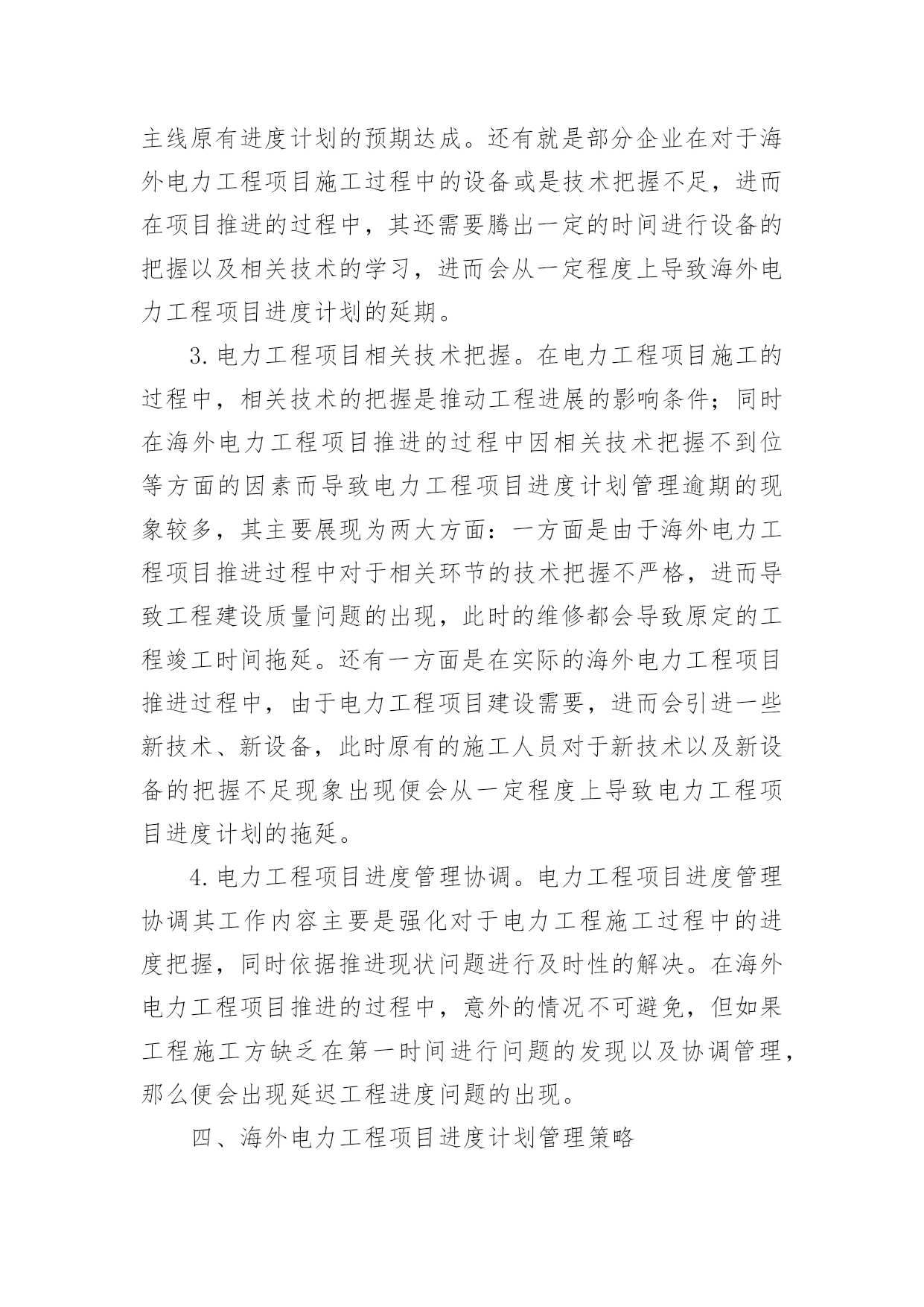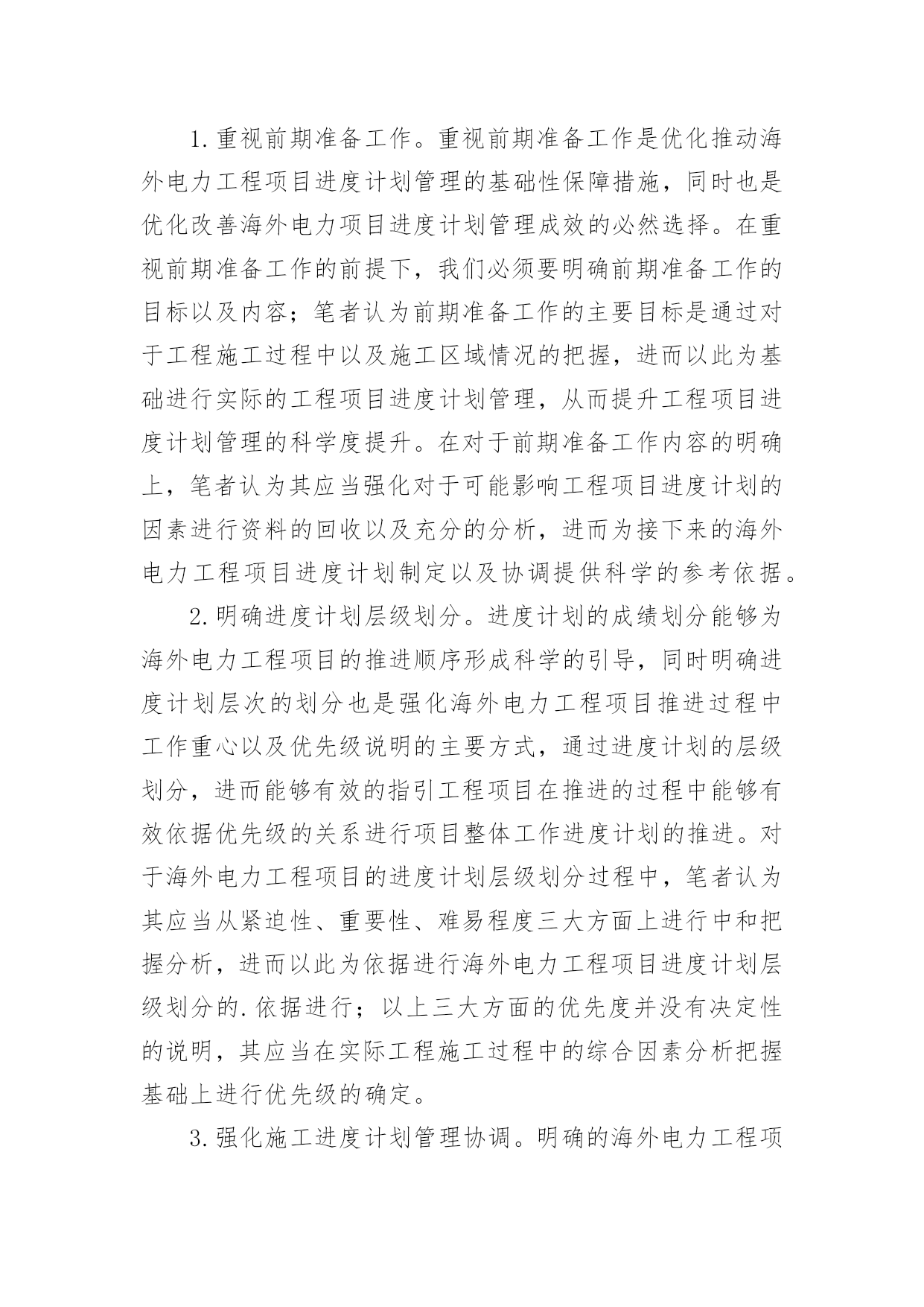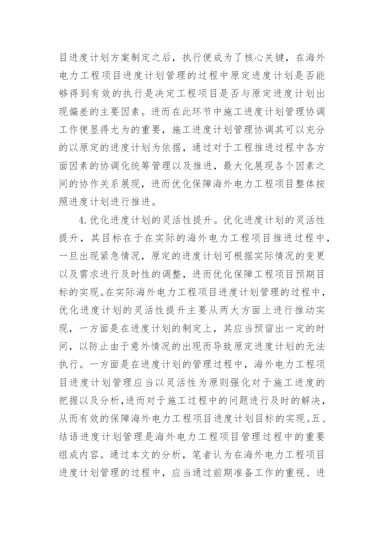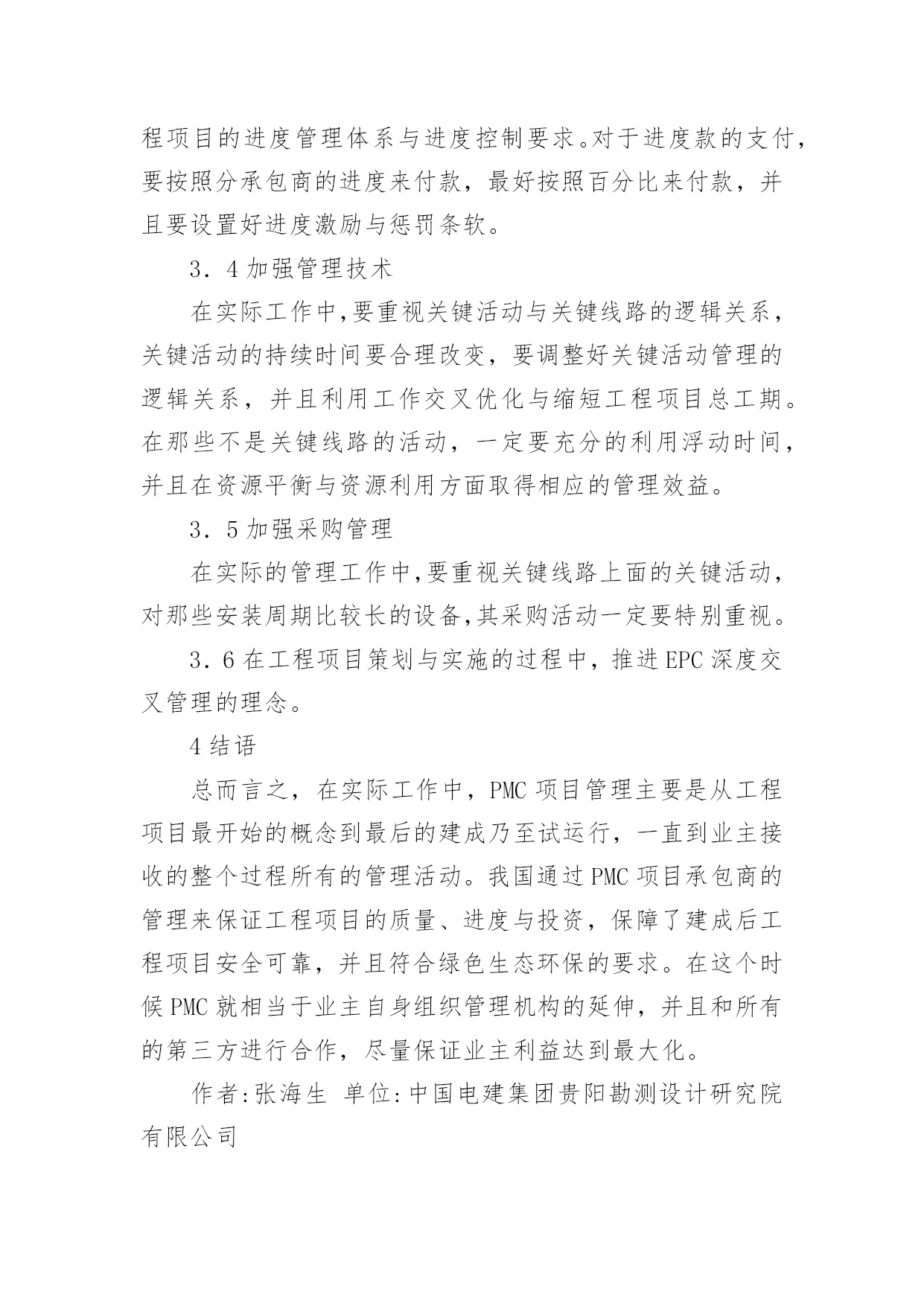 项目进度管理论文【通用】项目进度管理论文无论是在学校还是在社会中,大家都有写论文的经历,对论文很是熟悉吧,论文写作的过程是人们获得直接经验的过程。相信写论文是一个让许多人都头痛的问题,以下是小编为大家收集的项目进度管理论文,希望能够帮助到大家。项目进度管理论文11PMC项目管理主要的工作内容与阶段划分1.1PMC项目管理主要的工作内容PMC项目管理主要是从工程项目最开始的概念到最后的建成乃至试运行,一直到业主接收的整个过程所有的管理活动。随着我国中外合资工程项目的不断增加,合作方一般会要求把PMC这种国际通行的管理模式应用到工程项目中,并且向金融机构提出要求,业主聘用专业PMC承包商越来越多,业主可以聘用PMC承包商来管理工程项目,进而确保工程项目的质量、进度与投资,并且保证建成项目的安全可靠。1.2PMC项目管理的阶段划分在每个工程项目管理中,每个阶段都有关键的管理活动,都有管理上的重点,也叫做关键活动。在关键路径上进行活动时控制工程进度的重点,例如:某项目PMC在统筹计划中最主要第一阶段的关键路径就是:授予工程基础的设计合同,接收专利的技术包。为专利商与基础设计的分包商提供公用工程的消耗指标,进而获取初步的设计审批。做好公用工程与界外设施以及基础设施的设计包,百分之十左右的投资估算,做好执行阶段招投标的策略。第二阶段的关键路径主要指的是:制定执行阶段的合同策略,EPC或者EP+C分包商的资格预审与投标过程。第三阶段的关键路径主要指的是:从财务规划一直到确定最终的融资。2在PMC项目进度管理的特点2.1组织保障PMC组织体系强调建立并且保持工程项目的计划管理与进度控制核心的管理组,要设置管理核心工程项目计划的进度经理,并且通过编制进度控制的方法程序,进行技能培训,还要指导FEL与EPC项目组计划的进度工作,为控制工程项目的进度提供组织保障。2.2工程项目的工作程序PMC项目在中标的意向书发出之前,成立联合的工作小组,并且根据业主要求与希望结合PMC经验,来制定工程项目特定计划的进度程序,进而确保其在工程项目实施的过程中不断的完善,并且严格执行。2.3全面性我们从上面所讲的可以知道PMC项目管理所涉及到的项目,是从概念开始一直到工程项目运行的整个过程所有的管理活动。计划进度管理的范围更加大,是一项一体化的项目总体的统筹计划,项目每个阶段的进度计划,还包括业主审批的文件计划,所涉及的合同分包策略与日ES策略。2.4整体性在一个工程项目建设的寿命周期内,每个阶段都有着一定的规律,也存在着一定的内在联系。PMC项目管理可以通过系统的组织与计划,使得每个相关活动有序合理的交叉,在每个阶段按照工程项目的发展一环扣着一环的进行,每个阶段的工作要做的更加细化,工期缩短了不少,工程进度进步了不少。2.5计划分级管理一般工程项目的进度与计划主要是由各EPC的分承包商来编创与控制的,而PMC项目管理中一级和二级的计划主要是由PMC核心的控制组来管理和控制。在这两级的计划内所涉及到的任何建议修改和变动都必须向PMC报送批准,制造商与分承包商服从由PMC确定的工程项目一级与二级计划前提之下,编制与执行控制计划(也就是三级计划)与作业计划(也就是四级计划)。通过计划分级管理,不仅仅对整个工程项目进行统筹管理,并且使得整个工程项目协调一致,PMC计划进度方面的风险也大大降低了。2.6计划与协调的重要性在PMC项目管理的思路中,计划和协调以及进度三者的关系可以这样表示:计划占60%,协调占25%,进度占5%。由此我们可以看出计划的重要性,也就是说计划就是把工作范围使用时间与资金表示出来。就是把所有的管理活动进行分析控制与预测。沟通的前提要有一个好的管理理念,要综合各个方面的建议、经验、信息,并且和相关人员来讨论问题,对可能出现的结果进行计划与协调,为全员性的进度管理创造了前提条件。2.7风险区城管理一般来说在PMC项目管理中,质量、安全与项目控制都是项目管理活动中风险区域,并且按照横向专业来划分,或者纵向区城来划分,把整个工程项目的施工工作划分为许多分包商,把工作风险转移到承包商,进而降低工程项目的进度风险,工程项目的费用也大大降低。3提高PMC项目进度管理的'措施3.1加强各类信息的协调沟通在实际工作中,工程项目每个成员之间与项目的数据信息的沟通必须顺畅,大大提高了工程项目的工作效率,也缩短了工期。工程项目沟通管理主要包括:确立沟通计划,建立健全项目工程各个部门的沟通程序,团队的建设,工程项目的信息平台运行等等。3.2加强政府关系的协调在工程项目的组织机构中,设置专门的审批与许可的组织机构,主要的职责与政府部门进行联系与沟通,协调与管理工程项目中所有的审批工作,其工作效率得以提高,使得审批成果一体化,进而保证工程项目总工期的进度。3.3要预防分承包商