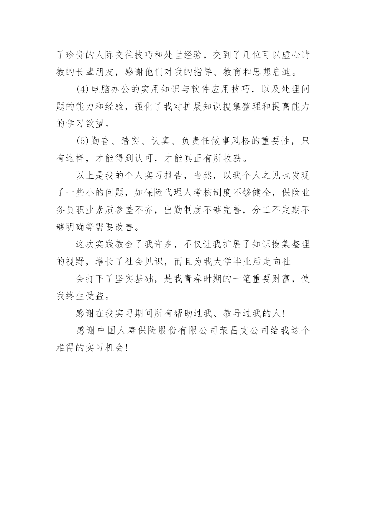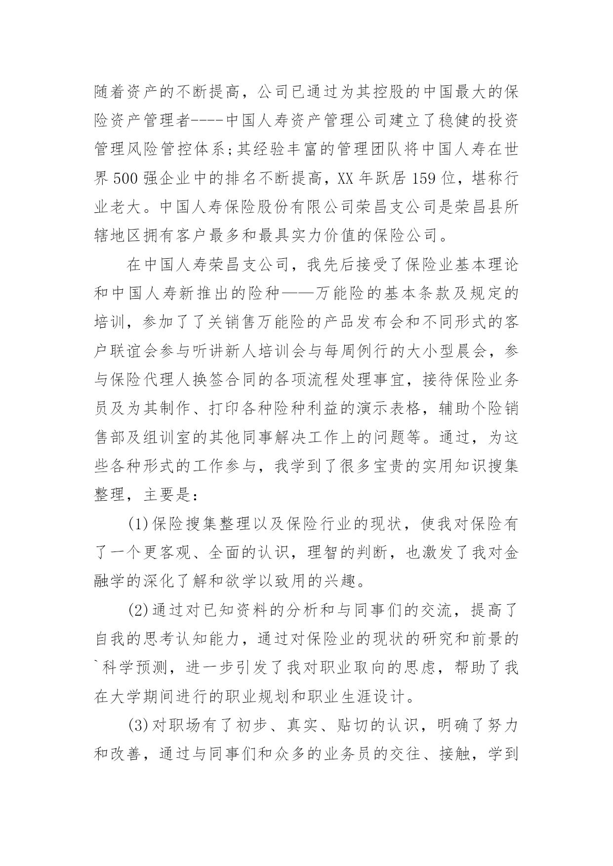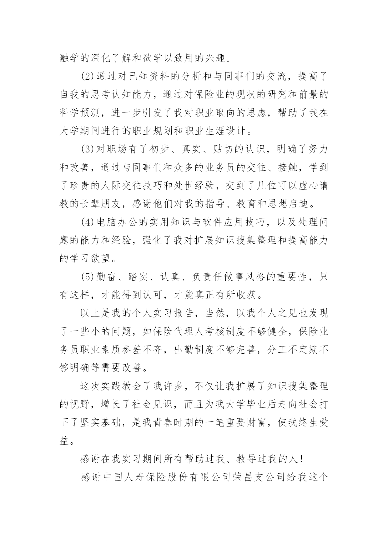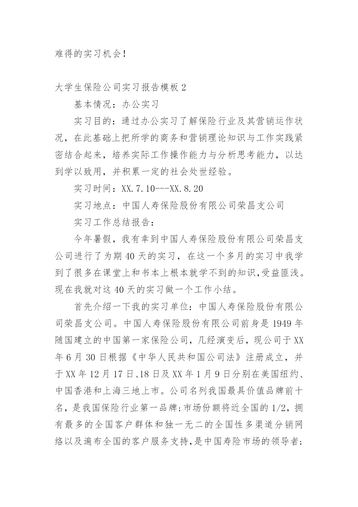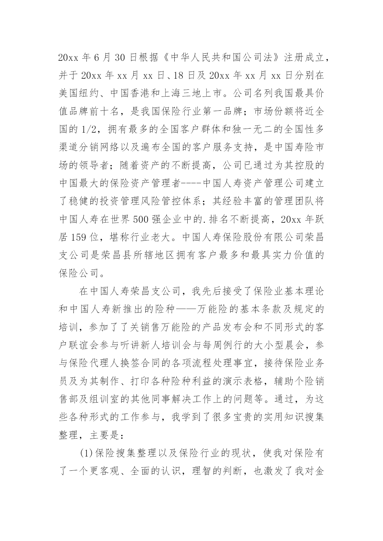 大学生保险公司实习报告大学生保险公司实习报告模板在不断进步的时代,需要使用报告的情况越来越多,其在写作上有一定的技巧。我们应当如何写报告呢?下面是小编为大家整理的大学生保险公司实习报告模板,仅供参考,欢迎大家阅读。大学生保险公司实习报告模板1实习目的:通过办公实习了解保险行业及其营销运作状况,在此基础上把所学的商务和营销理论知识与工作实践紧密结合起来,培养实际工作操作能力与分析思考能力,以达到学以致用,并积累一定的社会处世经验。实习时间:20xx年xx月xx日---20xx年xx月xx日实习地点:xxxx公司实习工作总结报告:今年暑假,我有幸到中国人寿保险股份有限公司荣昌支公司进行了为期40天的实习,在这一个多月的实习中我学到了很多在课堂上和书本上根本就学不到的知识,受益匪浅。现在我就对这40天的实习做一个工作小结。首先介绍一下我的实习单位:中国人寿保险股份有限公司荣昌支公司。中国人寿保险股份有限公司前身是1949年随国建立的中国第一家保险公司,几经演变后,现公司于20xx年6月30日根据《中华人民共和国公司法》注册成立,并于20xx年xx月xx日、18日及20xx年xx月xx日分别在美国纽约、中国香港和上海三地上市。公司名列我国最具价值品牌前十名,是我国保险行业第一品牌;市场份额将近全国的1/2,拥有最多的全国客户群体和独一无二的全国性多渠道分销网络以及遍布全国的客户服务支持,是中国寿险市场的领导者;随着资产的不断提高,公司已通过为其控股的中国最大的保险资产管理者----中国人寿资产管理公司建立了稳健的投资管理风险管控体系;其经验丰富的管理团队将中国人寿在世界500强企业中的.排名不断提高,20xx年跃居159位,堪称行业老大。中国人寿保险股份有限公司荣昌支公司是荣昌县所辖地区拥有客户最多和最具实力价值的保险公司。在中国人寿荣昌支公司,我先后接受了保险业基本理论和中国人寿新推出的险种——万能险的基本条款及规定的培训,参加了了关销售万能险的产品发布会和不同形式的客户联谊会参与听讲新人培训会与每周例行的大小型晨会,参与保险代理人换签合同的各项流程处理事宜,接待保险业务员及为其制作、打印各种险种利益的演示表格,辅助个险销售部及组训室的其他同事解决工作上的问题等。通过,为这些各种形式的工作参与,我学到了很多宝贵的实用知识搜集整理,主要是:(1)保险搜集整理以及保险行业的现状,使我对保险有了一个更客观、全面的认识,理智的判断,也激发了我对金融学的深化了解和欲学以致用的兴趣。(2)通过对已知资料的分析和与同事们的交流,提高了自我的思考认知能力,通过对保险业的现状的研究和前景的科学预测,进一步引发了我对职业取向的思虑,帮助了我在大学期间进行的职业规划和职业生涯设计。(3)对职场有了初步、真实、贴切的认识,明确了努力和改善,通过与同事们和众多的业务员的交往、接触,学到了珍贵的人际交往技巧和处世经验,交到了几位可以虚心请教的长辈朋友,感谢他们对我的指导、教育和思想启迪。(4)电脑办公的实用知识与软件应用技巧,以及处理问题的能力和经验,强化了我对扩展知识搜集整理和提高能力的学习欲望。(5)勤奋、踏实、认真、负责任做事风格的重要性,只有这样,才能得到认可,才能真正有所收获。以上是我的个人实习报告,当然,以我个人之见也发现了一些小的问题,如保险代理人考核制度不够健全,保险业务员职业素质参差不齐,出勤制度不够完善,分工不定期不够明确等需要改善。这次实践教会了我许多,不仅让我扩展了知识搜集整理的视野,增长了社会见识,而且为我大学毕业后走向社会打下了坚实基础,是我青春时期的一笔重要财富,使我终生受益。感谢在我实习期间所有帮助过我、教导过我的人!感谢中国人寿保险股份有限公司荣昌支公司给我这个难得的实习机会!大学生保险公司实习报告模板2基本情况:办公实习实习目的:通过办公实习了解保险行业及其营销运作状况,在此基础上把所学的商务和营销理论知识与工作实践紧密结合起来,培养实际工作操作能力与分析思考能力,以达到学以致用,并积累一定的社会处世经验。实习时间:XX.7.10---XX.8.20实习地点:中国人寿保险股份有限公司荣昌支公司实习工作总结报告:今年暑假,我有幸到中国人寿保险股份有限公司荣昌支公司进行了为期40天的实习,在这一个多月的实习中我学到了很多在课堂上和书本上根本就学不到的知识,受益匪浅。现在我就对这40天的实习做一个工作小结。首先介绍一下我的实习单位:中国人寿保险股份有限公司荣昌支公司。中国人寿保险股份有限公司前身是1949年随国建立的中国第一家保险公司,几经演变后,现公司于XX年6月30日根据《中华人民共和国公司法》注册成立,并于XX年12月17日、18日及XX年1月9日分别在美国纽约、中国香港和上海三地上市。公司名列我国最具价值品牌前十名,是