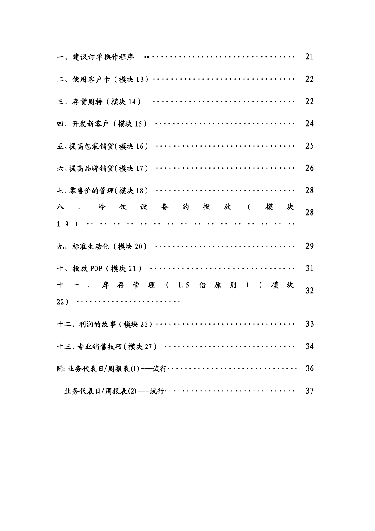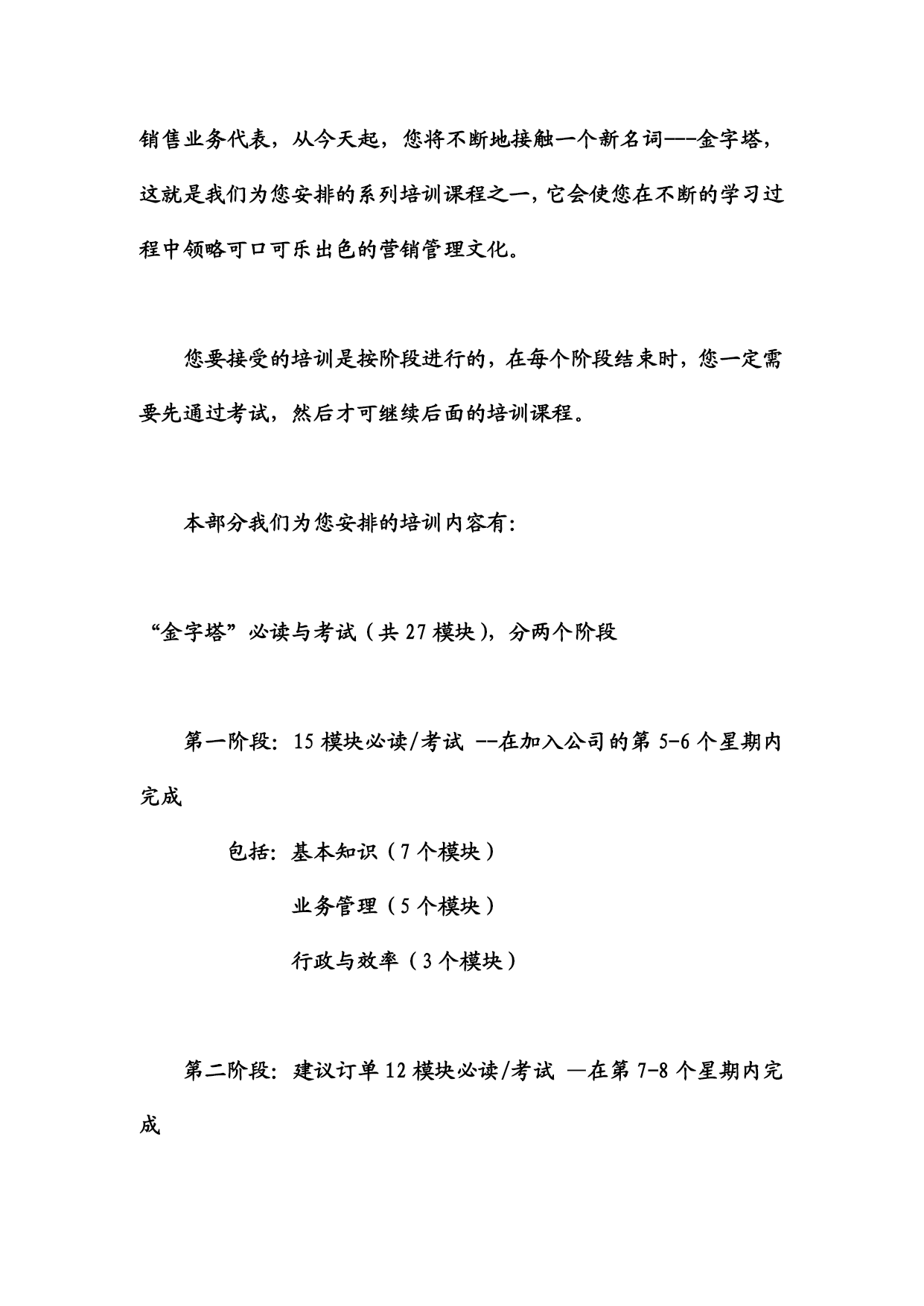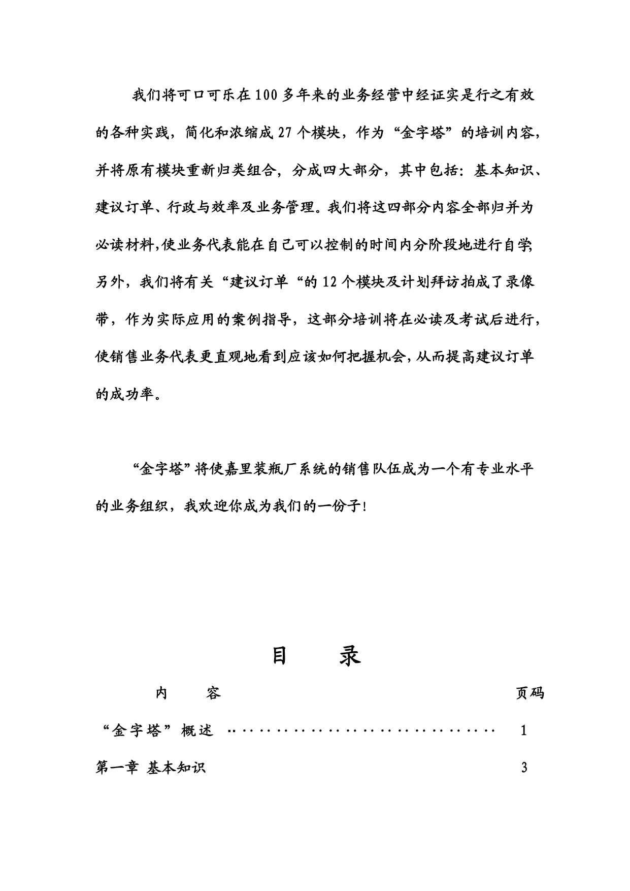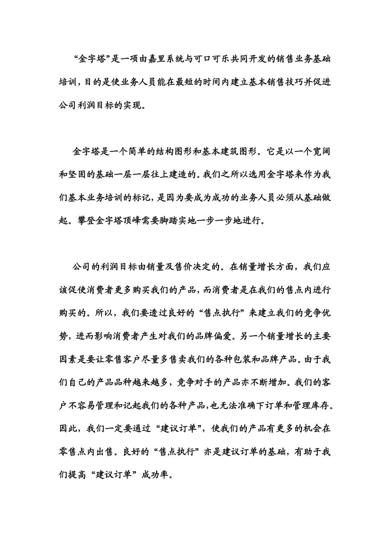 可口可乐销售代表金字塔培训教程金字塔销售业务代表必读第3版前言欢迎您加入可口可乐大家庭并成为可口可乐系统销售队伍中的一员!为了使您更充分地了解本职工作并能成为一名专业而又成功的销售业务代表,从今天起,您将不断地接触一个新名词---金字塔,这就是我们为您安排的系列培训课程之一,它会使您在不断的学习过程中领略可口可乐出色的营销管理文化。您要接受的培训是按阶段进行的,在每个阶段结束时,您一定需要先通过考试,然后才可继续后面的培训课程。本部分我们为您安排的培训内容有:“金字塔”必读与考试(共27模块),分两个阶段第一阶段:15模块必读/考试--在加入公司的第5-6个星期内完成包括:基本知识(7个模块)业务管理(5个模块)行政与效率(3个模块)第二阶段:建议订单12模块必读/考试—在第7-8个星期内完成在必读与考试结束后,我们还会为您安排提高建议订单的拜访成功率培训(结合录像带教学)--在加入公司的第9个星期完成在学习必读部分时,您若有不明白之处,请随时与培训经理或销售培员联络。同时,我们对所有的业务人员都进行MOFF检查,来衡量售点的执行状况,寻找改进机会。对你们来讲,更重要的一点是促使你们快速将所学到的知识应用到实践中去,提高销售技巧,成为训练有素的专业人员。“金字塔”是一项由嘉里系统与可口可乐共同开发的销售业务基础培训,目的是使业务人员能在最短的时间内建立基本销售技巧并促进公司利润目标的实现。金字塔是一个简单的结构图形和基本建筑图形。它是以一个宽阔和坚固的基础一层一层往上建造的。我们之所以选用金字塔来作为我们基本业务培训的标记,是因为要成为成功的业务人员必须从基础做起。攀登金字塔顶峰需要脚踏实地一步一步地进行。公司的利润目标由销量及售价决定的。在销量增长方面,我们应该促使消费者更多购买我们的产品,而消费者是在我们的售点内进行购买的。所以,我们要透过良好的“售点执行”来建立我们的竞争优势,进而影响消费者产生对我们的品牌偏爱。另一个销量增长的主要因素是要让零售客户尽量多售卖我们的各种包装和品牌产品。由于我们自己的产品品种越来越多,竞争对手的产品亦不断增加。我们的客户不容易管理和记起我们的各种产品,也无法准确下订单和管理库存。因此,我们一定要通过“建议订单”,使我们的产品有更多的机会在零售点内出售。良好的“售点执行”亦是建议订单的基础,有助于我们提高“建议订单”成功率。我们将可口可乐在100多年来的业务经营中经证实是行之有效的各种实践,简化和浓缩成27个模块,作为“金字塔”的培训内容,并将原有模块重新归类组合,分成四大部分,其中包括:基本知识、建议订单、行政与效率及业务管理。我们将这四部分内容全部归并为必读材料,使业务代表能在自己可以控制的时间内分阶段地进行自学;另外,我们将有关“建议订单“的12个模块及计划拜访拍成了录像带,作为实际应用的案例指导,这部分培训将在必读及考试后进行,使销售业务代表更直观地看到应该如何把握机会,从而提高建议订单的成功率。“金字塔”将使嘉里装瓶厂系统的销售队伍成为一个有专业水平的业务组织,我欢迎你成为我们的一份子!目录内容页码“金字塔”概述‥¨¨¨¨¨¨¨¨¨¨¨¨¨¨¨1第一章基本知识3一、销售业务代表的工作职责(模块1)‥¨¨¨¨¨¨¨¨¨¨¨¨4二、关键指标(模块2)‥¨¨¨¨¨¨¨¨¨¨¨¨¨¨¨4三、确立和达到工作目标(模块3)¨¨¨¨¨¨¨¨¨¨¨¨¨5四、成功三要素(模块4)‥¨¨¨¨¨¨¨¨¨¨¨¨¨¨¨6五、业务人员晋升进程(模块5)¨¨¨¨¨¨¨¨¨¨¨¨¨¨¨7六、沟通技巧(模块11)‥¨¨¨¨¨¨¨¨¨¨¨¨¨¨¨¨7七、良好的习惯(模块10)¨¨¨¨¨¨¨¨¨¨¨¨¨¨¨¨8八、计划拜访(模块12)‥¨¨¨¨¨¨¨¨¨¨¨¨¨¨¨¨10第二章行政与效率12一、如何填写业务人员周报告(模块7)¨¨¨¨¨¨¨¨¨¨¨¨13二、有效的时间管理(模块9)¨¨¨¨¨¨¨¨¨¨¨¨¨¨¨¨13三、汇报竞争对手活动(模块24)¨¨¨¨¨¨¨¨¨¨¨¨¨¨¨15第三章业务管理16一、跟路线(模块6)‥¨¨¨¨¨¨¨¨¨¨¨¨¨¨¨¨17二、销售拜访行程的管理(模块8)¨¨¨¨¨¨¨¨¨¨¨¨¨¨¨17三、售点内的促销实施(模块25)¨¨¨¨¨¨¨¨¨¨¨¨¨¨18四、提高现有售点的销量(模块26)‥¨¨¨¨¨¨¨¨¨¨¨¨¨19第四章建议订单20一、建议订单操作程序‥¨¨¨¨¨¨¨¨¨¨¨¨¨¨¨¨21二、使用客户卡(模块13)¨¨¨¨¨¨¨¨¨¨¨¨¨¨¨¨22三、存货周转(模块14)¨¨¨¨¨¨¨¨¨¨¨¨¨¨¨¨22四、开发新客户(模块15)¨¨¨¨¨¨¨¨¨¨¨¨¨¨