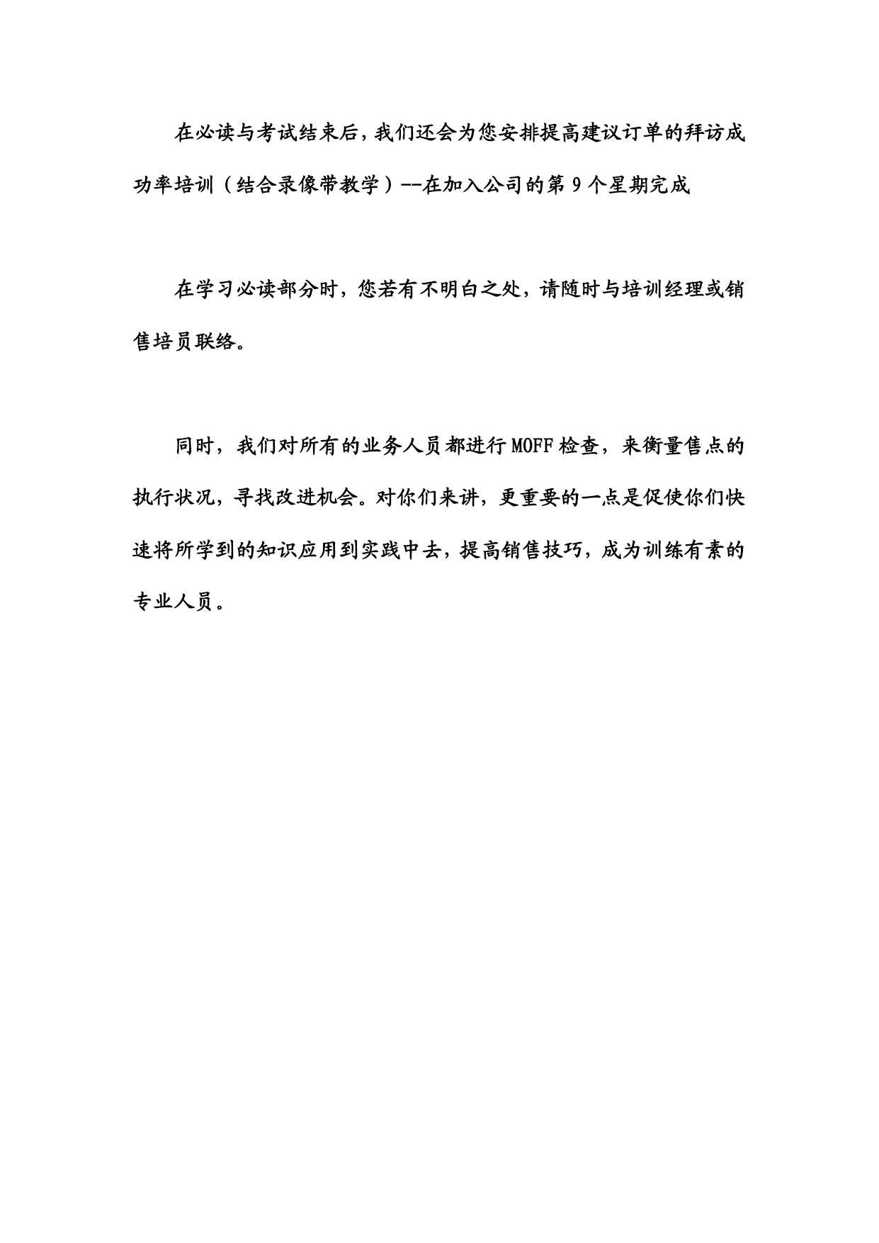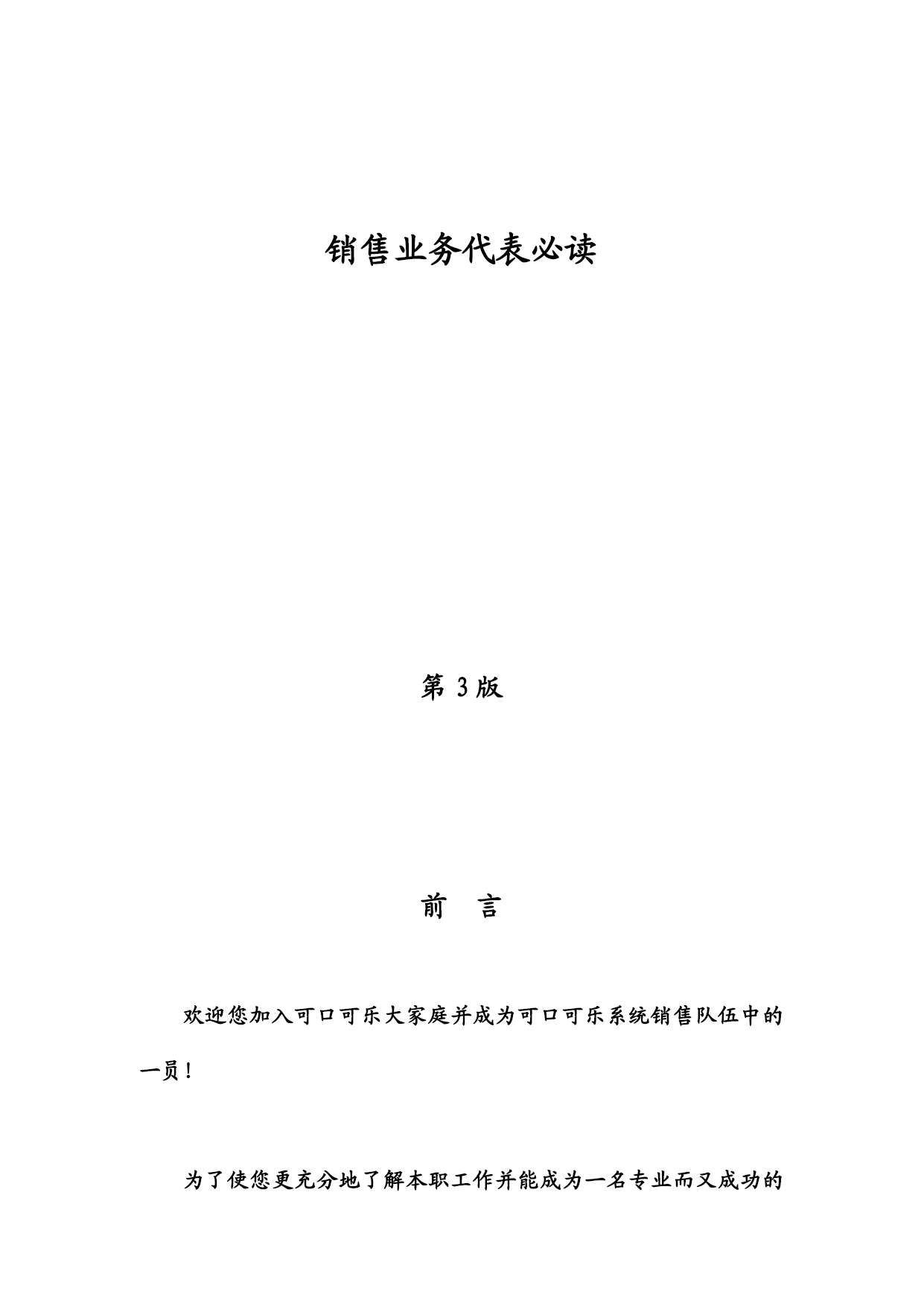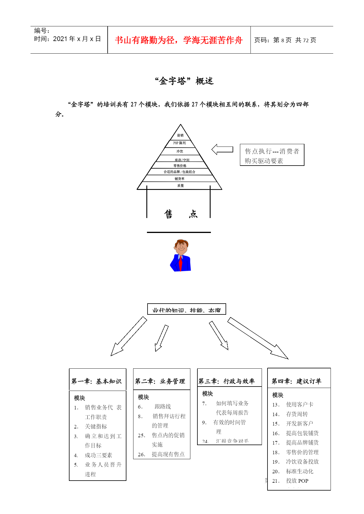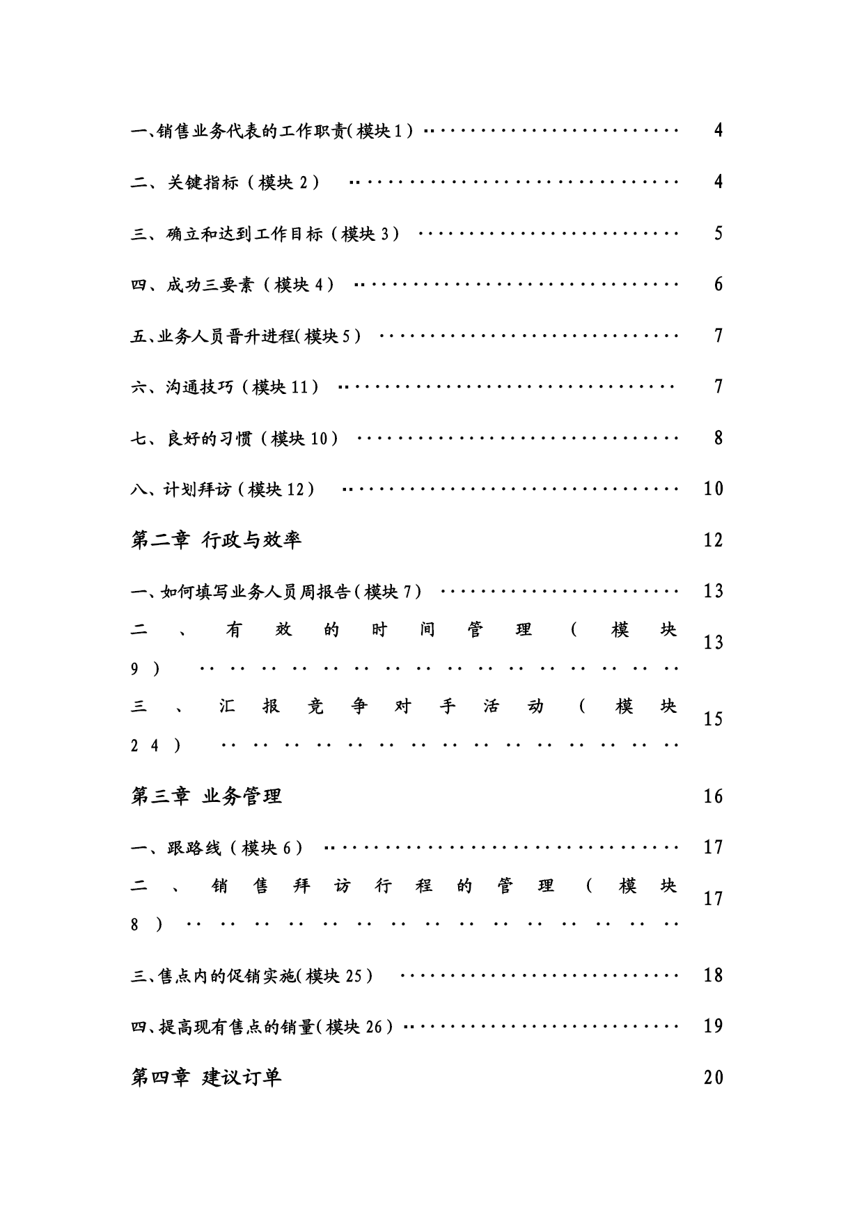 可口可乐销售代表金字塔培训教程金字塔销售业务代表必读第3版前言欢迎您加入可口可乐大家庭并成为可口可乐系统销售队伍中的一员!为了使您更充分地了解本职工作并能成为一名专业而又成功的销售业务代表,从今天起,您将不断地接触一个新名词---金字塔,这就是我们为您安排的系列培训课程之一,它会使您在不断的学习过程中领略可口可乐出色的营销管理文化。您要接受的培训是按阶段进行的,在每个阶段结束时,您一定需要先通过考试,然后才可继续后面的培训课程。本部分我们为您安排的培训内容有:“金字塔”必读与考试(共27模块),分两个阶段第一阶段:15模块必读/考试--在加入公司的第5-6个星期内完成包括:基本知识(7个模块)业务管理(5个模块)行政与效率(3个模块)第二阶段:建议订单12模块必读/考试—在第7-8个星期内完成在必读与考试结束后,我们还会为您安排提高建议订单的拜访成功率培训(结合录像带教学)--在加入公司的第9个星期完成在学习必读部分时,您若有不明白之处,请随时与培训经理或销售培员联络。同时,我们对所有的业务人员都进行MOFF检查,来衡量售点的执行状况,寻找改进机会。对你们来讲,更重要的一点是促使你们快速将所学到的知识应用到实践中去,提高销售技巧,成为训练有素的专业人员。“金字塔”是一项由嘉里系统与可口可乐共同开发的销售业务基础培训,目的是使业务人员能在最短的时间内建立基本销售技巧并促进公司利润目标的实现。金字塔是一个简单的结构图形和基本建筑图形。它是以一个宽阔和坚固的基础一层一层往上建造的。我们之所以选用金字塔来作为我们基本业务培训的标记,是因为要成为成功的业务人员必须从基础做起。攀登金字塔顶峰需要脚踏实地一步一步地进行。公司的利润目标由销量及售价决定的。在销量增长方面,我们应该促使消费者更多购买我们的产品,而消费者是在我们的售点内进行购买的。所以,我们要透过良好的“售点执行”来建立我们的竞争优势,进而影响消费者产生对我们的品牌偏爱。另一个销量增长的主要因素是要让零售客户尽量多售卖我们的各种包装和品牌产品。由于我们自己的产品品种越来越多,竞争对手的产品亦不断增加。我们的客户不容易管理和记起我们的各种产品,也无法准确下订单和管理库存。因此,我们一定要通过“建议订单”,使我们的产品有更多的机会在零售点内出售。良好的“售点执行”亦是建议订单的基础,有助于我们提高“建议订单”成功率。我们将可口可乐在100多年来的业务经营中经证实是行之有效的各种实践,简化和浓缩成27个模块,作为“金字塔”的培训内容,并将原有模块重新归类组合,分成四大部分,其中包括:基本知识、建议订单、行政与效率及业务管理。我们将这四部分内容全部归并为必读材料,使业务代表能在自己可以控制的时间内分阶段地进行自学;另外,我们将有关“建议订单“的12个模块及计划拜访拍成了录像带,作为实际应用的案例指导,这部分培训将在必读及考试后进行,使销售业务代表更直观地看到应该如何把握机会,从而提高建议订单的成功率。“金字塔”将使嘉里装瓶厂系统的销售队伍成为一个有专业水平的业务组织,我欢迎你成为我们的一份子!目录内容页码“金字塔”概述‥¨¨¨¨¨¨¨¨¨¨¨¨¨¨¨1第一章基本知识3一、销售业务代表的工作职责(模块1)‥¨¨¨¨¨¨¨¨¨¨¨¨4二、关键指标(模块2)‥¨¨¨¨¨¨¨¨¨¨¨¨¨¨¨4三、确立和达到工作目标(模块3)¨¨¨¨¨¨¨¨¨¨¨¨¨5四、成功三要素(模块4)‥¨¨¨¨¨¨¨¨¨¨¨¨¨¨¨6五、业务人员晋升进程(模块5)¨¨¨¨¨¨¨¨¨¨¨¨¨¨¨7六、沟通技巧(模块11)‥¨¨¨¨¨¨¨¨¨¨¨¨¨¨¨¨7七、良好的习惯(模块10)¨¨¨¨¨¨¨¨¨¨¨¨¨¨¨¨8八、计划拜访(模块12)‥¨¨¨¨¨¨¨¨¨¨¨¨¨¨¨¨10第二章行政与效率12一、如何填写业务人员周报告(模块7)¨¨¨¨¨¨¨¨¨¨¨¨13二、有效的时间管理(模块9)¨¨¨¨¨¨¨¨¨¨¨¨¨¨¨¨13三、汇报竞争对手活动(模块24)¨¨¨¨¨¨¨¨¨¨¨¨¨¨¨15第三章业务管理16一、跟路线(模块6)‥¨¨¨¨¨¨¨¨¨¨¨¨¨¨¨¨17二、销售拜访行程的管理(模块8)¨¨¨¨¨¨¨¨¨¨¨¨¨¨¨17三、售点内的促销实施(模块25)¨¨¨¨¨¨¨¨¨¨¨¨¨¨18四、提高现有售点的销量(模块26)‥¨¨¨¨¨¨¨¨¨¨¨¨¨19第四章建议订单20一、建议订单操作程序‥¨¨¨¨¨¨¨¨¨¨¨¨¨¨¨¨21二、使用客户卡(模块13)¨¨¨¨¨¨¨¨¨¨¨¨¨¨¨¨22三、存货周转(模块14)¨¨¨¨¨¨¨¨¨¨¨¨¨¨¨¨22四、开发新客户(模块15)¨¨¨¨¨¨¨¨¨¨¨¨¨¨