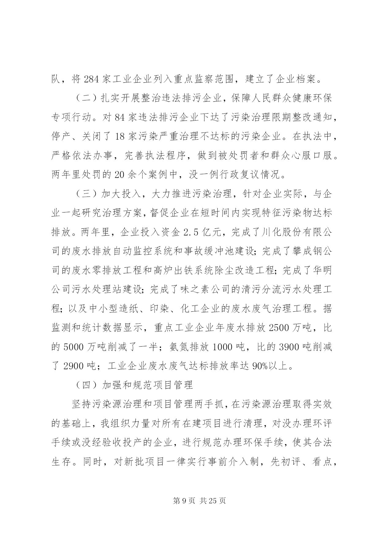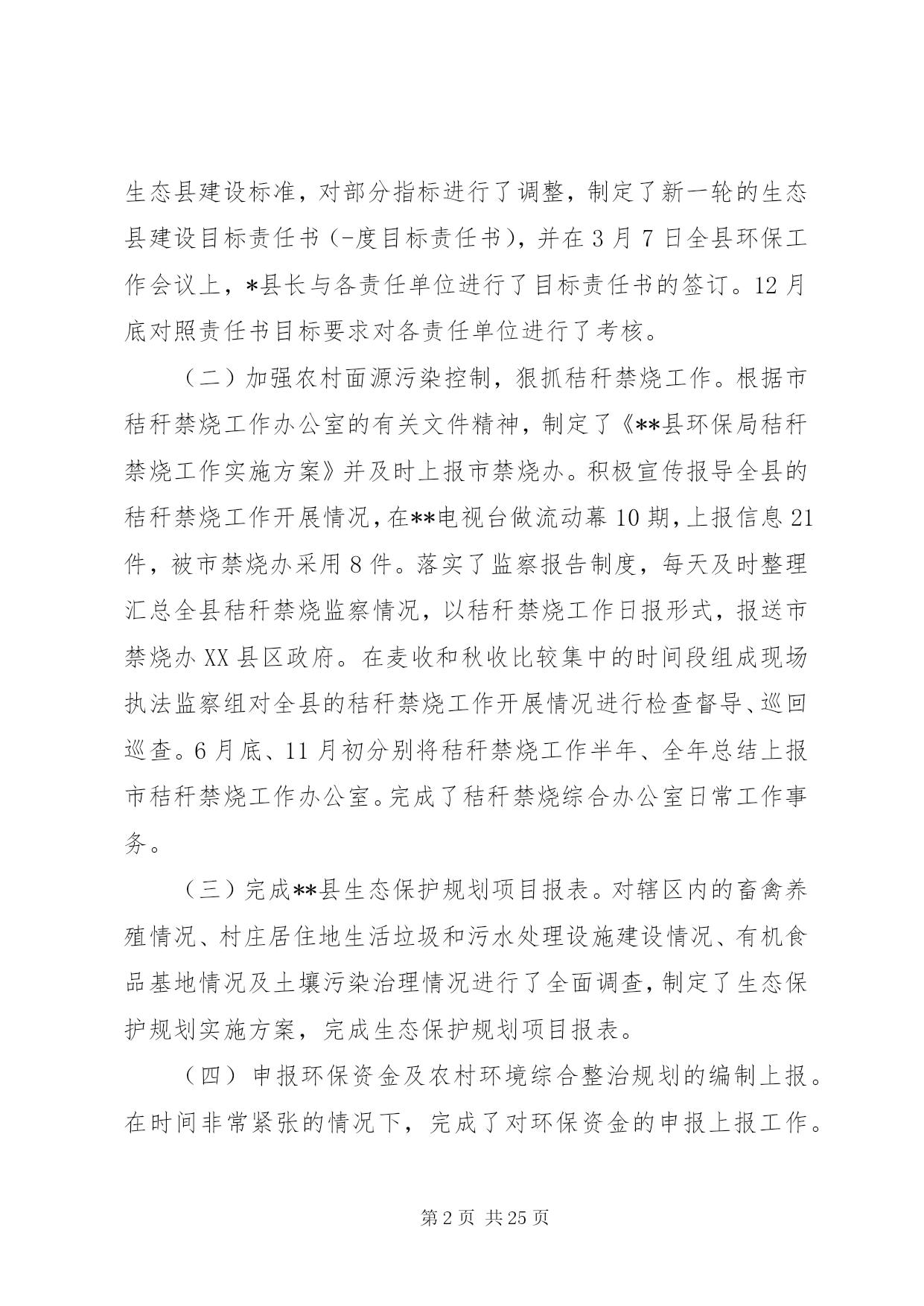 第PAGE\*Arabic\*MERGEFORMAT25页共NUMPAGES\*MERGEFORMAT25页环保局述职报告4篇一年来,在局党组的正确领导下,坚持以三个代表重要思想为指导,深入贯彻落实科学发展观,围绕中心,服务大局,求真务实,扎实工作,较好地完成了本职工作和领导交办的各项任务。根据考核要求,现将度个人的思想、工作、作风和廉政等方面的情况简要述职如下:一、加强学习,不断提高自身素质树立终身学习的理念,在不断学习中升华思想、提高能力。一是深入学习党的理论政策。坚持把学习放在重要位置,深入学习邓小平理论、三个代表重要思想和党的十七大、十七届三中全会精神,坚持以科学发展观、构建社会主义和谐社会、保持共产党员先进性等马克思主义中国化的最新理论成果武装头脑,对中央一系列重大战略思想认识更加深刻,理解更加透彻,指导工作更加富有成效。始终坚持正确的立场,始终与党中央保持高度一致,思想政治素质进一步提高。二是积极钻研业务。结合所在科室业务工作特点,重点学习生态保护和污染源普查方面的业务知识,学以致用,开拓创新,不断提高业务水平。二、严格要求,全力做好各项工作(一)认真做好生态县建设日常工作。xx年年生态示范区通过验收,xx-xx年年度生态县建设目标责任书初级阶段的工作任务已经完成,结合我县实际情况,根据国家环保总部新制定的生态县建设标准,对部分指标进行了调整,制定了新一轮的生态县建设目标责任书(-度目标责任书),并在3月7日全县环保工作会议上,*县长与各责任单位进行了目标责任书的签订。12月底对照责任书目标要求对各责任单位进行了考核。(二)加强农村面源污染控制,狠抓秸秆禁烧工作。根据市秸秆禁烧工作办公室的有关文件精神,制定了《**县环保局秸秆禁烧工作实施方案》并及时上报市禁烧办。积极宣传报导全县的秸秆禁烧工作开展情况,在**电视台做流动幕10期,上报信息21件,被市禁烧办采用8件。落实了监察报告制度,每天及时整理汇总全县秸秆禁烧监察情况,以秸秆禁烧工作日报形式,报送市禁烧办XX县区政府。在麦收和秋收比较集中的时间段组成现场执法监察组对全县的秸秆禁烧工作开展情况进行检查督导、巡回巡查。6月底、11月初分别将秸秆禁烧工作半年、全年总结上报市秸秆禁烧工作办公室。完成了秸秆禁烧综合办公室日常工作事务。(三)完成**县生态保护规划项目报表。对辖区内的畜禽养殖情况、村庄居住地生活垃圾和污水处理设施建设情况、有机食品基地情况及土壤污染治理情况进行了全面调查,制定了生态保护规划实施方案,完成生态保护规划项目报表。(四)申报环保资金及农村环境综合整治规划的编制上报。在时间非常紧张的情况下,完成了对环保资金的申报上报工作。根据全县农村环境保护工作的特点,及时召开农村环境综合整治村庄上报工作会议,并编制完成《**县农村环境综合整治-规划》及时上报市局。(五)污染源普查工作。认真贯彻落实《国务院关于开展第一次污染源普查的通知》精神和普查工作的总体要求,负责组织对全县普查员、普查指导员培训2次,针对普查工作中出现的问题进行分析并及时建议组织召开调度会议5次,保障普查工作的顺利开展。在4、5月份普查入户调查阶段,带领办公室工作人员采取5+2,白+黑的工作模式克服了时间紧、任务重、工作人员少等困难,及时完成普查入户阶段工作任务。在普查核查阶段,采取比对环境统计年报、查阅企业档案等方式,审核普查表格数据填报的完整性、规范性、准确性等,保障了普查数据的真实性、可靠性。一年来,个人工作成绩的取得,离不开领导和同志们的关心帮助,也与局党组的培养教育密不可分。但自身素质和工作能力与党组织和领导的要求还有一定差距。在新的一年里,我将严格要求自己,不断加强学习,认真开展工作,努力提高素质,为全局各项工作的开展做出自己应有的贡献。环保局副局长述职报告我于8月18日从xx乡党委书记调县环境保护局任局党组成员、副局长,分管工会、监察大队工作和局党组交办的临时性工作,这些工作,既是贯彻执行党的各项方针、政策、法律法规,又能为xx的工业强县,大力发展非公制经济,保障人民群众有一个宁静、舒适的生活环境起到十分重要的作用。自己从驾驭全局的镇乡工作到分管一个部门的部份工作,工作任务和工作方式都发生了变化,经过一年多的工作实践,初步实现了角色的转变。一是整体工作与局部工作的转变;二是全面工作决策为主向亲自指挥与部门同志一起动手操作的转变;三是以全局工作为主向分管工作和全局工作相结合的方向转变。环境保护工作政策性强,法律法规严,涉及面广,为了尽快熟悉业务,了解情况,充当内行,自己从以下以下几个方面入手:一是学习。为了尽早熟悉本职业务工作,努力做到“议大事、懂全局,管本行”,首先是根据自己的分管工作,认真学习有关环境保护的法律、法规,真正做到执法者学法,守法,运用法律武