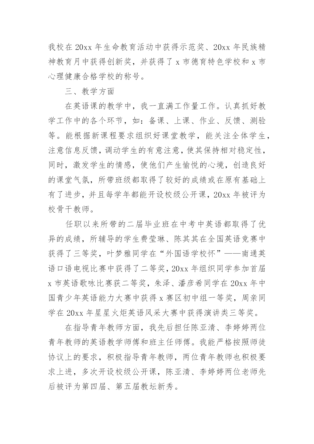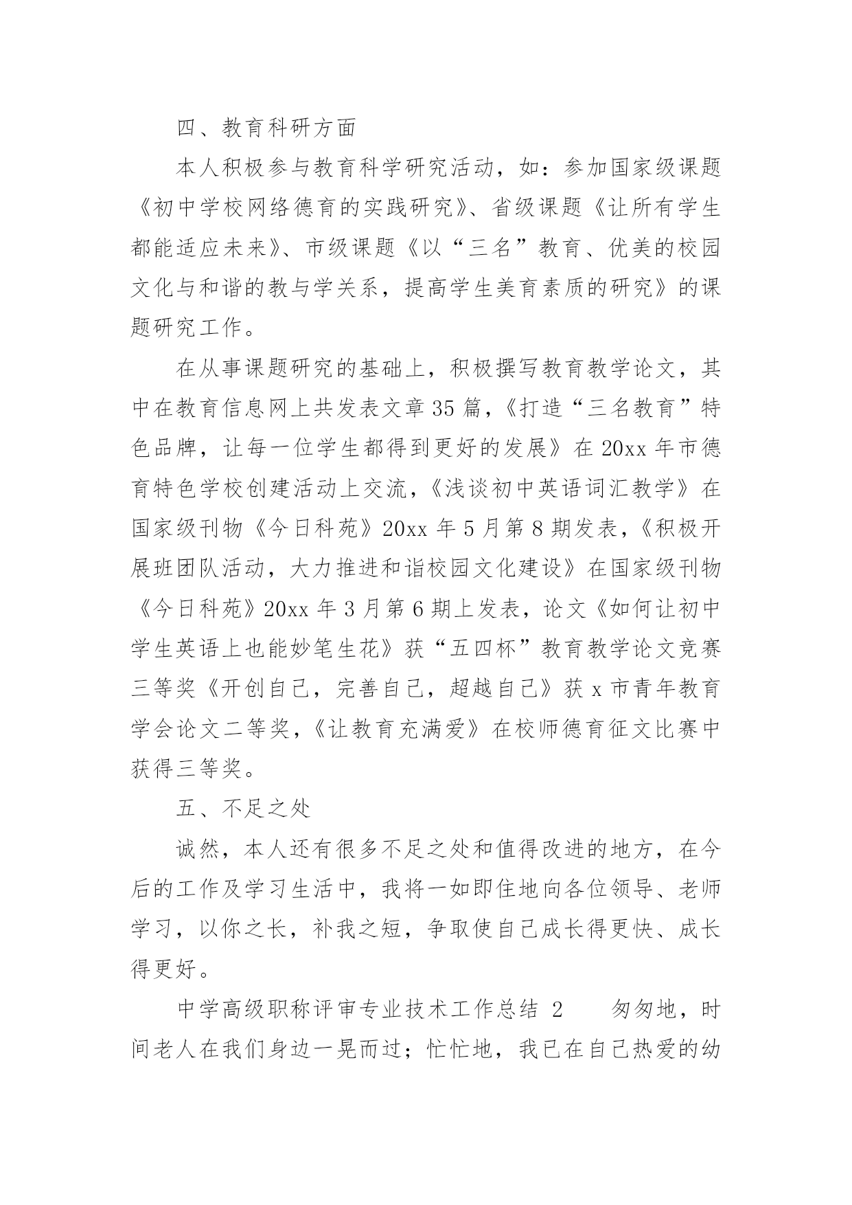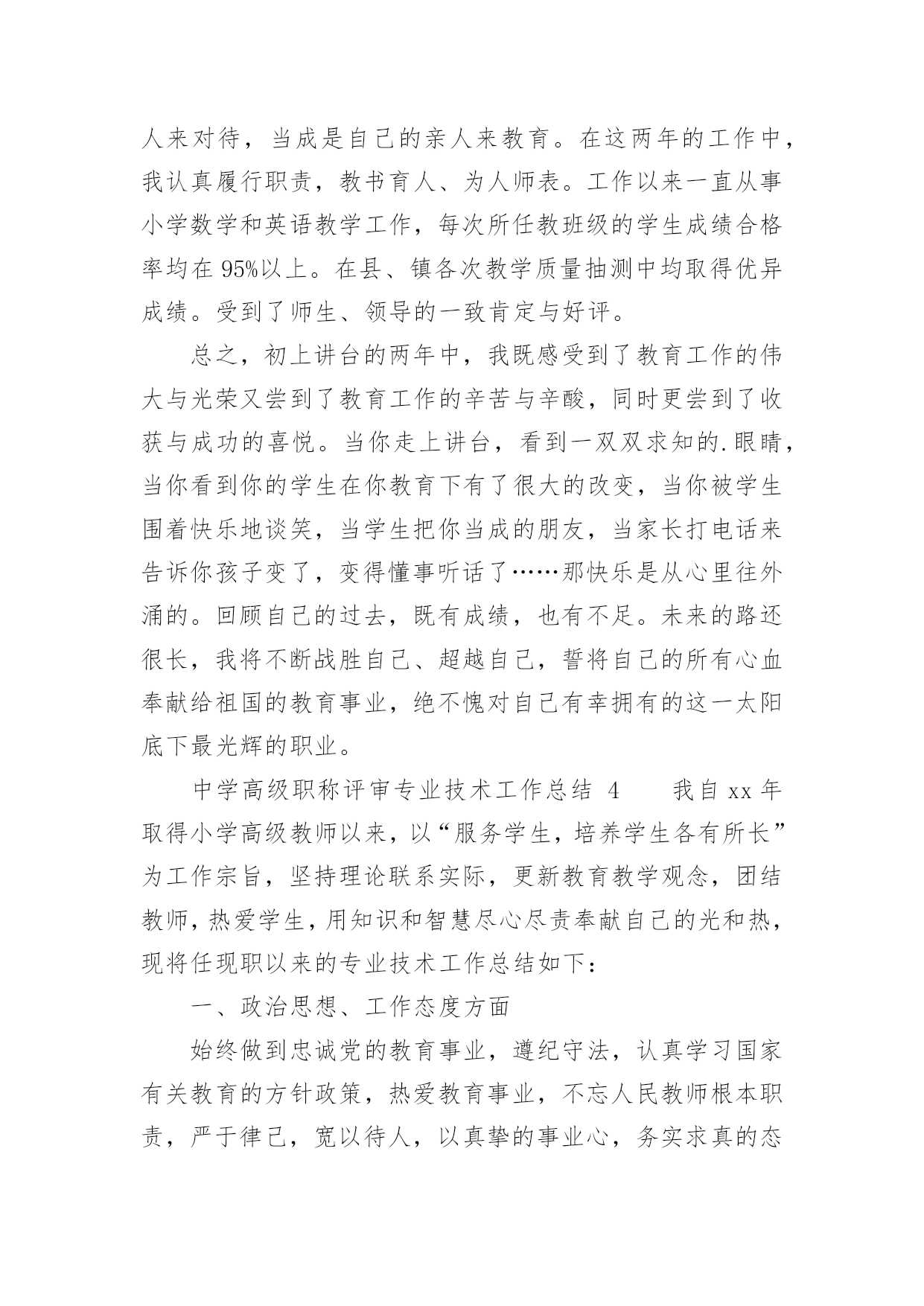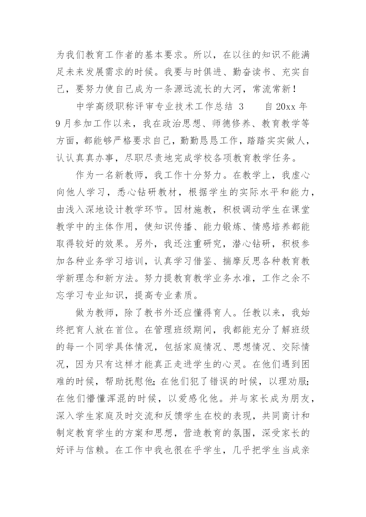 中学高级职称评审专业技术工作总结中学高级职称评审专业技术工作总结(通用10篇)时间是箭,去来迅疾,一段时间的工作已经告一段落,回顾这段时间以来的工作成果,你有什么感悟呢?该好好写一份工作总结,分析一下过去这段时间的工作了。可是怎样写工作总结才能出彩呢?以下是小编帮大家整理的中学高级职称评审专业技术工作总结,欢迎阅读,希望大家能够喜欢。中学高级职称评审专业技术工作总结1本人任现职以来一直满工作量工作,在品德修养、师德表现等方面严格要求自己,积极参加各种业务学习与进修,努力提高自己的教育教学及管理水平,认真履行自己的教育教学及管理职责,在教育教学及管理等方面取得了一定的成绩,现将我的学习及工作情况总结如下:一、品德修养、师德表现方面作为一名共产党员,我处处以党员的标准严格要求自己,坚持四项基本原则,认真学习贯彻党的教育方针与政策,积极参加各种政治学习活动,以主人翁的姿态积极参与学校的民主管理与民主监督。作为一名中层干部,注重发挥中层干部在老师中的模范带头作用,在师德表现等方面对自己提出了较高的要求,严格遵守各类师德规定,努力做教师和学生的知心朋友。二、教育管理方面自20xx年主持团工作以来,在共青团、少先队工作方面,能在上级团委的指导下,围绕学校中心工作,发挥自身特色,做好各项团的工作,如思想教育、自身建设、特色活动、科研兴团、创新工作、以团带队等,取得了非常出色的成绩,多次受到上级团委的表彰。20xx年率领团委争创江苏省五四红旗团委,在经过三年的奋斗后我校被评为江苏省五四红旗团委。本人也被团市委授予“优秀团员”光荣称号,连续几年都被教育局团委评为“优秀团干部”,先后被评为x市青年岗位能手、x市新长征突击手、x市优秀团员。任教以来共担任6年班主任,在班主任工作方面,我积极履行班主任工作职责,注重班集体建设和学生行为习惯养成教育、思想品德教育、学习目的教育、学习态度教育和学习方法教育。在班集体建设上,积极推行班级自主管理的系统管理模式,有意识地培养学生的自主管理能力与意识。在创模范班级活动中,我担任班主任的6年中,每个学期所带班级都被评为校模范班级并在学校组织的各项活动中取得优异的成绩。由于本人在管理及学生思想教育工作中所取得的成绩,20xx年我被评为x市中小学德育先进个人。20xx年我被任命为德育处主任。在德育处的工作中,我主要从四个方面做了努力:一是根据学校实际进一步完善了学校德育管理体系;二是抓好了班主任工作管理;三是抓紧了学生管理;四是举行有意义有实效的德育活动。正是因为有了明确的.方向和坚持不懈的努力,我校德育工作取得了很大的进步,德育活动在局属学校中也有了一定的知名度。我校在20xx年生命教育活动中获得示范奖、20xx年民族精神教育月中获得创新奖,并获得了x市德育特色学校和x市心理健康合格学校的称号。三、教学方面在英语课的教学中,我一直满工作量工作。认真抓好教学工作中的各个环节,如:备课、上课、作业、反馈、测验等。能根据新课程要求组织好课堂教学,能关注全体学生,注意信息反馈,调动学生的有意注意,使其保持相对稳定性,同时,激发学生的情感,使他们产生愉悦的心境,创造良好的课堂气氛,所带班级都取得了较好的成绩或在原有基础上有了进步,并且每学年都能开设校级公开课,20xx年被评为校骨干教师。任职以来所带的二届毕业班在中考中英语都取得了优异的成绩,所辅导的学生费莹琳、陈其其在全国英语竞赛中获得了三等奖,叶梦雅同学在“外国语学校怀”——南通英语口语电视比赛中获得了二等奖,20xx年组织同学参加首届x市英语歌咏比赛获二等奖,朱泽、潘彦希同学在20xx年中国青少年英语能力大赛中获得x赛区初中组一等奖,周亲同学在20xx年星星火炬英语风采大赛中获得演讲类三等奖。在指导青年教师方面,我先后担任陈亚清、李婷婷两位青年教师的英语教学师傅和班主任师傅。我能严格按照师徒协议上的要求,积极指导青年教师,两位青年教师也积极要求上进,多次开设校级公开课,陈亚清、李婷婷两位老师先后被评为第四届、第五届教坛新秀。四、教育科研方面本人积极参与教育科学研究活动,如:参加国家级课题《初中学校网络德育的实践研究》、省级课题《让所有学生都能适应未来》、市级课题《以“三名”教育、优美的校园文化与和谐的教与学关系,提高学生美育素质的研究》的课题研究工作。在从事课题研究的基础上,积极撰写教育教学论文,其中在教育信息网上共发表文章35篇,《打造“三名教育”特色品牌,让每一位学生都得到更好的发展》在20xx年市德育特色学校创建活动上交流,《浅谈初中英语词汇教学》在国家级刊物《今日科苑》20xx年5月第8期发表,《积极开展班团队活动,大力推进和诣校园文化建设》在国家级刊物《今日科苑》20xx年3月第6期上发表,论文《如何让初中学生英语上也能妙笔生花》获“五四杯”教育教学论文竞