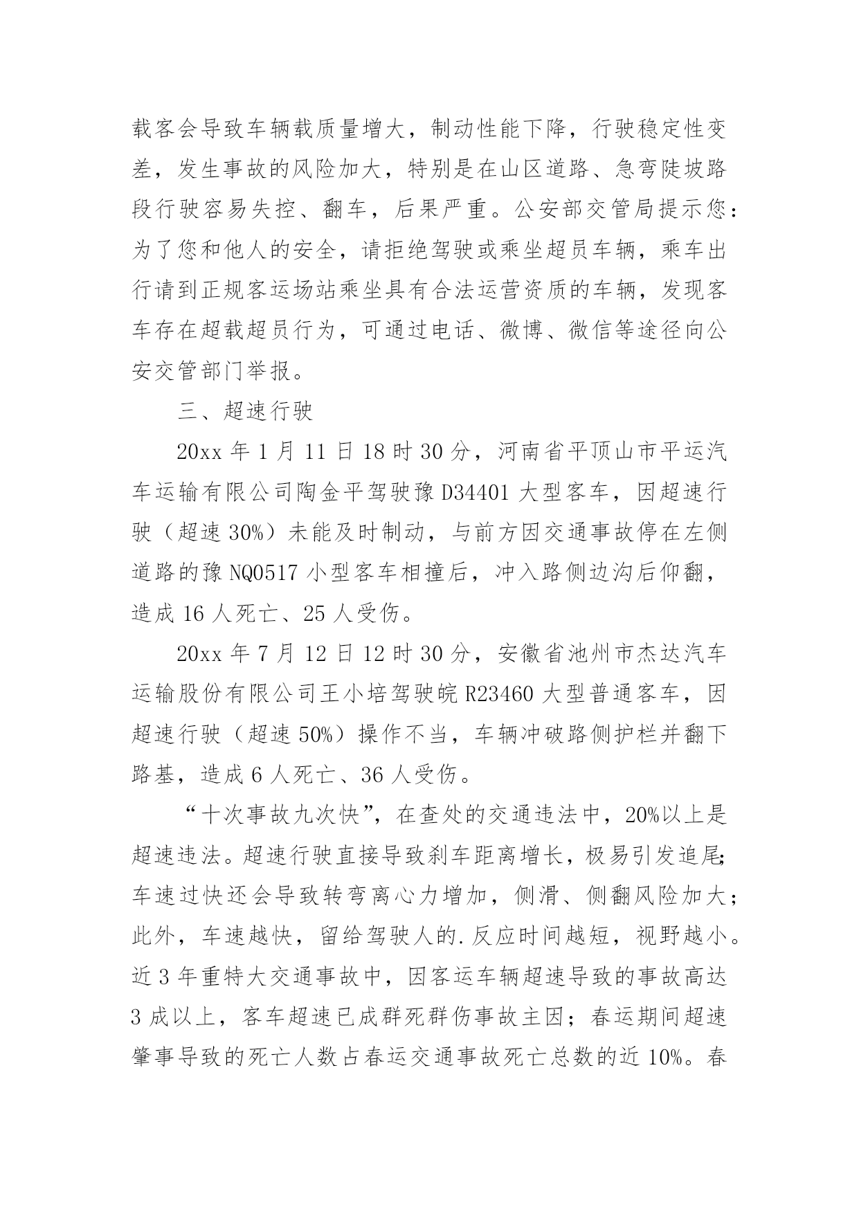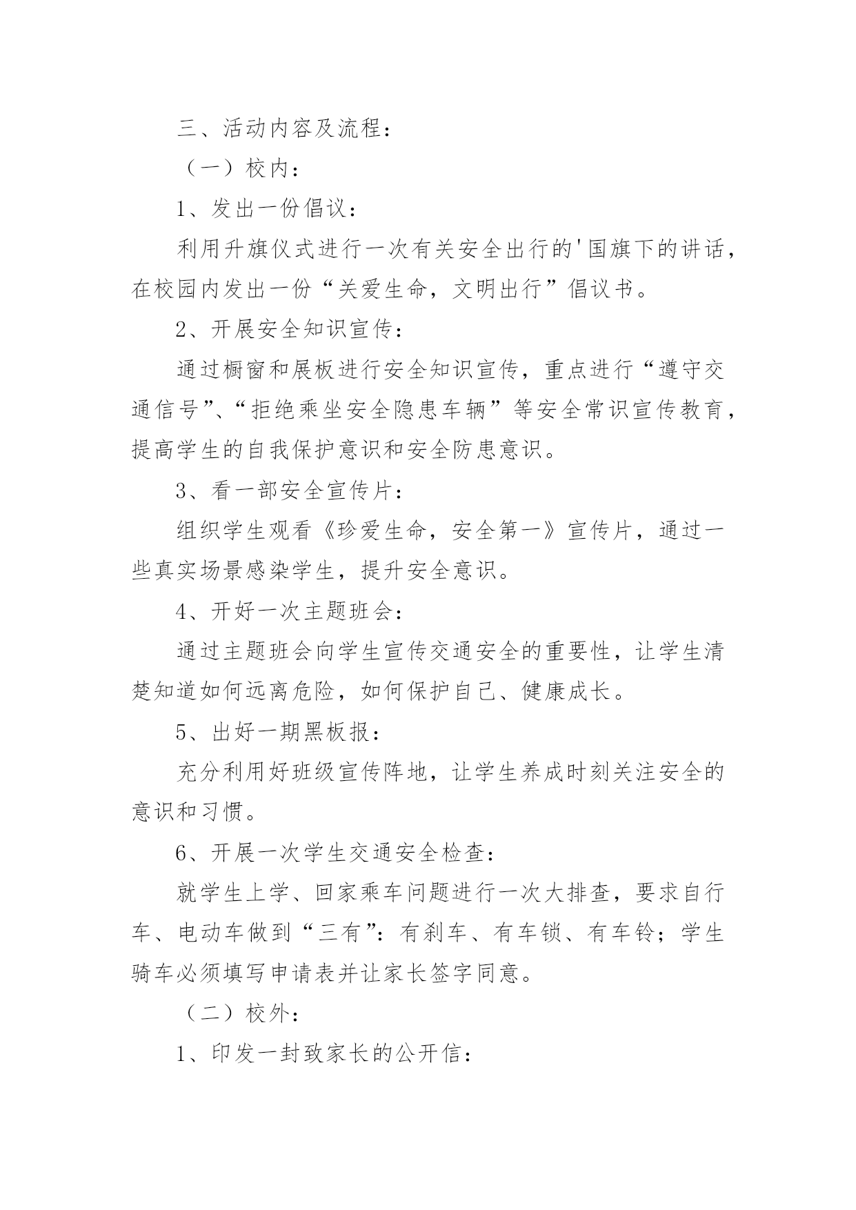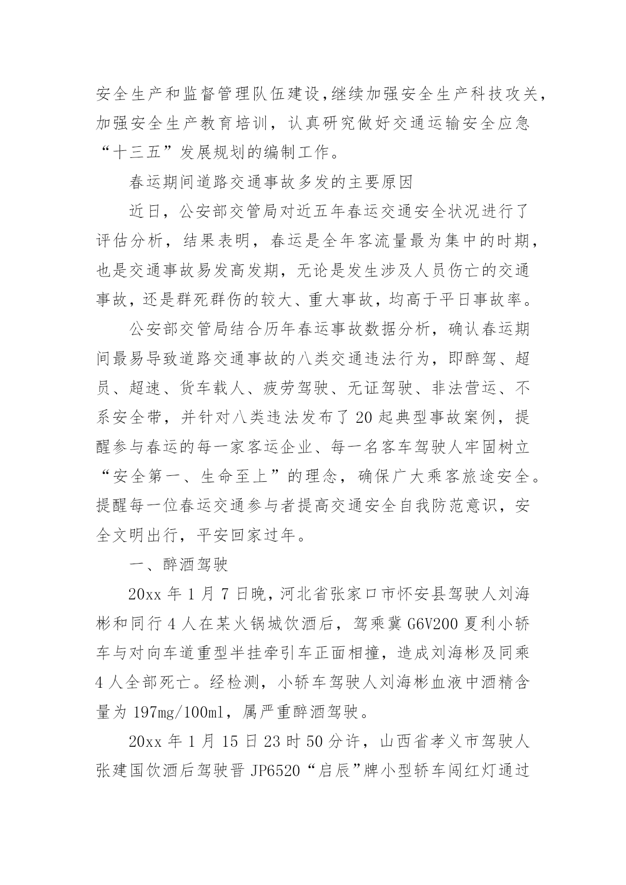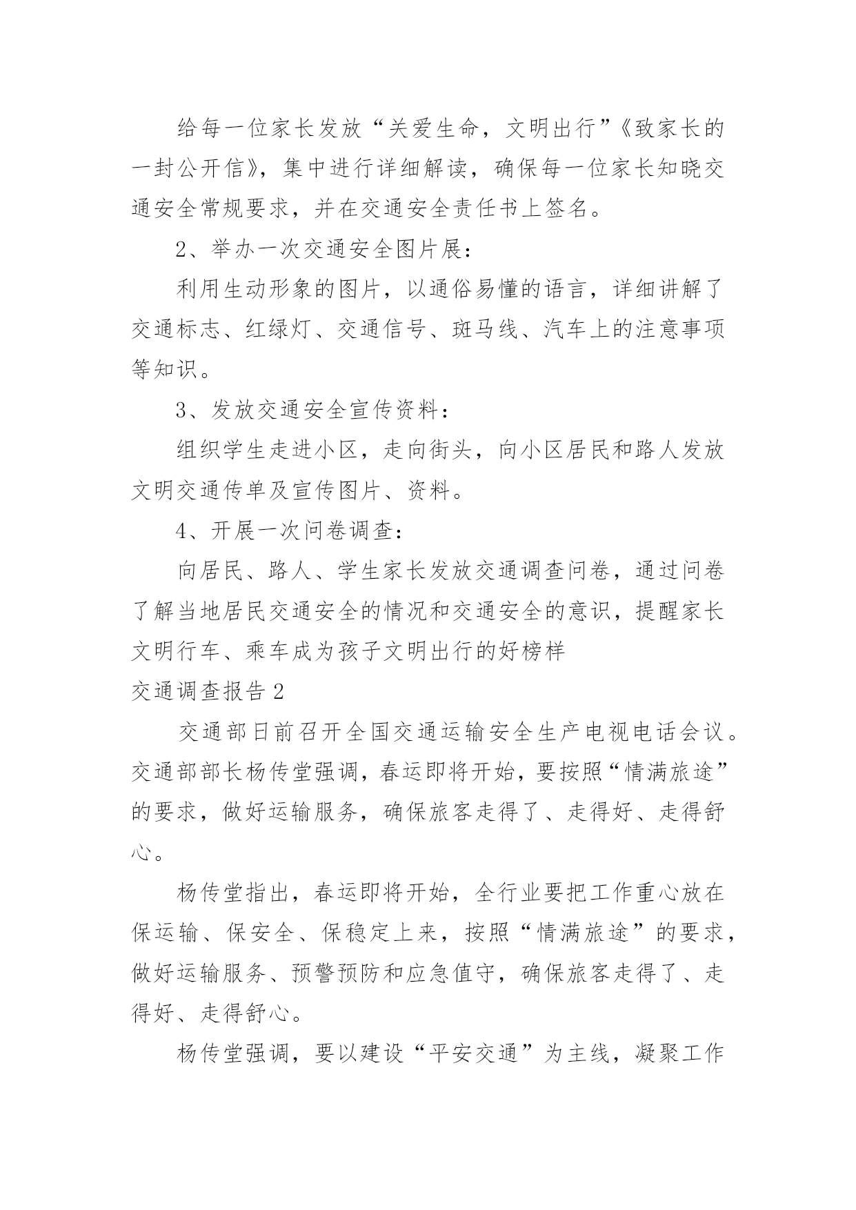 交通调查报告交通调查报告随着社会一步步向前发展,我们使用报告的情况越来越多,报告中涉及到专业性术语要解释清楚。为了让您不再为写报告头疼,以下是小编整理的交通调查报告,希望能够帮助到大家。交通调查报告1一、活动主题及宣传口号:“关爱生命、文明出行”“文明出行每一步,关爱生命每一天”二、实践活动的目的和意义:从实际出发,引导学生积极参加社会调查和交通宣传等为主的社会实践活动。在实践中提高学生文明参与交通意识和自我防范的能力。1、安全教育:包括人身安全、活动安全、交通安全、物品安全及其他安全教育。2、公德教育:包括不能拥挤喧哗、注意公共卫生、不乱扔果皮纸屑、爱护公物等。3、组织纪律教育:包括要集体统一行动、不要掉队、不得擅自离队、听从教师指挥等。4、环保知识的宣传。三、活动内容及流程:(一)校内:1、发出一份倡议:利用升旗仪式进行一次有关安全出行的'国旗下的讲话,在校园内发出一份“关爱生命,文明出行”倡议书。2、开展安全知识宣传:通过橱窗和展板进行安全知识宣传,重点进行“遵守交通信号”、“拒绝乘坐安全隐患车辆”等安全常识宣传教育,提高学生的自我保护意识和安全防患意识。3、看一部安全宣传片:组织学生观看《珍爱生命,安全第一》宣传片,通过一些真实场景感染学生,提升安全意识。4、开好一次主题班会:通过主题班会向学生宣传交通安全的重要性,让学生清楚知道如何远离危险,如何保护自己、健康成长。5、出好一期黑板报:充分利用好班级宣传阵地,让学生养成时刻关注安全的意识和习惯。6、开展一次学生交通安全检查:就学生上学、回家乘车问题进行一次大排查,要求自行车、电动车做到“三有”:有刹车、有车锁、有车铃;学生骑车必须填写申请表并让家长签字同意。(二)校外:1、印发一封致家长的公开信:给每一位家长发放“关爱生命,文明出行”《致家长的一封公开信》,集中进行详细解读,确保每一位家长知晓交通安全常规要求,并在交通安全责任书上签名。2、举办一次交通安全图片展:利用生动形象的图片,以通俗易懂的语言,详细讲解了交通标志、红绿灯、交通信号、斑马线、汽车上的注意事项等知识。3、发放交通安全宣传资料:组织学生走进小区,走向街头,向小区居民和路人发放文明交通传单及宣传图片、资料。4、开展一次问卷调查:向居民、路人、学生家长发放交通调查问卷,通过问卷了解当地居民交通安全的情况和交通安全的意识,提醒家长文明行车、乘车成为孩子文明出行的好榜样交通调查报告2交通部日前召开全国交通运输安全生产电视电话会议。交通部部长杨传堂强调,春运即将开始,要按照“情满旅途”的要求,做好运输服务,确保旅客走得了、走得好、走得舒心。杨传堂指出,春运即将开始,全行业要把工作重心放在保运输、保安全、保稳定上来,按照“情满旅途”的要求,做好运输服务、预警预防和应急值守,确保旅客走得了、走得好、走得舒心。杨传堂强调,要以建设“平安交通”为主线,凝聚工作合力,狠抓责任落实,当前要重点保障春运安全和稳定,全力推动交通运输安全生产形势持续稳定好转,为促进我国经济社会和交通运输事业科学发展、实现好维护好发展好人民群众根本利益作出新的更大贡献。一是狠抓责任落实。坚持好首位原则、首长负责原则、“一岗双责”原则和一票否决原则,进一步焊牢安全生产责任链条,认真履行新《安全生产法》赋予的监督、检查、执法的权责,明晰和规范安全工作责任。二是深化改革创新。按照依法行政和职责法定的要求,对现有安全监督管理体制机制进行改革,加强安全生产风险和诚信管理,深入开展安全生产标准化建设,强化工作落实情况跟踪督查督办,开展安全生产巡视和“平安交通”建设评价考核,重点抓好“平安交通”、风险管理、安全体系建设的改革试点工作。三是推进依法治安。加快完善交通运输安全生产法规制度,做到有法可依;建立安全监督管理执法权力责任清单,做到严格执法、公正文明执法;依法依规严肃事故查处和责任追究,做到按时结案、公开公正。四是突出重点治理。继续开展长途客运、危险化学品运输、水上客运等重点领域安全生产专项整治活动,抓好治本攻坚,以点带面、扩大成果;继续加大隐患排查治理力度,对重大隐患治理实行挂牌督办,公开曝光反面典型,坚决遏制重特大事故发生。五是加强支撑保障。继续加大安全生产投入力度,加强安全生产和监督管理队伍建设,继续加强安全生产科技攻关,加强安全生产教育培训,认真研究做好交通运输安全应急“十三五”发展规划的编制工作。春运期间道路交通事故多发的主要原因近日,公安部交管局对近五年春运交通安全状况进行了评估分析,结果表明,春运是全年客流量最为集中的时期,也是交通事故易发高发期,无论是发生涉及人员伤亡的交通事故,还是群死群伤的较大、重大事故,均高于平日事故率。公安部交管局结合历年春运事故数据分析,确认春运期间最易导致道路交通事故的八类交通违法行为,即醉驾、超员、超速、货