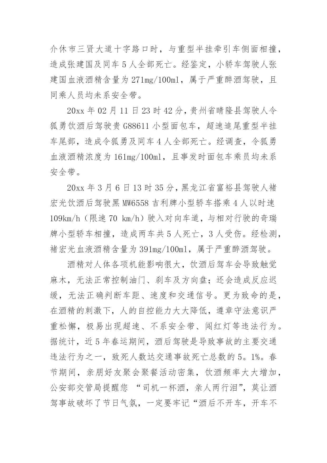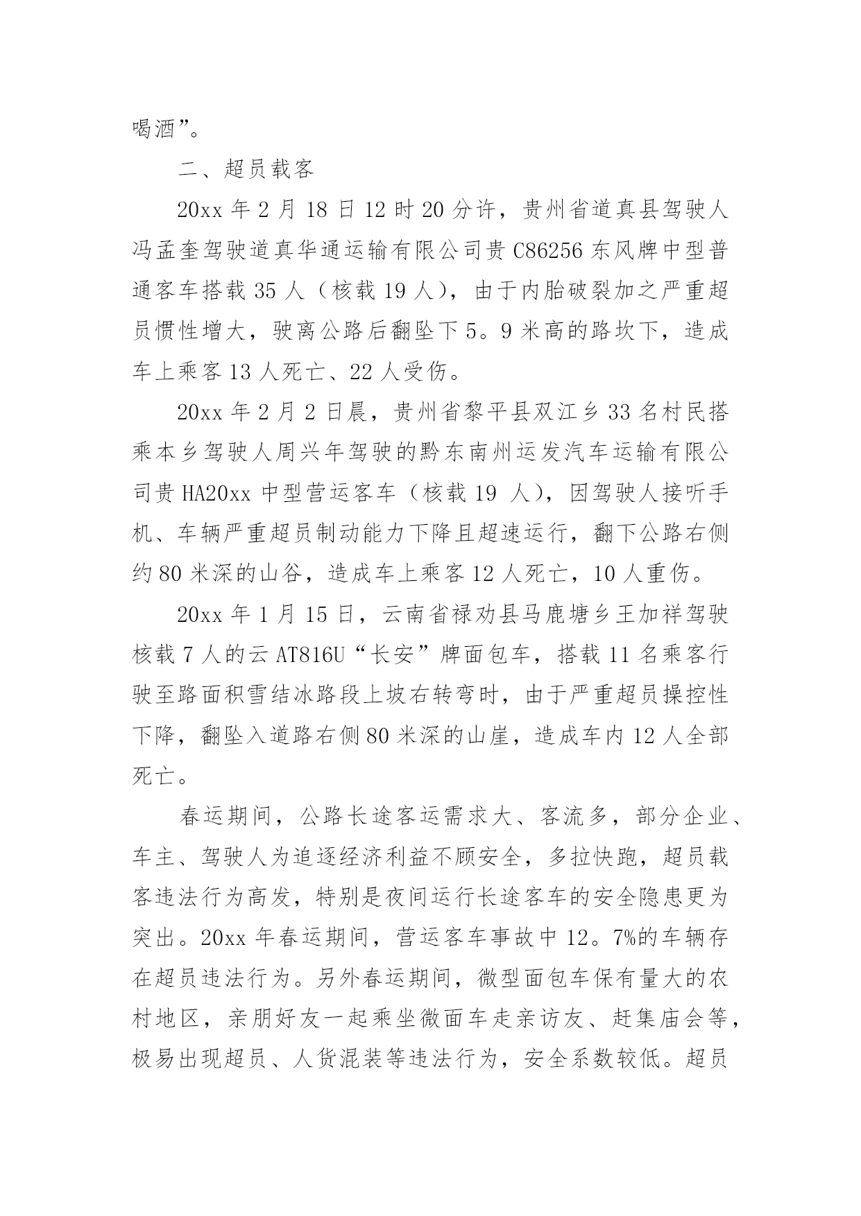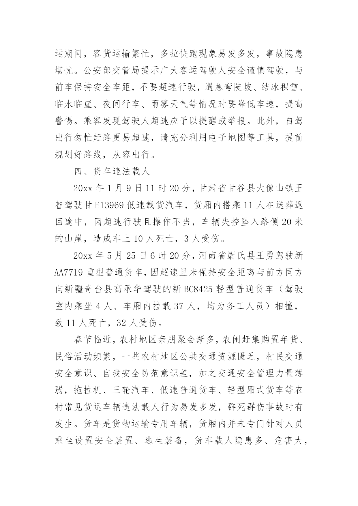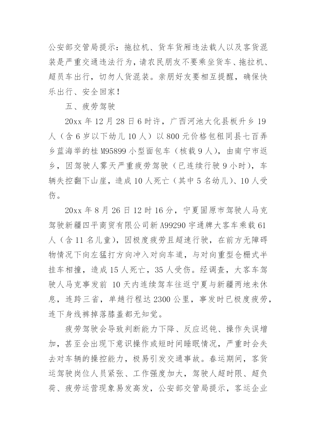 交通调查报告交通调查报告随着社会一步步向前发展,我们使用报告的情况越来越多,报告中涉及到专业性术语要解释清楚。为了让您不再为写报告头疼,以下是小编整理的交通调查报告,希望能够帮助到大家。交通调查报告1一、活动主题及宣传口号:“关爱生命、文明出行”“文明出行每一步,关爱生命每一天”二、实践活动的目的和意义:从实际出发,引导学生积极参加社会调查和交通宣传等为主的社会实践活动。在实践中提高学生文明参与交通意识和自我防范的能力。1、安全教育:包括人身安全、活动安全、交通安全、物品安全及其他安全教育。2、公德教育:包括不能拥挤喧哗、注意公共卫生、不乱扔果皮纸屑、爱护公物等。3、组织纪律教育:包括要集体统一行动、不要掉队、不得擅自离队、听从教师指挥等。4、环保知识的宣传。三、活动内容及流程:(一)校内:1、发出一份倡议:利用升旗仪式进行一次有关安全出行的'国旗下的讲话,在校园内发出一份“关爱生命,文明出行”倡议书。2、开展安全知识宣传:通过橱窗和展板进行安全知识宣传,重点进行“遵守交通信号”、“拒绝乘坐安全隐患车辆”等安全常识宣传教育,提高学生的自我保护意识和安全防患意识。3、看一部安全宣传片:组织学生观看《珍爱生命,安全第一》宣传片,通过一些真实场景感染学生,提升安全意识。4、开好一次主题班会:通过主题班会向学生宣传交通安全的重要性,让学生清楚知道如何远离危险,如何保护自己、健康成长。5、出好一期黑板报:充分利用好班级宣传阵地,让学生养成时刻关注安全的意识和习惯。6、开展一次学生交通安全检查:就学生上学、回家乘车问题进行一次大排查,要求自行车、电动车做到“三有”:有刹车、有车锁、有车铃;学生骑车必须填写申请表并让家长签字同意。(二)校外:1、印发一封致家长的公开信:给每一位家长发放“关爱生命,文明出行”《致家长的一封公开信》,集中进行详细解读,确保每一位家长知晓交通安全常规要求,并在交通安全责任书上签名。2、举办一次交通安全图片展:利用生动形象的图片,以通俗易懂的语言,详细讲解了交通标志、红绿灯、交通信号、斑马线、汽车上的注意事项等知识。3、发放交通安全宣传资料:组织学生走进小区,走向街头,向小区居民和路人发放文明交通传单及宣传图片、资料。4、开展一次问卷调查:向居民、路人、学生家长发放交通调查问卷,通过问卷了解当地居民交通安全的情况和交通安全的意识,提醒家长文明行车、乘车成为孩子文明出行的好榜样交通调查报告2交通部日前召开全国交通运输安全生产电视电话会议。交通部部长杨传堂强调,春运即将开始,要按照“情满旅途”的要求,做好运输服务,确保旅客走得了、走得好、走得舒心。杨传堂指出,春运即将开始,全行业要把工作重心放在保运输、保安全、保稳定上来,按照“情满旅途”的要求,做好运输服务、预警预防和应急值守,确保旅客走得了、走得好、走得舒心。杨传堂强调,要以建设“平安交通”为主线,凝聚工作合力,狠抓责任落实,当前要重点保障春运安全和稳定,全力推动交通运输安全生产形势持续稳定好转,为促进我国经济社会和交通运输事业科学发展、实现好维护好发展好人民群众根本利益作出新的更大贡献。一是狠抓责任落实。坚持好首位原则、首长负责原则、“一岗双责”原则和一票否决原则,进一步焊牢安全生产责任链条,认真履行新《安全生产法》赋予的监督、检查、执法的权责,明晰和规范安全工作责任。二是深化改革创新。按照依法行政和职责法定的要求,对现有安全监督管理体制机制进行改革,加强安全生产风险和诚信管理,深入开展安全生产标准化建设,强化工作落实情况跟踪督查督办,开展安全生产巡视和“平安交通”建设评价考核,重点抓好“平安交通”、风险管理、安全体系建设的改革试点工作。三是推进依法治安。加快完善交通运输安全生产法规制度,做到有法可依;建立安全监督管理执法权力责任清单,做到严格执法、公正文明执法;依法依规严肃事故查处和责任追究,做到按时结案、公开公正。四是突出重点治理。继续开展长途客运、危险化学品运输、水上客运等重点领域安全生产专项整治活动,抓好治本攻坚,以点带面、扩大成果;继续加大隐患排查治理力度,对重大隐患治理实行挂牌督办,公开曝光反面典型,坚决遏制重特大事故发生。五是加强支撑保障。继续加大安全生产投入力度,加强安全生产和监督管理队伍建设,继续加强安全生产科技攻关,加强安全生产教育培训,认真研究做好交通运输安全应急“十三五”发展规划的编制工作。春运期间道路交通事故多发的主要原因近日,公安部交管局对近五年春运交通安全状况进行了评估分析,结果表明,春运是全年客流量最为集中的时期,也是交通事故易发高发期,无论是发生涉及人员伤亡的交通事故,还是群死群伤的较大、重大事故,均高于平日事故率。公安部交管局结合历年春运事故数据分析,确认春运期间最易导致道路交通事故的八类交通违法行为,即醉驾、超员、超速、货