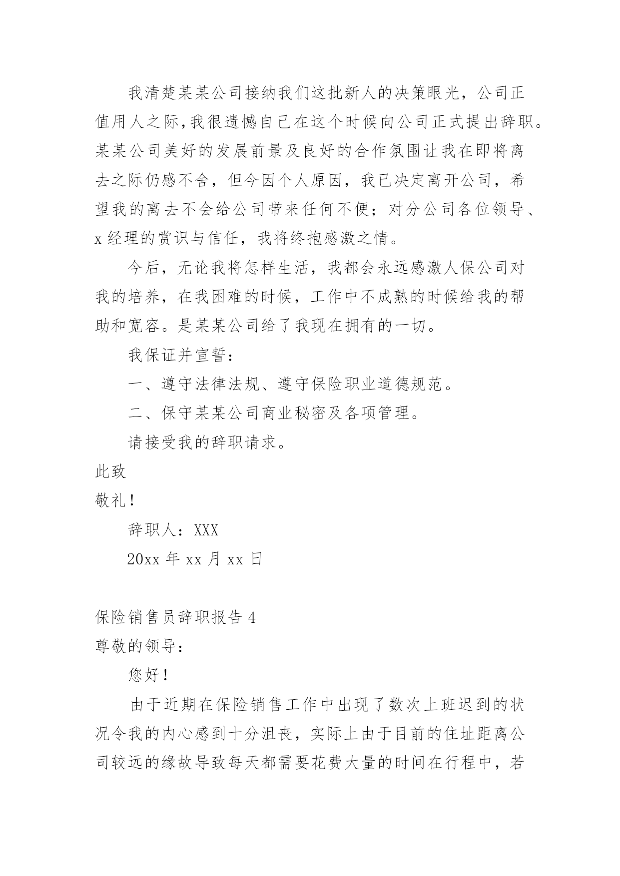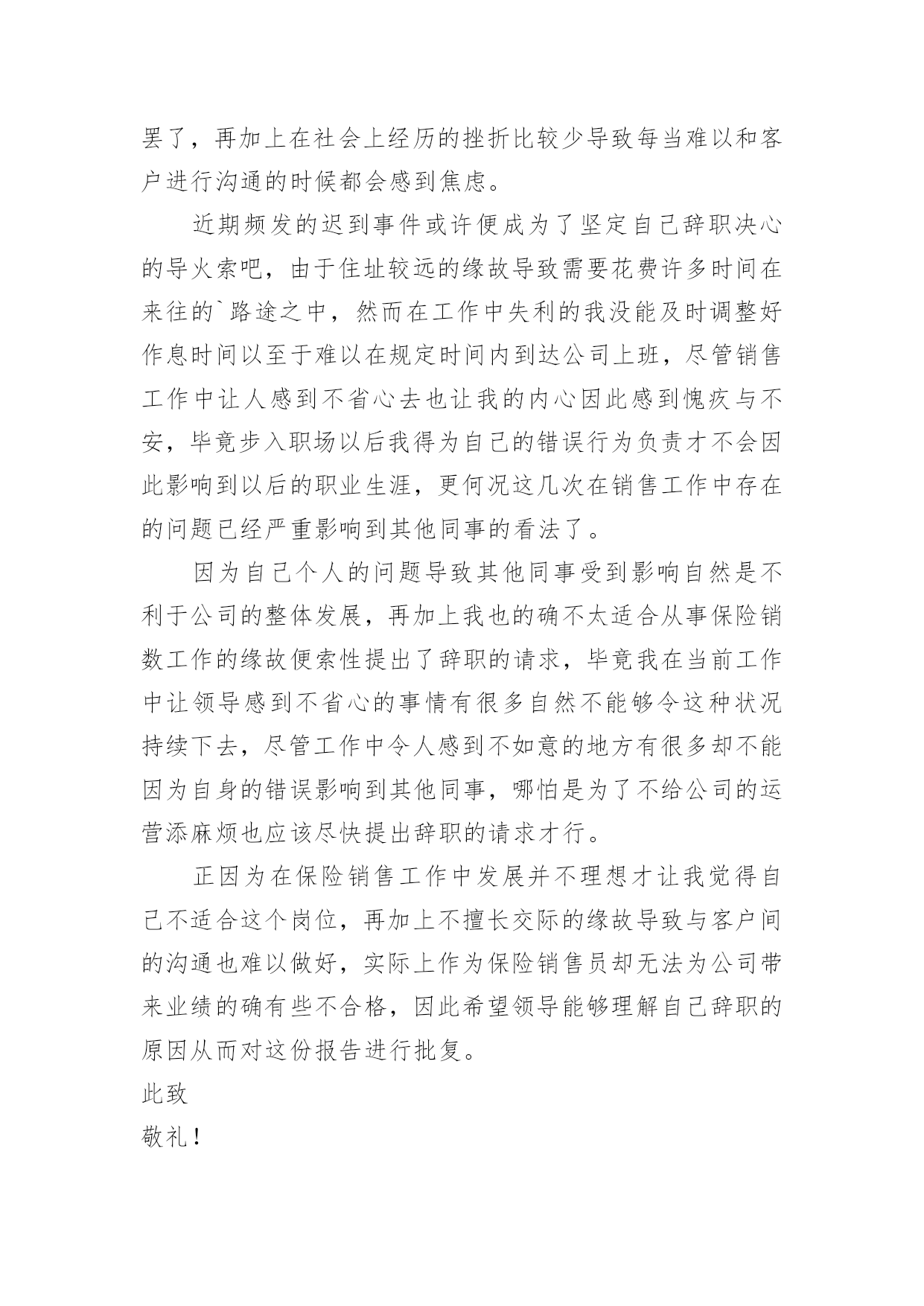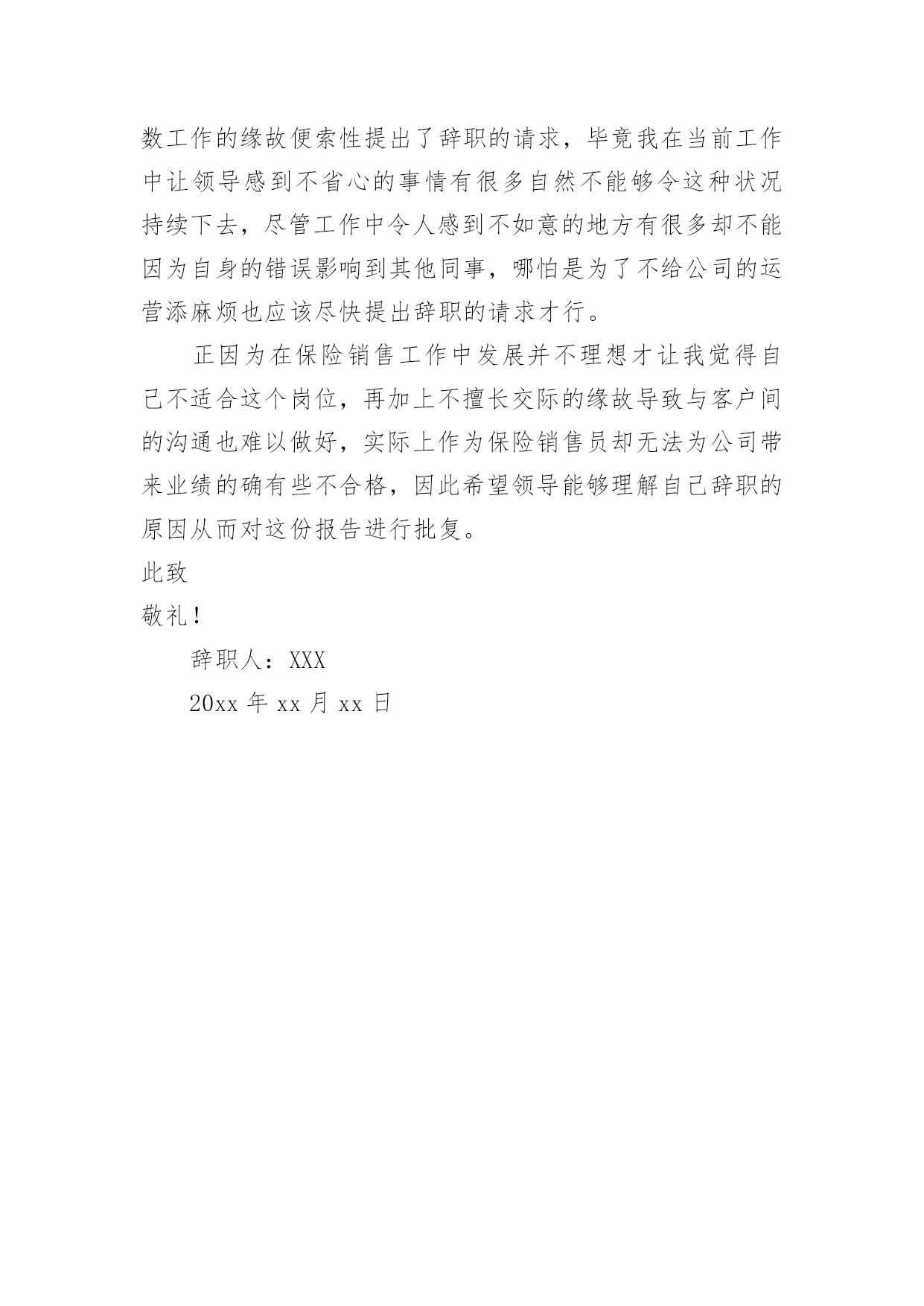 保险销售员辞职报告保险销售员辞职报告4篇【优秀】在现在社会,报告与我们愈发关系密切,通常情况下,报告的内容含量大、篇幅较长。那么大家知道标准正式的报告格式吗?下面是小编整理的保险销售员辞职报告,欢迎阅读与收藏。保险销售员辞职报告1尊敬的领导:您好!我的这次辞职已经成了必然的事情了,我的老婆让我换份工作,我不想辞职,我喜欢自己当前的这份工作,我跟她坚持过自己的想法,但是我最后还是拗不过她,只能顺从她的想法和意愿,真的很抱歉,这样以来公司就少了一位资深的销售员,我的离职,不仅是公司的损失,也是我个人的损失,这么一份跟我契合的工作,我不知道为什么我的老婆就是觉得不靠谱,对于我的离职,您也不要为难我,您就让我尽快的去办理离职手续吧。我来到公司已经有了三年多了,我的业务能力一直都很不错,业绩也是经常保持在一个很好高度,但是难免会有些时候会存在运气差的时候,一个月卖出去的保险仅有几份的情况也是有的,但是这都是极少数的情况,因为我们做销售的,工资全部看自己的业绩,业绩高工资自然就高,但是好想就是因为这么个情况,我的老婆说还是希望我能找一份稳定一点的工作,并且也是托关系给我找到了一份职位,要我下周就过去上班,据我了解,就是在一家物流公司办公室坐着而已,具体什么工作内容我还不了解,但是工资的确是比较高的,基本上可以跟我现在每个月最高的'销售业绩的工资相提并论,不得不说那份工作的确比我现在的工作稳定,但是一个人对工作的喜爱都是不同的,我现在这份销售的工作,是我自己喜欢的,也是我坚持干了三年的工作,早就习惯了每天去见客户的日子了,现在突然让我换一份工作,我也不知道自己是否可以适应,不过应该是不难的,因为我在您这里三年的工作经验可不是白搭的,肯定可以给予我很大的帮助。现如今,我要离职了,我真的是有千言万语想跟您跟同事们说,我的那些客户您就看在分配给我的那些同事们吧,希望能给他们带来帮助,三年的工作让我也是累积了很多的客户资源,这些资源给他们了,也能让他们的业绩有进一步的提升,最主要的是,我不想因为我的离职,导致公司有利益上的损失,这是我不想看到的情况。我这次这么一走,就不知道是否还能跟大家伙相见了,但是希望你们就算没了我也能让公司的发展稳步向前,这毕竟是我待了三年的公司,我当然是想看着它越来越好,我就没办法出力了,还望您见谅,最后我真的感谢您这三年来对我的照顾,在工作上给予我的帮助,您是一个好的老板,您的公司一定可以越来越辉煌的。此致敬礼!辞职人:XX20xx年xx月xx日保险销售员辞职报告2尊敬的领导:您好!由于近期在保险销售工作中出现了数次上班迟到的状况令我的内心感到十分沮丧,实际上由于目前的住址距离公司较远的缘故导致每天都需要花费大量的时间在行程中,若是对时间规划不合理的话很容易因为堵车等因素导致自己上班睡觉,再加上这种状况的确给公司的同事造成了不良的影响不禁令我反思自己是否适合保险销售工作,因此在我确定自身并不适合从事保险销售工作以后写下了这份辞职报告并希望得到领导的认可。其实由于自己入职时间不长的缘故导致对保险销售的职责并没有想象中那般清晰,或者说是对公司的认同感不强导致难以承受销售工作带来的压力,尽管领导在以往的销售工作中为自己提供了许多指导却难以让我适应当前的工作环境,实际上通过和其他同事的对比不难发现与保险销售工作格格不入的我其实并不适合这个行业,起初也只是在寻找工作的过程中带着尝试的心态来到公司从事保险销售工作罢了,再加上在社会上经历的挫折比较少导致每当难以和客户进行沟通的时候都会感到焦虑。近期频发的迟到事件或许便成为了坚定自己辞职决心的导火索吧,由于住址较远的缘故导致需要花费许多时间在来往的`路途之中,然而在工作中失利的我没能及时调整好作息时间以至于难以在规定时间内到达公司上班,尽管销售工作中让人感到不省心去也让我的内心因此感到愧疚与不安,毕竟步入职场以后我得为自己的错误行为负责才不会因此影响到以后的职业生涯,更何况这几次在销售工作中存在的问题已经严重影响到其他同事的看法了。因为自己个人的问题导致其他同事受到影响自然是不利于公司的整体发展,再加上我也的确不太适合从事保险销数工作的缘故便索性提出了辞职的请求,毕竟我在当前工作中让领导感到不省心的事情有很多自然不能够令这种状况持续下去,尽管工作中令人感到不如意的地方有很多却不能因为自身的错误影响到其他同事,哪怕是为了不给公司的运营添麻烦也应该尽快提出辞职的请求才行。正因为在保险销售工作中发展并不理想才让我觉得自己不适合这个岗位,再加上不擅长交际的缘故导致与客户间的沟通也难以做好,实际上作为保险销售员却无法为公司带来业绩的确有些不合格,因此希望领导能够理解自己辞职的原因从而对这份报告进行批复。此致敬礼!申请人:XXX日期:20xx年xx月xx日保险销售员辞职报告3敬爱的公司领导:您好