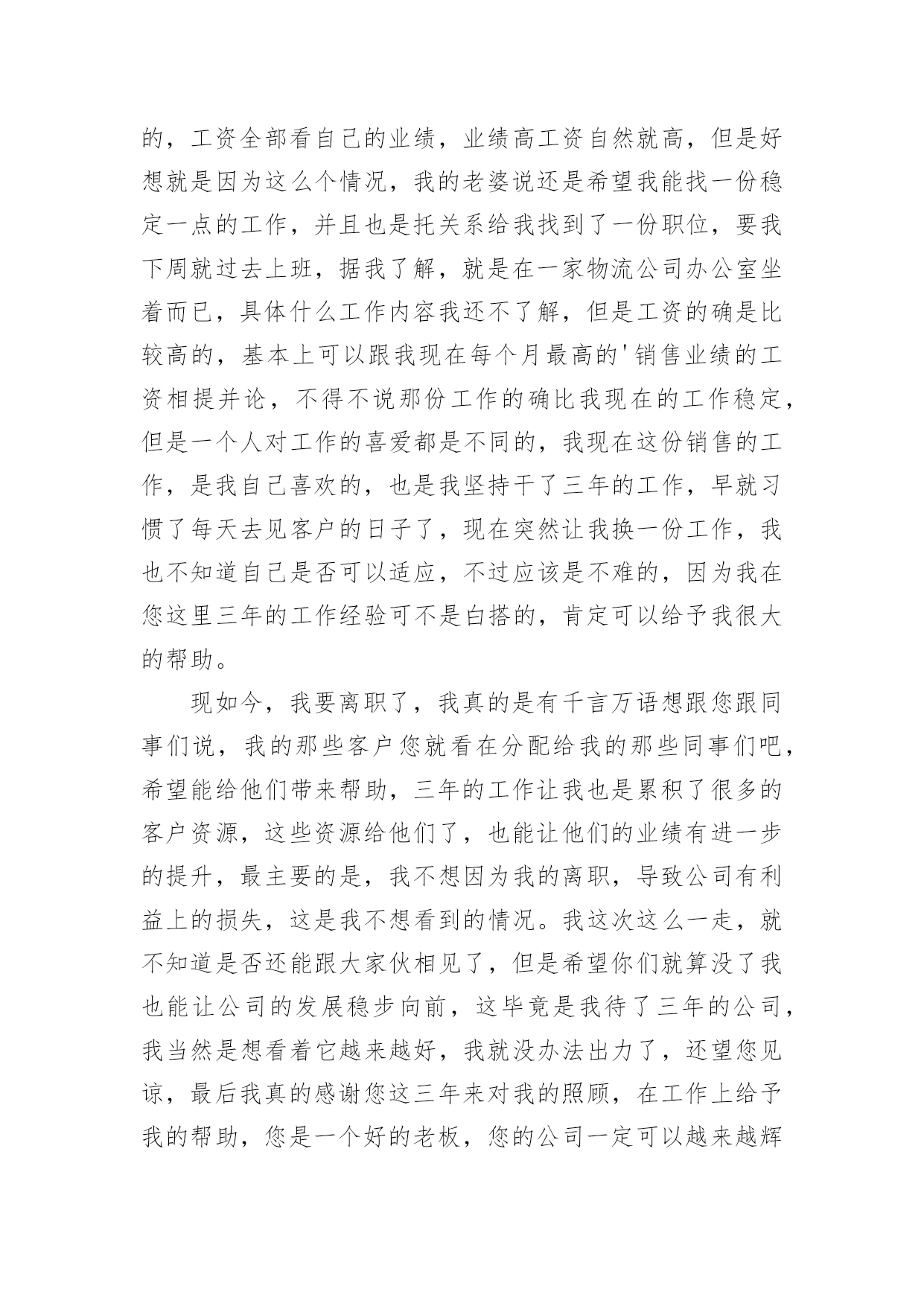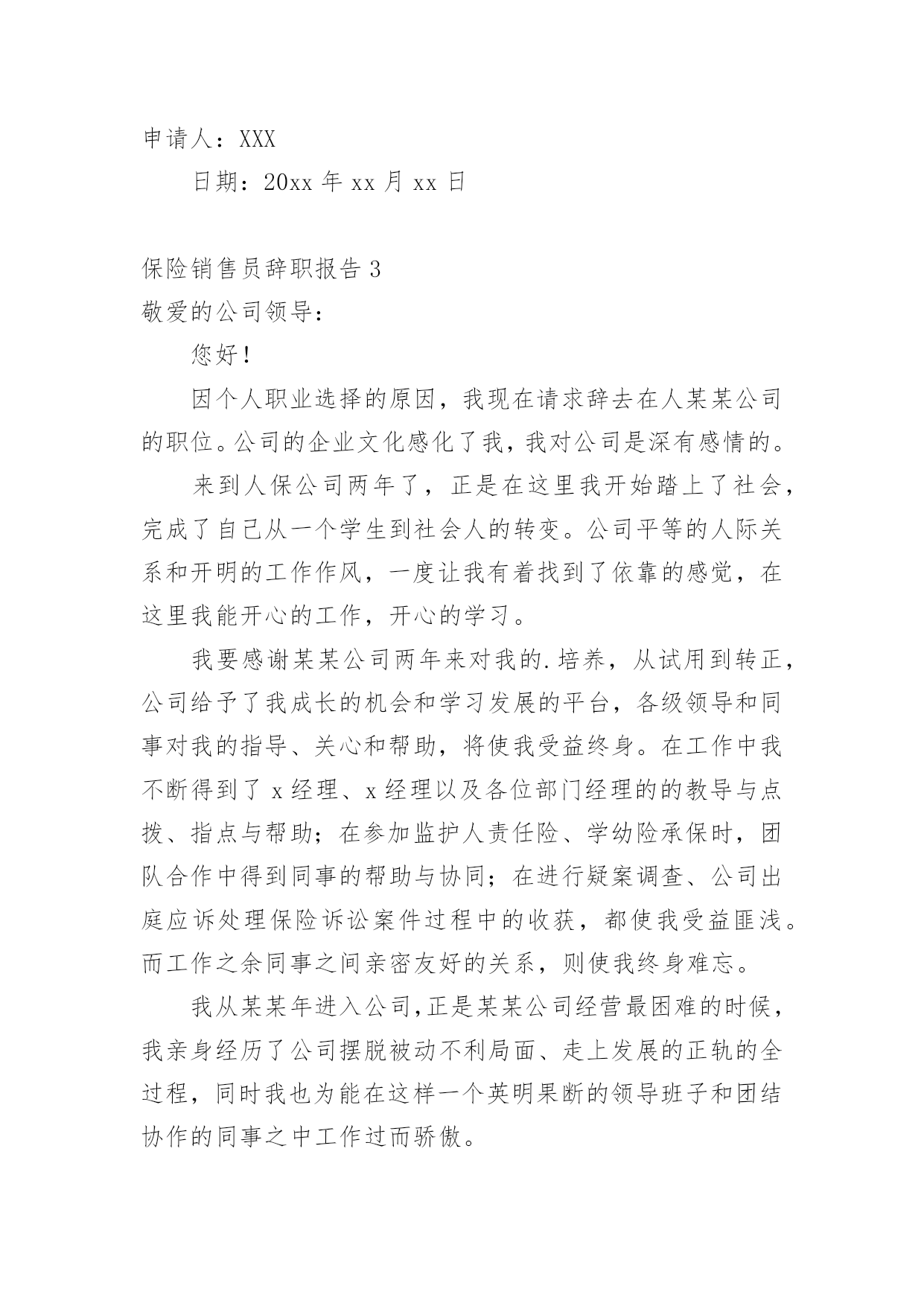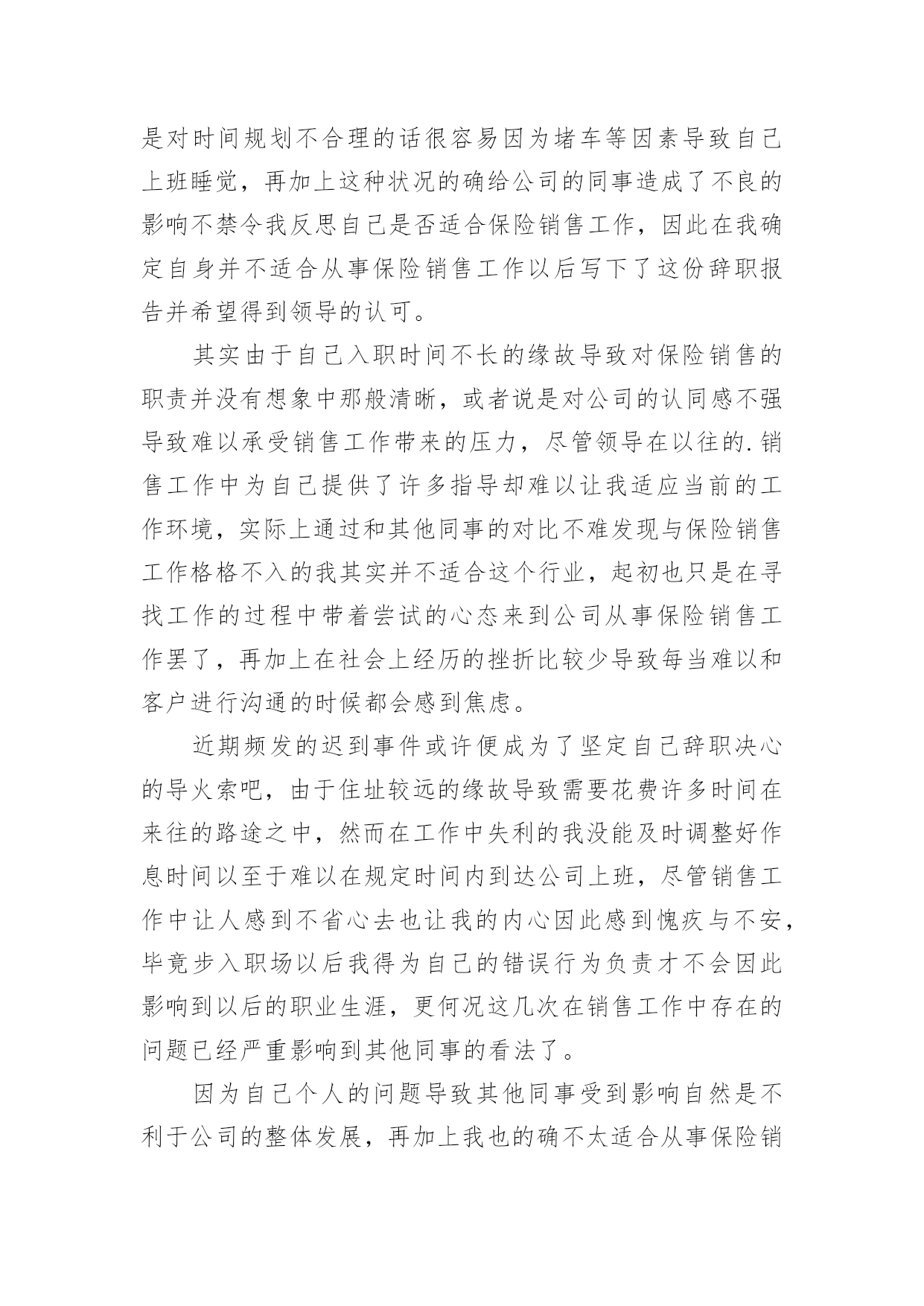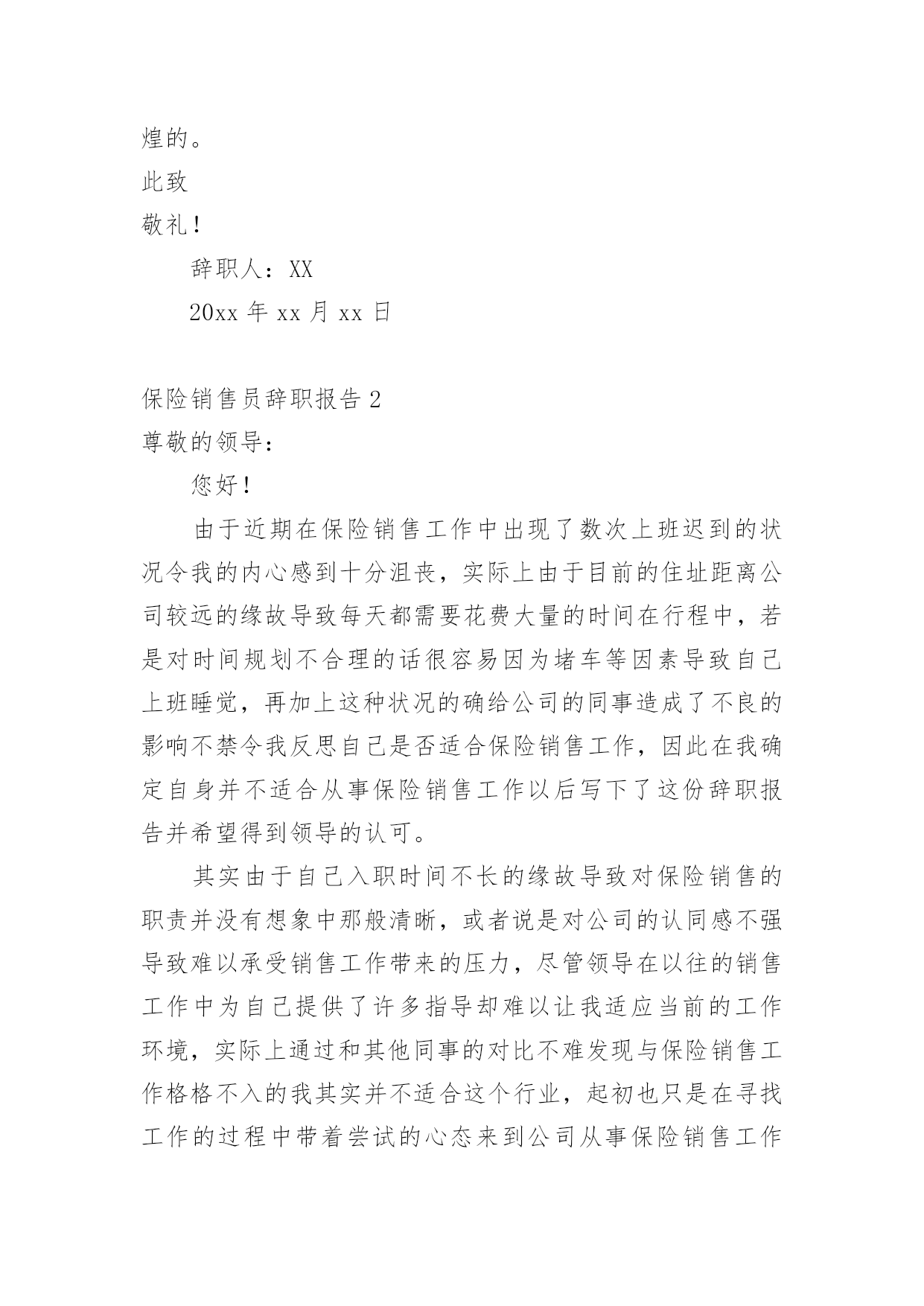 保险销售员辞职报告保险销售员辞职报告4篇【优秀】在现在社会,报告与我们愈发关系密切,通常情况下,报告的内容含量大、篇幅较长。那么大家知道标准正式的报告格式吗?下面是小编整理的保险销售员辞职报告,欢迎阅读与收藏。保险销售员辞职报告1尊敬的领导:您好!我的这次辞职已经成了必然的事情了,我的老婆让我换份工作,我不想辞职,我喜欢自己当前的这份工作,我跟她坚持过自己的想法,但是我最后还是拗不过她,只能顺从她的想法和意愿,真的很抱歉,这样以来公司就少了一位资深的销售员,我的离职,不仅是公司的损失,也是我个人的损失,这么一份跟我契合的工作,我不知道为什么我的老婆就是觉得不靠谱,对于我的离职,您也不要为难我,您就让我尽快的去办理离职手续吧。我来到公司已经有了三年多了,我的业务能力一直都很不错,业绩也是经常保持在一个很好高度,但是难免会有些时候会存在运气差的时候,一个月卖出去的保险仅有几份的情况也是有的,但是这都是极少数的情况,因为我们做销售的,工资全部看自己的业绩,业绩高工资自然就高,但是好想就是因为这么个情况,我的老婆说还是希望我能找一份稳定一点的工作,并且也是托关系给我找到了一份职位,要我下周就过去上班,据我了解,就是在一家物流公司办公室坐着而已,具体什么工作内容我还不了解,但是工资的确是比较高的,基本上可以跟我现在每个月最高的'销售业绩的工资相提并论,不得不说那份工作的确比我现在的工作稳定,但是一个人对工作的喜爱都是不同的,我现在这份销售的工作,是我自己喜欢的,也是我坚持干了三年的工作,早就习惯了每天去见客户的日子了,现在突然让我换一份工作,我也不知道自己是否可以适应,不过应该是不难的,因为我在您这里三年的工作经验可不是白搭的,肯定可以给予我很大的帮助。现如今,我要离职了,我真的是有千言万语想跟您跟同事们说,我的那些客户您就看在分配给我的那些同事们吧,希望能给他们带来帮助,三年的工作让我也是累积了很多的客户资源,这些资源给他们了,也能让他们的业绩有进一步的提升,最主要的是,我不想因为我的离职,导致公司有利益上的损失,这是我不想看到的情况。我这次这么一走,就不知道是否还能跟大家伙相见了,但是希望你们就算没了我也能让公司的发展稳步向前,这毕竟是我待了三年的公司,我当然是想看着它越来越好,我就没办法出力了,还望您见谅,最后我真的感谢您这三年来对我的照顾,在工作上给予我的帮助,您是一个好的老板,您的公司一定可以越来越辉煌的。此致敬礼!辞职人:XX20xx年xx月xx日保险销售员辞职报告2尊敬的领导:您好!由于近期在保险销售工作中出现了数次上班迟到的状况令我的内心感到十分沮丧,实际上由于目前的住址距离公司较远的缘故导致每天都需要花费大量的时间在行程中,若是对时间规划不合理的话很容易因为堵车等因素导致自己上班睡觉,再加上这种状况的确给公司的同事造成了不良的影响不禁令我反思自己是否适合保险销售工作,因此在我确定自身并不适合从事保险销售工作以后写下了这份辞职报告并希望得到领导的认可。其实由于自己入职时间不长的缘故导致对保险销售的职责并没有想象中那般清晰,或者说是对公司的认同感不强导致难以承受销售工作带来的压力,尽管领导在以往的销售工作中为自己提供了许多指导却难以让我适应当前的工作环境,实际上通过和其他同事的对比不难发现与保险销售工作格格不入的我其实并不适合这个行业,起初也只是在寻找工作的过程中带着尝试的心态来到公司从事保险销售工作罢了,再加上在社会上经历的挫折比较少导致每当难以和客户进行沟通的时候都会感到焦虑。近期频发的迟到事件或许便成为了坚定自己辞职决心的导火索吧,由于住址较远的缘故导致需要花费许多时间在来往的`路途之中,然而在工作中失利的我没能及时调整好作息时间以至于难以在规定时间内到达公司上班,尽管销售工作中让人感到不省心去也让我的内心因此感到愧疚与不安,毕竟步入职场以后我得为自己的错误行为负责才不会因此影响到以后的职业生涯,更何况这几次在销售工作中存在的问题已经严重影响到其他同事的看法了。因为自己个人的问题导致其他同事受到影响自然是不利于公司的整体发展,再加上我也的确不太适合从事保险销数工作的缘故便索性提出了辞职的请求,毕竟我在当前工作中让领导感到不省心的事情有很多自然不能够令这种状况持续下去,尽管工作中令人感到不如意的地方有很多却不能因为自身的错误影响到其他同事,哪怕是为了不给公司的运营添麻烦也应该尽快提出辞职的请求才行。正因为在保险销售工作中发展并不理想才让我觉得自己不适合这个岗位,再加上不擅长交际的缘故导致与客户间的沟通也难以做好,实际上作为保险销售员却无法为公司带来业绩的确有些不合格,因此希望领导能够理解自己辞职的原因从而对这份报告进行批复。此致敬礼!申请人:XXX日期:20xx年xx月xx日保险销售员辞职报告3敬爱的公司领导:您好