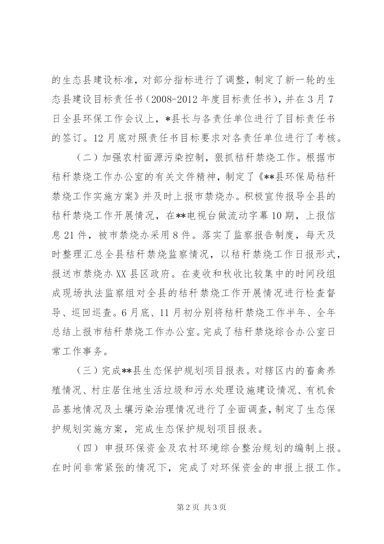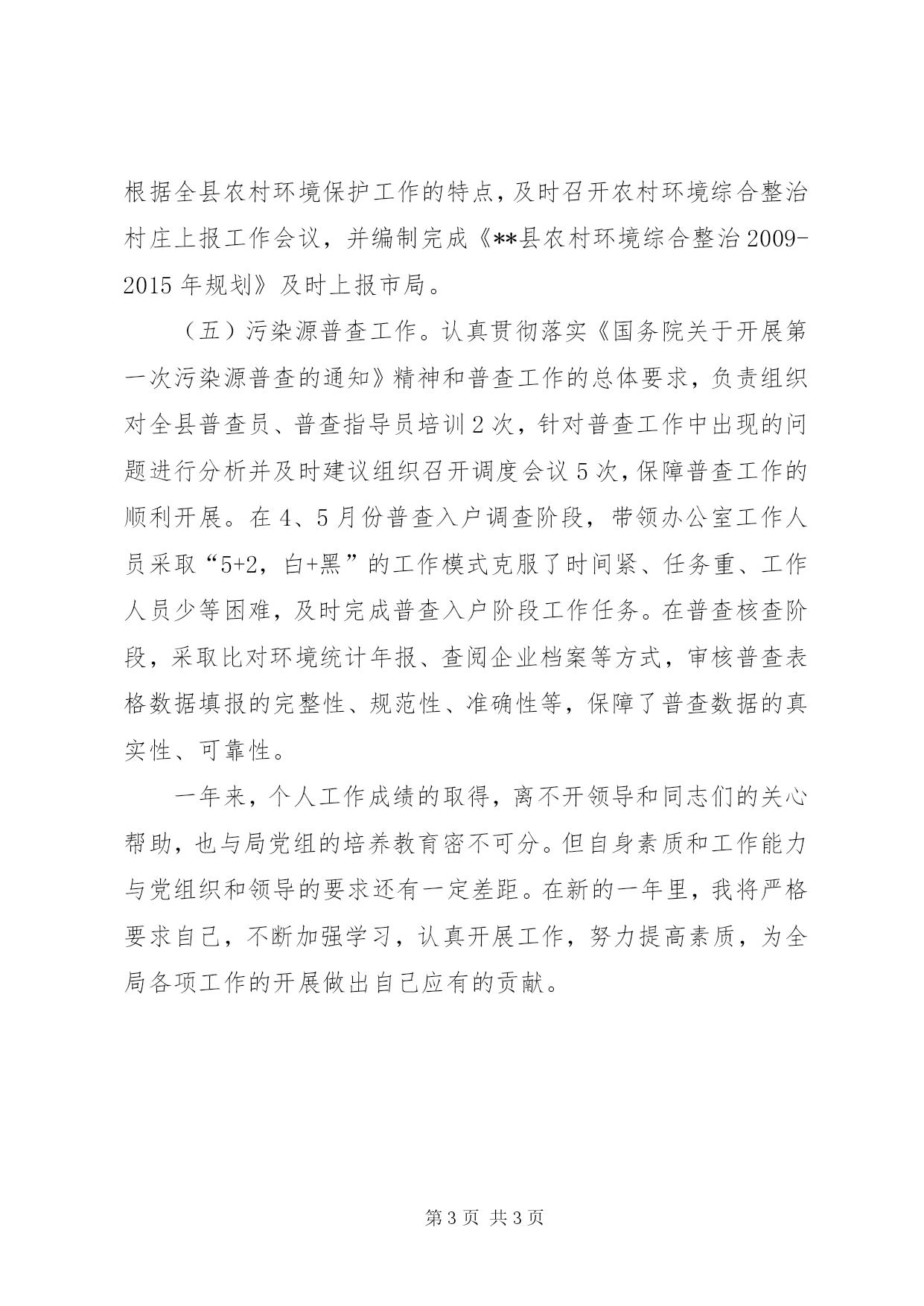 第PAGE\*Arabic\*MERGEFORMAT3页共NUMPAGES\*MERGEFORMAT3页环保局公务员述职报告一年来,在局党组的正确领导下,坚持以“三个代表”重要思想为指导,深入贯彻落实科学发展观,围绕中心,服务大局,求真务实,扎实工作,较好地完成了本职工作和领导交办的各项任务。根据考核要求,现将2008年度个人的思想、工作、作风和廉政等方面的情况简要述职如下:一、加强学习,不断提高自身素质树立终身学习的理念,在不断学习中升华思想、提高能力。一是深入学习党的理论政策。坚持把学习放在重要位置,深入学习邓小平理论、“三个代表”重要思想和党的十七大、十七届三中全会精神,坚持以科学发展观、构建社会主义和谐社会、保持共产党员先进性等马克思主义中国化的最新理论成果武装头脑,对中央一系列重大战略思想认识更加深刻,理解更加透彻,指导工作更加富有成效。始终坚持正确的立场,始终与党中央保持高度一致,思想政治素质进一步提高。二是积极钻研业务。结合所在科室业务工作特点,重点学习生态保护和污染源普查方面的业务知识,学以致用,开拓创新,不断提高业务水平。二、严格要求,全力做好各项工作(一)认真做好生态县建设日常工作。2007年生态示范区通过验收,2003-2007年度生态县建设目标责任书初级阶段的工作任务已经完成,结合我县实际情况,根据国家环保总部新制定的生态县建设标准,对部分指标进行了调整,制定了新一轮的生态县建设目标责任书(2008-2012年度目标责任书),并在3月7日全县环保工作会议上,*县长与各责任单位进行了目标责任书的签订。12月底对照责任书目标要求对各责任单位进行了考核。(二)加强农村面源污染控制,狠抓秸秆禁烧工作。根据市秸秆禁烧工作办公室的有关文件精神,制定了《**县环保局秸秆禁烧工作实施方案》并及时上报市禁烧办。积极宣传报导全县的秸秆禁烧工作开展情况,在**电视台做流动字幕10期,上报信息21件,被市禁烧办采用8件。落实了监察报告制度,每天及时整理汇总全县秸秆禁烧监察情况,以秸秆禁烧工作日报形式,报送市禁烧办XX县区政府。在麦收和秋收比较集中的时间段组成现场执法监察组对全县的秸秆禁烧工作开展情况进行检查督导、巡回巡查。6月底、11月初分别将秸秆禁烧工作半年、全年总结上报市秸秆禁烧工作办公室。完成了秸秆禁烧综合办公室日常工作事务。(三)完成**县生态保护规划项目报表。对辖区内的畜禽养殖情况、村庄居住地生活垃圾和污水处理设施建设情况、有机食品基地情况及土壤污染治理情况进行了全面调查,制定了生态保护规划实施方案,完成生态保护规划项目报表。(四)申报环保资金及农村环境综合整治规划的编制上报。在时间非常紧张的情况下,完成了对环保资金的申报上报工作。根据全县农村环境保护工作的特点,及时召开农村环境综合整治村庄上报工作会议,并编制完成《**县农村环境综合整治2009-2015年规划》及时上报市局。(五)污染源普查工作。认真贯彻落实《国务院关于开展第一次污染源普查的通知》精神和普查工作的总体要求,负责组织对全县普查员、普查指导员培训2次,针对普查工作中出现的问题进行分析并及时建议组织召开调度会议5次,保障普查工作的顺利开展。在4、5月份普查入户调查阶段,带领办公室工作人员采取“5+2,白+黑”的工作模式克服了时间紧、任务重、工作人员少等困难,及时完成普查入户阶段工作任务。在普查核查阶段,采取比对环境统计年报、查阅企业档案等方式,审核普查表格数据填报的完整性、规范性、准确性等,保障了普查数据的真实性、可靠性。一年来,个人工作成绩的取得,离不开领导和同志们的关心帮助,也与局党组的培养教育密不可分。但自身素质和工作能力与党组织和领导的要求还有一定差距。在新的一年里,我将严格要求自己,不断加强学习,认真开展工作,努力提高素质,为全局各项工作的开展做出自己应有的贡献。