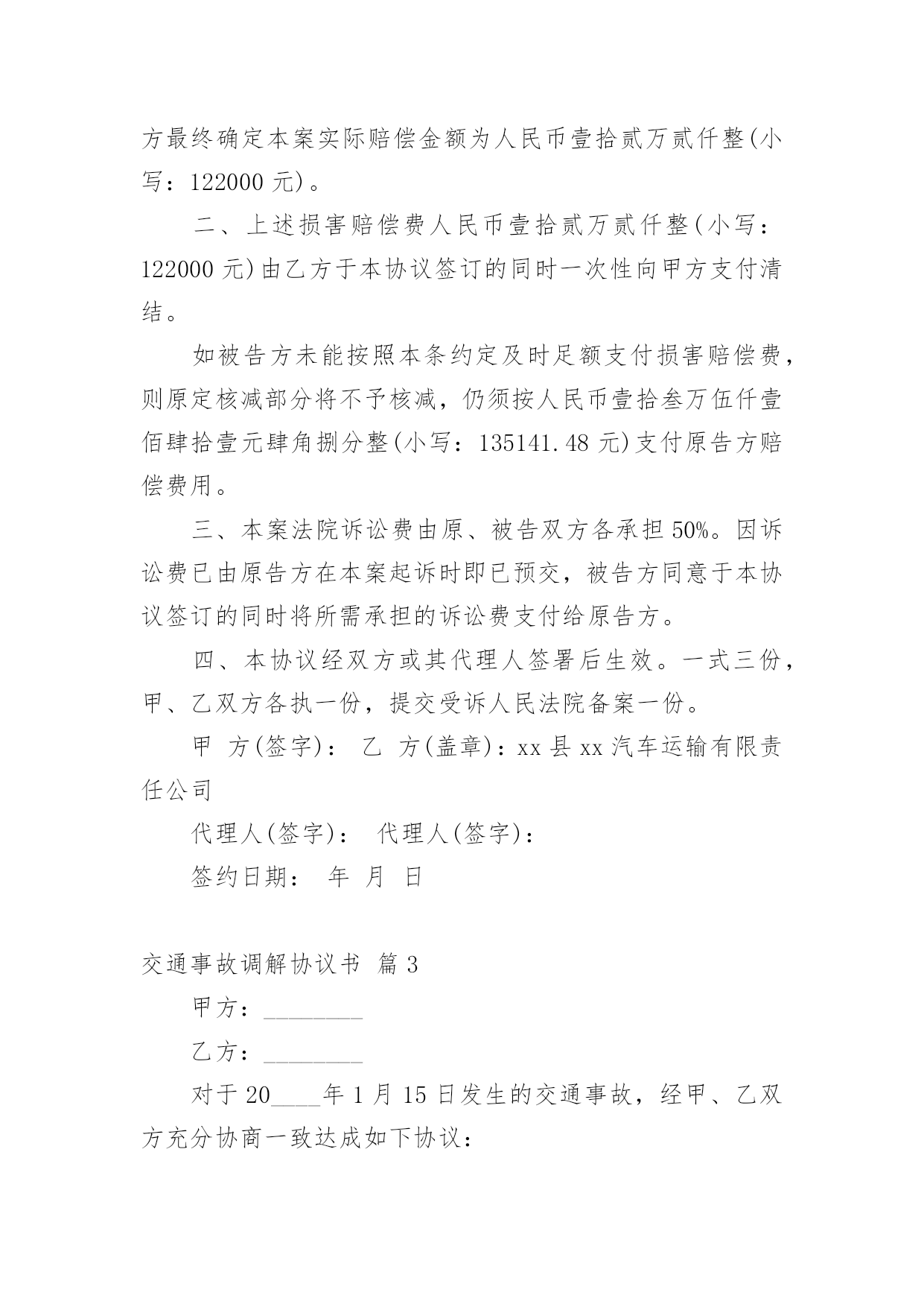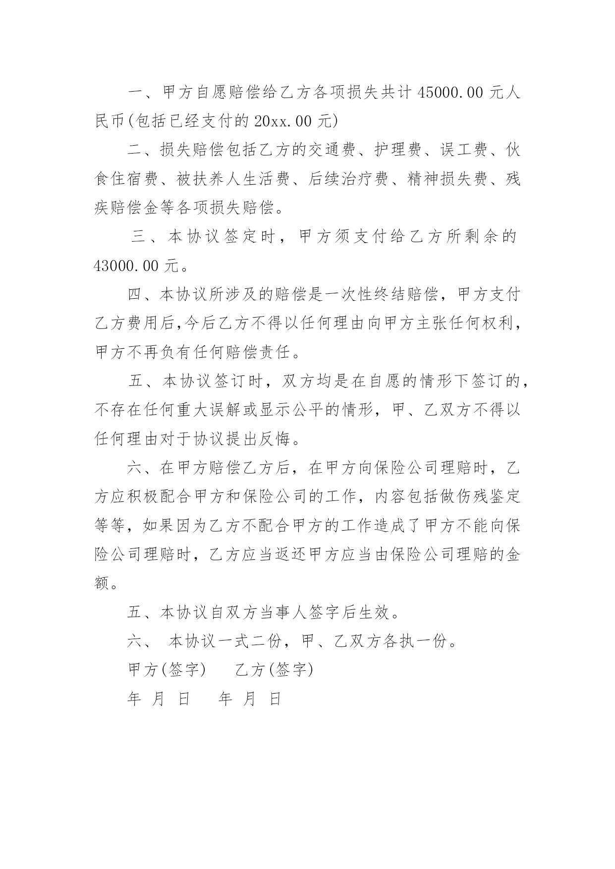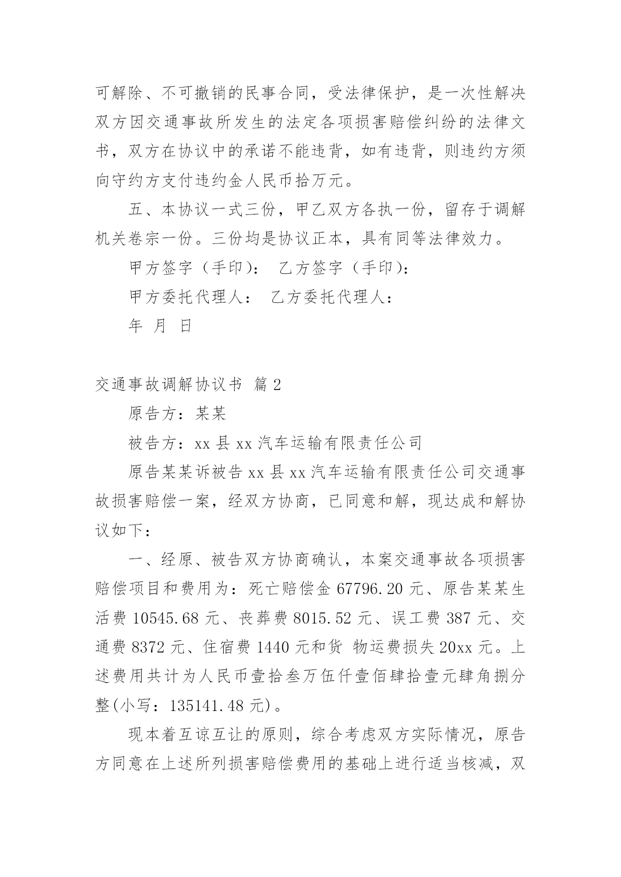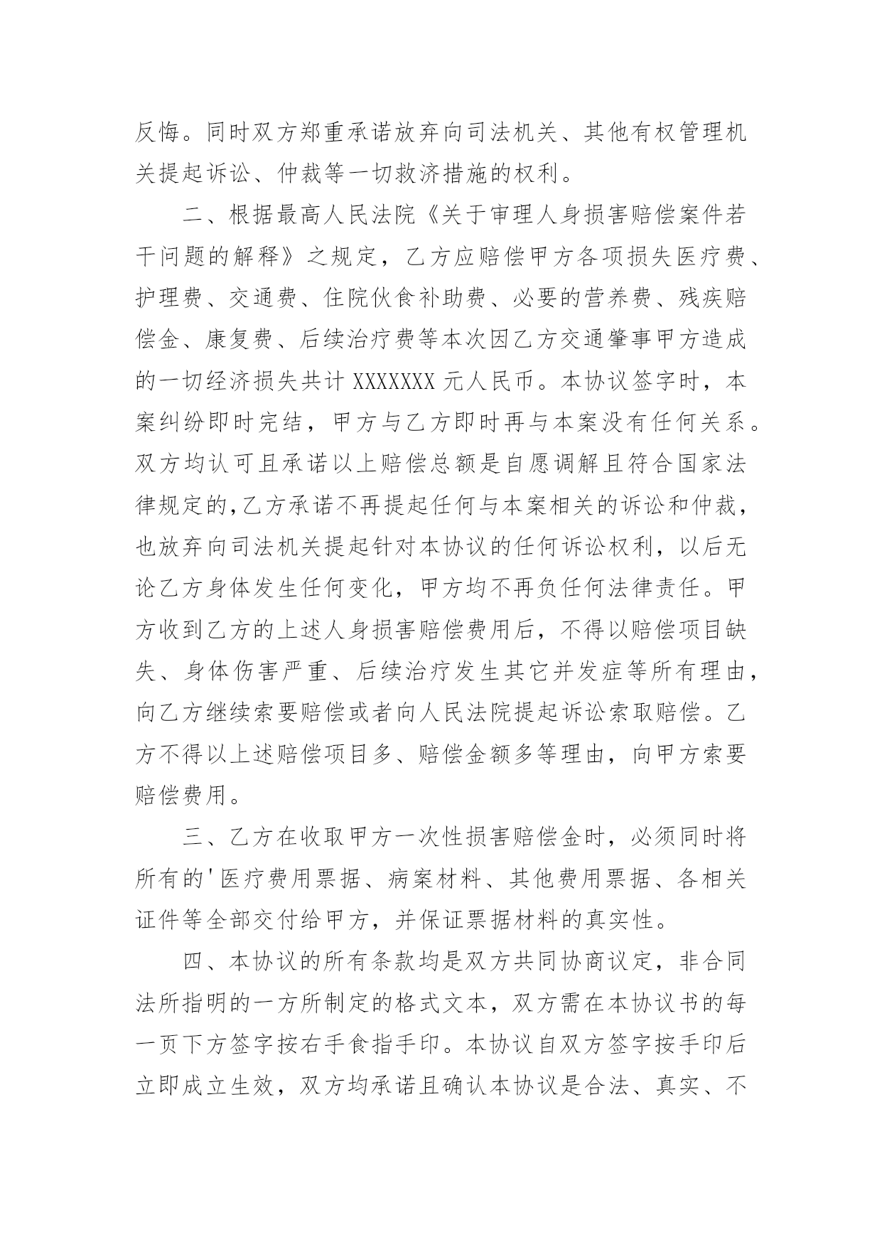 交通事故调解协议书【推荐】交通事故调解协议书三篇在现在社会,协议使用的频率越来越高,签订协议是解决纠纷的保障。大家知道协议的格式吗?以下是小编为大家收集的交通事故调解协议书3篇,仅供参考,希望能够帮助到大家。交通事故调解协议书篇1甲方:身份证号:甲方委托代理人:身份证号:乙方:身份证号:乙方委托代理人:身份证号:20xx年12月2日13时,甲方的车号为XXXXXX的出租出停于新城子镇南街路边,乙方醉酒驾驶摩托车从新城子镇南街由南往北行驶,撞至甲方出租出后,造成乙方右腿小腿骨折,甲方出租车后保险杠与尾灯损坏的交通事故。事故发生后甲方立即将乙方送至新城子镇医院进行治疗,后转致永昌县人民医院,经确诊为小腿骨折,再无其他伤势。后经医院治愈后于20xx年12月14日出院,出院后经甲乙双方协商,针对该起事故达成如下协议:对具体的赔偿事项和双方权利义务明确如下,双方须谨遵恪守:一、甲乙双方在公正、公平、自愿的前提下进行调解,此协议是双方真实意思表示,双方在协议履行完毕后均不得反悔。同时双方郑重承诺放弃向司法机关、其他有权管理机关提起诉讼、仲裁等一切救济措施的权利。二、根据最高人民法院《关于审理人身损害赔偿案件若干问题的解释》之规定,乙方应赔偿甲方各项损失医疗费、护理费、交通费、住院伙食补助费、必要的营养费、残疾赔偿金、康复费、后续治疗费等本次因乙方交通肇事甲方造成的一切经济损失共计XXXXXXX元人民币。本协议签字时,本案纠纷即时完结,甲方与乙方即时再与本案没有任何关系。双方均认可且承诺以上赔偿总额是自愿调解且符合国家法律规定的,乙方承诺不再提起任何与本案相关的诉讼和仲裁,也放弃向司法机关提起针对本协议的任何诉讼权利,以后无论乙方身体发生任何变化,甲方均不再负任何法律责任。甲方收到乙方的上述人身损害赔偿费用后,不得以赔偿项目缺失、身体伤害严重、后续治疗发生其它并发症等所有理由,向乙方继续索要赔偿或者向人民法院提起诉讼索取赔偿。乙方不得以上述赔偿项目多、赔偿金额多等理由,向甲方索要赔偿费用。三、乙方在收取甲方一次性损害赔偿金时,必须同时将所有的'医疗费用票据、病案材料、其他费用票据、各相关证件等全部交付给甲方,并保证票据材料的真实性。四、本协议的所有条款均是双方共同协商议定,非合同法所指明的一方所制定的格式文本,双方需在本协议书的每一页下方签字按右手食指手印。本协议自双方签字按手印后立即成立生效,双方均承诺且确认本协议是合法、真实、不可解除、不可撤销的民事合同,受法律保护,是一次性解决双方因交通事故所发生的法定各项损害赔偿纠纷的法律文书,双方在协议中的承诺不能违背,如有违背,则违约方须向守约方支付违约金人民币拾万元。五、本协议一式三份,甲乙双方各执一份,留存于调解机关卷宗一份。三份均是协议正本,具有同等法律效力。甲方签字(手印):乙方签字(手印):甲方委托代理人:乙方委托代理人:年月日交通事故调解协议书篇2原告方:某某被告方:xx县xx汽车运输有限责任公司原告某某诉被告xx县xx汽车运输有限责任公司交通事故损害赔偿一案,经双方协商,已同意和解,现达成和解协议如下:一、经原、被告双方协商确认,本案交通事故各项损害赔偿项目和费用为:死亡赔偿金67796.20元、原告某某生活费10545.68元、丧葬费8015.52元、误工费387元、交通费8372元、住宿费1440元和货物运费损失20xx元。上述费用共计为人民币壹拾叁万伍仟壹佰肆拾壹元肆角捌分整(小写:135141.48元)。现本着互谅互让的原则,综合考虑双方实际情况,原告方同意在上述所列损害赔偿费用的基础上进行适当核减,双方最终确定本案实际赔偿金额为人民币壹拾贰万贰仟整(小写:122000元)。二、上述损害赔偿费人民币壹拾贰万贰仟整(小写:122000元)由乙方于本协议签订的同时一次性向甲方支付清结。如被告方未能按照本条约定及时足额支付损害赔偿费,则原定核减部分将不予核减,仍须按人民币壹拾叁万伍仟壹佰肆拾壹元肆角捌分整(小写:135141.48元)支付原告方赔偿费用。三、本案法院诉讼费由原、被告双方各承担50%。因诉讼费已由原告方在本案起诉时即已预交,被告方同意于本协议签订的同时将所需承担的诉讼费支付给原告方。四、本协议经双方或其代理人签署后生效。一式三份,甲、乙双方各执一份,提交受诉人民法院备案一份。甲方(签字):乙方(盖章):xx县xx汽车运输有限责任公司代理人(签字):代理人(签字):签约日期:年月日交通事故调解协议书篇3甲方:________乙方:________对于20____年1月15日发生的交通事故,经甲、乙双方充分协商一致达成如下协议:一、甲方自愿赔偿给乙方各项损失共计45000.00元人民币(包括已经支付的20xx.00元)二、损失赔偿包括乙方的交通费、护理费、误工费、伙