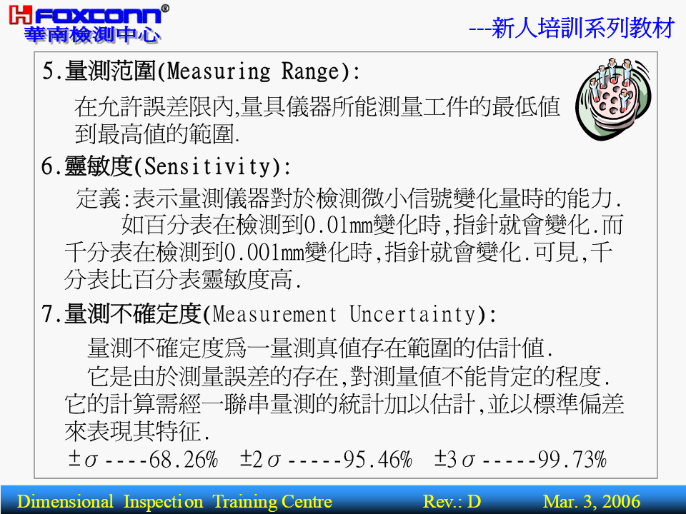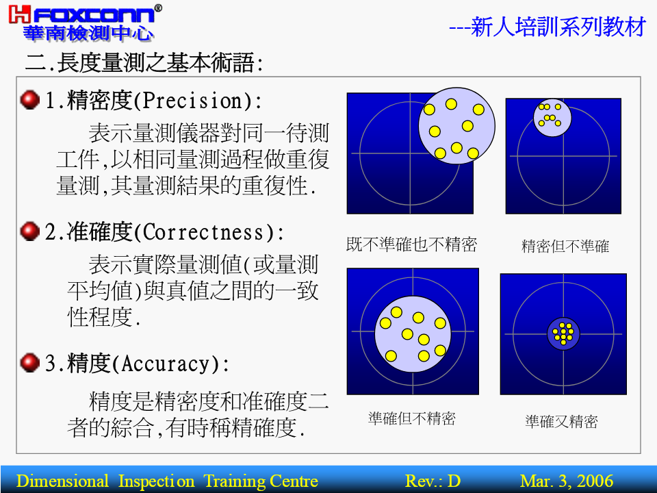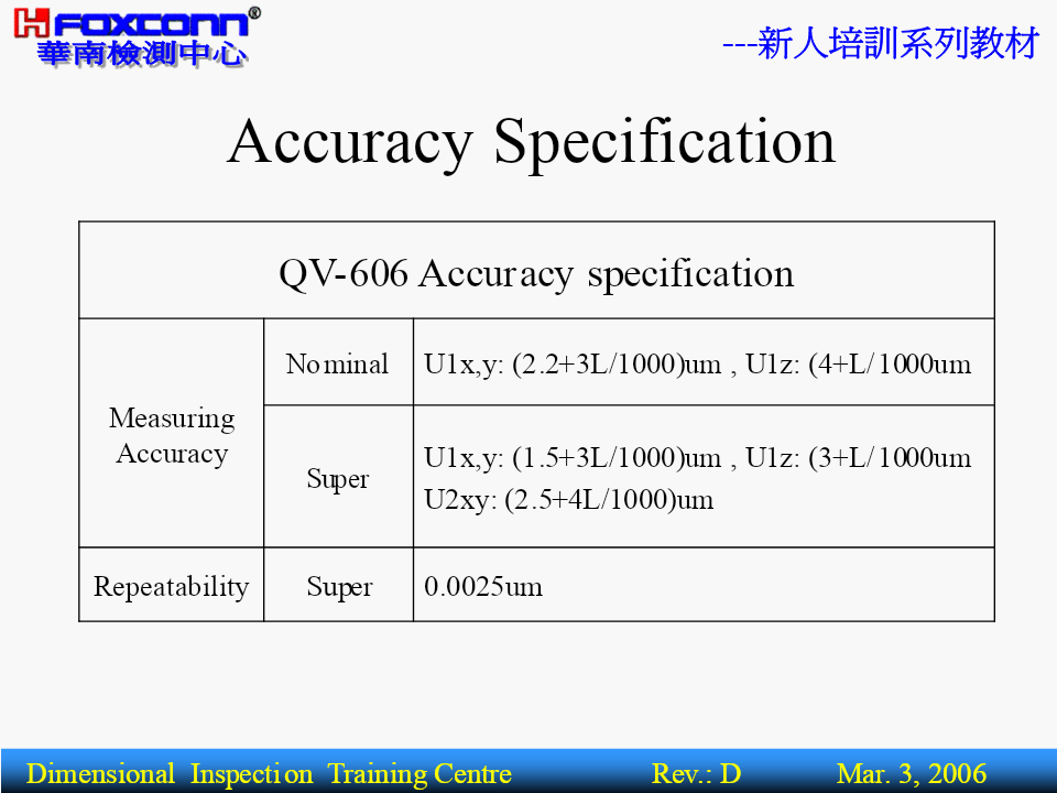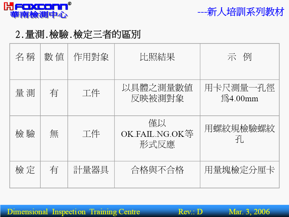 ---新人培訓系列教材量測基本理論(BasicTheoryofMeasurement)核准:編寫:操明山DimensionalInspectionTrainingCentreRev.:DMar.3,2006---新人培訓系列教材BriefIntroductionPart1-----------量測基本概念1.量測之定義.範圍2.量測之基本術語3.量測之四大基本原則4.量測之誤差來源5.量測基準體系Part2-----------精密量測器具簡介1.精密量測器具分類2.主要量測儀器功能,精度簡介3.其它量具功能簡介4.公司主要產品及適用設備DimensionalInspectionTrainingCentreRev.:DMar.3,2006---新人培訓系列教材一.(尺寸)量測之定義及範圍1.定義:定義:為確定被測件之量值而進行的全部操作.量具或儀器被測件量測結果過程或程序實質:將被測量與標准量或單位量進行比較,並確定量值的過程.被測物量值(5mm)05mm標准量DimensionalInspectionTrainingCentreRev.:DMar.3,2006---新人培訓系列教材2.量測.檢驗.檢定三者的區別名稱數值作用對象比照結果示例以具體之測量數值用卡尺測量一孔徑量測有工件反映被測對象為4.00mm僅以用螺紋規檢驗螺紋檢驗無工件OK.FAIL.NG.OK等孔形式反應檢定有計量器具合格與不合格用量塊檢定分厘卡DimensionalInspectionTrainingCentreRev.:DMar.3,2006---新人培訓系列教材3.幾何量量測范圍:L長度方面Φ角度方面θ0.5形狀方面(形位公差,表面粗糙度)0.2DimensionalInspectionTrainingCentreRev.:DMar.3,2006---新人培訓系列教材4.長度量測所用之量測器具:長度方面:游標尺.分厘卡.量表.塊規.高度規.測長儀.三次元量床.光學平晶.光學投影機.工具顯微鏡.雷射干幾涉儀.雷射掃瞄儀等何角度方面:量角度塊規.角度量規.角尺.直角規.錐度量規.量角量器.組合角尺.水平儀.三次元量床.光學投影機.工測具顯微鏡.雷射干涉儀等.形狀方面:表面粗糙度量測儀.輪廓量測儀.真圓度量測儀.光學平晶.光學投影儀.工具顯微鏡.三次元量床等.DimensionalInspectionTrainingCentreRev.:DMar.3,2006---新人培訓系列教材二.長度量測之基本術語:1.精密度(Precision):表示量測儀器對同一待測工件,以相同量測過程做重復量測,其量測結果的重復性.2.准確度(Correctness):既不準確也不精密精密但不準確表示實際量測值(或量測平均值)與真值之間的一致性程度.3.精度(Accuracy):精度是精密度和准確度二者的綜合,有時稱精確度.準確但不精密準確又精密DimensionalInspectionTrainingCentreRev.:DMar.3,2006---新人培訓系列教材AccuracySpecificationQV-606AccuracyspecificationNominalU1x,y:(2.2+3L/1000)um,U1z:(4+L/1000umMeasuringAccuracyU1x,y:(1.5+3L/1000)um,U1z:(3+L/1000umSuperU2xy:(2.5+4L/1000)umRepeatabilitySuper0.0025umDimensionalInspectionTrainingCentreRev.:DMar.3,2006---新人培訓系列教材4.解析度(分度值,Resolution):0.021定義:量具或儀器對量值所能表現的最小讀數的能力.對於游標量具:解析度指相鄰兩刻線所代表的量值之差(如附表卡尺).對於數顯式儀器:則要看儀器讀數指示屏顯示量值的最后一位小數所代表的量值.如:投影機顯示讀數為10.051,則解析度為0.001DimensionalInspectionTrainingCentreRev.:DMar.3,2006---新人培訓系列教材5.量測范圍(MeasuringRange):在允許誤差限內,量具儀器所能測量工件的最低值到最高值的範圍.6.靈敏度(Sensitivity):定義:表示量測儀器對於檢測微小信號變化量時的能