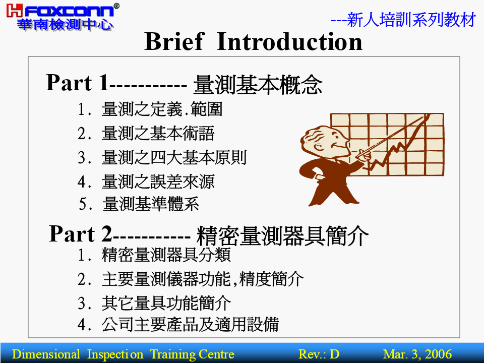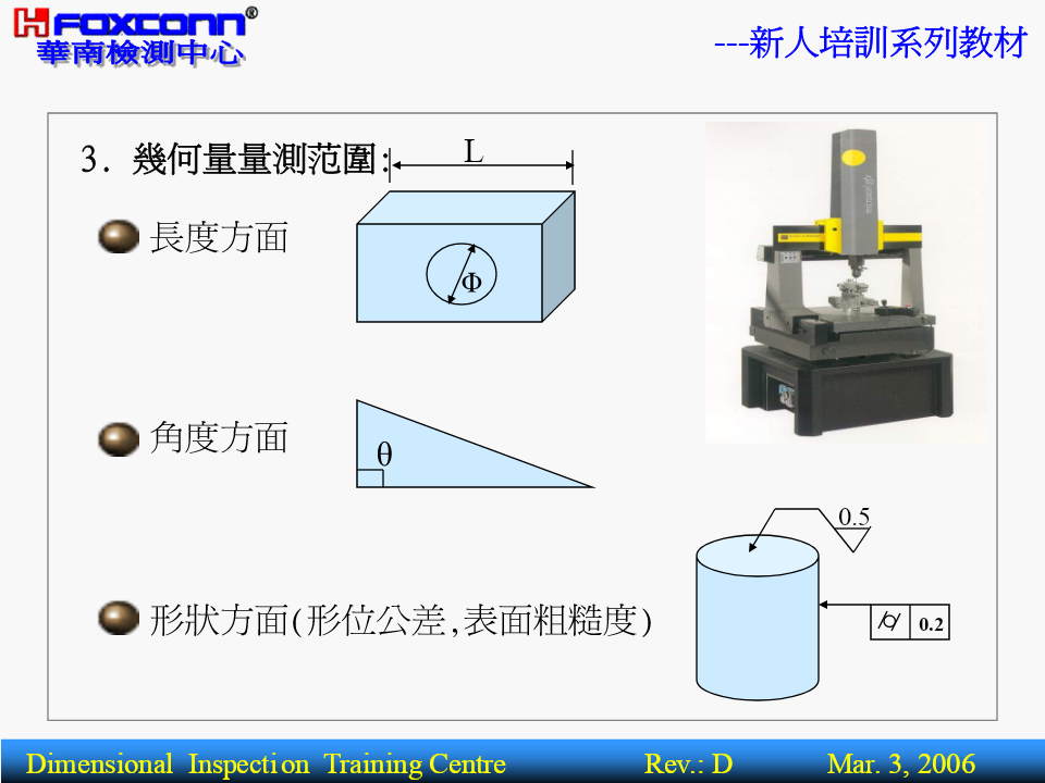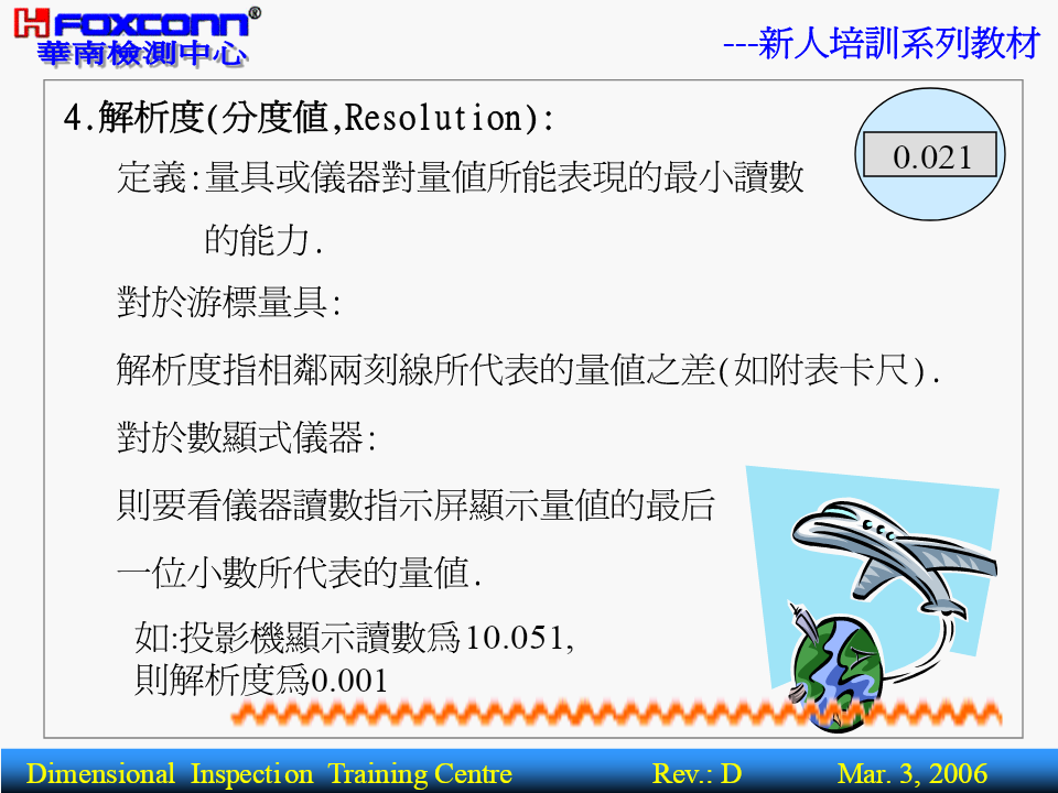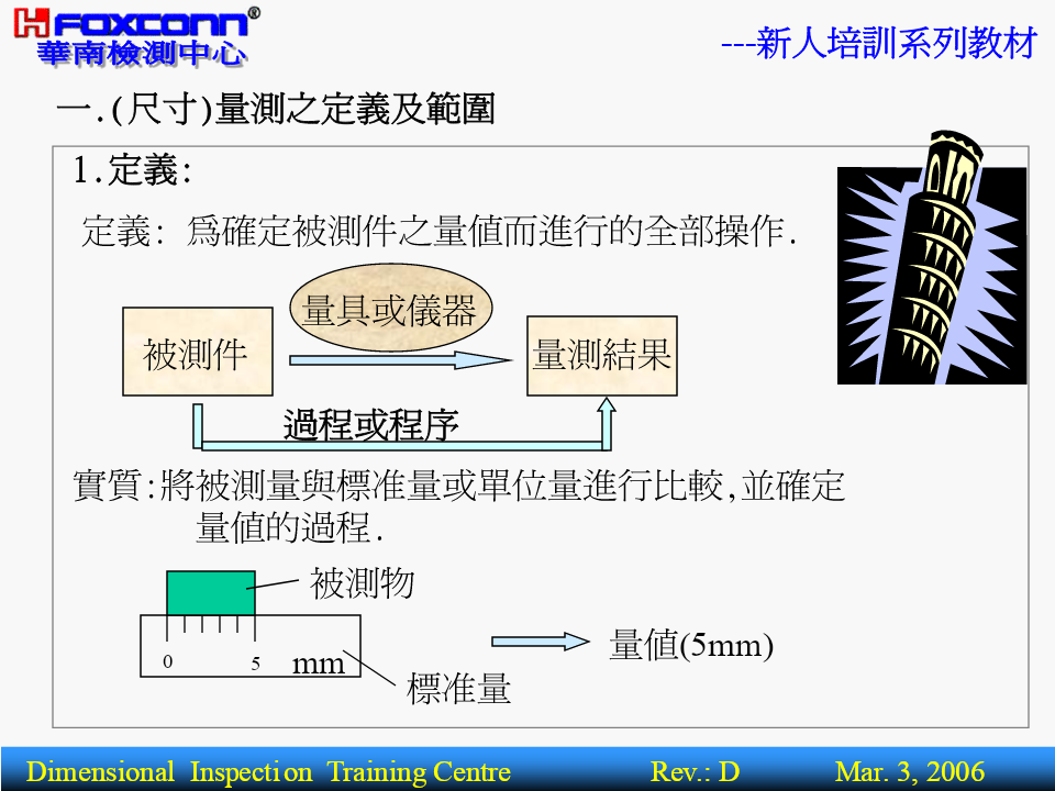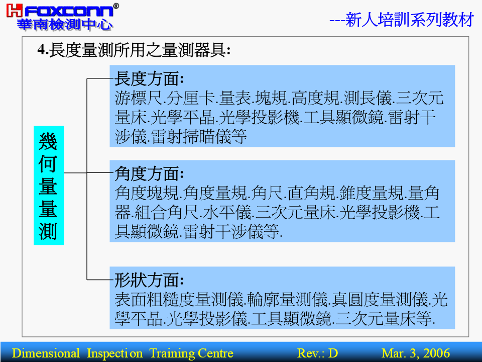 ---新人培訓系列教材量測基本理論(BasicTheoryofMeasurement)核准:編寫:操明山DimensionalInspectionTrainingCentreRev.:DMar.3,2006---新人培訓系列教材BriefIntroductionPart1-----------量測基本概念1.量測之定義.範圍2.量測之基本術語3.量測之四大基本原則4.量測之誤差來源5.量測基準體系Part2-----------精密量測器具簡介1.精密量測器具分類2.主要量測儀器功能,精度簡介3.其它量具功能簡介4.公司主要產品及適用設備DimensionalInspectionTrainingCentreRev.:DMar.3,2006---新人培訓系列教材一.(尺寸)量測之定義及範圍1.定義:定義:為確定被測件之量值而進行的全部操作.量具或儀器被測件量測結果過程或程序實質:將被測量與標准量或單位量進行比較,並確定量值的過程.被測物量值(5mm)05mm標准量DimensionalInspectionTrainingCentreRev.:DMar.3,2006---新人培訓系列教材2.量測.檢驗.檢定三者的區別名稱數值作用對象比照結果示例以具體之測量數值用卡尺測量一孔徑量測有工件反映被測對象為4.00mm僅以用螺紋規檢驗螺紋檢驗無工件OK.FAIL.NG.OK等孔形式反應檢定有計量器具合格與不合格用量塊檢定分厘卡DimensionalInspectionTrainingCentreRev.:DMar.3,2006---新人培訓系列教材3.幾何量量測范圍:L長度方面Φ角度方面θ0.5形狀方面(形位公差,表面粗糙度)0.2DimensionalInspectionTrainingCentreRev.:DMar.3,2006---新人培訓系列教材4.長度量測所用之量測器具:長度方面:游標尺.分厘卡.量表.塊規.高度規.測長儀.三次元量床.光學平晶.光學投影機.工具顯微鏡.雷射干幾涉儀.雷射掃瞄儀等何角度方面:量角度塊規.角度量規.角尺.直角規.錐度量規.量角量器.組合角尺.水平儀.三次元量床.光學投影機.工測具顯微鏡.雷射干涉儀等.形狀方面:表面粗糙度量測儀.輪廓量測儀.真圓度量測儀.光學平晶.光學投影儀.工具顯微鏡.三次元量床等.DimensionalInspectionTrainingCentreRev.:DMar.3,2006---新人培訓系列教材二.長度量測之基本術語:1.精密度(Precision):表示量測儀器對同一待測工件,以相同量測過程做重復量測,其量測結果的重復性.2.准確度(Correctness):既不準確也不精密精密但不準確表示實際量測值(或量測平均值)與真值之間的一致性程度.3.精度(Accuracy):精度是精密度和准確度二者的綜合,有時稱精確度.準確但不精密準確又精密DimensionalInspectionTrainingCentreRev.:DMar.3,2006---新人培訓系列教材AccuracySpecificationQV-606AccuracyspecificationNominalU1x,y:(2.2+3L/1000)um,U1z:(4+L/1000umMeasuringAccuracyU1x,y:(1.5+3L/1000)um,U1z:(3+L/1000umSuperU2xy:(2.5+4L/1000)umRepeatabilitySuper0.0025umDimensionalInspectionTrainingCentreRev.:DMar.3,2006---新人培訓系列教材4.解析度(分度值,Resolution):0.021定義:量具或儀器對量值所能表現的最小讀數的能力.對於游標量具:解析度指相鄰兩刻線所代表的量值之差(如附表卡尺).對於數顯式儀器:則要看儀器讀數指示屏顯示量值的最后一位小數所代表的量值.如:投影機顯示讀數為10.051,則解析度為0.001DimensionalInspectionTrainingCentreRev.:DMar.3,2006---新人培訓系列教材5.量測范圍(MeasuringRange):在允許誤差限內,量具儀器所能測量工件的最低值到最高值的範圍.6.靈敏度(Sensitivity):定義:表示量測儀器對於檢測微小信號變化量時的能