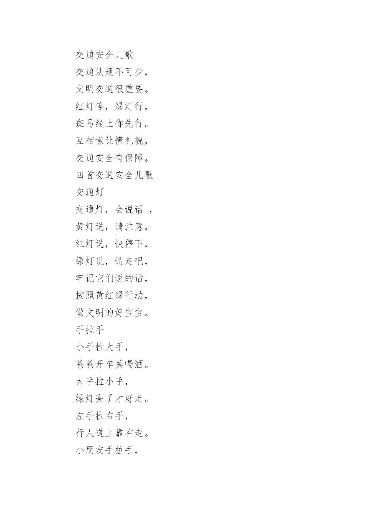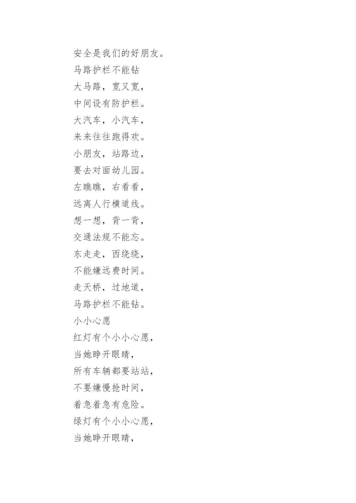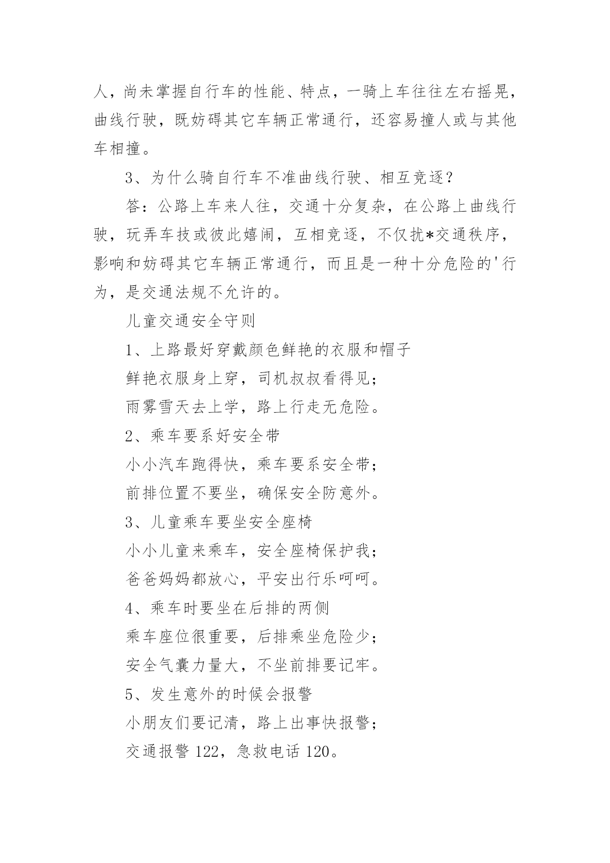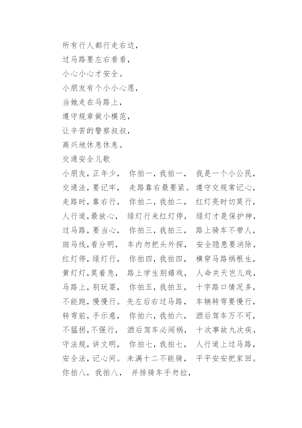 交通安全黑板报资料内容图片在各个领域,大家一定没少看到黑板报吧,黑板报上的文章排列,一般分为横排、竖排、横竖结合三种形式。那些被广泛运用的黑板报都是什么样子的呢?下面是小编精心整理的交通安全黑板报资料内容图片,仅供参考,欢迎大家阅读。交通安全知识1、为什么市区道路上骑自行车不准带人?答:因为自行车的设计和造型是按单人骑行的需要制作的,如骑车带人势必造成车辆重心移位,前轻后重,车把不易控制,遇到突然情况,往往措手不及,车翻人倒,极易引起伤亡事故。2、为什么不准在繁忙道路上学骑自行车?答:交通干道上车来人往,交通十分繁忙,初学骑车的人,尚未掌握自行车的性能、特点,一骑上车往往左右摇晃,曲线行驶,既妨碍其它车辆正常通行,还容易撞人或与其他车相撞。3、为什么骑自行车不准曲线行驶、相互竞逐?答:公路上车来人往,交通十分复杂,在公路上曲线行驶,玩弄车技或彼此嬉闹,互相竞逐,不仅扰*交通秩序,影响和妨碍其它车辆正常通行,而且是一种十分危险的'行为,是交通法规不允许的。儿童交通安全守则1、上路最好穿戴颜色鲜艳的衣服和帽子鲜艳衣服身上穿,司机叔叔看得见;雨雾雪天去上学,路上行走无危险。2、乘车要系好安全带小小汽车跑得快,乘车要系安全带;前排位置不要坐,确保安全防意外。3、儿童乘车要坐安全座椅小小儿童来乘车,安全座椅保护我;爸爸妈妈都放心,平安出行乐呵呵。4、乘车时要坐在后排的两侧乘车座位很重要,后排乘坐危险少;安全气囊力量大,不坐前排要记牢。5、发生意外的时候会报警小朋友们要记清,路上出事快报警;交通报警122,急救电话120。交通安全儿歌交通法规不可少,文明交通很重要。红灯停,绿灯行,斑马线上你先行。互相谦让懂礼貌,交通安全有保障。四首交通安全儿歌交通灯交通灯,会说话,黄灯说,请注意,红灯说,快停下,绿灯说,请走吧,牢记它们说的话,按照黄红绿行动,做文明的好宝宝。手拉手小手拉大手,爸爸开车莫喝酒。大手拉小手,绿灯亮了才好走。左手拉右手,行人道上靠右走。小朋友手拉手,安全是我们的好朋友。马路护栏不能钻大马路,宽又宽,中间设有防护栏。大汽车,小汽车,来来往往跑得欢。小朋友,站路边,要去对面幼儿园。左瞧瞧,右看看,远离人行横道线。想一想,背一背,交通法规不能忘。东走走,西绕绕,不能嫌远费时间。走天桥,过地道,马路护栏不能钻。小小心愿红灯有个小小心愿,当她睁开眼睛,所有车辆都要站站,不要嫌慢抢时间,着急着急有危险。绿灯有个小小心愿,当她睁开眼睛,所有行人都行走右边,过马路要左右看看,小心小心才安全。小朋友有个小小心愿,当她走在马路上,遵守规章做小模范,让辛苦的警察叔叔,高兴地休息休息。交通安全儿歌小朋友,正年少,你拍一,我拍一,我是一个小公民,交通法,要记牢,走路靠右最要紧。遵守交规常记心,走路时,靠右行,你拍二,我拍二,红灯亮时切莫行,人行道,最放心,绿灯行来红灯停,绿灯才是保护神,过马路,要当心,你拍三,我拍三,路上骑车不带人,斑马线,看分明,车内勿把头外探,安全隐患要消除,红灯停,绿灯行,你拍四,我拍四,横穿马路祸根生,黄灯灯,莫着急,路上学生别嬉戏,人命关天岂儿戏,马路上,别玩耍,你拍五,我拍五,十字路口情况多,不能跑,慢慢行。先左后右过马路,车辆转弯要慢行,转弯前,手示意,你拍六,我拍六,酒后驾车万不可,不猛拐,不强行,酒后驾车必闯祸,十次事故九次疾,守法规,讲文明,你拍七,我拍七,人行道上过马路,安全法,记心间。未满十二不能骑,平平安安把家回。你拍八,我拍八,并排骑车手勿拉,你拍九,我拍九,翻越栏杆小命丢,你拍十,我拍十,人人遵守路畅通,开心出门开心归,安全时时记心中。