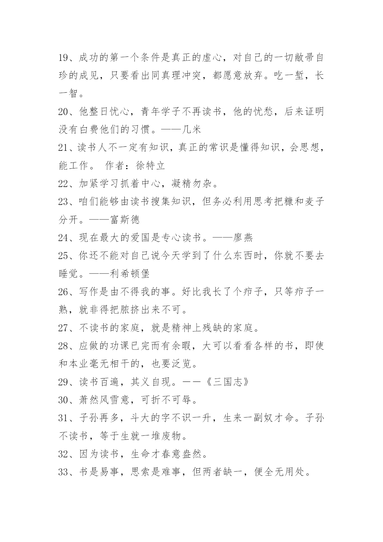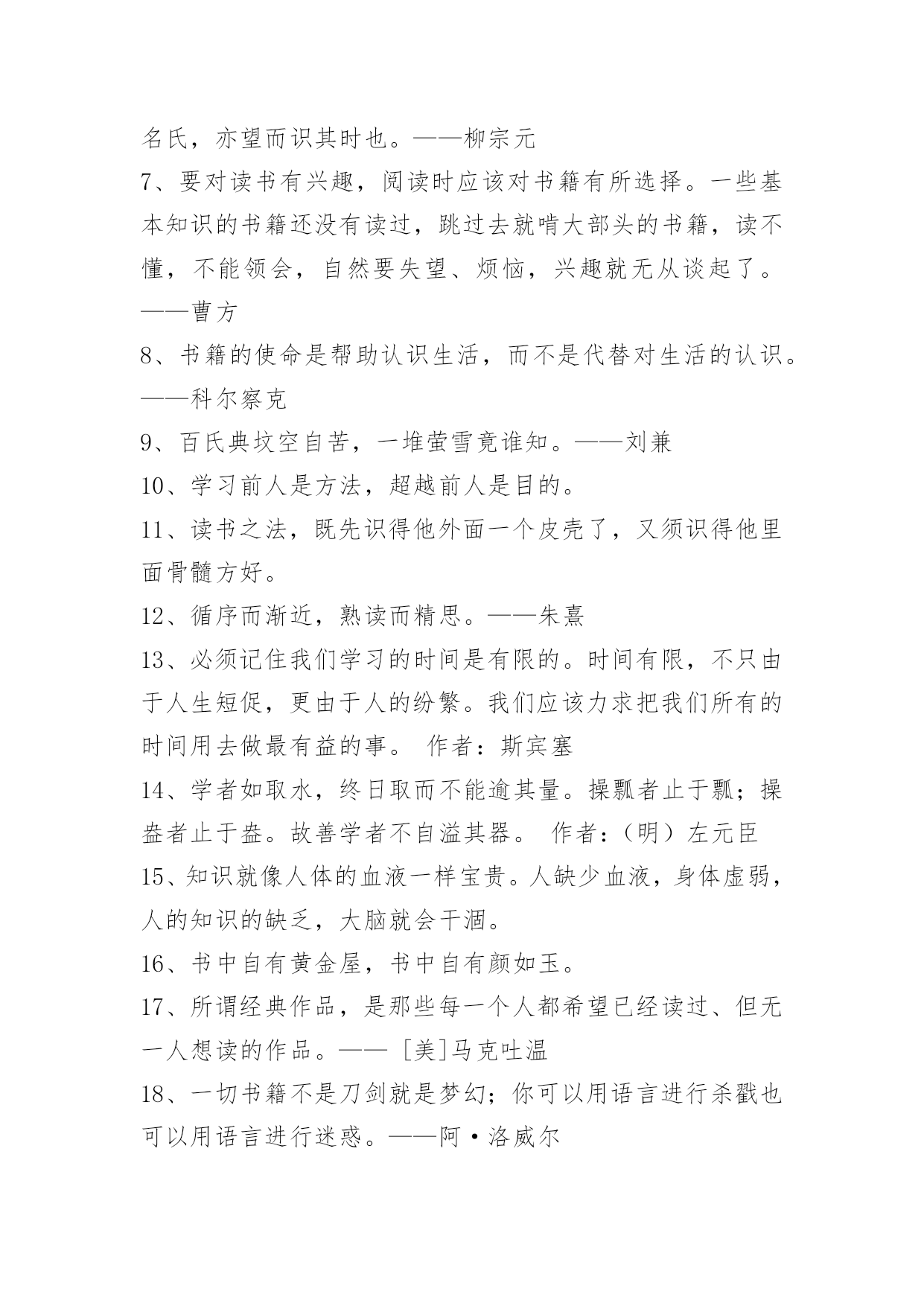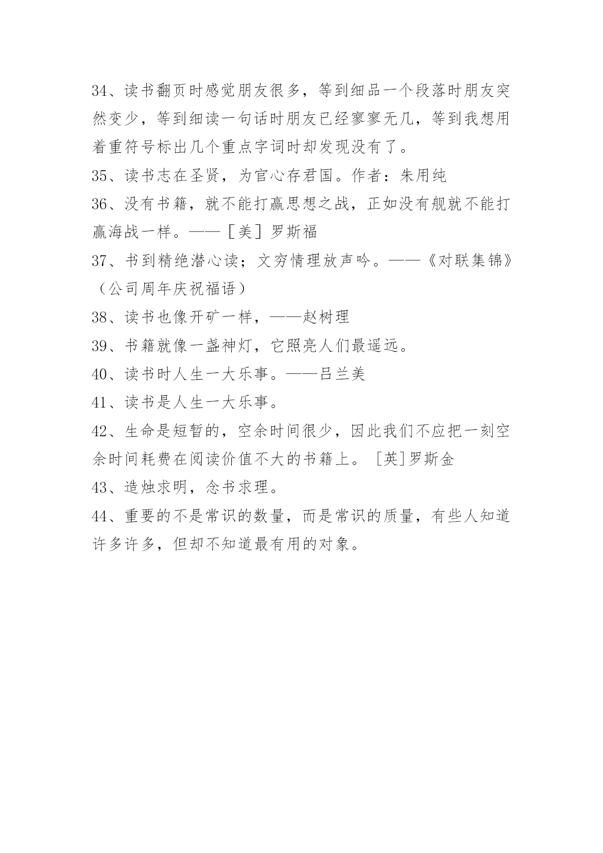读书名言44条精选读书名言合集44条读书谓已多,抚事知不足。下面是小编为大家收集的读书名言44条,仅供参考,欢迎大家阅读。1、劝君莫惜金缕衣,劝君读书长精神。有书堪读直须读,莫待垂老空叹息。书山有路勤为径,学海无涯苦作舟。勾画圈点长作伴,不动笔墨不读书。世界读书日,让书充实自己,让自己快乐读书。2、秤砣虽小,能压千斤。3、藏书不难,能看为难;看书不难,能读为难;读书不难,能思为难;能思不难,能记为难。——张潮4、身边要永远带着铅笔和笔记本,读书和读诗时碰到的一切美妙的地方和话语,都把它记下来。5、所谓阅读书籍的习惯,并不是什么难能的事,只是能够按照读物的性质作适当的处理而已。需要翻查的,能够翻查;需要参考的,能够参考;应当条分缕析的,能够条分缕析;应当综观大意的,能够综观大意;意在言外的,能够辨得出它的言外之意;义有疏漏的,能够指得出它的疏漏之处。到此地步,阅读书籍的习惯也就差不多了。一个人有了这样的习惯,一辈子读书,一辈子受用。——叶圣陶6、仆早好观古书,家所蓄晋魏时尺牍甚具。又二十年来,遍观长安贵人好事者所蓄,殆无遗焉。以是善书,虽未尝见名氏,亦望而识其时也。——柳宗元7、要对读书有兴趣,阅读时应该对书籍有所选择。一些基本知识的书籍还没有读过,跳过去就啃大部头的书籍,读不懂,不能领会,自然要失望、烦恼,兴趣就无从谈起了。——曹方8、书籍的使命是帮助认识生活,而不是代替对生活的认识。——科尔察克9、百氏典坟空自苦,一堆萤雪竟谁知。——刘兼10、学习前人是方法,超越前人是目的。11、读书之法,既先识得他外面一个皮壳了,又须识得他里面骨髓方好。12、循序而渐近,熟读而精思。——朱熹13、必须记住我们学习的时间是有限的。时间有限,不只由于人生短促,更由于人的纷繁。我们应该力求把我们所有的时间用去做最有益的事。作者:斯宾塞14、学者如取水,终日取而不能逾其量。操瓢者止于瓢;操盎者止于盎。故善学者不自溢其器。作者:(明)左元臣15、知识就像人体的血液一样宝贵。人缺少血液,身体虚弱,人的知识的缺乏,大脑就会干涸。16、书中自有黄金屋,书中自有颜如玉。17、所谓经典作品,是那些每一个人都希望已经读过、但无一人想读的作品。——[美]马克吐温18、一切书籍不是刀剑就是梦幻;你可以用语言进行杀戳也可以用语言进行迷惑。——阿·洛威尔19、成功的第一个条件是真正的虚心,对自己的一切敝帚自珍的成见,只要看出同真理冲突,都愿意放弃。吃一堑,长一智。20、他整日忧心,青年学子不再读书,他的忧愁,后来证明没有白费他们的习惯。——几米21、读书人不一定有知识,真正的常识是懂得知识,会思想,能工作。作者:徐特立22、加紧学习抓着中心,凝精勿杂。23、咱们能够由读书搜集知识,但务必利用思考把糠和麦子分开。——富斯德24、现在最大的爱国是专心读书。——廖燕25、你还不能对自己说今天学到了什么东西时,你就不要去睡觉。——利希顿堡26、写作是由不得我的事。好比我长了个疖子,只等疖子一熟,就非得把脓挤出来不可。27、不读书的家庭,就是精神上残缺的家庭。28、应做的功课已完而有余暇,大可以看看各样的书,即使和本业毫无相干的,也要泛览。29、读书百遍,其义自现。――《三国志》30、萧然风雪意,可折不可辱。31、子孙再多,斗大的字不识一升,生来一副奴才命。子孙不读书,等于生就一堆废物。32、因为读书,生命才春意盎然。33、书是易事,思索是难事,但两者缺一,便全无用处。34、读书翻页时感觉朋友很多,等到细品一个段落时朋友突然变少,等到细读一句话时朋友已经寥寥无几,等到我想用着重符号标出几个重点字词时却发现没有了。35、读书志在圣贤,为官心存君国。作者:朱用纯36、没有书籍,就不能打赢思想之战,正如没有舰就不能打赢海战一样。——[美]罗斯福37、书到精绝潜心读;文穷情理放声吟。——《对联集锦》(公司周年庆祝福语)38、读书也像开矿一样,——赵树理39、书籍就像一盏神灯,它照亮人们最遥远。40、读书时人生一大乐事。——吕兰美41、读书是人生一大乐事。42、生命是短暂的,空余时间很少,因此我们不应把一刻空余时间耗费在阅读价值不大的书籍上。[英]罗斯金43、造烛求明,念书求理。44、重要的不是常识的数量,而是常识的质量,有些人知道许多许多,但却不知道最有用的对象。